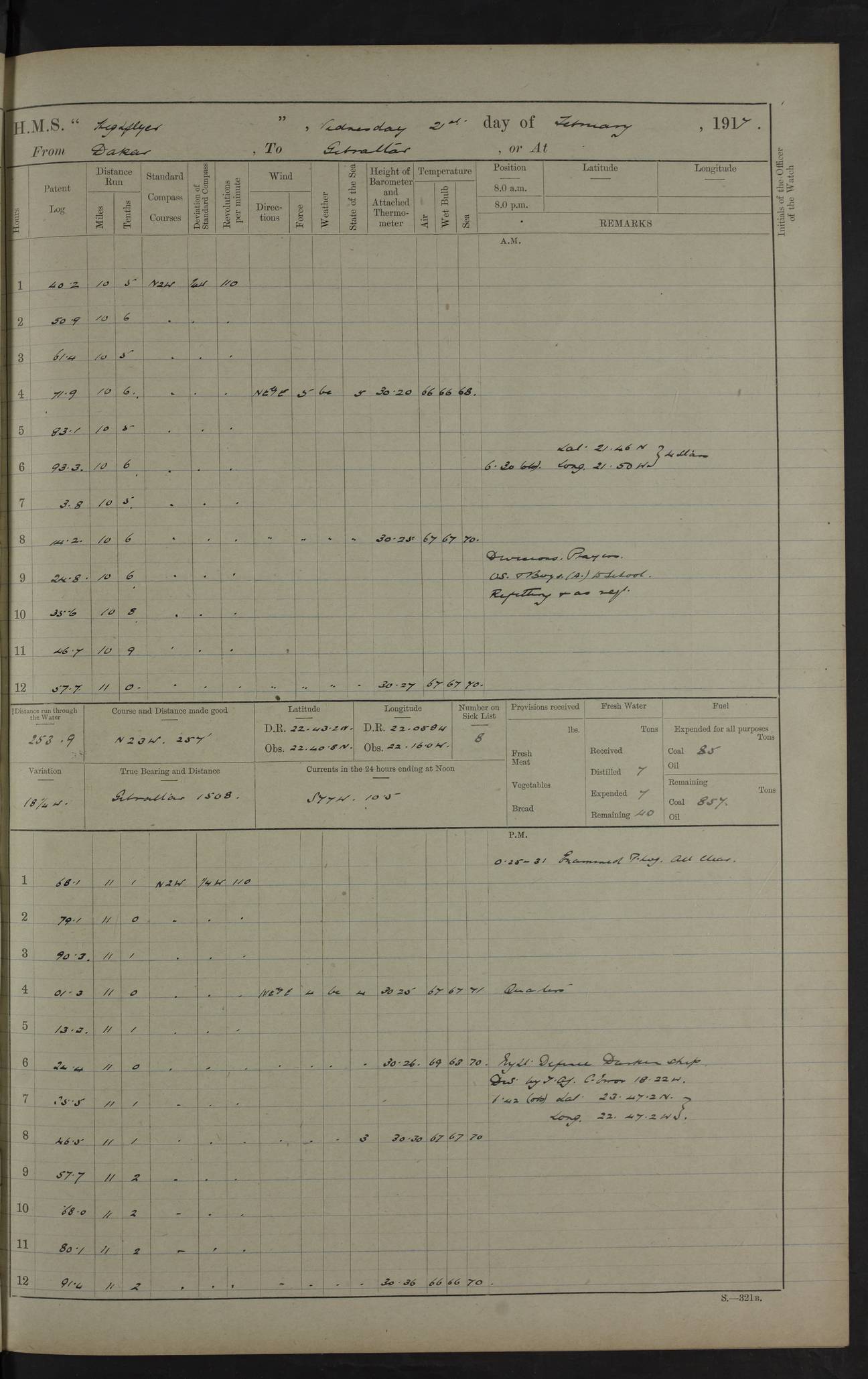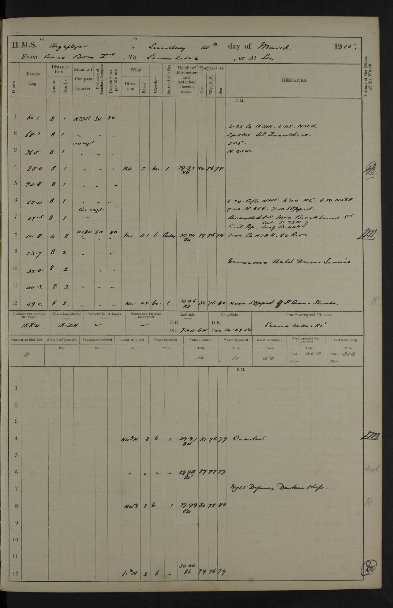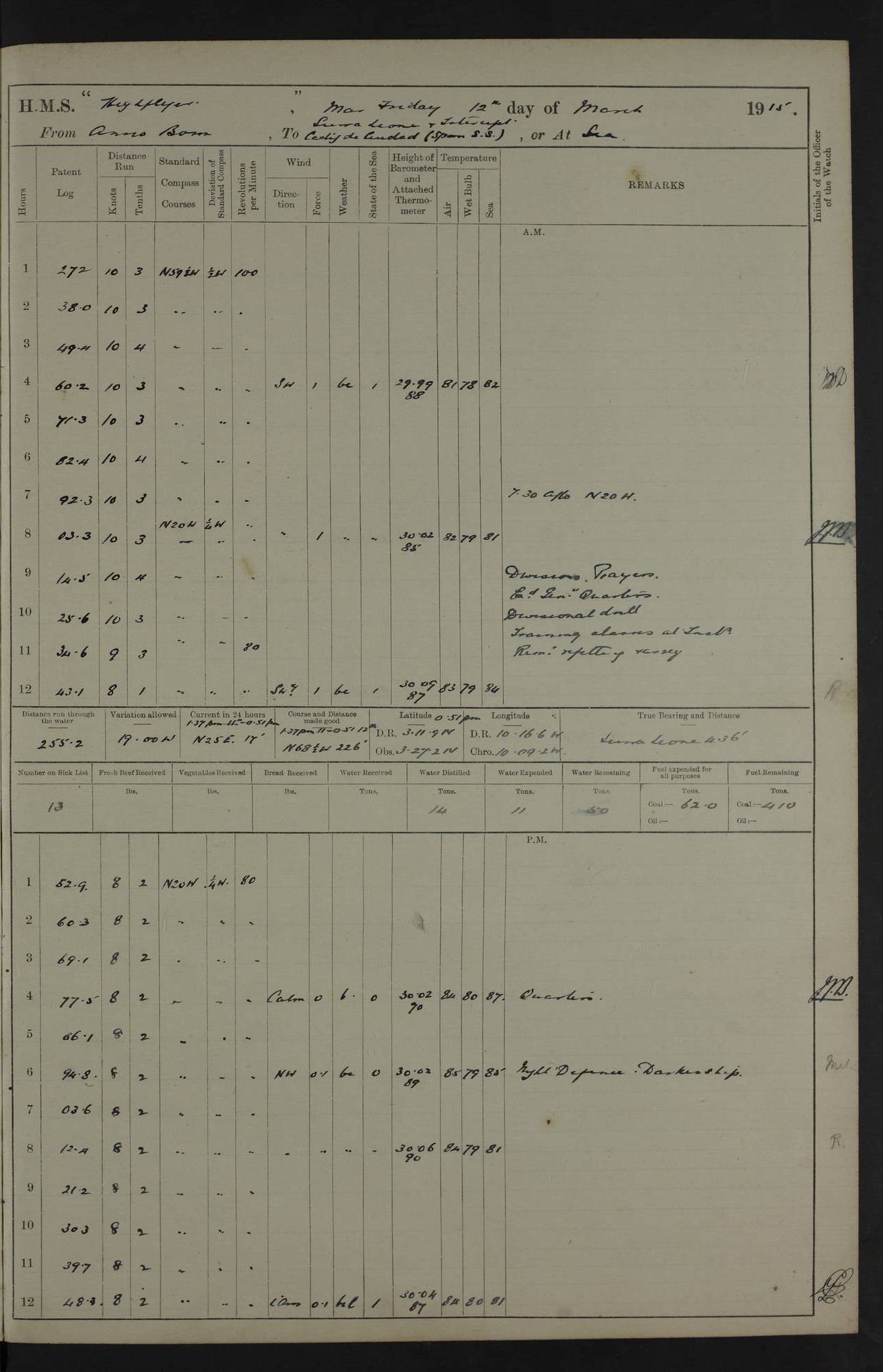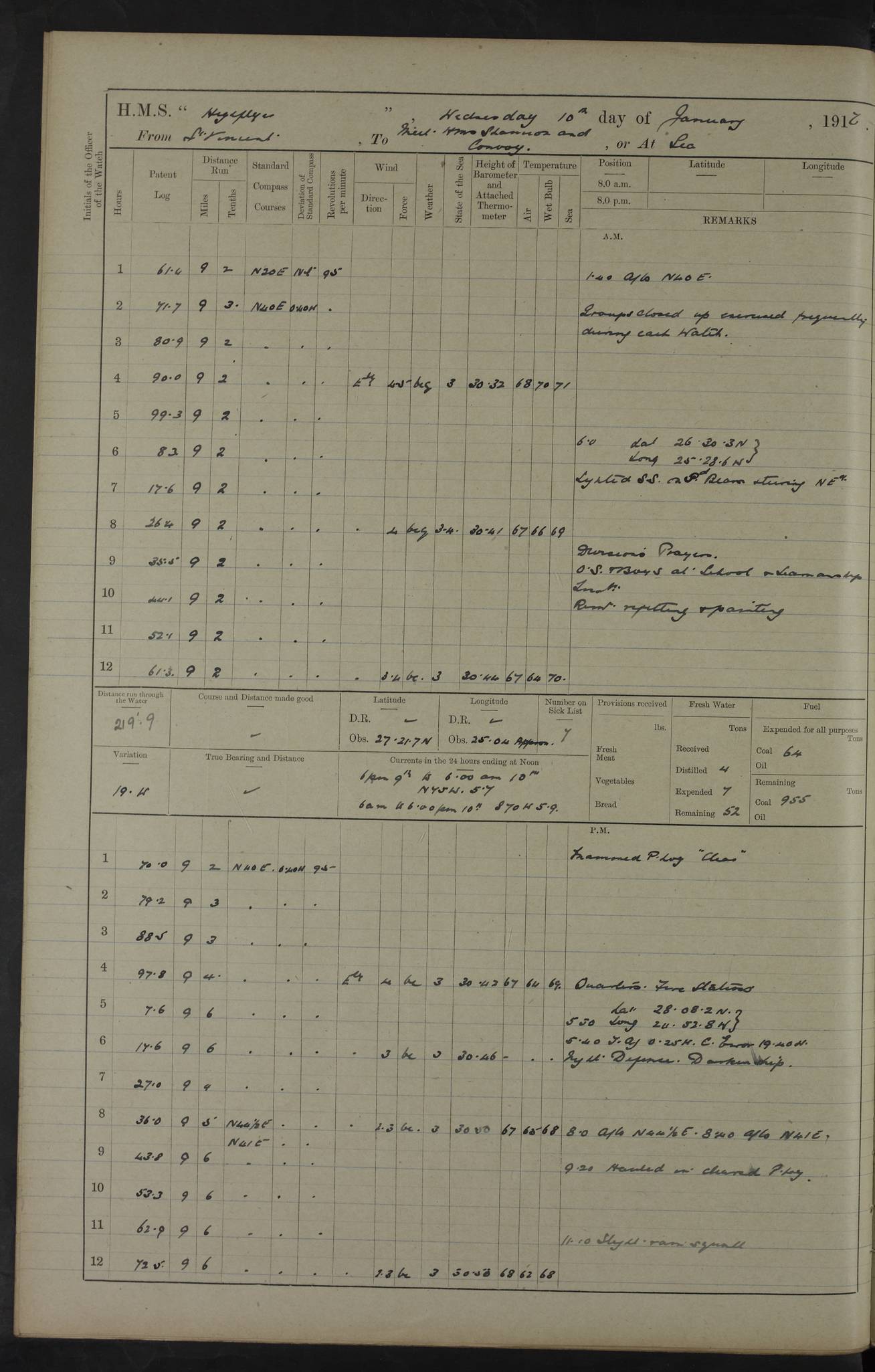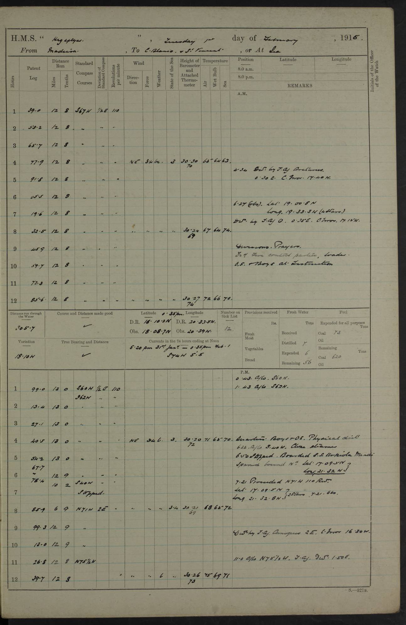 LOGS FOR JANUARY 1915 4f9610aba2fc8e2def000666: (http://s3.amazonaws.com/oldweather/ADM53-44292/ADM 53-44292-112_1.jpg) 1 January 1915 Patrolling off Machado Point Lat 16.8828, Long -25.0106 7.50pm: Weighed and proceeded. Course and speed as requisite to patrol off Machado Point 4f9610aba2fc8e2def000667: (http://s3.amazonaws.com/oldweather/ADM53-44292/ADM 53-44292-113_0.jpg) 2 January 1915 Patrolling off Machado Point Lat 16.8828, Long -25.0106 4.30am: Spoke SS CROWN OF GALICIA bound northward. 6.15am: Spoke HMS MACEDONIA bound northward. 9.00am: Stopped. EMPRESS OF BRITAIN closed and communicated. 10.45pm: Closed and spoke SS BRODERICK bound northward. 4f9610aca2fc8e2def000668: (http://s3.amazonaws.com/oldweather/ADM53-44292/ADM 53-44292-113_1.jpg) 3 January 1915 Patrolling off Machado Point Lat 16.8828, Long -25.0106 2.15am: Spoke SS MAISIA bound northward. 9.00am: Spoke SS KELVINHEAD bound northward (Brit.). 10.00am: Spoke SS ST. LOUIS “French” bound northward. 10.30am: Spoke HMS MARMORA. 1.30pm: EMPRESS OF BRITAIN closed and communicated. 10.30pm: Spoke SS REYNOLDS bound northward. 4f9610aca2fc8e2def000669: (http://s3.amazonaws.com/oldweather/ADM53-44292/ADM 53-44292-114_0.jpg) 4 January 1915 Patrolling off Machado Point Lat 16.8828, Long -25.0106 9.00am: As requisite for entering harbour. 12.30pm: INVINCIBLE in harbour. 2.00pm: MARMORA arrived. 4f9610aca2fc8e2def00066a: (http://s3.amazonaws.com/oldweather/ADM53-44292/ADM 53-44292-114_1.jpg) 5 January 1915 St. Vincent Lat 16.8828, Long -25.0106 3.30pm: EMPRESS OF BRITAIN arrived. 4f9610ada2fc8e2def00066b: (http://s3.amazonaws.com/oldweather/ADM53-44292/ADM 53-44292-115_0.jpg) 6 January 1915 St. Vincent Lat 16.8828, Long -25.0106 9.30am: Discharged 1 prisoner to INVINCIBLE. 5.00pm: HMS INVINCIBLE left harbour. 4f9610ada2fc8e2def00066c: (http://s3.amazonaws.com/oldweather/ADM53-44292/ADM 53-44292-115_1.jpg) 7 January 1915 St. Vincent Lat 16.8828, Long -25.0106 6.30am: HMS INFLEXIBLE arrived. 4f9610ada2fc8e2def00066d: (http://s3.amazonaws.com/oldweather/ADM53-44292/ADM 53-44292-116_0.jpg) 8 January 1915 St. Vincent Lat 16.8828, Long -25.0106 4.30pm: SS ROSEMOUNT drifted on to bows of HIGHFLYER while steaming from VENGEANCE to take up berth. Damage – slight leak in one plate; caulked. 7.00pm: INFLEXIBLE left harbour. 4f9610aea2fc8e2def00066e: (http://s3.amazonaws.com/oldweather/ADM53-44292/ADM 53-44292-116_1.jpg) 9 January 1915 St. Vincent Lat 16.8828, Long -25.0106 Cleaning ship. 4f9610aea2fc8e2def00066f: (http://s3.amazonaws.com/oldweather/ADM53-44292/ADM 53-44292-117_0.jpg) 10 January 1915 St. Vincent and at sea. Lat 16.8828, Long -25.0106 8.30am: Collier OKEHAMPTON came alongside. 11.30am: Finished coaling. 1.00pm: Weighed. Proceeded as requisite. 2.30pm: MARMORA port bow. EMPRESS OF BRITAIN port bow in company. 4f9610aea2fc8e2def000670: (http://s3.amazonaws.com/oldweather/ADM53-44292/ADM 53-44292-117_1.jpg) 11 January 1915 At sea Lat 12.8, Long -24.3 Cleaning ship. 4f9610afa2fc8e2def000671: (http://s3.amazonaws.com/oldweather/ADM53-44292/ADM 53-44292-118_0.jpg) 12 January 1915 At sea Lat 8.6, Long -23.1 Refitting and as requisite. 4f9610afa2fc8e2def000672: (http://s3.amazonaws.com/oldweather/ADM53-44292/ADM 53-44292-118_1.jpg) 13 January 1915 At sea Lat 4.6, Long -21.4 10.30am: Divisional drill. Refitting and as requisite. 4f9610afa2fc8e2def000673: (http://s3.amazonaws.com/oldweather/ADM53-44292/ADM 53-44292-119_0.jpg) 14 January 1915 Patrolling Lat 1.4, Long -20.0 1.45pm: MARMORA took station N25W. EMPRESS OF BRITAIN S65W. 4f9610b0a2fc8e2def000674: (http://s3.amazonaws.com/oldweather/ADM53-44292/ADM 53-44292-119_1.jpg) 15 January 1915 [14 January in log] At sea Lat 1.2, Long -23.2 10.00am: Divisional drill. Refitting and as requisite. 4f9610b0a2fc8e2def000675: (http://s3.amazonaws.com/oldweather/ADM53-44292/ADM 53-44292-120_0.jpg) 16 January 1915 At sea Lat 1.4, Long -25.6 8.20am: Stopped. Boarded SS ESPERANZA, Italian, Buenos Aires to Dakar, Lat 1.20N, Long 24.35W DR. 4f9610b0a2fc8e2def000676: (http://s3.amazonaws.com/oldweather/ADM53-44292/ADM 53-44292-120_1.jpg) 17 January 1915 At sea Lat 2.6, Long -25.8 1.30pm: Sighted steamer E½N approx. 2.30pm: HMS MARMORA boarded SS ARDGAIN bound Rio de Janeiro. 4f9610b1a2fc8e2def000677: (http://s3.amazonaws.com/oldweather/ADM53-44292/ADM 53-44292-121_0.jpg) 18 January 1915 At sea Lat 2.6, Long -24.2 11.00pm: HMS EMPRESS OF BRITAIN boarded SS ILDERTON bound south (Brit.). 4f9610b1a2fc8e2def000678: (http://s3.amazonaws.com/oldweather/ADM53-44292/ADM 53-44292-121_1.jpg) 19 January 1915 At sea Lat 2.7, Long -21.4 9.30am: Refitting and as requisite. Boys at physical drill. 4f9610b1a2fc8e2def000679: (http://s3.amazonaws.com/oldweather/ADM53-44292/ADM 53-44292-122_0.jpg) 20 January 1915 At sea Lat 2.7, Long -18.2 10.00am: Boys at physical drill. Remainder refitting and as requisite. 4f9610b2a2fc8e2def00067a: (http://s3.amazonaws.com/oldweather/ADM53-44292/ADM 53-44292-122_1.jpg) 21 January 1915 To Sierra Leone Lat 5.5, Long -16.3 9.30am: General Quarters. Loader. Refitting and as requisite. 4f9610b2a2fc8e2def00067b: (http://s3.amazonaws.com/oldweather/ADM53-44292/ADM 53-44292-123_0.jpg) 22 January 1915 To Sierra Leone Lat 8.4, Long -14.1 4.40pm: Came to with PB in 7 fathoms., veered to 5 shackles. 4f9610b2a2fc8e2def00067c: (http://s3.amazonaws.com/oldweather/ADM53-44292/ADM 53-44292-123_1.jpg) 23 January 1915 Sierra Leone Lat 8.5, Long -13.2 7.10am: Passed Examination Service. 7.40am: Proceeded as requisite to anchorage. 10.00am: Collier SS LUDGATE came alongside. Coaling ship. 6.00pm: Finished coaling; received 906 tons. 4f9610b3a2fc8e2def00067d: (http://s3.amazonaws.com/oldweather/ADM53-44292/ADM 53-44292-124_0.jpg) 24 January 1915 Sierra Leone Lat 8.5, Long -13.2 6.15am: Cleaning ship. 4f9610b3a2fc8e2def00067e: (http://s3.amazonaws.com/oldweather/ADM53-44292/ADM 53-44292-124_1.jpg) 25 January 1915 Sierra Leone Lat 8.5, Long -13.2 11.30am: Court Martial held on board HMS MARMORA. 1.00pm: 