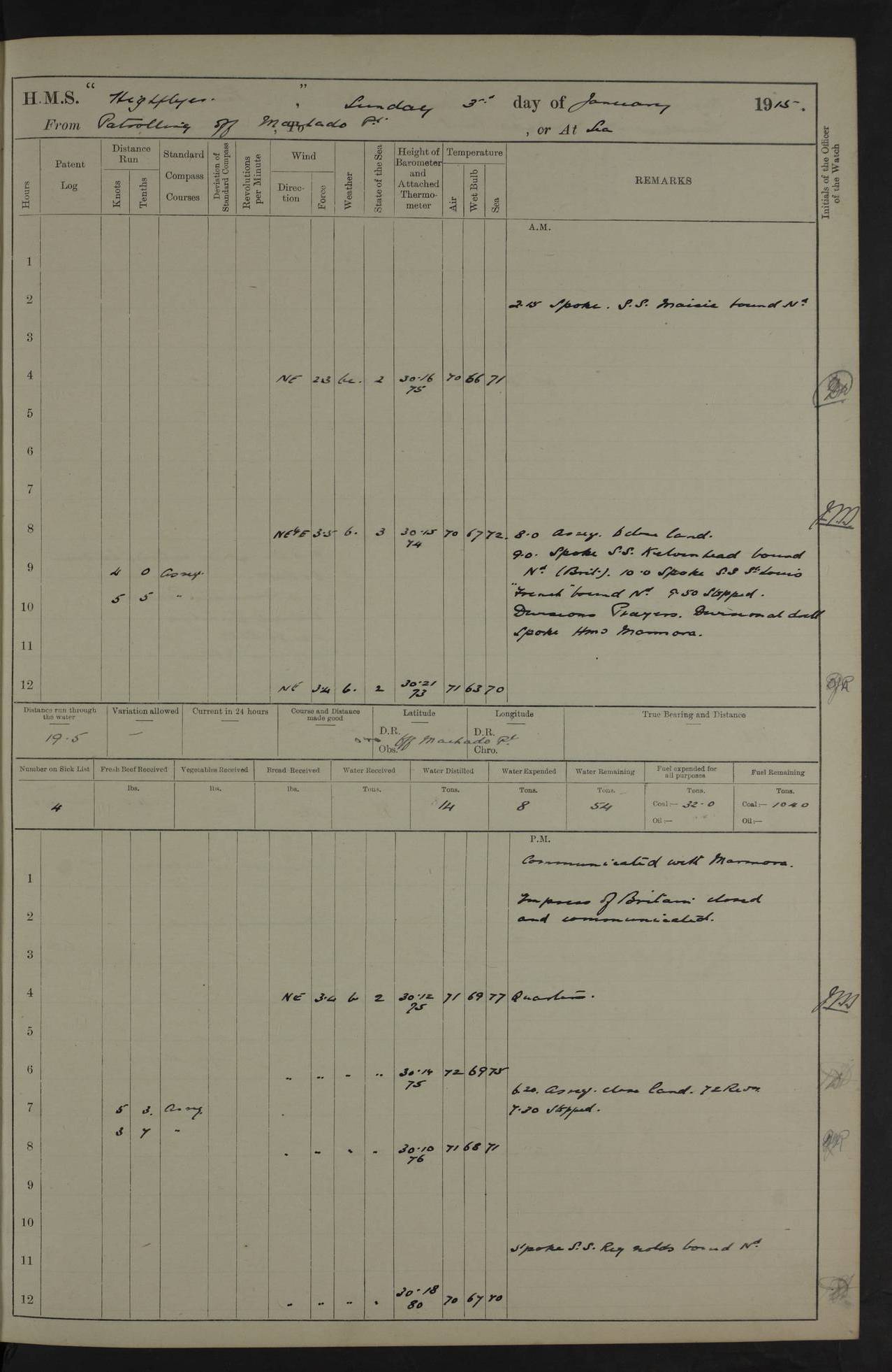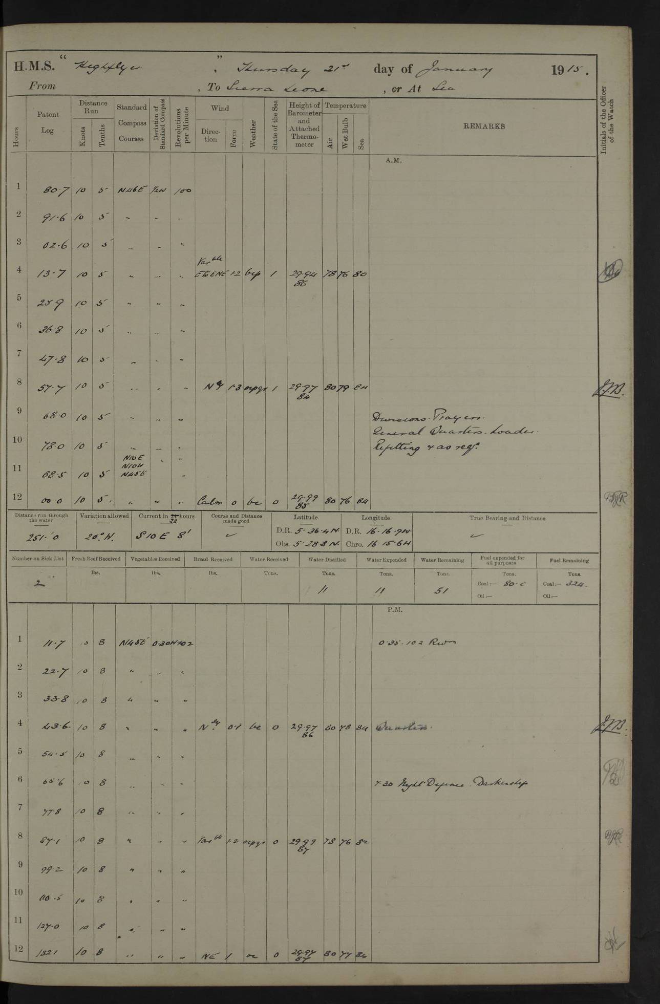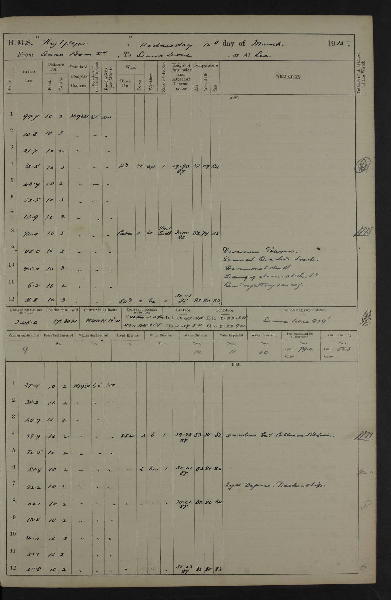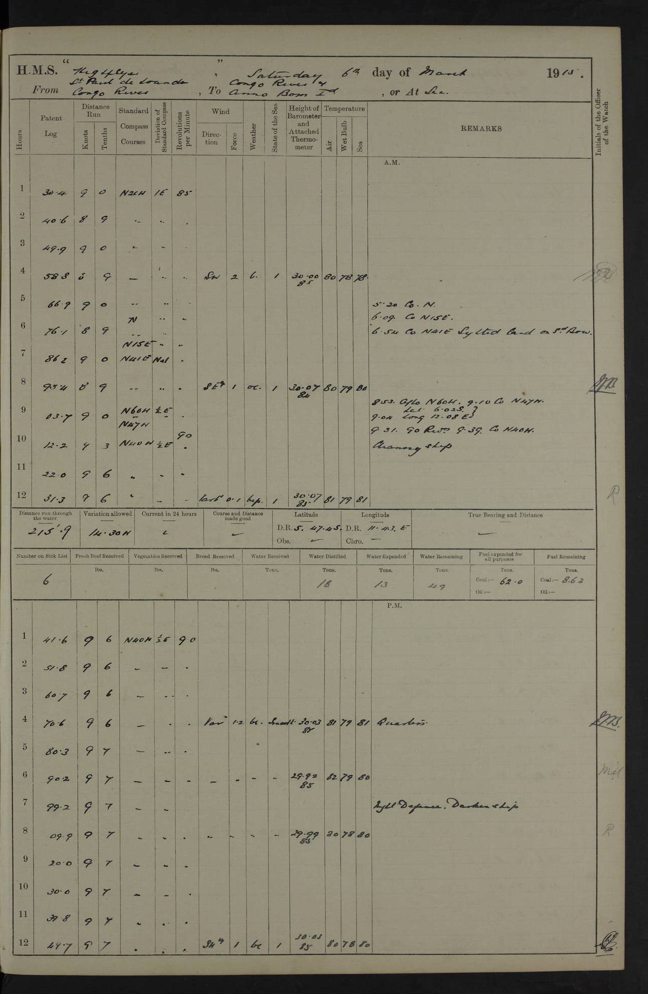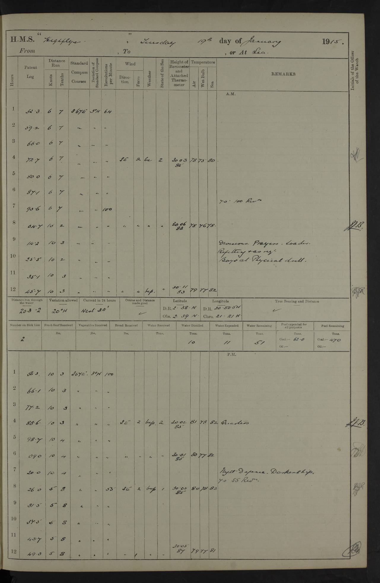 LOGS FOR JANUARY 1915 4f9610aba2fc8e2def000666: (http://s3.amazonaws.com/oldweather/ADM53-44292/ADM 53-44292-112_1.jpg) 1 January 1915 Patrolling off Machado Point Lat 16.8828, Long -25.0106 7.50pm: Weighed and proceeded. Course and speed as requisite to patrol off Machado Point 4f9610aba2fc8e2def000667: (http://s3.amazonaws.com/oldweather/ADM53-44292/ADM 53-44292-113_0.jpg) 2 January 1915 Patrolling off Machado Point Lat 16.8828, Long -25.0106 4.30am: Spoke SS CROWN OF GALICIA bound northward. 6.15am: Spoke HMS MACEDONIA bound northward. 9.00am: Stopped. EMPRESS OF BRITAIN closed and communicated. 10.45pm: Closed and spoke SS BRODERICK bound northward. 4f9610aca2fc8e2def000668: (http://s3.amazonaws.com/oldweather/ADM53-44292/ADM 53-44292-113_1.jpg) 3 January 1915 Patrolling off Machado Point Lat 16.8828, Long -25.0106 2.15am: Spoke SS MAISIA bound northward. 9.00am: Spoke SS KELVINHEAD bound northward (Brit.). 10.00am: Spoke SS ST. LOUIS “French” bound northward. 10.30am: Spoke HMS MARMORA. 1.30pm: EMPRESS OF BRITAIN closed and communicated. 10.30pm: Spoke SS REYNOLDS bound northward. 4f9610aca2fc8e2def000669: (http://s3.amazonaws.com/oldweather/ADM53-44292/ADM 53-44292-114_0.jpg) 4 January 1915 Patrolling off Machado Point Lat 16.8828, Long -25.0106 9.00am: As requisite for entering harbour. 12.30pm: INVINCIBLE in harbour. 2.00pm: MARMORA arrived. 4f9610aca2fc8e2def00066a: (http://s3.amazonaws.com/oldweather/ADM53-44292/ADM 53-44292-114_1.jpg) 5 January 1915 St. Vincent Lat 16.8828, Long -25.0106 3.30pm: EMPRESS OF BRITAIN arrived. 4f9610ada2fc8e2def00066b: (http://s3.amazonaws.com/oldweather/ADM53-44292/ADM 53-44292-115_0.jpg) 6 January 1915 St. Vincent Lat 16.8828, Long -25.0106 9.30am: Discharged 1 prisoner to INVINCIBLE. 5.00pm: HMS INVINCIBLE left harbour. 4f9610ada2fc8e2def00066c: (http://s3.amazonaws.com/oldweather/ADM53-44292/ADM 53-44292-115_1.jpg) 7 January 1915 St. Vincent Lat 16.8828, Long -25.0106 6.30am: HMS INFLEXIBLE arrived. 4f9610ada2fc8e2def00066d: (http://s3.amazonaws.com/oldweather/ADM53-44292/ADM 53-44292-116_0.jpg) 8 January 1915 St. Vincent Lat 16.8828, Long -25.0106 4.30pm: SS ROSEMOUNT drifted on to bows of HIGHFLYER while steaming from VENGEANCE to take up berth. Damage – slight leak in one plate; caulked. 7.00pm: INFLEXIBLE left harbour. 4f9610aea2fc8e2def00066e: (http://s3.amazonaws.com/oldweather/ADM53-44292/ADM 53-44292-116_1.jpg) 9 January 1915 St. Vincent Lat 16.8828, Long -25.0106 Cleaning ship. 4f9610aea2fc8e2def00066f: (http://s3.amazonaws.com/oldweather/ADM53-44292/ADM 53-44292-117_0.jpg) 10 January 1915 St. Vincent and at sea. Lat 16.8828, Long -25.0106 8.30am: Collier OKEHAMPTON came alongside. 11.30am: Finished coaling. 1.00pm: Weighed. Proceeded as requisite. 2.30pm: MARMORA port bow. EMPRESS OF BRITAIN port bow in company. 4f9610aea2fc8e2def000670: (http://s3.amazonaws.com/oldweather/ADM53-44292/ADM 53-44292-117_1.jpg) 11 January 1915 At sea Lat 12.8, Long -24.3 Cleaning ship. 4f9610afa2fc8e2def000671: (http://s3.amazonaws.com/oldweather/ADM53-44292/ADM 53-44292-118_0.jpg) 12 January 1915 At sea Lat 8.6, Long -23.1 Refitting and as requisite. 4f9610afa2fc8e2def000672: (http://s3.amazonaws.com/oldweather/ADM53-44292/ADM 53-44292-118_1.jpg) 13 January 1915 At sea Lat 4.6, Long -21.4 10.30am: Divisional drill. Refitting and as requisite. 4f9610afa2fc8e2def000673: (http://s3.amazonaws.com/oldweather/ADM53-44292/ADM 53-44292-119_0.jpg) 14 January 1915 Patrolling Lat 1.4, Long -20.0 1.45pm: MARMORA took station N25W. EMPRESS OF BRITAIN S65W. 4f9610b0a2fc8e2def000674: (http://s3.amazonaws.com/oldweather/ADM53-44292/ADM 53-44292-119_1.jpg) 15 January 1915 [14 January in log] At sea Lat 1.2, Long -23.2 10.00am: Divisional drill. Refitting and as requisite. 4f9610b0a2fc8e2def000675: (http://s3.amazonaws.com/oldweather/ADM53-44292/ADM 53-44292-120_0.jpg) 16 January 1915 At sea Lat 1.4, Long -25.6 8.20am: Stopped. Boarded SS ESPERANZA, Italian, Buenos Aires to Dakar, Lat 1.20N, Long 24.35W DR. 4f9610b0a2fc8e2def000676: (http://s3.amazonaws.com/oldweather/ADM53-44292/ADM 53-44292-120_1.jpg) 17 January 1915 At sea Lat 2.6, Long -25.8 1.30pm: Sighted steamer E½N approx. 2.30pm: HMS MARMORA boarded SS ARDGAIN bound Rio de Janeiro. 4f9610b1a2fc8e2def000677: (http://s3.amazonaws.com/oldweather/ADM53-44292/ADM 53-44292-121_0.jpg) 18 January 1915 At sea Lat 2.6, Long -24.2 11.00pm: HMS EMPRESS OF BRITAIN boarded SS ILDERTON bound south (Brit.). 4f9610b1a2fc8e2def000678: (http://s3.amazonaws.com/oldweather/ADM53-44292/ADM 53-44292-121_1.jpg) 19 January 1915 At sea Lat 2.7, Long -21.4 9.30am: Refitting and as requisite. Boys at physical drill. 4f9610b1a2fc8e2def000679: (http://s3.amazonaws.com/oldweather/ADM53-44292/ADM 53-44292-122_0.jpg) 20 January 1915 At sea Lat 2.7, Long -18.2 10.00am: Boys at physical drill. Remainder refitting and as requisite. 4f9610b2a2fc8e2def00067a: (http://s3.amazonaws.com/oldweather/ADM53-44292/ADM 53-44292-122_1.jpg) 21 January 1915 To Sierra Leone Lat 5.5, Long -16.3 9.30am: General Quarters. Loader. Refitting and as requisite. 4f9610b2a2fc8e2def00067b: (http://s3.amazonaws.com/oldweather/ADM53-44292/ADM 53-44292-123_0.jpg) 22 January 1915 To Sierra Leone Lat 8.4, Long -14.1 4.40pm: Came to with PB in 7 fathoms., veered to 5 shackles. 4f9610b2a2fc8e2def00067c: (http://s3.amazonaws.com/oldweather/ADM53-44292/ADM 53-44292-123_1.jpg) 23 January 1915 Sierra Leone Lat 8.5, Long -13.2 7.10am: Passed Examination Service. 7.40am: Proceeded as requisite to anchorage. 10.00am: Collier SS LUDGATE came alongside. Coaling ship. 6.00pm: Finished coaling; received 906 tons. 4f9610b3a2fc8e2def00067d: (http://s3.amazonaws.com/oldweather/ADM53-44292/ADM 53-44292-124_0.jpg) 24 January 1915 Sierra Leone Lat 8.5, Long -13.2 6.15am: Cleaning ship. 4f9610b3a2fc8e2def00067e: (http://s3.amazonaws.com/oldweather/ADM53-44292/ADM 53-44292-124_1.jpg) 25 January 1915 Sierra Leone Lat 8.5, Long -13.2 11.30am: Court Martial held on board HMS MARMORA. 1.00pm: 