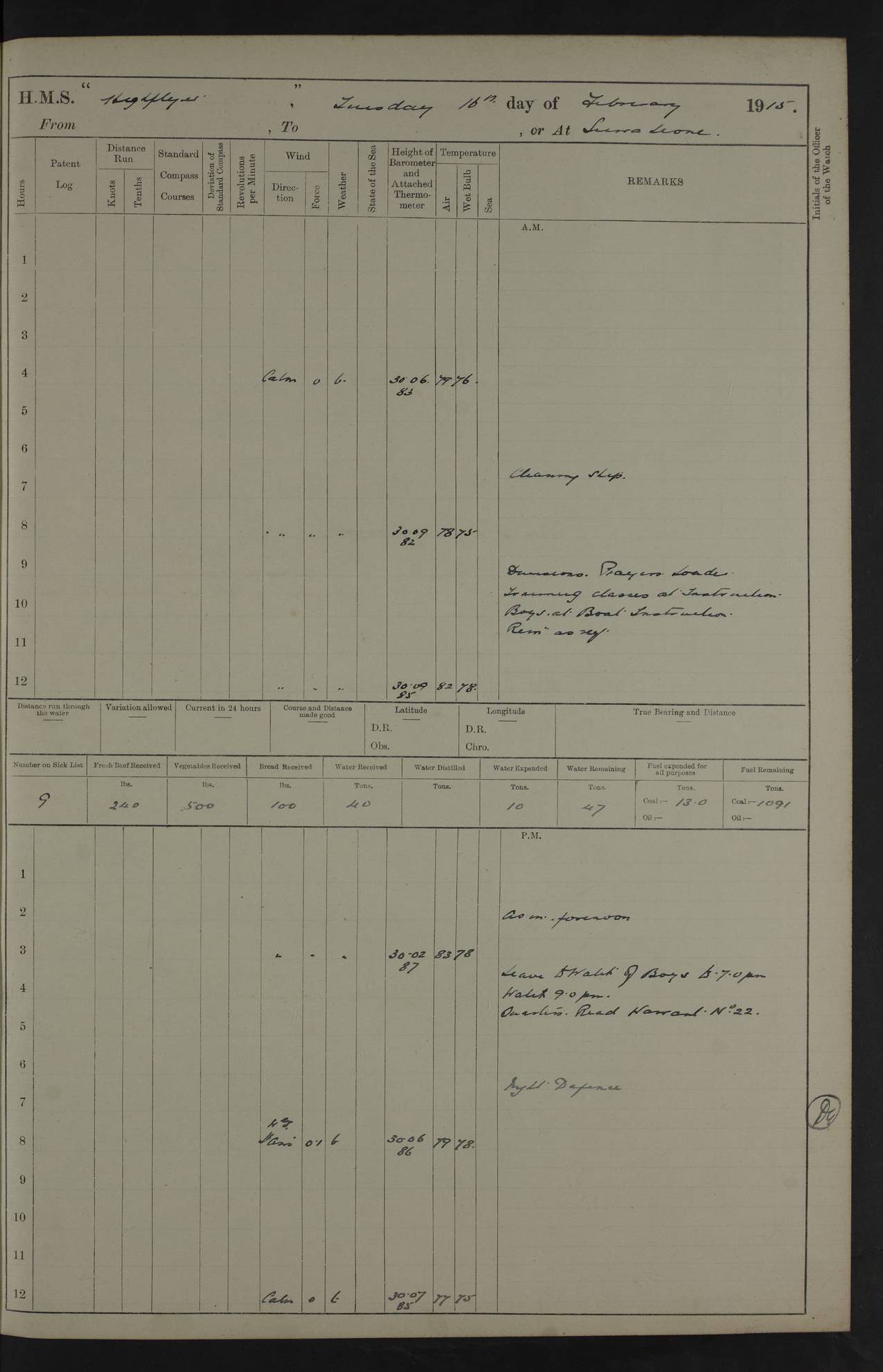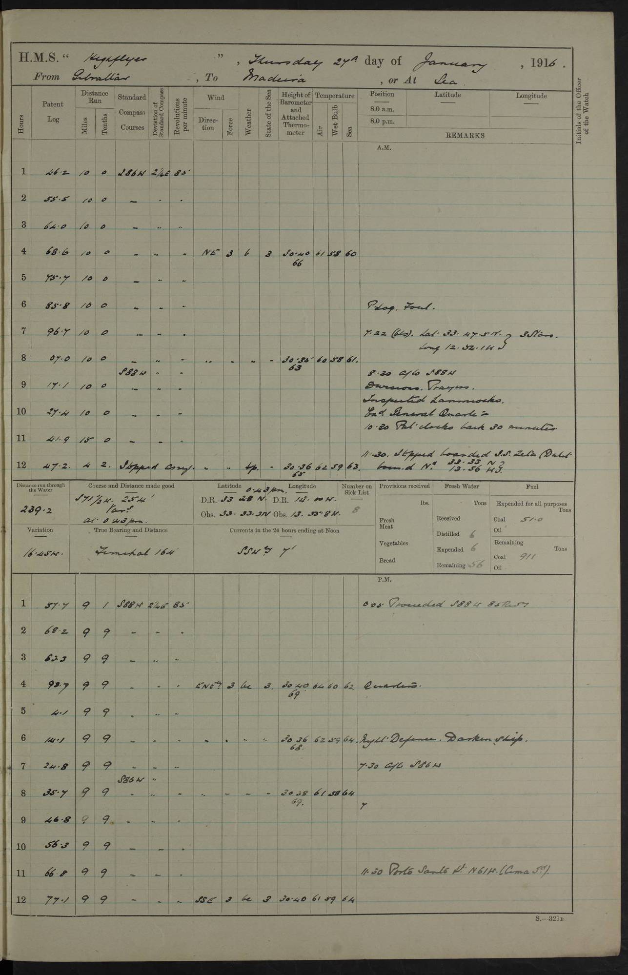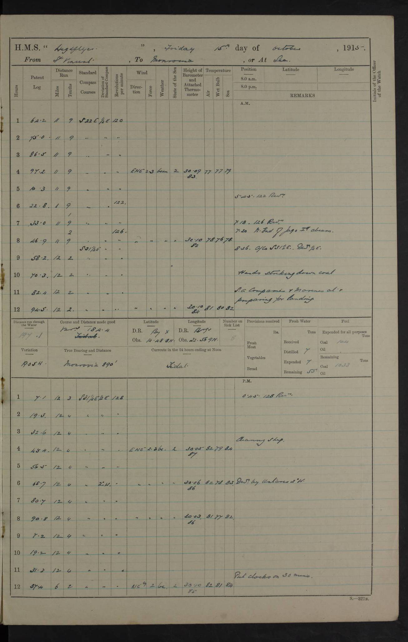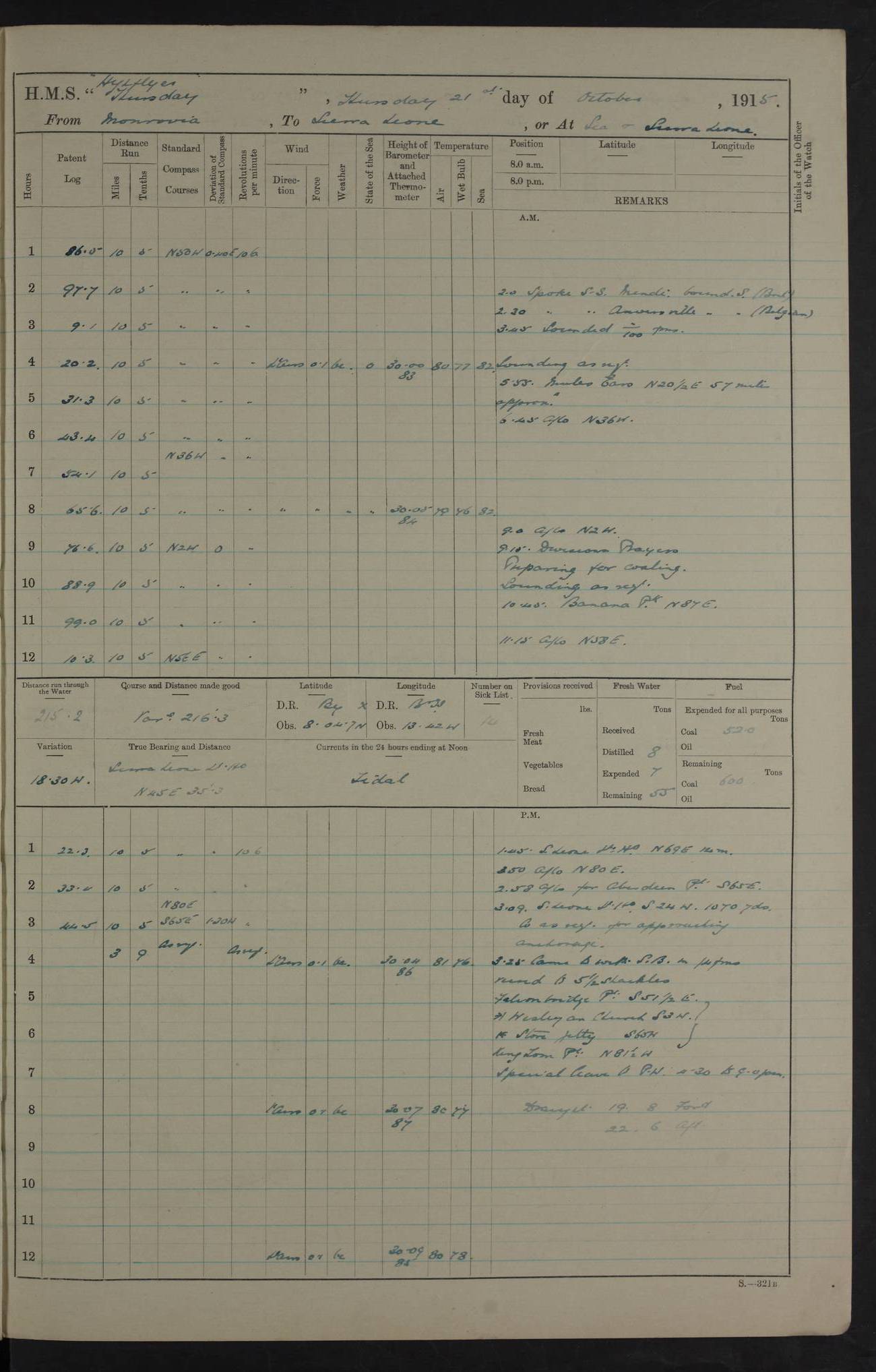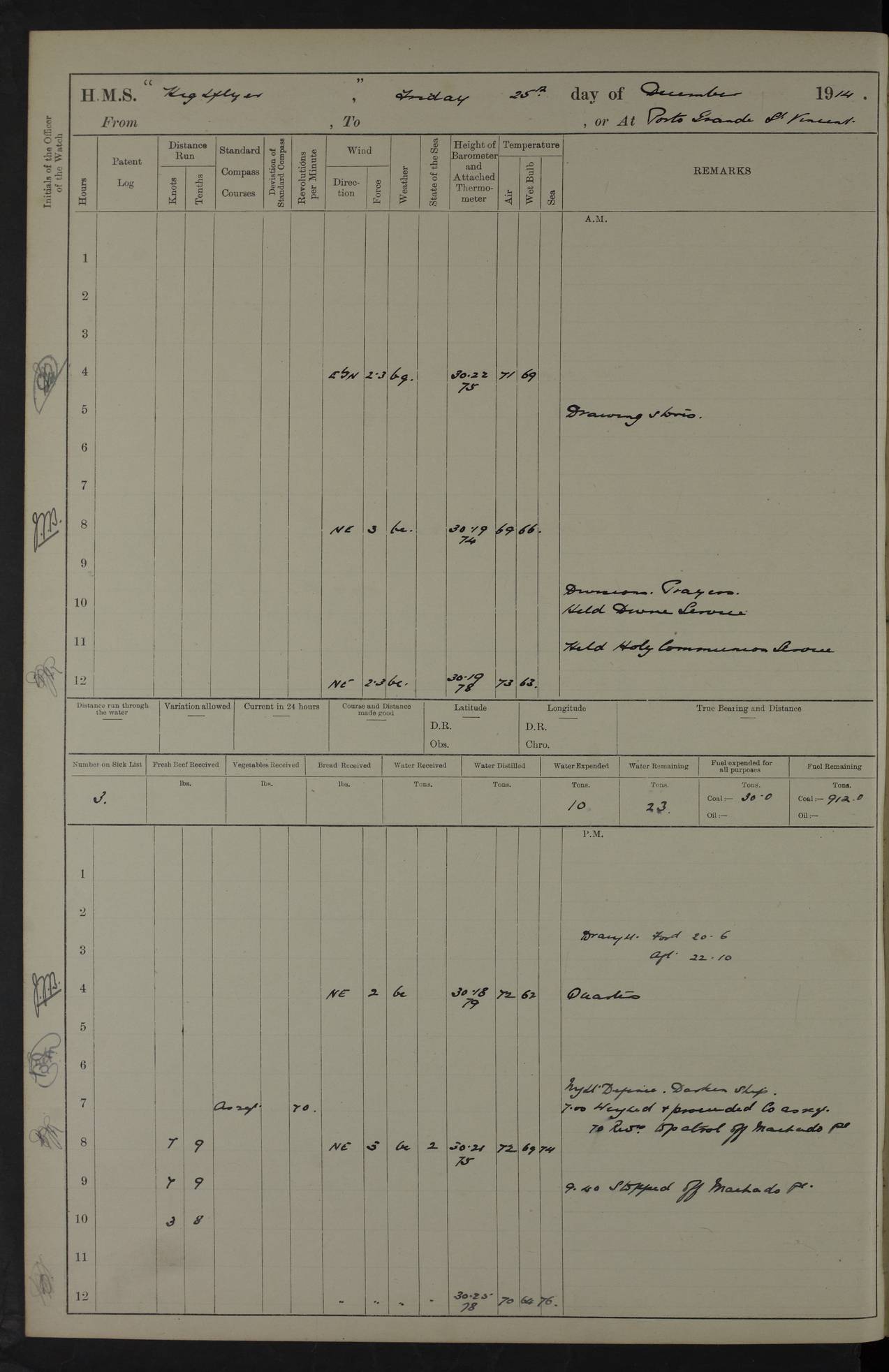 LOGS FOR JANUARY 1915 4f9610aba2fc8e2def000666: (http://s3.amazonaws.com/oldweather/ADM53-44292/ADM 53-44292-112_1.jpg) 1 January 1915 Patrolling off Machado Point Lat 16.8828, Long -25.0106 7.50pm: Weighed and proceeded. Course and speed as requisite to patrol off Machado Point 4f9610aba2fc8e2def000667: (http://s3.amazonaws.com/oldweather/ADM53-44292/ADM 53-44292-113_0.jpg) 2 January 1915 Patrolling off Machado Point Lat 16.8828, Long -25.0106 4.30am: Spoke SS CROWN OF GALICIA bound northward. 6.15am: Spoke HMS MACEDONIA bound northward. 9.00am: Stopped. EMPRESS OF BRITAIN closed and communicated. 10.45pm: Closed and spoke SS BRODERICK bound northward. 4f9610aca2fc8e2def000668: (http://s3.amazonaws.com/oldweather/ADM53-44292/ADM 53-44292-113_1.jpg) 3 January 1915 Patrolling off Machado Point Lat 16.8828, Long -25.0106 2.15am: Spoke SS MAISIA bound northward. 9.00am: Spoke SS KELVINHEAD bound northward (Brit.). 10.00am: Spoke SS ST. LOUIS “French” bound northward. 10.30am: Spoke HMS MARMORA. 1.30pm: EMPRESS OF BRITAIN closed and communicated. 10.30pm: Spoke SS REYNOLDS bound northward. 4f9610aca2fc8e2def000669: (http://s3.amazonaws.com/oldweather/ADM53-44292/ADM 53-44292-114_0.jpg) 4 January 1915 Patrolling off Machado Point Lat 16.8828, Long -25.0106 9.00am: As requisite for entering harbour. 12.30pm: INVINCIBLE in harbour. 2.00pm: MARMORA arrived. 4f9610aca2fc8e2def00066a: (http://s3.amazonaws.com/oldweather/ADM53-44292/ADM 53-44292-114_1.jpg) 5 January 1915 St. Vincent Lat 16.8828, Long -25.0106 3.30pm: EMPRESS OF BRITAIN arrived. 4f9610ada2fc8e2def00066b: (http://s3.amazonaws.com/oldweather/ADM53-44292/ADM 53-44292-115_0.jpg) 6 January 1915 St. Vincent Lat 16.8828, Long -25.0106 9.30am: Discharged 1 prisoner to INVINCIBLE. 5.00pm: HMS INVINCIBLE left harbour. 4f9610ada2fc8e2def00066c: (http://s3.amazonaws.com/oldweather/ADM53-44292/ADM 53-44292-115_1.jpg) 7 January 1915 St. Vincent Lat 16.8828, Long -25.0106 6.30am: HMS INFLEXIBLE arrived. 4f9610ada2fc8e2def00066d: (http://s3.amazonaws.com/oldweather/ADM53-44292/ADM 53-44292-116_0.jpg) 8 January 1915 St. Vincent Lat 16.8828, Long -25.0106 4.30pm: SS ROSEMOUNT drifted on to bows of HIGHFLYER while steaming from VENGEANCE to take up berth. Damage – slight leak in one plate; caulked. 7.00pm: INFLEXIBLE left harbour. 4f9610aea2fc8e2def00066e: (http://s3.amazonaws.com/oldweather/ADM53-44292/ADM 53-44292-116_1.jpg) 9 January 1915 St. Vincent Lat 16.8828, Long -25.0106 Cleaning ship. 4f9610aea2fc8e2def00066f: (http://s3.amazonaws.com/oldweather/ADM53-44292/ADM 53-44292-117_0.jpg) 10 January 1915 St. Vincent and at sea. Lat 16.8828, Long -25.0106 8.30am: Collier OKEHAMPTON came alongside. 11.30am: Finished coaling. 1.00pm: Weighed. Proceeded as requisite. 2.30pm: MARMORA port bow. EMPRESS OF BRITAIN port bow in company. 4f9610aea2fc8e2def000670: (http://s3.amazonaws.com/oldweather/ADM53-44292/ADM 53-44292-117_1.jpg) 11 January 1915 At sea Lat 12.8, Long -24.3 Cleaning ship. 4f9610afa2fc8e2def000671: (http://s3.amazonaws.com/oldweather/ADM53-44292/ADM 53-44292-118_0.jpg) 12 January 1915 At sea Lat 8.6, Long -23.1 Refitting and as requisite. 4f9610afa2fc8e2def000672: (http://s3.amazonaws.com/oldweather/ADM53-44292/ADM 53-44292-118_1.jpg) 13 January 1915 At sea Lat 4.6, Long -21.4 10.30am: Divisional drill. Refitting and as requisite. 4f9610afa2fc8e2def000673: (http://s3.amazonaws.com/oldweather/ADM53-44292/ADM 53-44292-119_0.jpg) 14 January 1915 Patrolling Lat 1.4, Long -20.0 1.45pm: MARMORA took station N25W. EMPRESS OF BRITAIN S65W. 4f9610b0a2fc8e2def000674: (http://s3.amazonaws.com/oldweather/ADM53-44292/ADM 53-44292-119_1.jpg) 15 January 1915 [14 January in log] At sea Lat 1.2, Long -23.2 10.00am: Divisional drill. Refitting and as requisite. 4f9610b0a2fc8e2def000675: (http://s3.amazonaws.com/oldweather/ADM53-44292/ADM 53-44292-120_0.jpg) 16 January 1915 At sea Lat 1.4, Long -25.6 8.20am: Stopped. Boarded SS ESPERANZA, Italian, Buenos Aires to Dakar, Lat 1.20N, Long 24.35W DR. 4f9610b0a2fc8e2def000676: (http://s3.amazonaws.com/oldweather/ADM53-44292/ADM 53-44292-120_1.jpg) 17 January 1915 At sea Lat 2.6, Long -25.8 1.30pm: Sighted steamer E½N approx. 2.30pm: HMS MARMORA boarded SS ARDGAIN bound Rio de Janeiro. 4f9610b1a2fc8e2def000677: (http://s3.amazonaws.com/oldweather/ADM53-44292/ADM 53-44292-121_0.jpg) 18 January 1915 At sea Lat 2.6, Long -24.2 11.00pm: HMS EMPRESS OF BRITAIN boarded SS ILDERTON bound south (Brit.). 4f9610b1a2fc8e2def000678: (http://s3.amazonaws.com/oldweather/ADM53-44292/ADM 53-44292-121_1.jpg) 19 January 1915 At sea Lat 2.7, Long -21.4 9.30am: Refitting and as requisite. Boys at physical drill. 4f9610b1a2fc8e2def000679: (http://s3.amazonaws.com/oldweather/ADM53-44292/ADM 53-44292-122_0.jpg) 20 January 1915 At sea Lat 2.7, Long -18.2 10.00am: Boys at physical drill. Remainder refitting and as requisite. 4f9610b2a2fc8e2def00067a: (http://s3.amazonaws.com/oldweather/ADM53-44292/ADM 53-44292-122_1.jpg) 21 January 1915 To Sierra Leone Lat 5.5, Long -16.3 9.30am: General Quarters. Loader. Refitting and as requisite. 4f9610b2a2fc8e2def00067b: (http://s3.amazonaws.com/oldweather/ADM53-44292/ADM 53-44292-123_0.jpg) 22 January 1915 To Sierra Leone Lat 8.4, Long -14.1 4.40pm: Came to with PB in 7 fathoms., veered to 5 shackles. 4f9610b2a2fc8e2def00067c: (http://s3.amazonaws.com/oldweather/ADM53-44292/ADM 53-44292-123_1.jpg) 23 January 1915 Sierra Leone Lat 8.5, Long -13.2 7.10am: Passed Examination Service. 7.40am: Proceeded as requisite to anchorage. 10.00am: Collier SS LUDGATE came alongside. Coaling ship. 6.00pm: Finished coaling; received 906 tons. 4f9610b3a2fc8e2def00067d: (http://s3.amazonaws.com/oldweather/ADM53-44292/ADM 53-44292-124_0.jpg) 24 January 1915 Sierra Leone Lat 8.5, Long -13.2 6.15am: Cleaning ship. 4f9610b3a2fc8e2def00067e: (http://s3.amazonaws.com/oldweather/ADM53-44292/ADM 53-44292-124_1.jpg) 25 January 1915 Sierra Leone Lat 8.5, Long -13.2 11.30am: Court Martial held on board HMS MARMORA. 1.00pm: 