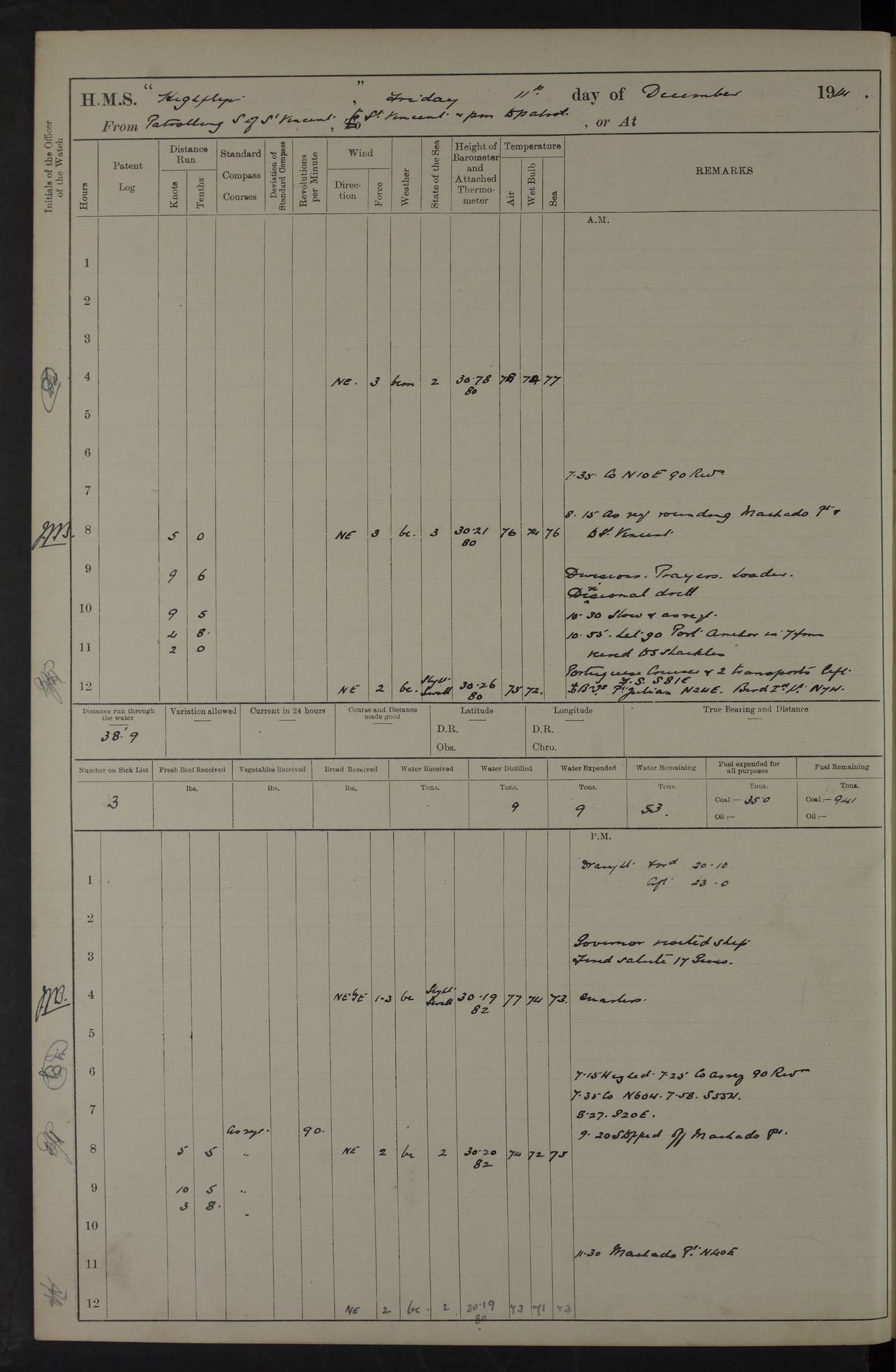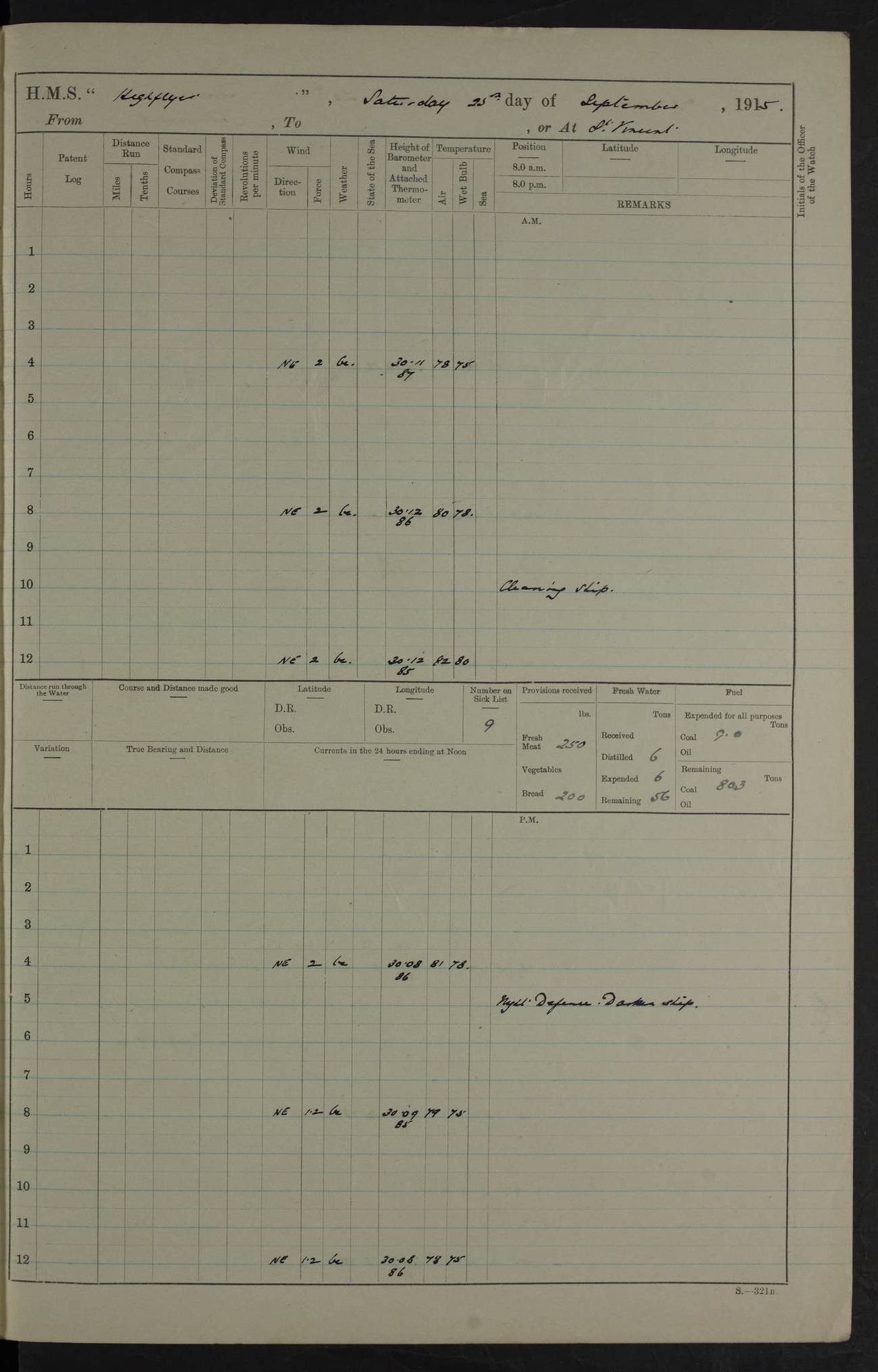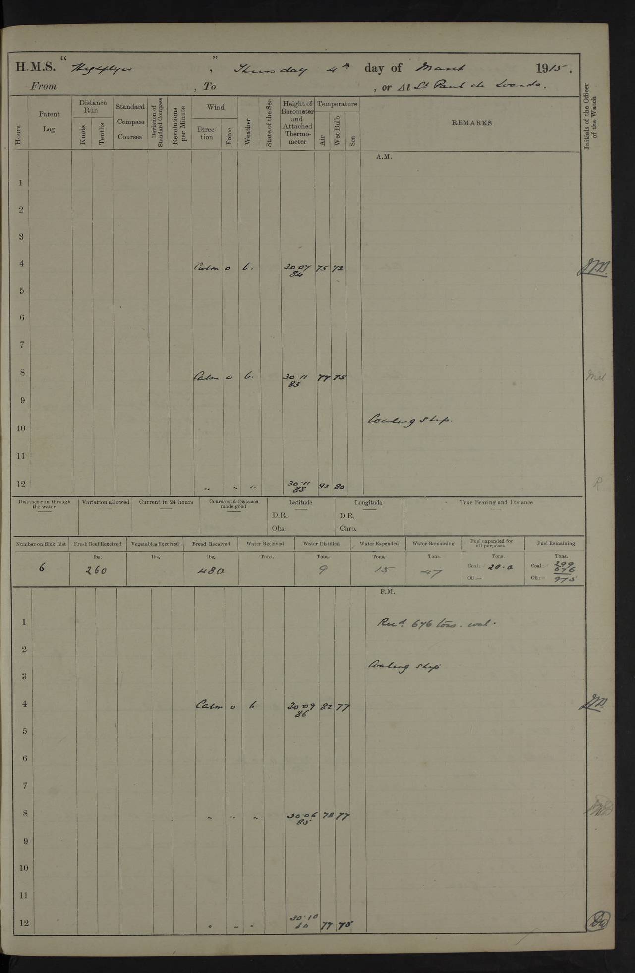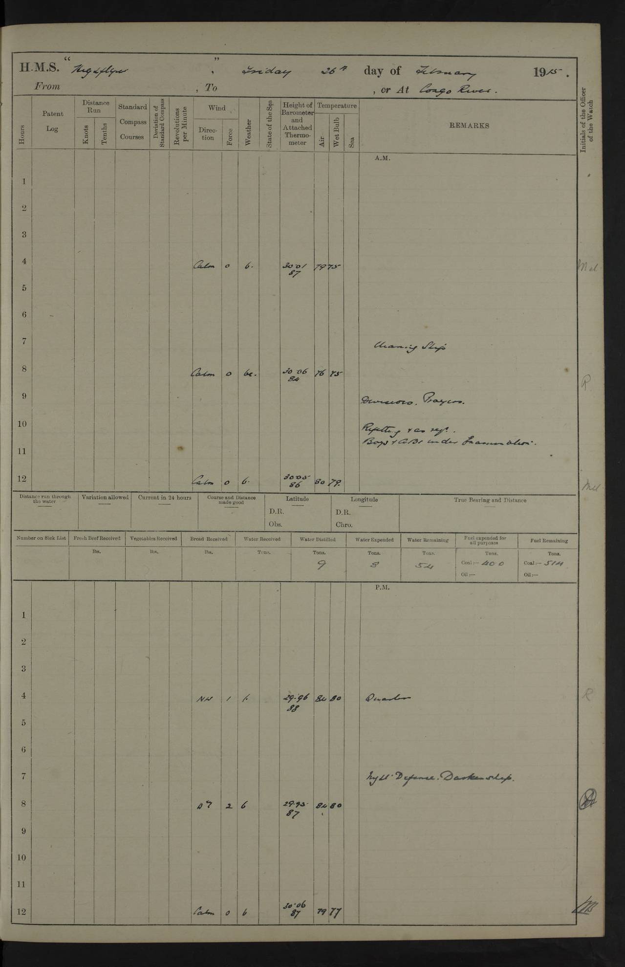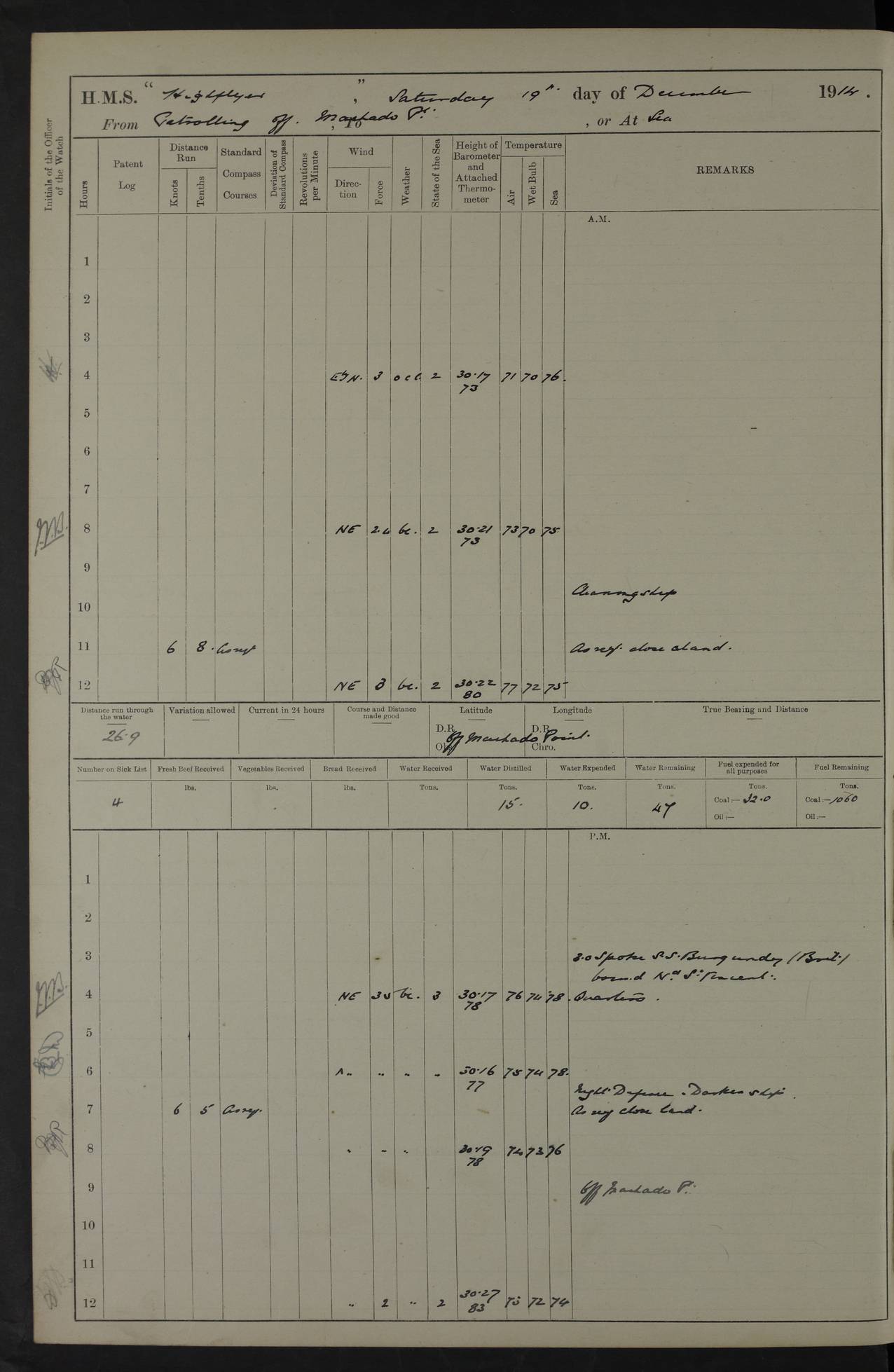 LOGS FOR JANUARY 1915 4f9610aba2fc8e2def000666: (http://s3.amazonaws.com/oldweather/ADM53-44292/ADM 53-44292-112_1.jpg) 1 January 1915 Patrolling off Machado Point Lat 16.8828, Long -25.0106 7.50pm: Weighed and proceeded. Course and speed as requisite to patrol off Machado Point 4f9610aba2fc8e2def000667: (http://s3.amazonaws.com/oldweather/ADM53-44292/ADM 53-44292-113_0.jpg) 2 January 1915 Patrolling off Machado Point Lat 16.8828, Long -25.0106 4.30am: Spoke SS CROWN OF GALICIA bound northward. 6.15am: Spoke HMS MACEDONIA bound northward. 9.00am: Stopped. EMPRESS OF BRITAIN closed and communicated. 10.45pm: Closed and spoke SS BRODERICK bound northward. 4f9610aca2fc8e2def000668: (http://s3.amazonaws.com/oldweather/ADM53-44292/ADM 53-44292-113_1.jpg) 3 January 1915 Patrolling off Machado Point Lat 16.8828, Long -25.0106 2.15am: Spoke SS MAISIA bound northward. 9.00am: Spoke SS KELVINHEAD bound northward (Brit.). 10.00am: Spoke SS ST. LOUIS “French” bound northward. 10.30am: Spoke HMS MARMORA. 1.30pm: EMPRESS OF BRITAIN closed and communicated. 10.30pm: Spoke SS REYNOLDS bound northward. 4f9610aca2fc8e2def000669: (http://s3.amazonaws.com/oldweather/ADM53-44292/ADM 53-44292-114_0.jpg) 4 January 1915 Patrolling off Machado Point Lat 16.8828, Long -25.0106 9.00am: As requisite for entering harbour. 12.30pm: INVINCIBLE in harbour. 2.00pm: MARMORA arrived. 4f9610aca2fc8e2def00066a: (http://s3.amazonaws.com/oldweather/ADM53-44292/ADM 53-44292-114_1.jpg) 5 January 1915 St. Vincent Lat 16.8828, Long -25.0106 3.30pm: EMPRESS OF BRITAIN arrived. 4f9610ada2fc8e2def00066b: (http://s3.amazonaws.com/oldweather/ADM53-44292/ADM 53-44292-115_0.jpg) 6 January 1915 St. Vincent Lat 16.8828, Long -25.0106 9.30am: Discharged 1 prisoner to INVINCIBLE. 5.00pm: HMS INVINCIBLE left harbour. 4f9610ada2fc8e2def00066c: (http://s3.amazonaws.com/oldweather/ADM53-44292/ADM 53-44292-115_1.jpg) 7 January 1915 St. Vincent Lat 16.8828, Long -25.0106 6.30am: HMS INFLEXIBLE arrived. 4f9610ada2fc8e2def00066d: (http://s3.amazonaws.com/oldweather/ADM53-44292/ADM 53-44292-116_0.jpg) 8 January 1915 St. Vincent Lat 16.8828, Long -25.0106 4.30pm: SS ROSEMOUNT drifted on to bows of HIGHFLYER while steaming from VENGEANCE to take up berth. Damage – slight leak in one plate; caulked. 7.00pm: INFLEXIBLE left harbour. 4f9610aea2fc8e2def00066e: (http://s3.amazonaws.com/oldweather/ADM53-44292/ADM 53-44292-116_1.jpg) 9 January 1915 St. Vincent Lat 16.8828, Long -25.0106 Cleaning ship. 4f9610aea2fc8e2def00066f: (http://s3.amazonaws.com/oldweather/ADM53-44292/ADM 53-44292-117_0.jpg) 10 January 1915 St. Vincent and at sea. Lat 16.8828, Long -25.0106 8.30am: Collier OKEHAMPTON came alongside. 11.30am: Finished coaling. 1.00pm: Weighed. Proceeded as requisite. 2.30pm: MARMORA port bow. EMPRESS OF BRITAIN port bow in company. 4f9610aea2fc8e2def000670: (http://s3.amazonaws.com/oldweather/ADM53-44292/ADM 53-44292-117_1.jpg) 11 January 1915 At sea Lat 12.8, Long -24.3 Cleaning ship. 4f9610afa2fc8e2def000671: (http://s3.amazonaws.com/oldweather/ADM53-44292/ADM 53-44292-118_0.jpg) 12 January 1915 At sea Lat 8.6, Long -23.1 Refitting and as requisite. 4f9610afa2fc8e2def000672: (http://s3.amazonaws.com/oldweather/ADM53-44292/ADM 53-44292-118_1.jpg) 13 January 1915 At sea Lat 4.6, Long -21.4 10.30am: Divisional drill. Refitting and as requisite. 4f9610afa2fc8e2def000673: (http://s3.amazonaws.com/oldweather/ADM53-44292/ADM 53-44292-119_0.jpg) 14 January 1915 Patrolling Lat 1.4, Long -20.0 1.45pm: MARMORA took station N25W. EMPRESS OF BRITAIN S65W. 4f9610b0a2fc8e2def000674: (http://s3.amazonaws.com/oldweather/ADM53-44292/ADM 53-44292-119_1.jpg) 15 January 1915 [14 January in log] At sea Lat 1.2, Long -23.2 10.00am: Divisional drill. Refitting and as requisite. 4f9610b0a2fc8e2def000675: (http://s3.amazonaws.com/oldweather/ADM53-44292/ADM 53-44292-120_0.jpg) 16 January 1915 At sea Lat 1.4, Long -25.6 8.20am: Stopped. Boarded SS ESPERANZA, Italian, Buenos Aires to Dakar, Lat 1.20N, Long 24.35W DR. 4f9610b0a2fc8e2def000676: (http://s3.amazonaws.com/oldweather/ADM53-44292/ADM 53-44292-120_1.jpg) 17 January 1915 At sea Lat 2.6, Long -25.8 1.30pm: Sighted steamer E½N approx. 2.30pm: HMS MARMORA boarded SS ARDGAIN bound Rio de Janeiro. 4f9610b1a2fc8e2def000677: (http://s3.amazonaws.com/oldweather/ADM53-44292/ADM 53-44292-121_0.jpg) 18 January 1915 At sea Lat 2.6, Long -24.2 11.00pm: HMS EMPRESS OF BRITAIN boarded SS ILDERTON bound south (Brit.). 4f9610b1a2fc8e2def000678: (http://s3.amazonaws.com/oldweather/ADM53-44292/ADM 53-44292-121_1.jpg) 19 January 1915 At sea Lat 2.7, Long -21.4 9.30am: Refitting and as requisite. Boys at physical drill. 4f9610b1a2fc8e2def000679: (http://s3.amazonaws.com/oldweather/ADM53-44292/ADM 53-44292-122_0.jpg) 20 January 1915 At sea Lat 2.7, Long -18.2 10.00am: Boys at physical drill. Remainder refitting and as requisite. 4f9610b2a2fc8e2def00067a: (http://s3.amazonaws.com/oldweather/ADM53-44292/ADM 53-44292-122_1.jpg) 21 January 1915 To Sierra Leone Lat 5.5, Long -16.3 9.30am: General Quarters. Loader. Refitting and as requisite. 4f9610b2a2fc8e2def00067b: (http://s3.amazonaws.com/oldweather/ADM53-44292/ADM 53-44292-123_0.jpg) 22 January 1915 To Sierra Leone Lat 8.4, Long -14.1 4.40pm: Came to with PB in 7 fathoms., veered to 5 shackles. 4f9610b2a2fc8e2def00067c: (http://s3.amazonaws.com/oldweather/ADM53-44292/ADM 53-44292-123_1.jpg) 23 January 1915 Sierra Leone Lat 8.5, Long -13.2 7.10am: Passed Examination Service. 7.40am: Proceeded as requisite to anchorage. 10.00am: Collier SS LUDGATE came alongside. Coaling ship. 6.00pm: Finished coaling; received 906 tons. 4f9610b3a2fc8e2def00067d: (http://s3.amazonaws.com/oldweather/ADM53-44292/ADM 53-44292-124_0.jpg) 24 January 1915 Sierra Leone Lat 8.5, Long -13.2 6.15am: Cleaning ship. 4f9610b3a2fc8e2def00067e: (http://s3.amazonaws.com/oldweather/ADM53-44292/ADM 53-44292-124_1.jpg) 25 January 1915 Sierra Leone Lat 8.5, Long -13.2 11.30am: Court Martial held on board HMS MARMORA. 1.00pm: 