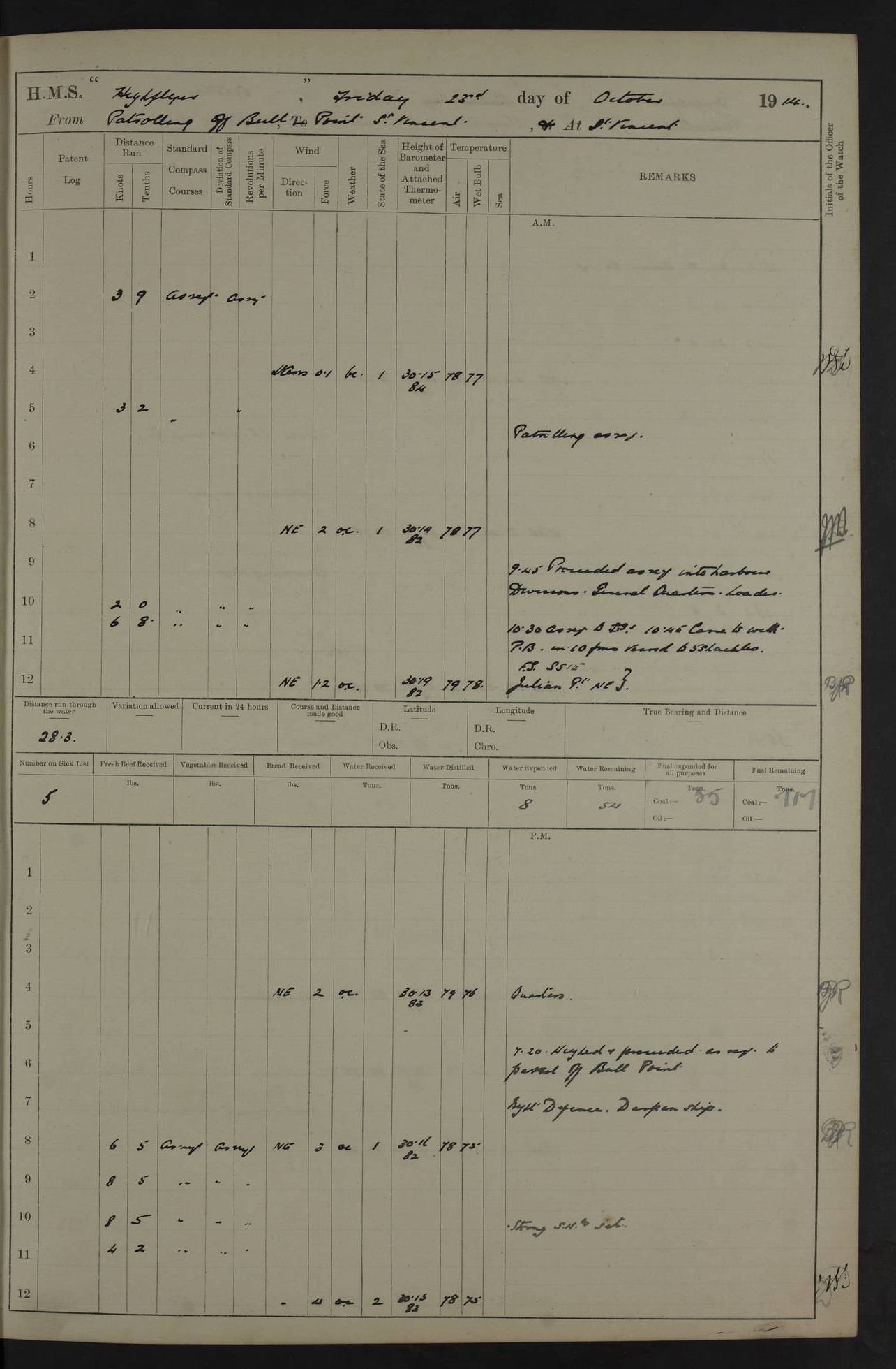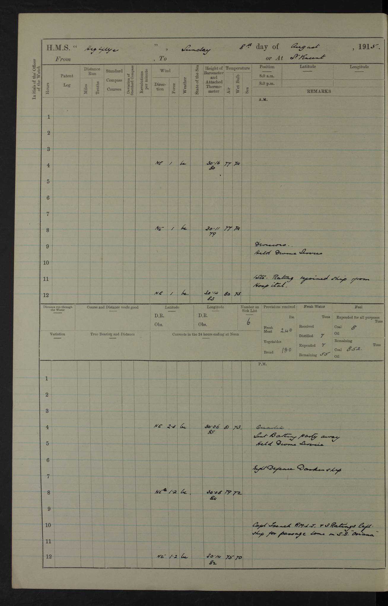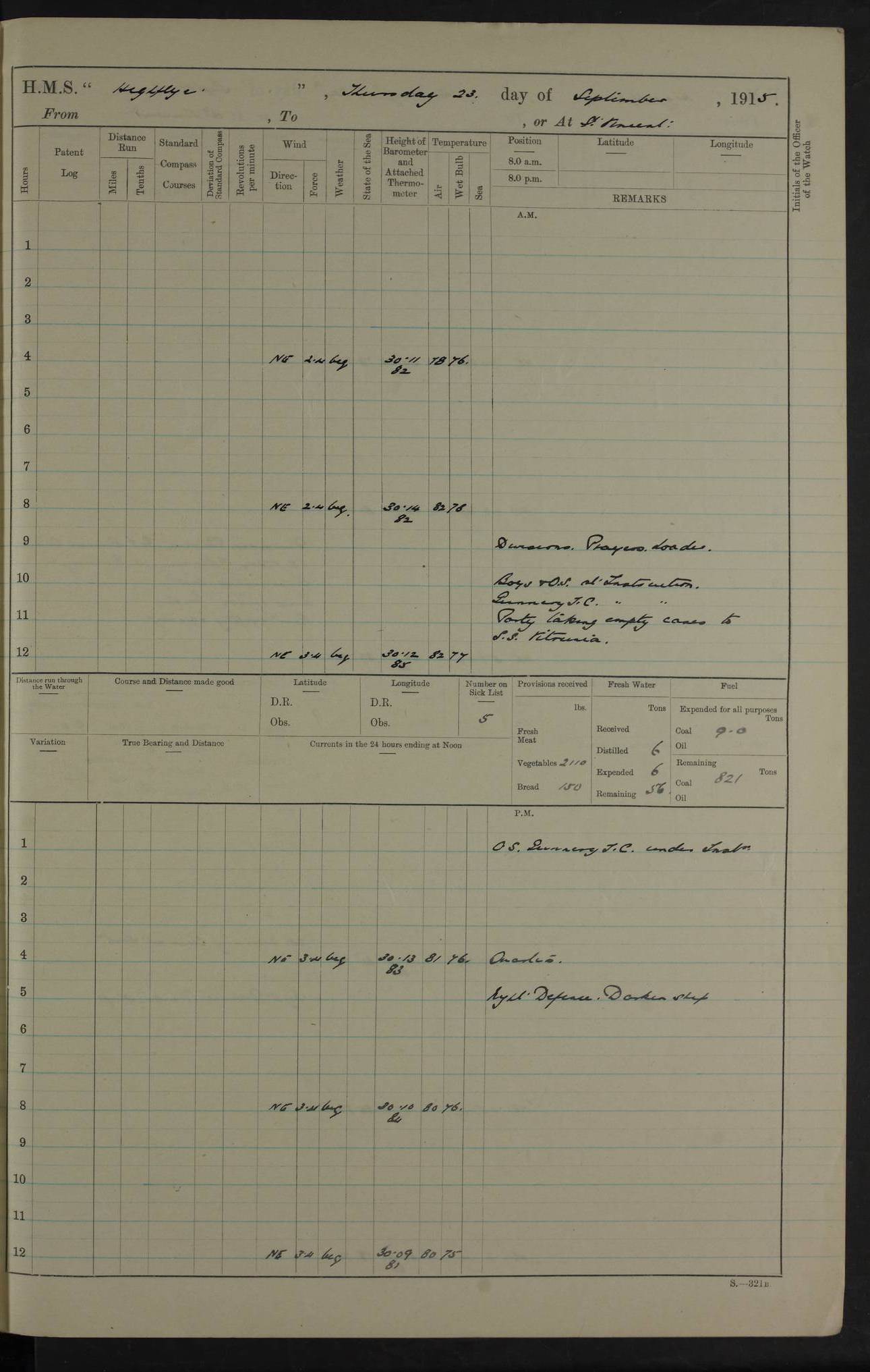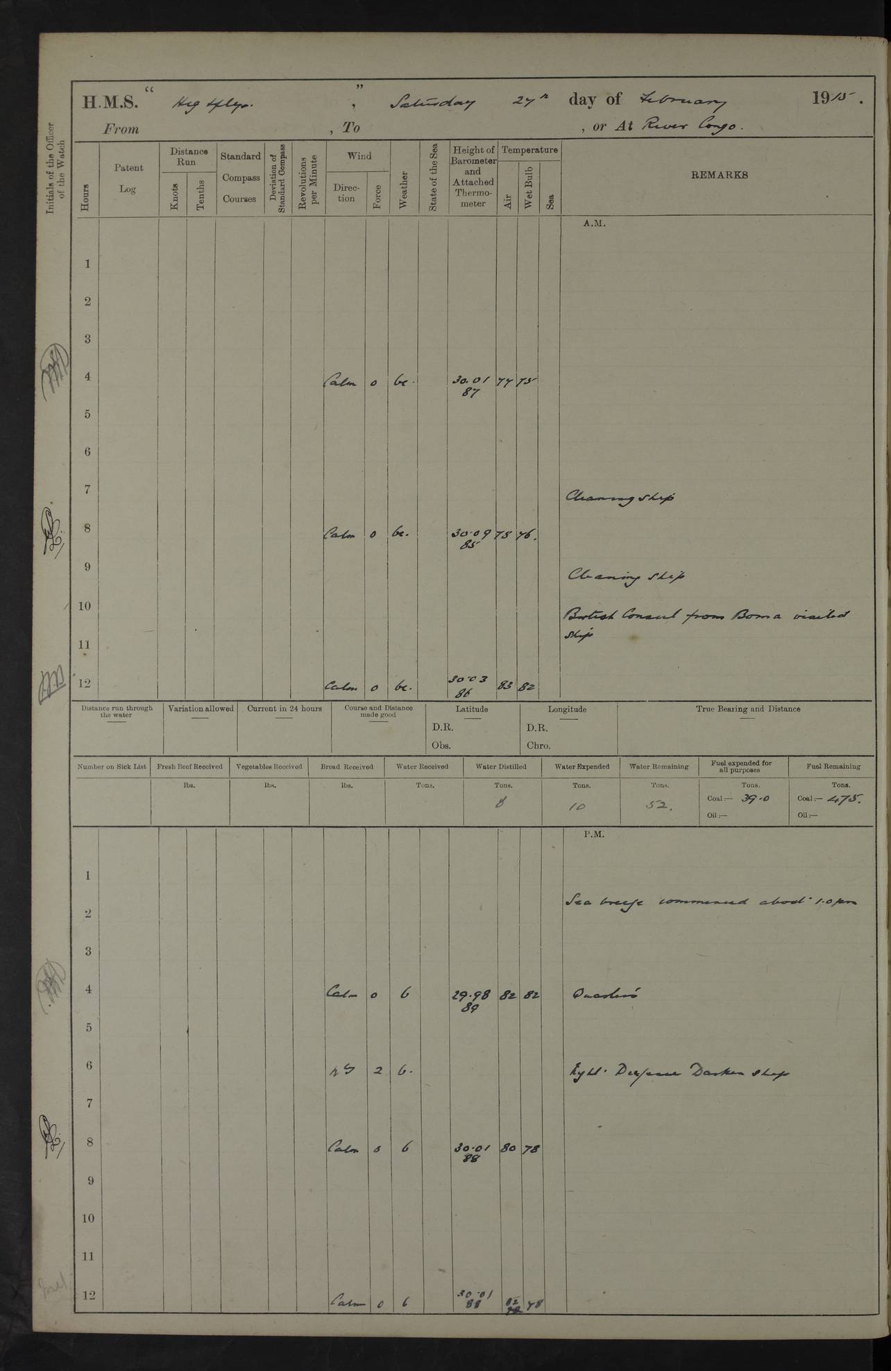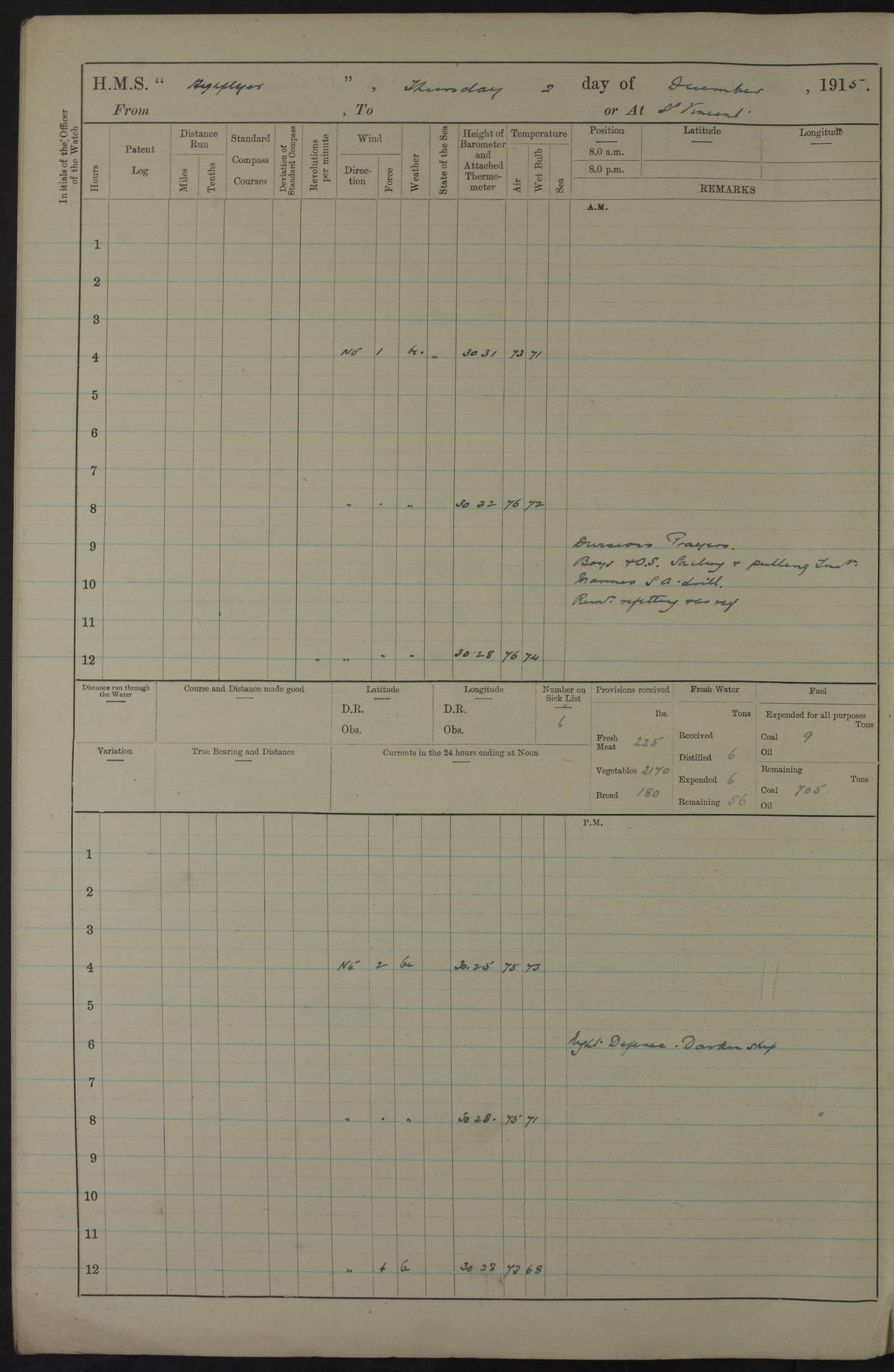 LOGS FOR JANUARY 1915 4f9610aba2fc8e2def000666: (http://s3.amazonaws.com/oldweather/ADM53-44292/ADM 53-44292-112_1.jpg) 1 January 1915 Patrolling off Machado Point Lat 16.8828, Long -25.0106 7.50pm: Weighed and proceeded. Course and speed as requisite to patrol off Machado Point 4f9610aba2fc8e2def000667: (http://s3.amazonaws.com/oldweather/ADM53-44292/ADM 53-44292-113_0.jpg) 2 January 1915 Patrolling off Machado Point Lat 16.8828, Long -25.0106 4.30am: Spoke SS CROWN OF GALICIA bound northward. 6.15am: Spoke HMS MACEDONIA bound northward. 9.00am: Stopped. EMPRESS OF BRITAIN closed and communicated. 10.45pm: Closed and spoke SS BRODERICK bound northward. 4f9610aca2fc8e2def000668: (http://s3.amazonaws.com/oldweather/ADM53-44292/ADM 53-44292-113_1.jpg) 3 January 1915 Patrolling off Machado Point Lat 16.8828, Long -25.0106 2.15am: Spoke SS MAISIA bound northward. 9.00am: Spoke SS KELVINHEAD bound northward (Brit.). 10.00am: Spoke SS ST. LOUIS “French” bound northward. 10.30am: Spoke HMS MARMORA. 1.30pm: EMPRESS OF BRITAIN closed and communicated. 10.30pm: Spoke SS REYNOLDS bound northward. 4f9610aca2fc8e2def000669: (http://s3.amazonaws.com/oldweather/ADM53-44292/ADM 53-44292-114_0.jpg) 4 January 1915 Patrolling off Machado Point Lat 16.8828, Long -25.0106 9.00am: As requisite for entering harbour. 12.30pm: INVINCIBLE in harbour. 2.00pm: MARMORA arrived. 4f9610aca2fc8e2def00066a: (http://s3.amazonaws.com/oldweather/ADM53-44292/ADM 53-44292-114_1.jpg) 5 January 1915 St. Vincent Lat 16.8828, Long -25.0106 3.30pm: EMPRESS OF BRITAIN arrived. 4f9610ada2fc8e2def00066b: (http://s3.amazonaws.com/oldweather/ADM53-44292/ADM 53-44292-115_0.jpg) 6 January 1915 St. Vincent Lat 16.8828, Long -25.0106 9.30am: Discharged 1 prisoner to INVINCIBLE. 5.00pm: HMS INVINCIBLE left harbour. 4f9610ada2fc8e2def00066c: (http://s3.amazonaws.com/oldweather/ADM53-44292/ADM 53-44292-115_1.jpg) 7 January 1915 St. Vincent Lat 16.8828, Long -25.0106 6.30am: HMS INFLEXIBLE arrived. 4f9610ada2fc8e2def00066d: (http://s3.amazonaws.com/oldweather/ADM53-44292/ADM 53-44292-116_0.jpg) 8 January 1915 St. Vincent Lat 16.8828, Long -25.0106 4.30pm: SS ROSEMOUNT drifted on to bows of HIGHFLYER while steaming from VENGEANCE to take up berth. Damage – slight leak in one plate; caulked. 7.00pm: INFLEXIBLE left harbour. 4f9610aea2fc8e2def00066e: (http://s3.amazonaws.com/oldweather/ADM53-44292/ADM 53-44292-116_1.jpg) 9 January 1915 St. Vincent Lat 16.8828, Long -25.0106 Cleaning ship. 4f9610aea2fc8e2def00066f: (http://s3.amazonaws.com/oldweather/ADM53-44292/ADM 53-44292-117_0.jpg) 10 January 1915 St. Vincent and at sea. Lat 16.8828, Long -25.0106 8.30am: Collier OKEHAMPTON came alongside. 11.30am: Finished coaling. 1.00pm: Weighed. Proceeded as requisite. 2.30pm: MARMORA port bow. EMPRESS OF BRITAIN port bow in company. 4f9610aea2fc8e2def000670: (http://s3.amazonaws.com/oldweather/ADM53-44292/ADM 53-44292-117_1.jpg) 11 January 1915 At sea Lat 12.8, Long -24.3 Cleaning ship. 4f9610afa2fc8e2def000671: (http://s3.amazonaws.com/oldweather/ADM53-44292/ADM 53-44292-118_0.jpg) 12 January 1915 At sea Lat 8.6, Long -23.1 Refitting and as requisite. 4f9610afa2fc8e2def000672: (http://s3.amazonaws.com/oldweather/ADM53-44292/ADM 53-44292-118_1.jpg) 13 January 1915 At sea Lat 4.6, Long -21.4 10.30am: Divisional drill. Refitting and as requisite. 4f9610afa2fc8e2def000673: (http://s3.amazonaws.com/oldweather/ADM53-44292/ADM 53-44292-119_0.jpg) 14 January 1915 Patrolling Lat 1.4, Long -20.0 1.45pm: MARMORA took station N25W. EMPRESS OF BRITAIN S65W. 4f9610b0a2fc8e2def000674: (http://s3.amazonaws.com/oldweather/ADM53-44292/ADM 53-44292-119_1.jpg) 15 January 1915 [14 January in log] At sea Lat 1.2, Long -23.2 10.00am: Divisional drill. Refitting and as requisite. 4f9610b0a2fc8e2def000675: (http://s3.amazonaws.com/oldweather/ADM53-44292/ADM 53-44292-120_0.jpg) 16 January 1915 At sea Lat 1.4, Long -25.6 8.20am: Stopped. Boarded SS ESPERANZA, Italian, Buenos Aires to Dakar, Lat 1.20N, Long 24.35W DR. 4f9610b0a2fc8e2def000676: (http://s3.amazonaws.com/oldweather/ADM53-44292/ADM 53-44292-120_1.jpg) 17 January 1915 At sea Lat 2.6, Long -25.8 1.30pm: Sighted steamer E½N approx. 2.30pm: HMS MARMORA boarded SS ARDGAIN bound Rio de Janeiro. 4f9610b1a2fc8e2def000677: (http://s3.amazonaws.com/oldweather/ADM53-44292/ADM 53-44292-121_0.jpg) 18 January 1915 At sea Lat 2.6, Long -24.2 11.00pm: HMS EMPRESS OF BRITAIN boarded SS ILDERTON bound south (Brit.). 4f9610b1a2fc8e2def000678: (http://s3.amazonaws.com/oldweather/ADM53-44292/ADM 53-44292-121_1.jpg) 19 January 1915 At sea Lat 2.7, Long -21.4 9.30am: Refitting and as requisite. Boys at physical drill. 4f9610b1a2fc8e2def000679: (http://s3.amazonaws.com/oldweather/ADM53-44292/ADM 53-44292-122_0.jpg) 20 January 1915 At sea Lat 2.7, Long -18.2 10.00am: Boys at physical drill. Remainder refitting and as requisite. 4f9610b2a2fc8e2def00067a: (http://s3.amazonaws.com/oldweather/ADM53-44292/ADM 53-44292-122_1.jpg) 21 January 1915 To Sierra Leone Lat 5.5, Long -16.3 9.30am: General Quarters. Loader. Refitting and as requisite. 4f9610b2a2fc8e2def00067b: (http://s3.amazonaws.com/oldweather/ADM53-44292/ADM 53-44292-123_0.jpg) 22 January 1915 To Sierra Leone Lat 8.4, Long -14.1 4.40pm: Came to with PB in 7 fathoms., veered to 5 shackles. 4f9610b2a2fc8e2def00067c: (http://s3.amazonaws.com/oldweather/ADM53-44292/ADM 53-44292-123_1.jpg) 23 January 1915 Sierra Leone Lat 8.5, Long -13.2 7.10am: Passed Examination Service. 7.40am: Proceeded as requisite to anchorage. 10.00am: Collier SS LUDGATE came alongside. Coaling ship. 6.00pm: Finished coaling; received 906 tons. 4f9610b3a2fc8e2def00067d: (http://s3.amazonaws.com/oldweather/ADM53-44292/ADM 53-44292-124_0.jpg) 24 January 1915 Sierra Leone Lat 8.5, Long -13.2 6.15am: Cleaning ship. 4f9610b3a2fc8e2def00067e: (http://s3.amazonaws.com/oldweather/ADM53-44292/ADM 53-44292-124_1.jpg) 25 January 1915 Sierra Leone Lat 8.5, Long -13.2 11.30am: Court Martial held on board HMS MARMORA. 1.00pm: 
