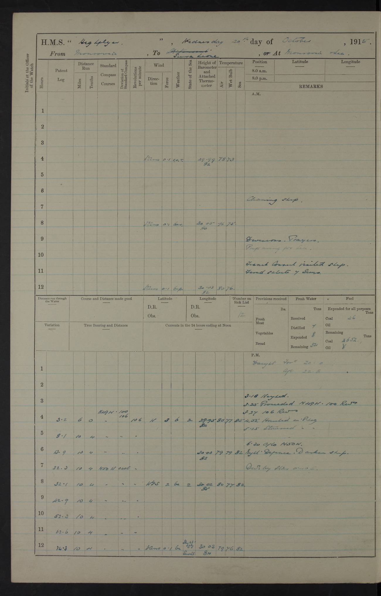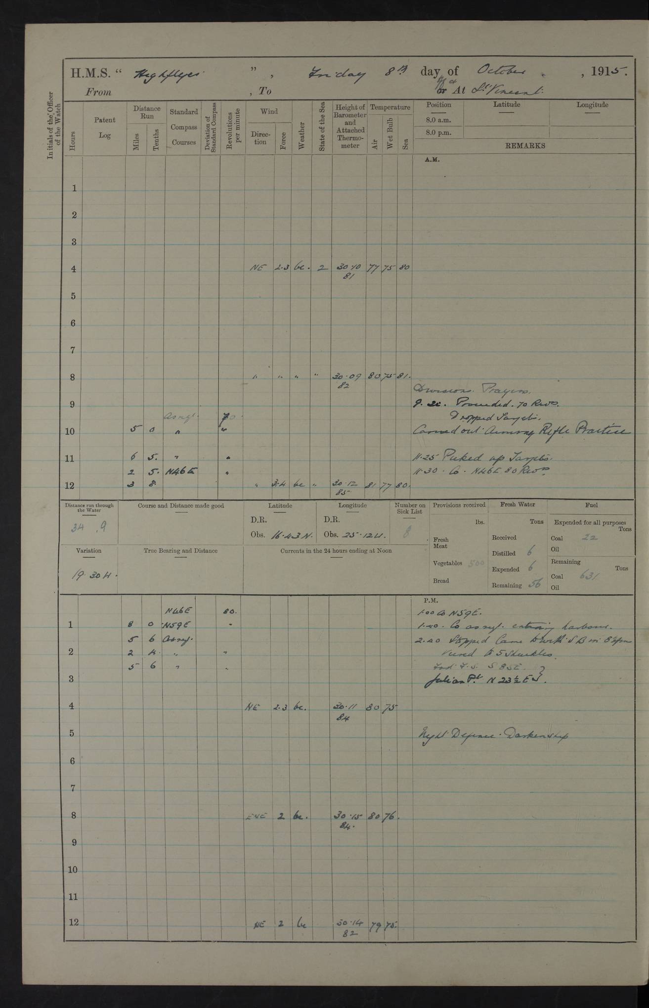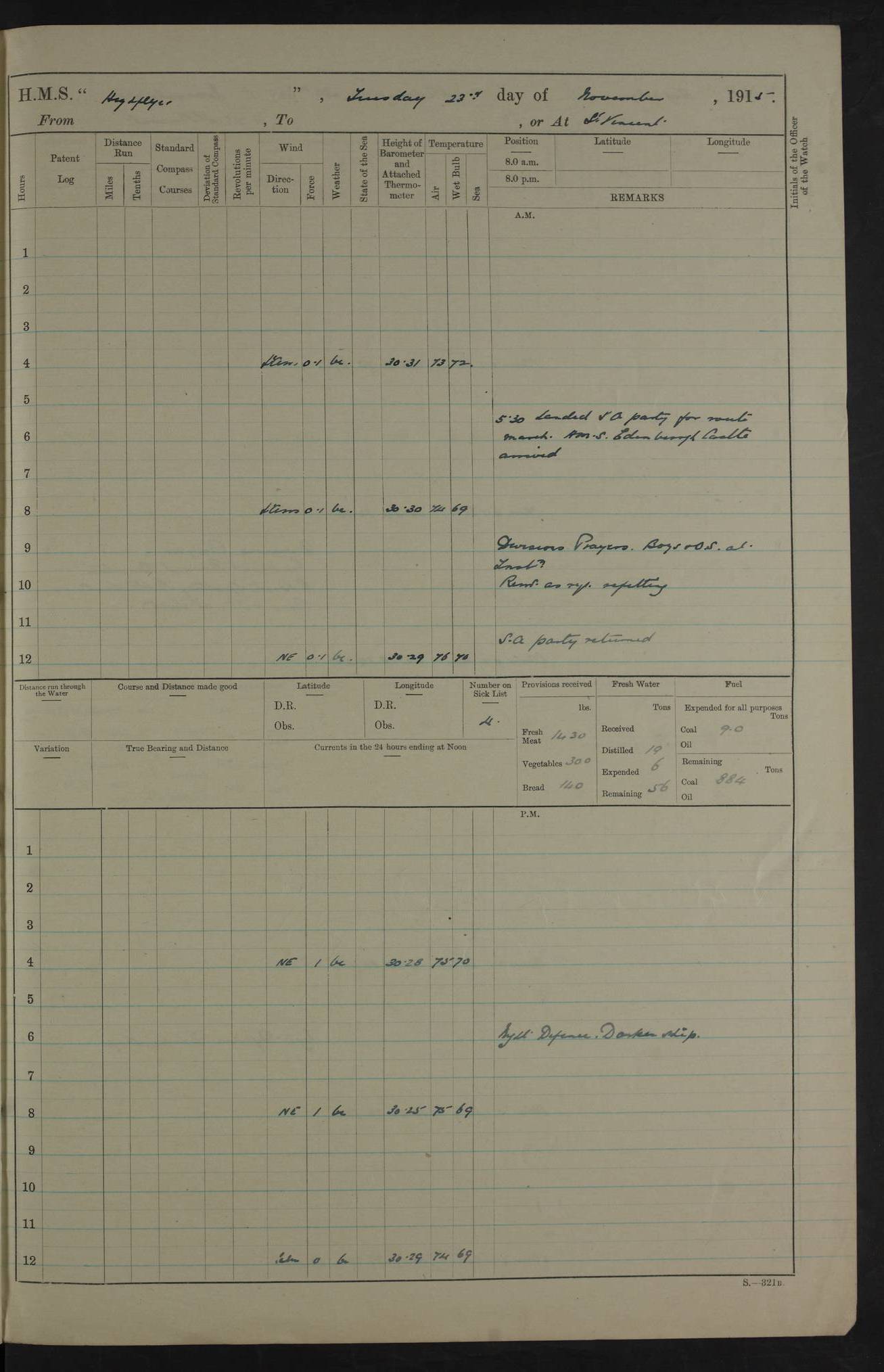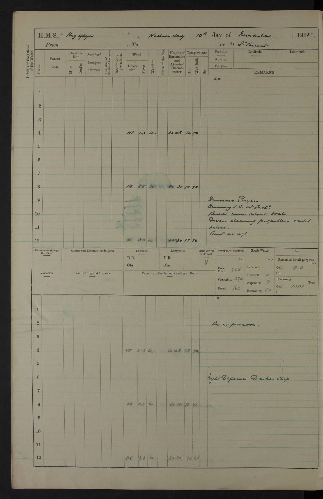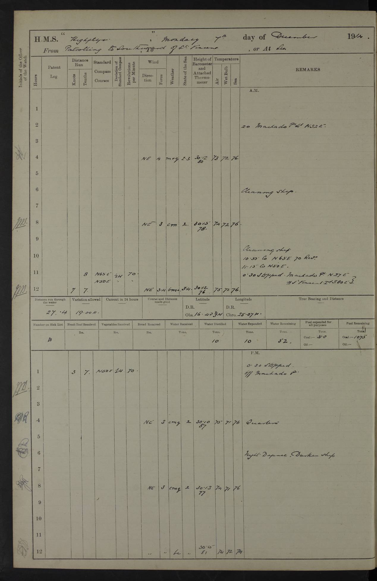 LOGS FOR JANUARY 1915 4f9610aba2fc8e2def000666: (http://s3.amazonaws.com/oldweather/ADM53-44292/ADM 53-44292-112_1.jpg) 1 January 1915 Patrolling off Machado Point Lat 16.8828, Long -25.0106 7.50pm: Weighed and proceeded. Course and speed as requisite to patrol off Machado Point 4f9610aba2fc8e2def000667: (http://s3.amazonaws.com/oldweather/ADM53-44292/ADM 53-44292-113_0.jpg) 2 January 1915 Patrolling off Machado Point Lat 16.8828, Long -25.0106 4.30am: Spoke SS CROWN OF GALICIA bound northward. 6.15am: Spoke HMS MACEDONIA bound northward. 9.00am: Stopped. EMPRESS OF BRITAIN closed and communicated. 10.45pm: Closed and spoke SS BRODERICK bound northward. 4f9610aca2fc8e2def000668: (http://s3.amazonaws.com/oldweather/ADM53-44292/ADM 53-44292-113_1.jpg) 3 January 1915 Patrolling off Machado Point Lat 16.8828, Long -25.0106 2.15am: Spoke SS MAISIA bound northward. 9.00am: Spoke SS KELVINHEAD bound northward (Brit.). 10.00am: Spoke SS ST. LOUIS “French” bound northward. 10.30am: Spoke HMS MARMORA. 1.30pm: EMPRESS OF BRITAIN closed and communicated. 10.30pm: Spoke SS REYNOLDS bound northward. 4f9610aca2fc8e2def000669: (http://s3.amazonaws.com/oldweather/ADM53-44292/ADM 53-44292-114_0.jpg) 4 January 1915 Patrolling off Machado Point Lat 16.8828, Long -25.0106 9.00am: As requisite for entering harbour. 12.30pm: INVINCIBLE in harbour. 2.00pm: MARMORA arrived. 4f9610aca2fc8e2def00066a: (http://s3.amazonaws.com/oldweather/ADM53-44292/ADM 53-44292-114_1.jpg) 5 January 1915 St. Vincent Lat 16.8828, Long -25.0106 3.30pm: EMPRESS OF BRITAIN arrived. 4f9610ada2fc8e2def00066b: (http://s3.amazonaws.com/oldweather/ADM53-44292/ADM 53-44292-115_0.jpg) 6 January 1915 St. Vincent Lat 16.8828, Long -25.0106 9.30am: Discharged 1 prisoner to INVINCIBLE. 5.00pm: HMS INVINCIBLE left harbour. 4f9610ada2fc8e2def00066c: (http://s3.amazonaws.com/oldweather/ADM53-44292/ADM 53-44292-115_1.jpg) 7 January 1915 St. Vincent Lat 16.8828, Long -25.0106 6.30am: HMS INFLEXIBLE arrived. 4f9610ada2fc8e2def00066d: (http://s3.amazonaws.com/oldweather/ADM53-44292/ADM 53-44292-116_0.jpg) 8 January 1915 St. Vincent Lat 16.8828, Long -25.0106 4.30pm: SS ROSEMOUNT drifted on to bows of HIGHFLYER while steaming from VENGEANCE to take up berth. Damage – slight leak in one plate; caulked. 7.00pm: INFLEXIBLE left harbour. 4f9610aea2fc8e2def00066e: (http://s3.amazonaws.com/oldweather/ADM53-44292/ADM 53-44292-116_1.jpg) 9 January 1915 St. Vincent Lat 16.8828, Long -25.0106 Cleaning ship. 4f9610aea2fc8e2def00066f: (http://s3.amazonaws.com/oldweather/ADM53-44292/ADM 53-44292-117_0.jpg) 10 January 1915 St. Vincent and at sea. Lat 16.8828, Long -25.0106 8.30am: Collier OKEHAMPTON came alongside. 11.30am: Finished coaling. 1.00pm: Weighed. Proceeded as requisite. 2.30pm: MARMORA port bow. EMPRESS OF BRITAIN port bow in company. 4f9610aea2fc8e2def000670: (http://s3.amazonaws.com/oldweather/ADM53-44292/ADM 53-44292-117_1.jpg) 11 January 1915 At sea Lat 12.8, Long -24.3 Cleaning ship. 4f9610afa2fc8e2def000671: (http://s3.amazonaws.com/oldweather/ADM53-44292/ADM 53-44292-118_0.jpg) 12 January 1915 At sea Lat 8.6, Long -23.1 Refitting and as requisite. 4f9610afa2fc8e2def000672: (http://s3.amazonaws.com/oldweather/ADM53-44292/ADM 53-44292-118_1.jpg) 13 January 1915 At sea Lat 4.6, Long -21.4 10.30am: Divisional drill. Refitting and as requisite. 4f9610afa2fc8e2def000673: (http://s3.amazonaws.com/oldweather/ADM53-44292/ADM 53-44292-119_0.jpg) 14 January 1915 Patrolling Lat 1.4, Long -20.0 1.45pm: MARMORA took station N25W. EMPRESS OF BRITAIN S65W. 4f9610b0a2fc8e2def000674: (http://s3.amazonaws.com/oldweather/ADM53-44292/ADM 53-44292-119_1.jpg) 15 January 1915 [14 January in log] At sea Lat 1.2, Long -23.2 10.00am: Divisional drill. Refitting and as requisite. 4f9610b0a2fc8e2def000675: (http://s3.amazonaws.com/oldweather/ADM53-44292/ADM 53-44292-120_0.jpg) 16 January 1915 At sea Lat 1.4, Long -25.6 8.20am: Stopped. Boarded SS ESPERANZA, Italian, Buenos Aires to Dakar, Lat 1.20N, Long 24.35W DR. 4f9610b0a2fc8e2def000676: (http://s3.amazonaws.com/oldweather/ADM53-44292/ADM 53-44292-120_1.jpg) 17 January 1915 At sea Lat 2.6, Long -25.8 1.30pm: Sighted steamer E½N approx. 2.30pm: HMS MARMORA boarded SS ARDGAIN bound Rio de Janeiro. 4f9610b1a2fc8e2def000677: (http://s3.amazonaws.com/oldweather/ADM53-44292/ADM 53-44292-121_0.jpg) 18 January 1915 At sea Lat 2.6, Long -24.2 11.00pm: HMS EMPRESS OF BRITAIN boarded SS ILDERTON bound south (Brit.). 4f9610b1a2fc8e2def000678: (http://s3.amazonaws.com/oldweather/ADM53-44292/ADM 53-44292-121_1.jpg) 19 January 1915 At sea Lat 2.7, Long -21.4 9.30am: Refitting and as requisite. Boys at physical drill. 4f9610b1a2fc8e2def000679: (http://s3.amazonaws.com/oldweather/ADM53-44292/ADM 53-44292-122_0.jpg) 20 January 1915 At sea Lat 2.7, Long -18.2 10.00am: Boys at physical drill. Remainder refitting and as requisite. 4f9610b2a2fc8e2def00067a: (http://s3.amazonaws.com/oldweather/ADM53-44292/ADM 53-44292-122_1.jpg) 21 January 1915 To Sierra Leone Lat 5.5, Long -16.3 9.30am: General Quarters. Loader. Refitting and as requisite. 4f9610b2a2fc8e2def00067b: (http://s3.amazonaws.com/oldweather/ADM53-44292/ADM 53-44292-123_0.jpg) 22 January 1915 To Sierra Leone Lat 8.4, Long -14.1 4.40pm: Came to with PB in 7 fathoms., veered to 5 shackles. 4f9610b2a2fc8e2def00067c: (http://s3.amazonaws.com/oldweather/ADM53-44292/ADM 53-44292-123_1.jpg) 23 January 1915 Sierra Leone Lat 8.5, Long -13.2 7.10am: Passed Examination Service. 7.40am: Proceeded as requisite to anchorage. 10.00am: Collier SS LUDGATE came alongside. Coaling ship. 6.00pm: Finished coaling; received 906 tons. 4f9610b3a2fc8e2def00067d: (http://s3.amazonaws.com/oldweather/ADM53-44292/ADM 53-44292-124_0.jpg) 24 January 1915 Sierra Leone Lat 8.5, Long -13.2 6.15am: Cleaning ship. 4f9610b3a2fc8e2def00067e: (http://s3.amazonaws.com/oldweather/ADM53-44292/ADM 53-44292-124_1.jpg) 25 January 1915 Sierra Leone Lat 8.5, Long -13.2 11.30am: Court Martial held on board HMS MARMORA. 1.00pm: 