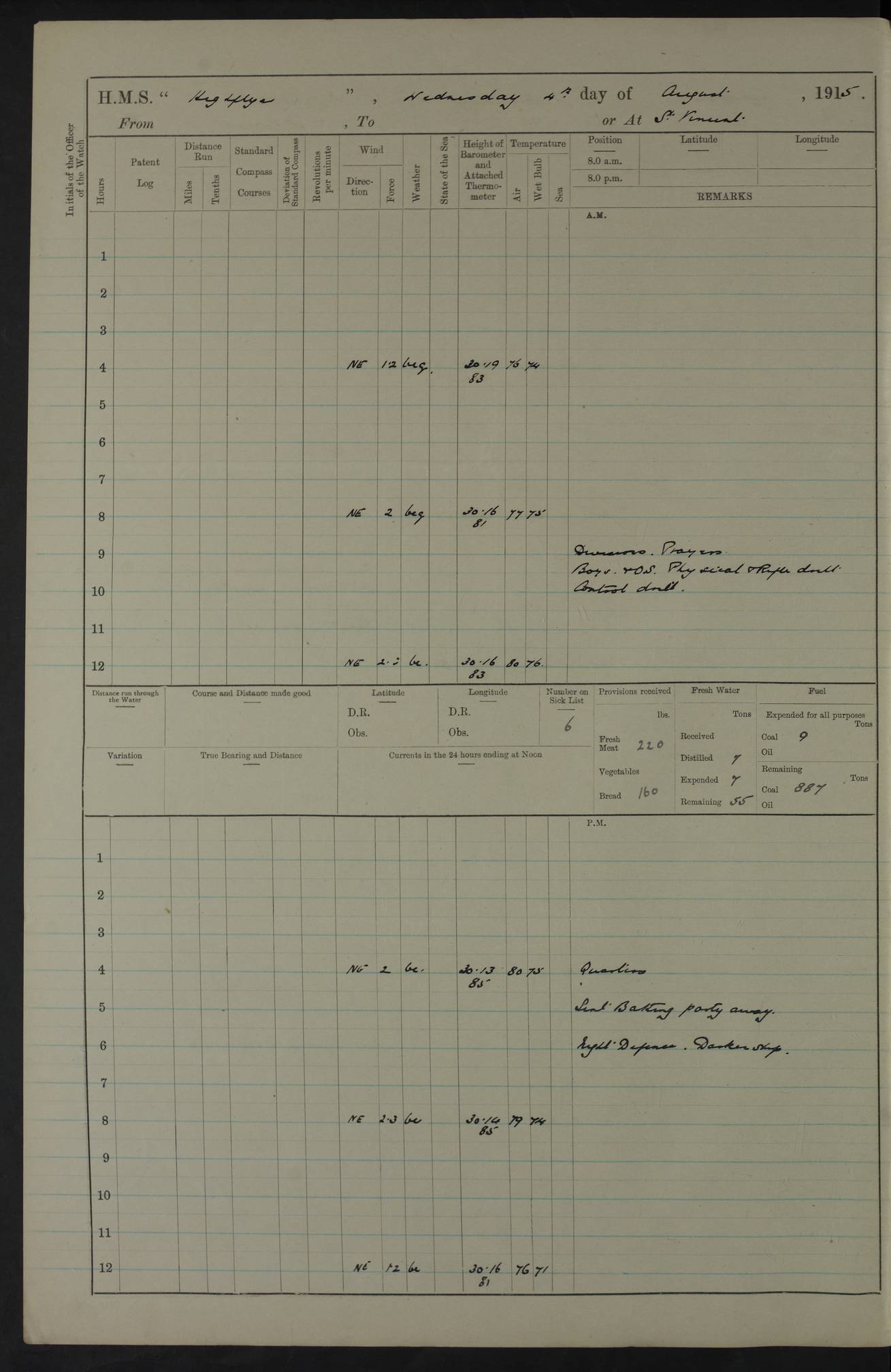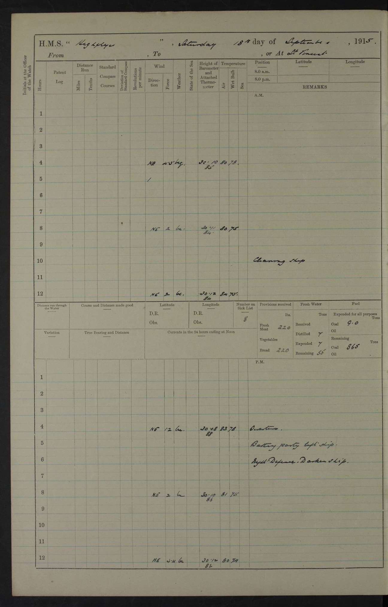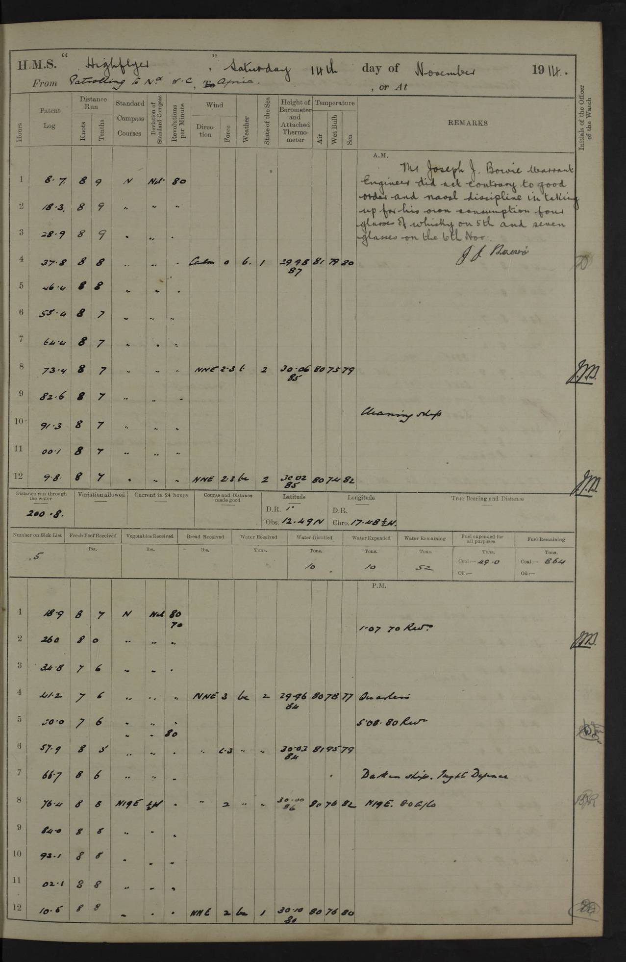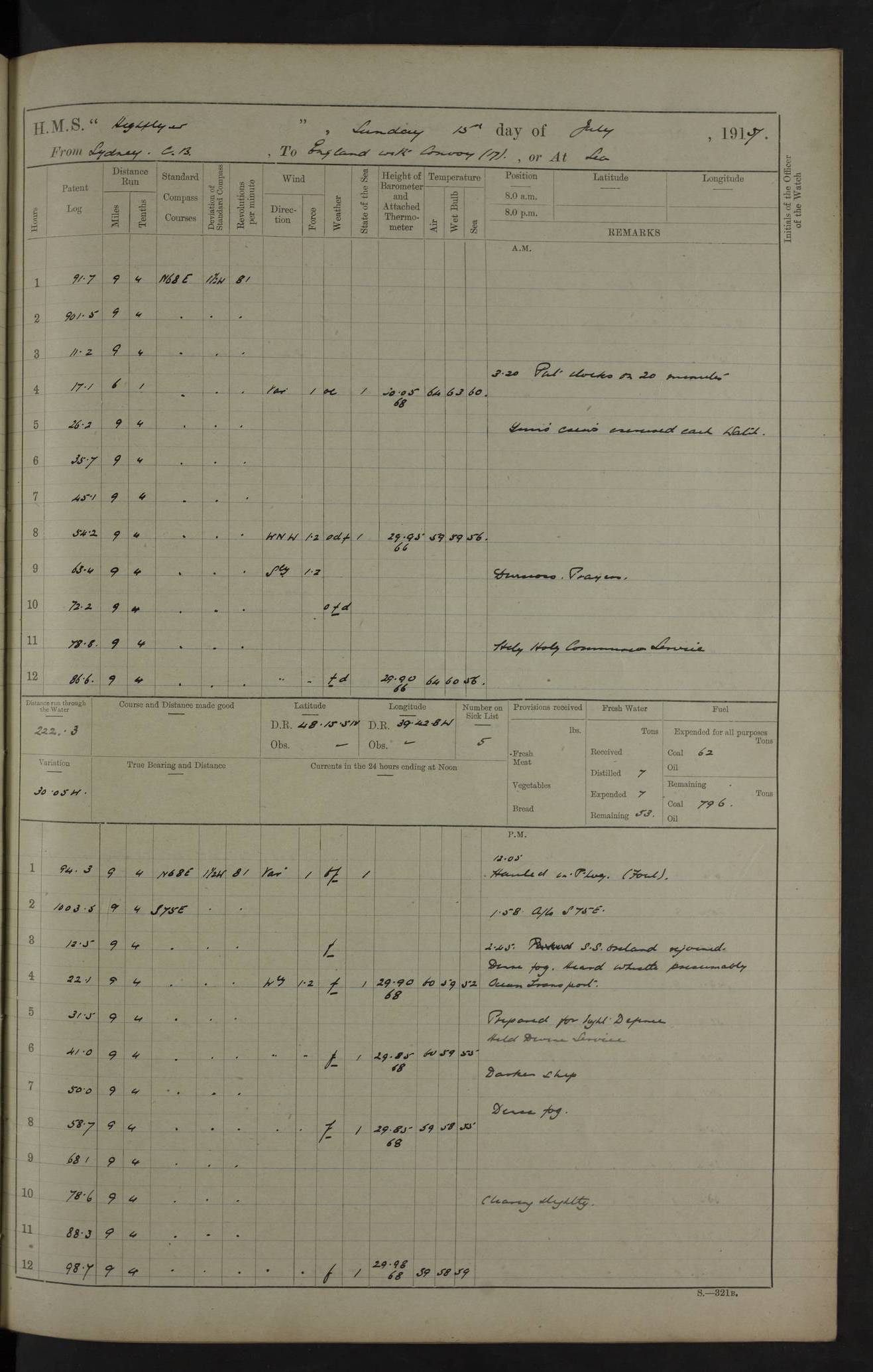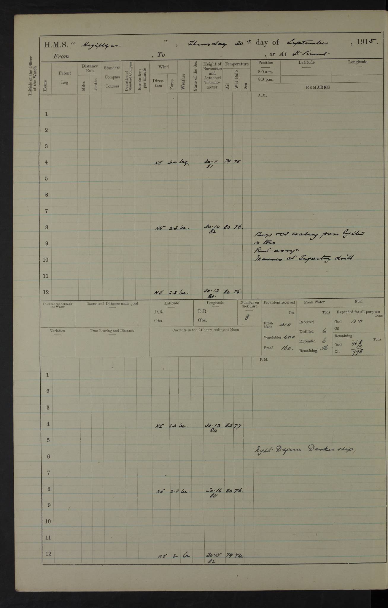 LOGS FOR JANUARY 1915 4f9610aba2fc8e2def000666: (http://s3.amazonaws.com/oldweather/ADM53-44292/ADM 53-44292-112_1.jpg) 1 January 1915 Patrolling off Machado Point Lat 16.8828, Long -25.0106 7.50pm: Weighed and proceeded. Course and speed as requisite to patrol off Machado Point 4f9610aba2fc8e2def000667: (http://s3.amazonaws.com/oldweather/ADM53-44292/ADM 53-44292-113_0.jpg) 2 January 1915 Patrolling off Machado Point Lat 16.8828, Long -25.0106 4.30am: Spoke SS CROWN OF GALICIA bound northward. 6.15am: Spoke HMS MACEDONIA bound northward. 9.00am: Stopped. EMPRESS OF BRITAIN closed and communicated. 10.45pm: Closed and spoke SS BRODERICK bound northward. 4f9610aca2fc8e2def000668: (http://s3.amazonaws.com/oldweather/ADM53-44292/ADM 53-44292-113_1.jpg) 3 January 1915 Patrolling off Machado Point Lat 16.8828, Long -25.0106 2.15am: Spoke SS MAISIA bound northward. 9.00am: Spoke SS KELVINHEAD bound northward (Brit.). 10.00am: Spoke SS ST. LOUIS “French” bound northward. 10.30am: Spoke HMS MARMORA. 1.30pm: EMPRESS OF BRITAIN closed and communicated. 10.30pm: Spoke SS REYNOLDS bound northward. 4f9610aca2fc8e2def000669: (http://s3.amazonaws.com/oldweather/ADM53-44292/ADM 53-44292-114_0.jpg) 4 January 1915 Patrolling off Machado Point Lat 16.8828, Long -25.0106 9.00am: As requisite for entering harbour. 12.30pm: INVINCIBLE in harbour. 2.00pm: MARMORA arrived. 4f9610aca2fc8e2def00066a: (http://s3.amazonaws.com/oldweather/ADM53-44292/ADM 53-44292-114_1.jpg) 5 January 1915 St. Vincent Lat 16.8828, Long -25.0106 3.30pm: EMPRESS OF BRITAIN arrived. 4f9610ada2fc8e2def00066b: (http://s3.amazonaws.com/oldweather/ADM53-44292/ADM 53-44292-115_0.jpg) 6 January 1915 St. Vincent Lat 16.8828, Long -25.0106 9.30am: Discharged 1 prisoner to INVINCIBLE. 5.00pm: HMS INVINCIBLE left harbour. 4f9610ada2fc8e2def00066c: (http://s3.amazonaws.com/oldweather/ADM53-44292/ADM 53-44292-115_1.jpg) 7 January 1915 St. Vincent Lat 16.8828, Long -25.0106 6.30am: HMS INFLEXIBLE arrived. 4f9610ada2fc8e2def00066d: (http://s3.amazonaws.com/oldweather/ADM53-44292/ADM 53-44292-116_0.jpg) 8 January 1915 St. Vincent Lat 16.8828, Long -25.0106 4.30pm: SS ROSEMOUNT drifted on to bows of HIGHFLYER while steaming from VENGEANCE to take up berth. Damage – slight leak in one plate; caulked. 7.00pm: INFLEXIBLE left harbour. 4f9610aea2fc8e2def00066e: (http://s3.amazonaws.com/oldweather/ADM53-44292/ADM 53-44292-116_1.jpg) 9 January 1915 St. Vincent Lat 16.8828, Long -25.0106 Cleaning ship. 4f9610aea2fc8e2def00066f: (http://s3.amazonaws.com/oldweather/ADM53-44292/ADM 53-44292-117_0.jpg) 10 January 1915 St. Vincent and at sea. Lat 16.8828, Long -25.0106 8.30am: Collier OKEHAMPTON came alongside. 11.30am: Finished coaling. 1.00pm: Weighed. Proceeded as requisite. 2.30pm: MARMORA port bow. EMPRESS OF BRITAIN port bow in company. 4f9610aea2fc8e2def000670: (http://s3.amazonaws.com/oldweather/ADM53-44292/ADM 53-44292-117_1.jpg) 11 January 1915 At sea Lat 12.8, Long -24.3 Cleaning ship. 4f9610afa2fc8e2def000671: (http://s3.amazonaws.com/oldweather/ADM53-44292/ADM 53-44292-118_0.jpg) 12 January 1915 At sea Lat 8.6, Long -23.1 Refitting and as requisite. 4f9610afa2fc8e2def000672: (http://s3.amazonaws.com/oldweather/ADM53-44292/ADM 53-44292-118_1.jpg) 13 January 1915 At sea Lat 4.6, Long -21.4 10.30am: Divisional drill. Refitting and as requisite. 4f9610afa2fc8e2def000673: (http://s3.amazonaws.com/oldweather/ADM53-44292/ADM 53-44292-119_0.jpg) 14 January 1915 Patrolling Lat 1.4, Long -20.0 1.45pm: MARMORA took station N25W. EMPRESS OF BRITAIN S65W. 4f9610b0a2fc8e2def000674: (http://s3.amazonaws.com/oldweather/ADM53-44292/ADM 53-44292-119_1.jpg) 15 January 1915 [14 January in log] At sea Lat 1.2, Long -23.2 10.00am: Divisional drill. Refitting and as requisite. 4f9610b0a2fc8e2def000675: (http://s3.amazonaws.com/oldweather/ADM53-44292/ADM 53-44292-120_0.jpg) 16 January 1915 At sea Lat 1.4, Long -25.6 8.20am: Stopped. Boarded SS ESPERANZA, Italian, Buenos Aires to Dakar, Lat 1.20N, Long 24.35W DR. 4f9610b0a2fc8e2def000676: (http://s3.amazonaws.com/oldweather/ADM53-44292/ADM 53-44292-120_1.jpg) 17 January 1915 At sea Lat 2.6, Long -25.8 1.30pm: Sighted steamer E½N approx. 2.30pm: HMS MARMORA boarded SS ARDGAIN bound Rio de Janeiro. 4f9610b1a2fc8e2def000677: (http://s3.amazonaws.com/oldweather/ADM53-44292/ADM 53-44292-121_0.jpg) 18 January 1915 At sea Lat 2.6, Long -24.2 11.00pm: HMS EMPRESS OF BRITAIN boarded SS ILDERTON bound south (Brit.). 4f9610b1a2fc8e2def000678: (http://s3.amazonaws.com/oldweather/ADM53-44292/ADM 53-44292-121_1.jpg) 19 January 1915 At sea Lat 2.7, Long -21.4 9.30am: Refitting and as requisite. Boys at physical drill. 4f9610b1a2fc8e2def000679: (http://s3.amazonaws.com/oldweather/ADM53-44292/ADM 53-44292-122_0.jpg) 20 January 1915 At sea Lat 2.7, Long -18.2 10.00am: Boys at physical drill. Remainder refitting and as requisite. 4f9610b2a2fc8e2def00067a: (http://s3.amazonaws.com/oldweather/ADM53-44292/ADM 53-44292-122_1.jpg) 21 January 1915 To Sierra Leone Lat 5.5, Long -16.3 9.30am: General Quarters. Loader. Refitting and as requisite. 4f9610b2a2fc8e2def00067b: (http://s3.amazonaws.com/oldweather/ADM53-44292/ADM 53-44292-123_0.jpg) 22 January 1915 To Sierra Leone Lat 8.4, Long -14.1 4.40pm: Came to with PB in 7 fathoms., veered to 5 shackles. 4f9610b2a2fc8e2def00067c: (http://s3.amazonaws.com/oldweather/ADM53-44292/ADM 53-44292-123_1.jpg) 23 January 1915 Sierra Leone Lat 8.5, Long -13.2 7.10am: Passed Examination Service. 7.40am: Proceeded as requisite to anchorage. 10.00am: Collier SS LUDGATE came alongside. Coaling ship. 6.00pm: Finished coaling; received 906 tons. 4f9610b3a2fc8e2def00067d: (http://s3.amazonaws.com/oldweather/ADM53-44292/ADM 53-44292-124_0.jpg) 24 January 1915 Sierra Leone Lat 8.5, Long -13.2 6.15am: Cleaning ship. 4f9610b3a2fc8e2def00067e: (http://s3.amazonaws.com/oldweather/ADM53-44292/ADM 53-44292-124_1.jpg) 25 January 1915 Sierra Leone Lat 8.5, Long -13.2 11.30am: Court Martial held on board HMS MARMORA. 1.00pm: 