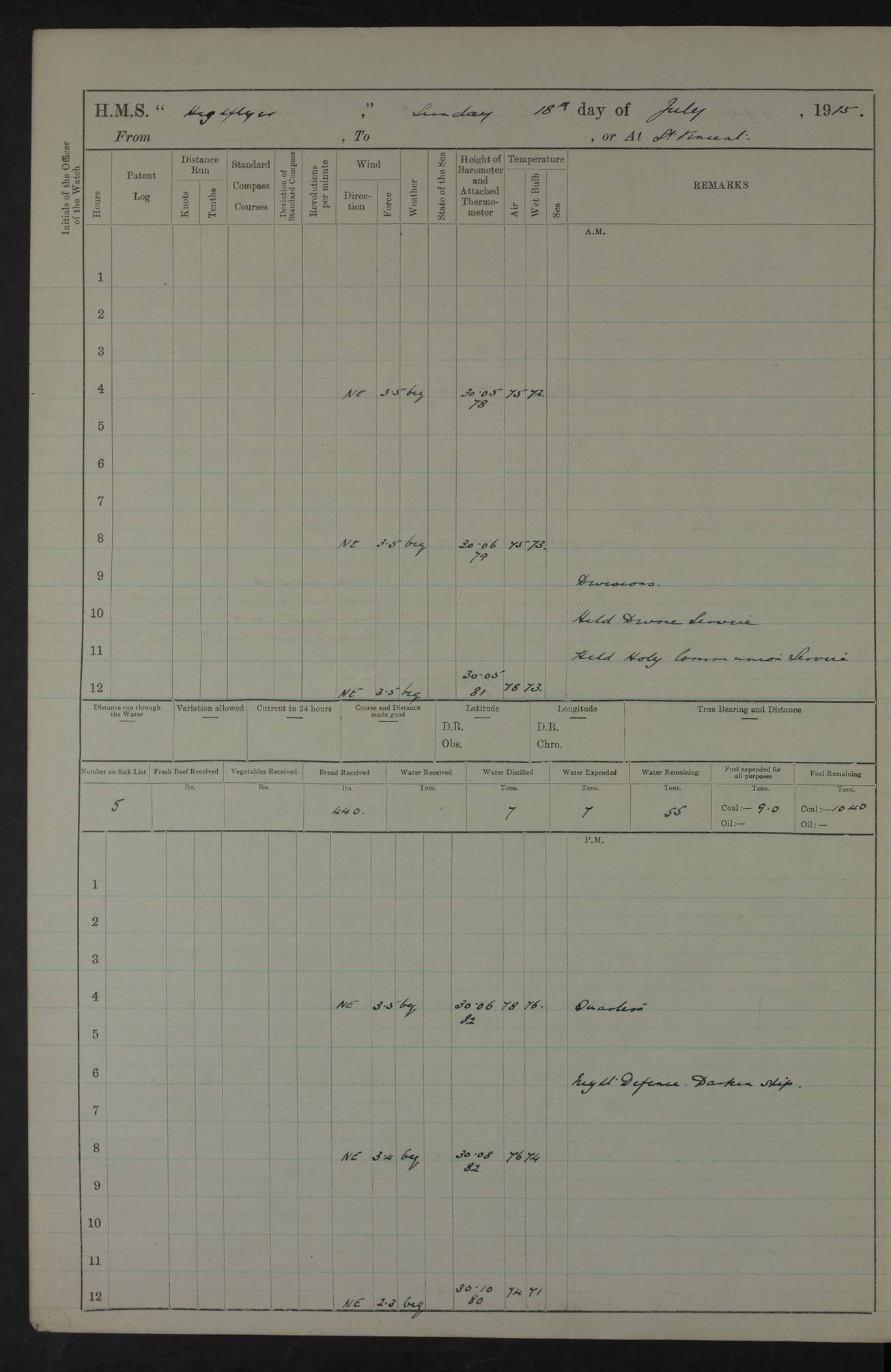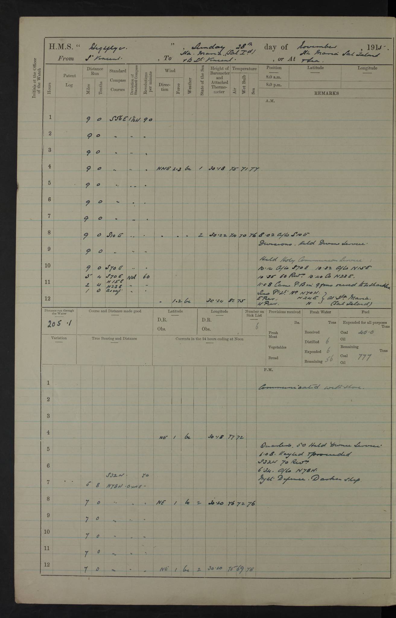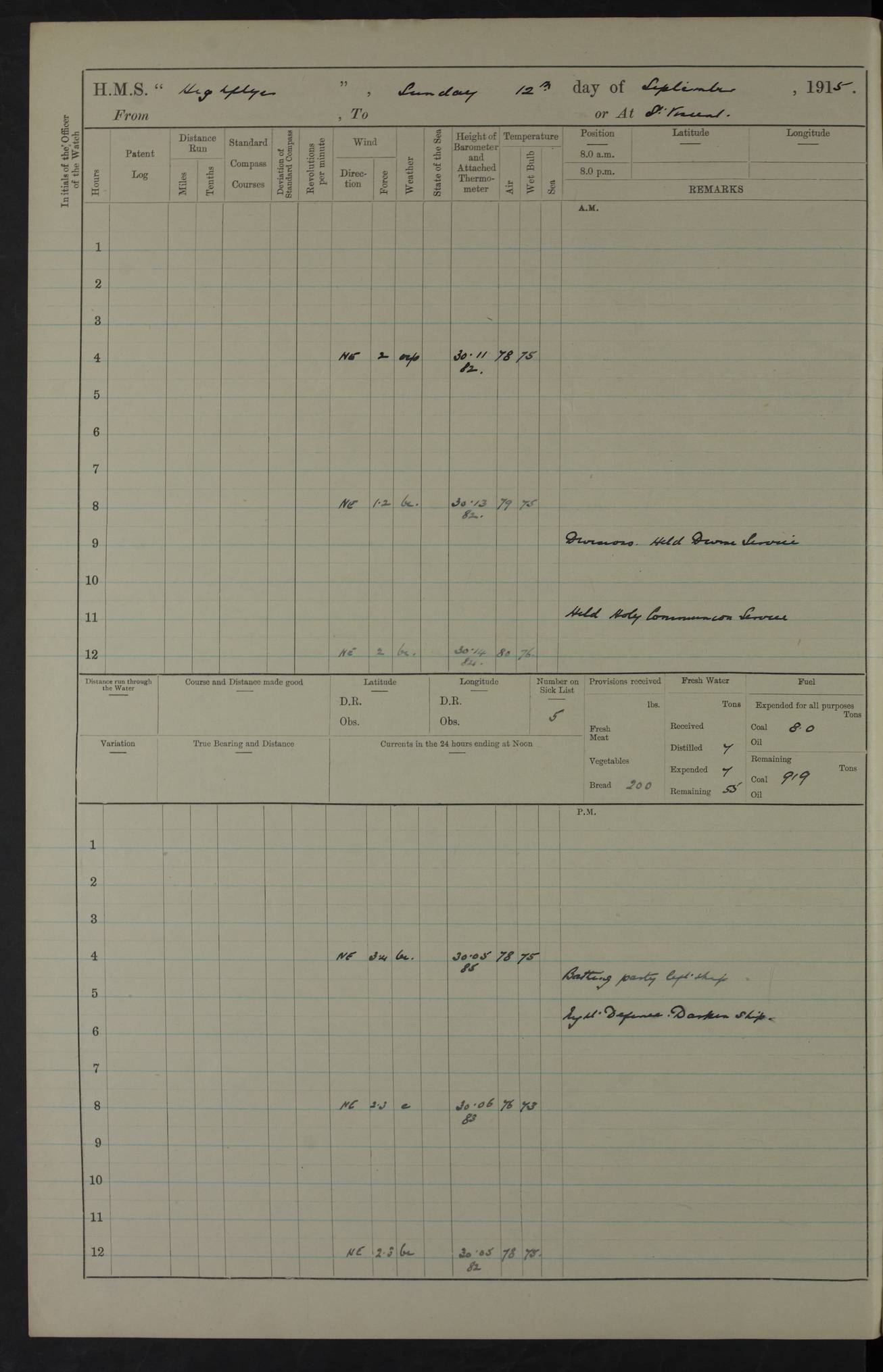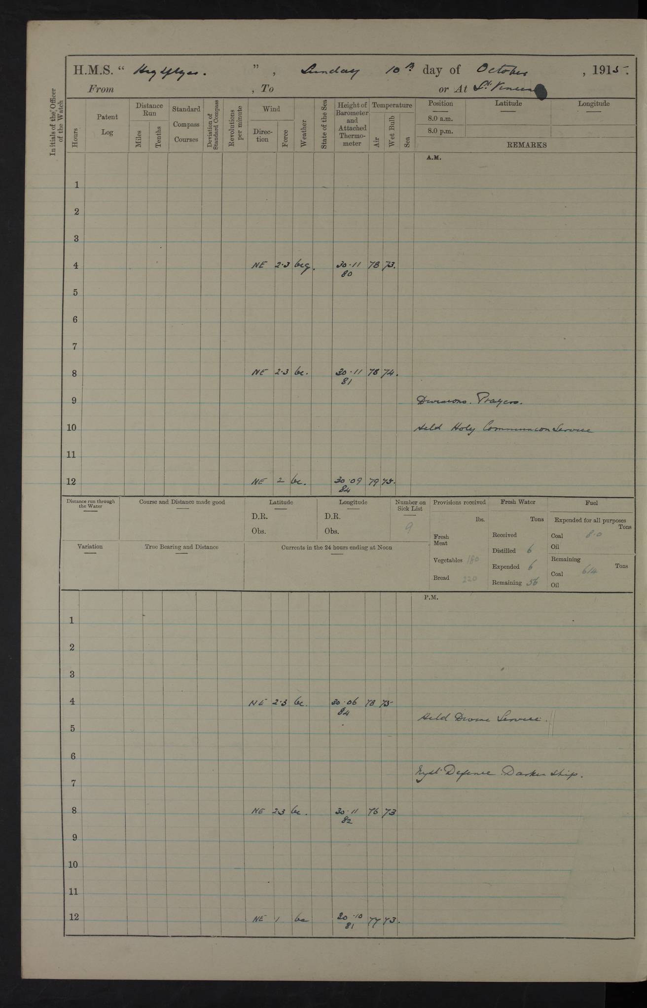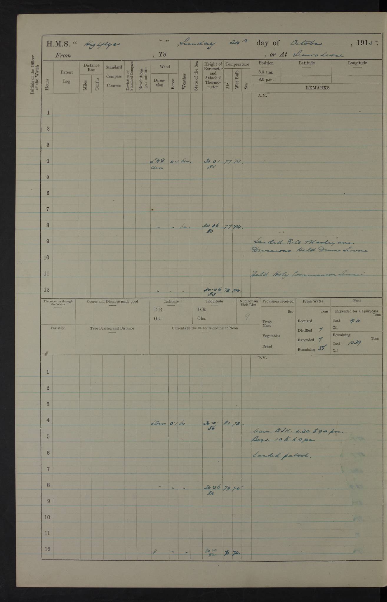 LOGS FOR JANUARY 1915 4f9610aba2fc8e2def000666: (http://s3.amazonaws.com/oldweather/ADM53-44292/ADM 53-44292-112_1.jpg) 1 January 1915 Patrolling off Machado Point Lat 16.8828, Long -25.0106 7.50pm: Weighed and proceeded. Course and speed as requisite to patrol off Machado Point 4f9610aba2fc8e2def000667: (http://s3.amazonaws.com/oldweather/ADM53-44292/ADM 53-44292-113_0.jpg) 2 January 1915 Patrolling off Machado Point Lat 16.8828, Long -25.0106 4.30am: Spoke SS CROWN OF GALICIA bound northward. 6.15am: Spoke HMS MACEDONIA bound northward. 9.00am: Stopped. EMPRESS OF BRITAIN closed and communicated. 10.45pm: Closed and spoke SS BRODERICK bound northward. 4f9610aca2fc8e2def000668: (http://s3.amazonaws.com/oldweather/ADM53-44292/ADM 53-44292-113_1.jpg) 3 January 1915 Patrolling off Machado Point Lat 16.8828, Long -25.0106 2.15am: Spoke SS MAISIA bound northward. 9.00am: Spoke SS KELVINHEAD bound northward (Brit.). 10.00am: Spoke SS ST. LOUIS “French” bound northward. 10.30am: Spoke HMS MARMORA. 1.30pm: EMPRESS OF BRITAIN closed and communicated. 10.30pm: Spoke SS REYNOLDS bound northward. 4f9610aca2fc8e2def000669: (http://s3.amazonaws.com/oldweather/ADM53-44292/ADM 53-44292-114_0.jpg) 4 January 1915 Patrolling off Machado Point Lat 16.8828, Long -25.0106 9.00am: As requisite for entering harbour. 12.30pm: INVINCIBLE in harbour. 2.00pm: MARMORA arrived. 4f9610aca2fc8e2def00066a: (http://s3.amazonaws.com/oldweather/ADM53-44292/ADM 53-44292-114_1.jpg) 5 January 1915 St. Vincent Lat 16.8828, Long -25.0106 3.30pm: EMPRESS OF BRITAIN arrived. 4f9610ada2fc8e2def00066b: (http://s3.amazonaws.com/oldweather/ADM53-44292/ADM 53-44292-115_0.jpg) 6 January 1915 St. Vincent Lat 16.8828, Long -25.0106 9.30am: Discharged 1 prisoner to INVINCIBLE. 5.00pm: HMS INVINCIBLE left harbour. 4f9610ada2fc8e2def00066c: (http://s3.amazonaws.com/oldweather/ADM53-44292/ADM 53-44292-115_1.jpg) 7 January 1915 St. Vincent Lat 16.8828, Long -25.0106 6.30am: HMS INFLEXIBLE arrived. 4f9610ada2fc8e2def00066d: (http://s3.amazonaws.com/oldweather/ADM53-44292/ADM 53-44292-116_0.jpg) 8 January 1915 St. Vincent Lat 16.8828, Long -25.0106 4.30pm: SS ROSEMOUNT drifted on to bows of HIGHFLYER while steaming from VENGEANCE to take up berth. Damage – slight leak in one plate; caulked. 7.00pm: INFLEXIBLE left harbour. 4f9610aea2fc8e2def00066e: (http://s3.amazonaws.com/oldweather/ADM53-44292/ADM 53-44292-116_1.jpg) 9 January 1915 St. Vincent Lat 16.8828, Long -25.0106 Cleaning ship. 4f9610aea2fc8e2def00066f: (http://s3.amazonaws.com/oldweather/ADM53-44292/ADM 53-44292-117_0.jpg) 10 January 1915 St. Vincent and at sea. Lat 16.8828, Long -25.0106 8.30am: Collier OKEHAMPTON came alongside. 11.30am: Finished coaling. 1.00pm: Weighed. Proceeded as requisite. 2.30pm: MARMORA port bow. EMPRESS OF BRITAIN port bow in company. 4f9610aea2fc8e2def000670: (http://s3.amazonaws.com/oldweather/ADM53-44292/ADM 53-44292-117_1.jpg) 11 January 1915 At sea Lat 12.8, Long -24.3 Cleaning ship. 4f9610afa2fc8e2def000671: (http://s3.amazonaws.com/oldweather/ADM53-44292/ADM 53-44292-118_0.jpg) 12 January 1915 At sea Lat 8.6, Long -23.1 Refitting and as requisite. 4f9610afa2fc8e2def000672: (http://s3.amazonaws.com/oldweather/ADM53-44292/ADM 53-44292-118_1.jpg) 13 January 1915 At sea Lat 4.6, Long -21.4 10.30am: Divisional drill. Refitting and as requisite. 4f9610afa2fc8e2def000673: (http://s3.amazonaws.com/oldweather/ADM53-44292/ADM 53-44292-119_0.jpg) 14 January 1915 Patrolling Lat 1.4, Long -20.0 1.45pm: MARMORA took station N25W. EMPRESS OF BRITAIN S65W. 4f9610b0a2fc8e2def000674: (http://s3.amazonaws.com/oldweather/ADM53-44292/ADM 53-44292-119_1.jpg) 15 January 1915 [14 January in log] At sea Lat 1.2, Long -23.2 10.00am: Divisional drill. Refitting and as requisite. 4f9610b0a2fc8e2def000675: (http://s3.amazonaws.com/oldweather/ADM53-44292/ADM 53-44292-120_0.jpg) 16 January 1915 At sea Lat 1.4, Long -25.6 8.20am: Stopped. Boarded SS ESPERANZA, Italian, Buenos Aires to Dakar, Lat 1.20N, Long 24.35W DR. 4f9610b0a2fc8e2def000676: (http://s3.amazonaws.com/oldweather/ADM53-44292/ADM 53-44292-120_1.jpg) 17 January 1915 At sea Lat 2.6, Long -25.8 1.30pm: Sighted steamer E½N approx. 2.30pm: HMS MARMORA boarded SS ARDGAIN bound Rio de Janeiro. 4f9610b1a2fc8e2def000677: (http://s3.amazonaws.com/oldweather/ADM53-44292/ADM 53-44292-121_0.jpg) 18 January 1915 At sea Lat 2.6, Long -24.2 11.00pm: HMS EMPRESS OF BRITAIN boarded SS ILDERTON bound south (Brit.). 4f9610b1a2fc8e2def000678: (http://s3.amazonaws.com/oldweather/ADM53-44292/ADM 53-44292-121_1.jpg) 19 January 1915 At sea Lat 2.7, Long -21.4 9.30am: Refitting and as requisite. Boys at physical drill. 4f9610b1a2fc8e2def000679: (http://s3.amazonaws.com/oldweather/ADM53-44292/ADM 53-44292-122_0.jpg) 20 January 1915 At sea Lat 2.7, Long -18.2 10.00am: Boys at physical drill. Remainder refitting and as requisite. 4f9610b2a2fc8e2def00067a: (http://s3.amazonaws.com/oldweather/ADM53-44292/ADM 53-44292-122_1.jpg) 21 January 1915 To Sierra Leone Lat 5.5, Long -16.3 9.30am: General Quarters. Loader. Refitting and as requisite. 4f9610b2a2fc8e2def00067b: (http://s3.amazonaws.com/oldweather/ADM53-44292/ADM 53-44292-123_0.jpg) 22 January 1915 To Sierra Leone Lat 8.4, Long -14.1 4.40pm: Came to with PB in 7 fathoms., veered to 5 shackles. 4f9610b2a2fc8e2def00067c: (http://s3.amazonaws.com/oldweather/ADM53-44292/ADM 53-44292-123_1.jpg) 23 January 1915 Sierra Leone Lat 8.5, Long -13.2 7.10am: Passed Examination Service. 7.40am: Proceeded as requisite to anchorage. 10.00am: Collier SS LUDGATE came alongside. Coaling ship. 6.00pm: Finished coaling; received 906 tons. 4f9610b3a2fc8e2def00067d: (http://s3.amazonaws.com/oldweather/ADM53-44292/ADM 53-44292-124_0.jpg) 24 January 1915 Sierra Leone Lat 8.5, Long -13.2 6.15am: Cleaning ship. 4f9610b3a2fc8e2def00067e: (http://s3.amazonaws.com/oldweather/ADM53-44292/ADM 53-44292-124_1.jpg) 25 January 1915 Sierra Leone Lat 8.5, Long -13.2 11.30am: Court Martial held on board HMS MARMORA. 1.00pm: 