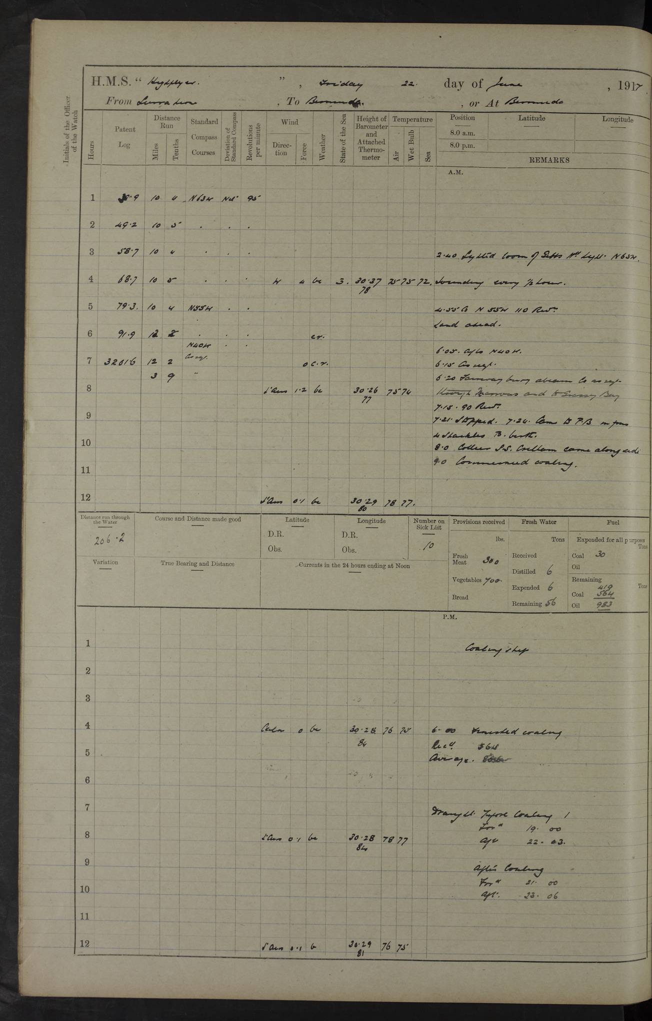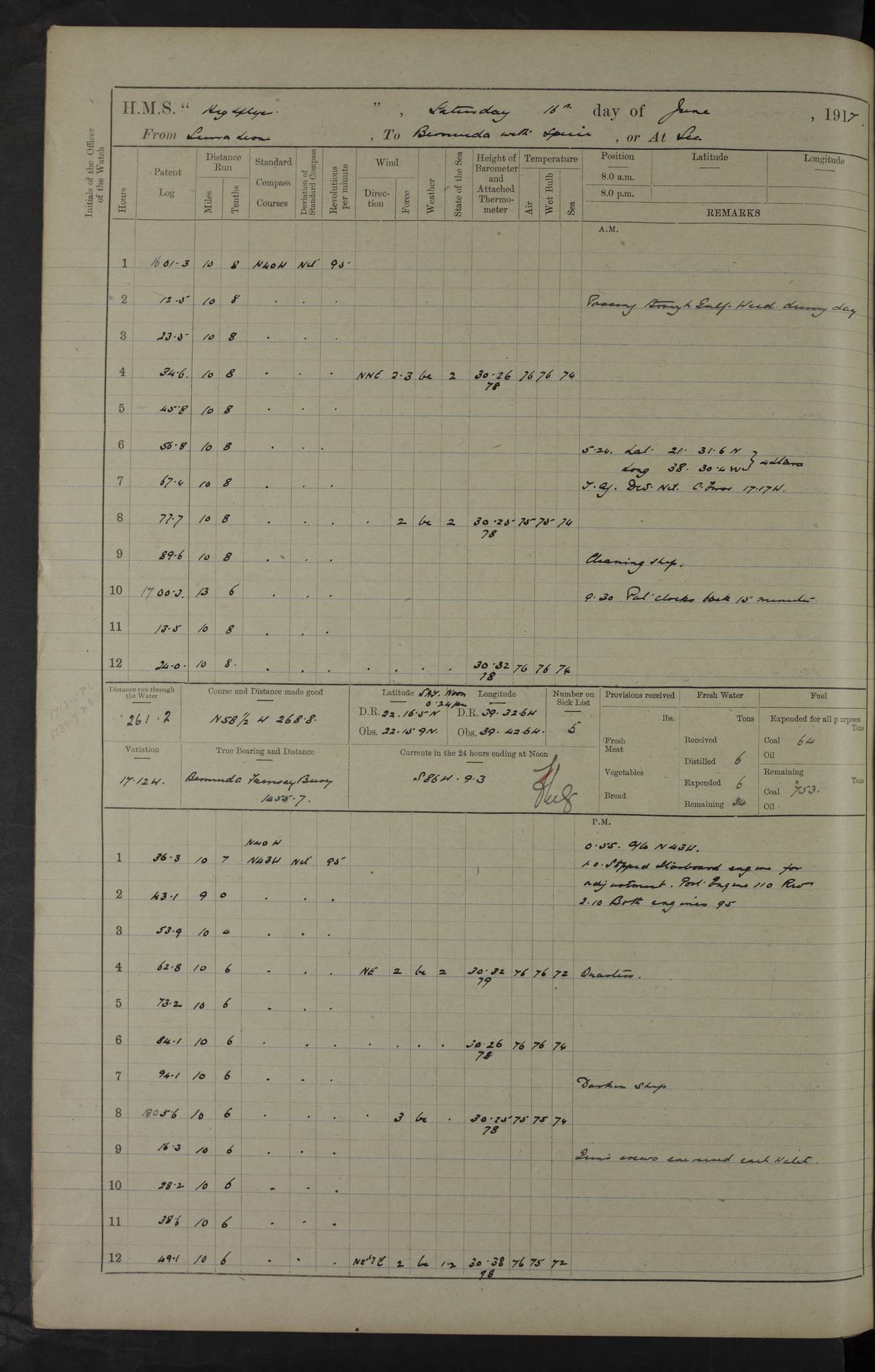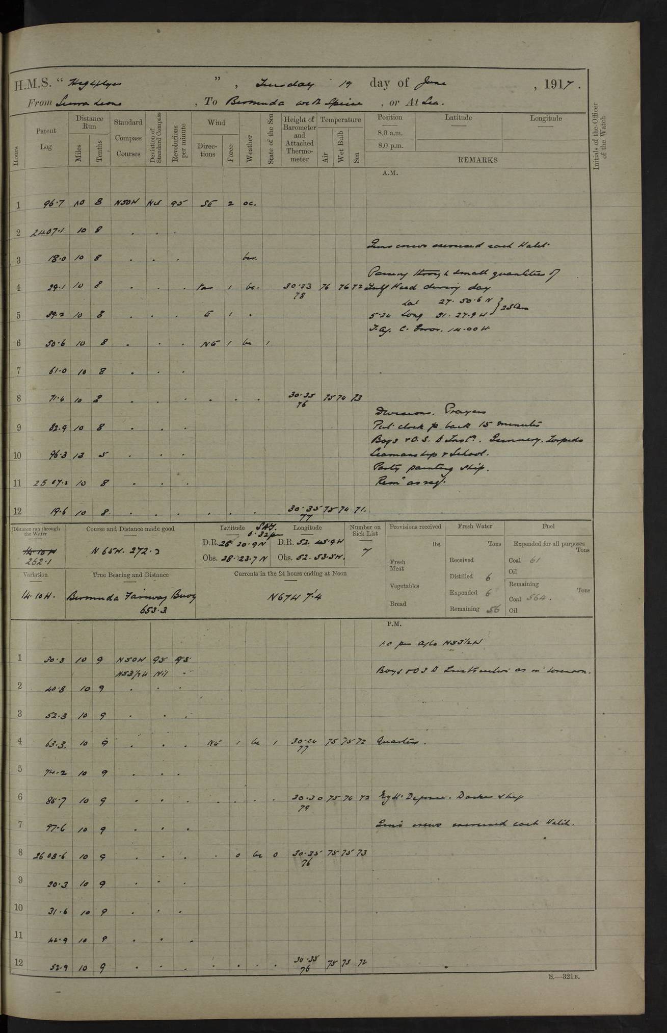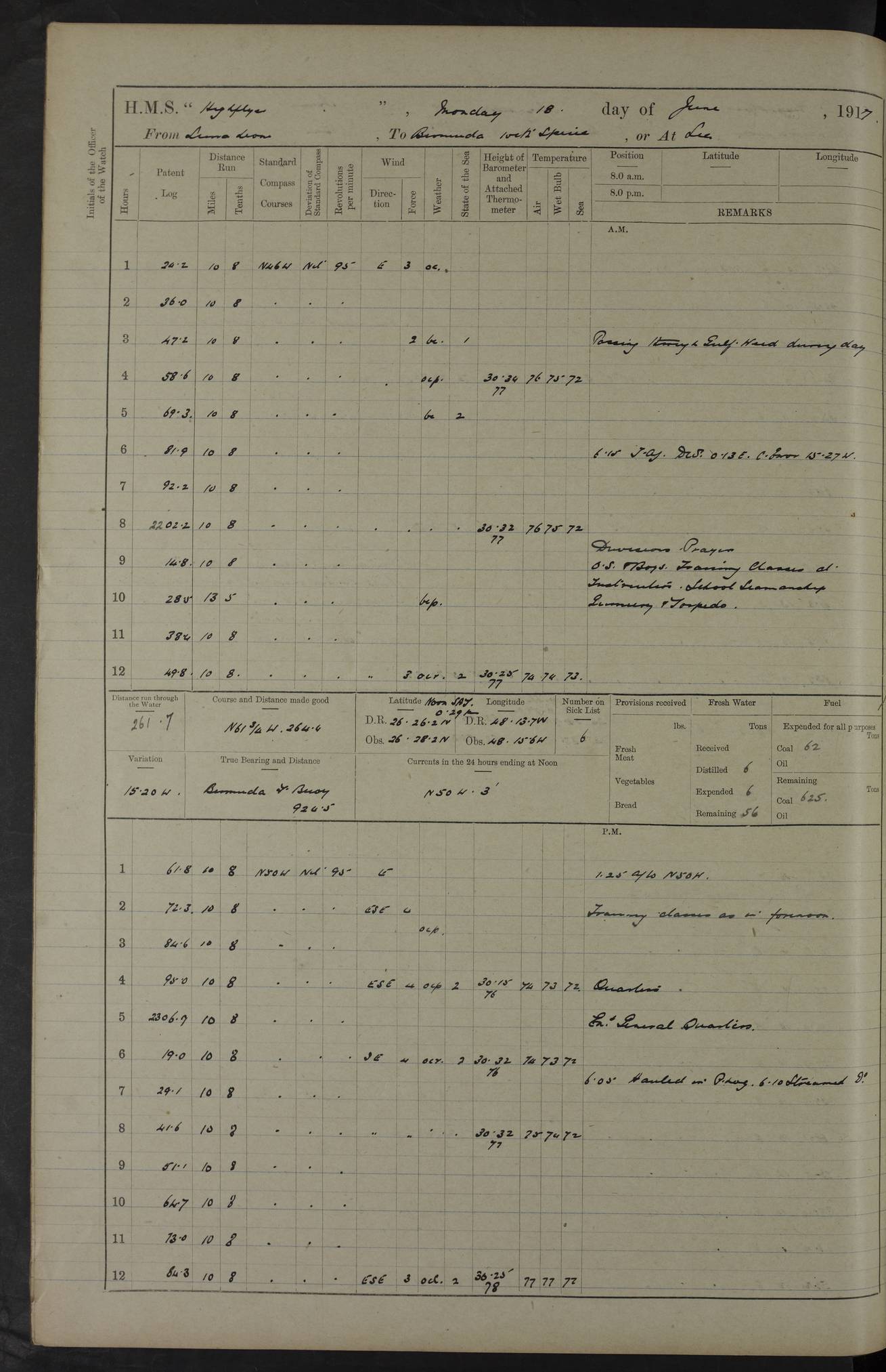 LOGS FOR JANUARY 1918 4caf86fecadfd34197018bbd: (http://oldweather.s3.amazonaws.com/ADM 53-44308/ADM 53-44308-0075_0.jpg) 4caf86fecadfd34197018bbe: (http://oldweather.s3.amazonaws.com/ADM 53-44308/ADM 53-44308-0075_1.jpg) January 1918 4caf86fecadfd34197018bbf: (http://oldweather.s3.amazonaws.com/ADM 53-44308/ADM 53-44308-0076_0.jpg) 4caf86fecadfd34197018bc0: (http://oldweather.s3.amazonaws.com/ADM 53-44308/ADM 53-44308-0076_1.jpg) 4caf86fecadfd34197018bc1: (http://oldweather.s3.amazonaws.com/ADM 53-44308/ADM 53-44308-0077_0.jpg) 4caf86fecadfd34197018bc2: (http://oldweather.s3.amazonaws.com/ADM 53-44308/ADM 53-44308-0077_1.jpg) January 1918 1–13 January 1918 Ship being repaired. Jan. 4: Mr. Iray w. Eng. RNR joined ship. Jan. 5: Discharged 1 sto. to Depot. Captain Worsley joined ship, Mr. Ritchie Ast. Eng. left ship for Portsmouth. Jan. 6: Captain Gamelt (?) discharged. Jan. 7: Ship’s company berthed in London with exception of fire party of 40 hands. Ship being converted from Cadet ship for use as Flagship C-in-C N.A.TH. Indies. 4caf86fecadfd34197018bc3: (http://oldweather.s3.amazonaws.com/ADM 53-44308/ADM 53-44308-0078_0.jpg) 14– 20 January 1918 January 1918 Ship being converted for use as flagship. 4caf86fecadfd34197018bc4: (http://oldweather.s3.amazonaws.com/ADM 53-44308/ADM 53-44308-0078_1.jpg) 21 January 1918 Devonport Lat 50.4, Long -3.0 S. Wiggett Art. Ass. Pay. joined. Remainder of hands returned from London. 15 Ratings discharged to Depot. 2 Ratings joined ship. 4caf86fecadfd34197018bc5: (http://oldweather.s3.amazonaws.com/ADM 53-44308/ADM 53-44308-0079_0.jpg) 22 January 1918 Devonport Lat 50.38, Long -4.19 Captain V. H. Haggard joined ship and took command. Lieut. Gordon Fellowes, Pay RNR, V. I. Butcher, Act. Ass. Pay, T. W. Anderson, Capt. A. N. Williams R.M.L.I. joined ship. 5 Ratings discharged to Depot. 3 Ratings joined from Depot. Drawing stores and gear. 4caf86fecadfd34197018bc6: (http://oldweather.s3.amazonaws.com/ADM 53-44308/ADM 53-44308-0079_1.jpg) 23 January 1918 Devonport Lat 50.38, Long -4.19 Secretary to C-in-C, W. P. Putt joined ship. Commander A. R. A. Macdonald joined ship for passage to ROXBURGH. Lieut. Simonds RMLI left ship. Cadet Adamson RCN joined ship for passage to Halifax. Vice-Admiral Sir Lowther Grant KCB, C-in-C N. America and West Indies came on board. 8 Ratings joined and 2 Ratings were discharged. 4caf86fecadfd34197018bc7: (http://oldweather.s3.amazonaws.com/ADM 53-44308/ADM 53-44308-0080_0.jpg) 24 January 1918 Plymouth to Bermuda and at sea. Lat 49.6, Long -5.9 4:45 am: Weighed and proceeded. KING ALFRED in company. 4caf86fecadfd34197018bc8: (http://oldweather.s3.amazonaws.com/ADM 53-44308/ADM 53-44308-0080_1.jpg) 25 January 1918 Lat 48.0, Long -13.0 4:15 am: T.B.D.s parted company. 6:40 am: Port lower boom carried away by sea. 8:30 am: HMS KING ALFRED proceeded independently. 4caf86fecadfd34197018bc9: (http://oldweather.s3.amazonaws.com/ADM 53-44308/ADM 53-44308-0081_0.jpg) 26 January 1918 Lat 47.0, Long -19.0 Intermittent zig-zag courses. 4caf86fecadfd34197018bca: (http://oldweather.s3.amazonaws.com/ADM 53-44308/ADM 53-44308-0081_1.jpg) 27 January 1918 Lat 46.0, Long -24.0 Held Divine Service. 4caf86fecadfd34197018bcb: (http://oldweather.s3.amazonaws.com/ADM 53-44308/ADM 53-44308-0082_0.jpg) 28 January 1918 At Sea Lat 45.0, Long -27.9 11:35 am: P. Side of F. Bridge and shelter partially destroyed by sea. 4caf86fecadfd34197018bcc: (http://oldweather.s3.amazonaws.com/ADM 53-44308/ADM 53-44308-0082_1.jpg) 29 January 1918 Lat 43.0, Long -30.0 10:55 pm: Altered course south for Fayal Id. for coal on account of weather experienced. 4caf86fecadfd34197018bcd: (http://oldweather.s3.amazonaws.com/ADM 53-44308/ADM 53-44308-0083_0.jpg) 30 January 1918 Lat 41.0, Long -30.0 Refitting and cleaning ship. 4caf86fecadfd34197018bce: (http://oldweather.s3.amazonaws.com/ADM 53-44308/ADM 53-44308-0083_1.jpg) 31 January 1918 At Sea & Azores Lat 38.5, Long -28.6 6:15 am: Sighted San Jorge Id. S15E 7:45 am: Anchored. pm: Coaling ship. LOGS FOR FEBRUARY 1918 4caf86fecadfd34197018bcf: (http://oldweather.s3.amazonaws.com/ADM 53-44308/ADM 53-44308-0084_0.jpg) 4caf86fecadfd34197018bd0: (http://oldweather.s3.amazonaws.com/ADM 53-44308/ADM 53-44308-0084_1.jpg) 4caf86fecadfd34197018bd1: (http://oldweather.s3.amazonaws.com/ADM 53-44308/ADM 53-44308-0085_0.jpg) 4caf86fecadfd34197018bd2: (http://oldweather.s3.amazonaws.com/ADM 53-44308/ADM 53-44308-0085_1.jpg) 4caf86fecadfd34197018bd3: (http://oldweather.s3.amazonaws.com/ADM 53-44308/ADM 53-44308-0086_0.jpg) 4caf86fecadfd34197018bd4: (http://oldweather.s3.amazonaws.com/ADM 53-44308/ADM 53-44308-0086_1.jpg) 1 February 1918 At Sea and Horta, Fayal Lat 38.0, Long -29.0 5:40 am: Proceeded as req. 6:57 am: Compreda Pt. N12E. 4caf86fecadfd34197018bd5: (http://oldweather.s3.amazonaws.com/ADM 53-44308/ADM 53-44308-0087_0.jpg) 2 February 1918 Lat 37.0, Long -33.0 Cleaning ship. 4caf86fecadfd34197018bd6: (http://oldweather.s3.amazonaws.com/ADM 53-44308/ADM 53-44308-0087_1.jpg) 3 February 1918 Lat 36.9, Long -36.0 4caf86fecadfd34197018bd7: (http://oldweather.s3.amazonaws.com/ADM 53-44308/ADM 53-44308-0088_0.jpg) 4 February 1918 Lat 36.0, Long -40.5 At instruction and cleaning ship. 4caf86fecadfd34197018bd8: (http://oldweather.s3.amazonaws.com/ADM 53-44308/ADM 53-44308-0088_1.jpg) 5 February 1918 Lat 35.3, Long -44.8 O.S. Gunnery training class at instruction. Boys at school and signals. Remainder refitting. 4caf86fecadfd34197018bd9: (http://oldweather.s3.amazonaws.com/ADM 53-44308/ADM 53-44308-0089_0.jpg) 6 February 1918 Lat 34.0, Long -47.8 4:30 pm: Read Warrant No. 86. 4caf86fecadfd34197018bda: (http://oldweather.s3.amazonaws.com/ADM 53-44308/ADM 53-44308-0089_1.jpg) 7 February 1918 Lat 34.0, Long -52.0 10:25 pm: Port engine stopped for repairs. 4caf86fecadfd34197018bdb: (http://oldweather.s3.amazonaws.com/ADM 53-44308/ADM 53-44308-0090_0.jpg) 8 February 1918 Lat 33.0, Long -56.0 11:30 am: P. Engine working. 4caf86fecadfd34197018bdc: