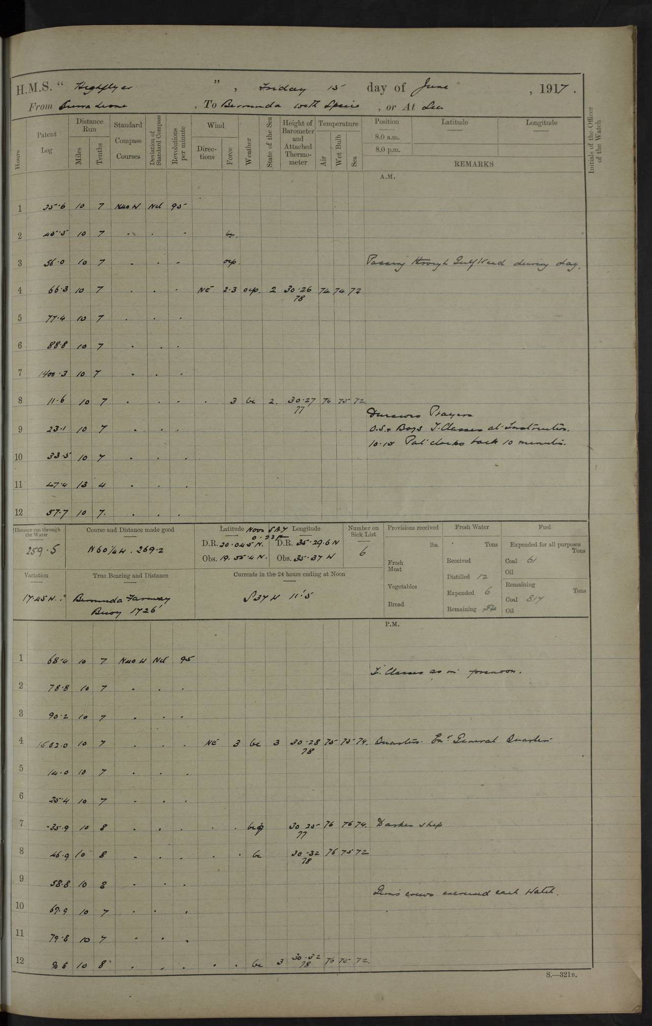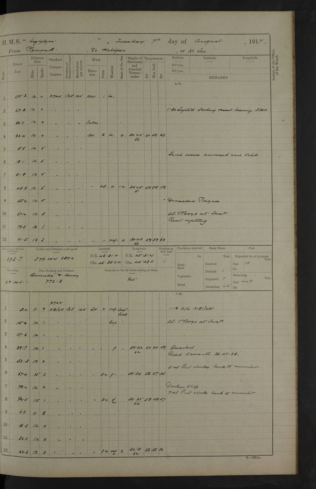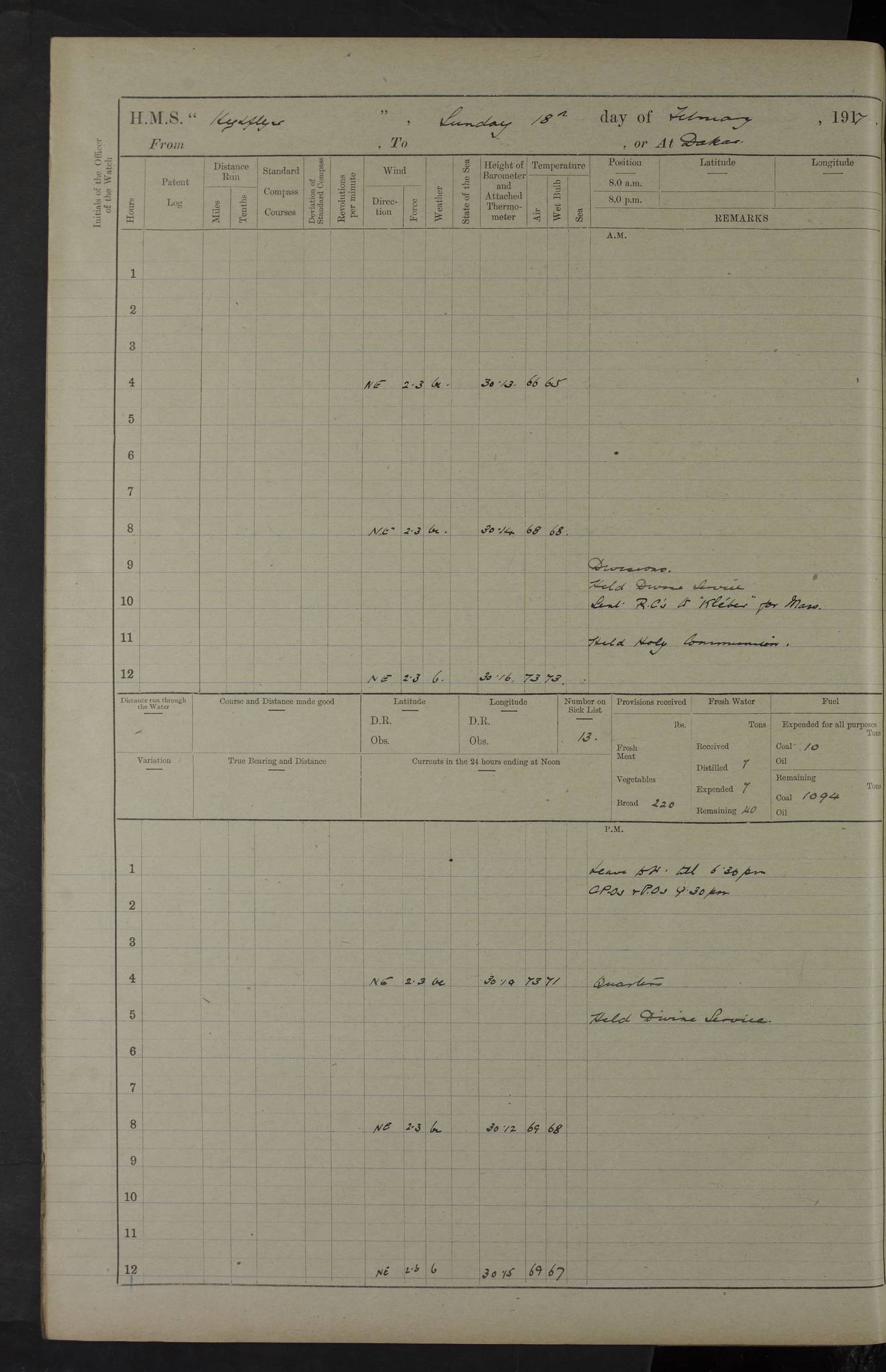 LOGS FOR JANUARY 1918 4caf86fecadfd34197018bbd: (http://oldweather.s3.amazonaws.com/ADM 53-44308/ADM 53-44308-0075_0.jpg) 4caf86fecadfd34197018bbe: (http://oldweather.s3.amazonaws.com/ADM 53-44308/ADM 53-44308-0075_1.jpg) January 1918 4caf86fecadfd34197018bbf: (http://oldweather.s3.amazonaws.com/ADM 53-44308/ADM 53-44308-0076_0.jpg) 4caf86fecadfd34197018bc0: (http://oldweather.s3.amazonaws.com/ADM 53-44308/ADM 53-44308-0076_1.jpg) 4caf86fecadfd34197018bc1: (http://oldweather.s3.amazonaws.com/ADM 53-44308/ADM 53-44308-0077_0.jpg) 4caf86fecadfd34197018bc2: (http://oldweather.s3.amazonaws.com/ADM 53-44308/ADM 53-44308-0077_1.jpg) January 1918 1–13 January 1918 Ship being repaired. Jan. 4: Mr. Iray w. Eng. RNR joined ship. Jan. 5: Discharged 1 sto. to Depot. Captain Worsley joined ship, Mr. Ritchie Ast. Eng. left ship for Portsmouth. Jan. 6: Captain Gamelt (?) discharged. Jan. 7: Ship’s company berthed in London with exception of fire party of 40 hands. Ship being converted from Cadet ship for use as Flagship C-in-C N.A.TH. Indies. 4caf86fecadfd34197018bc3: (http://oldweather.s3.amazonaws.com/ADM 53-44308/ADM 53-44308-0078_0.jpg) 14– 20 January 1918 January 1918 Ship being converted for use as flagship. 4caf86fecadfd34197018bc4: (http://oldweather.s3.amazonaws.com/ADM 53-44308/ADM 53-44308-0078_1.jpg) 21 January 1918 Devonport Lat 50.4, Long -3.0 S. Wiggett Art. Ass. Pay. joined. Remainder of hands returned from London. 15 Ratings discharged to Depot. 2 Ratings joined ship. 4caf86fecadfd34197018bc5: (http://oldweather.s3.amazonaws.com/ADM 53-44308/ADM 53-44308-0079_0.jpg) 22 January 1918 Devonport Lat 50.38, Long -4.19 Captain V. H. Haggard joined ship and took command. Lieut. Gordon Fellowes, Pay RNR, V. I. Butcher, Act. Ass. Pay, T. W. Anderson, Capt. A. N. Williams R.M.L.I. joined ship. 5 Ratings discharged to Depot. 3 Ratings joined from Depot. Drawing stores and gear. 4caf86fecadfd34197018bc6: (http://oldweather.s3.amazonaws.com/ADM 53-44308/ADM 53-44308-0079_1.jpg) 23 January 1918 Devonport Lat 50.38, Long -4.19 Secretary to C-in-C, W. P. Putt joined ship. Commander A. R. A. Macdonald joined ship for passage to ROXBURGH. Lieut. Simonds RMLI left ship. Cadet Adamson RCN joined ship for passage to Halifax. Vice-Admiral Sir Lowther Grant KCB, C-in-C N. America and West Indies came on board. 8 Ratings joined and 2 Ratings were discharged. 4caf86fecadfd34197018bc7: (http://oldweather.s3.amazonaws.com/ADM 53-44308/ADM 53-44308-0080_0.jpg) 24 January 1918 Plymouth to Bermuda and at sea. Lat 49.6, Long -5.9 4:45 am: Weighed and proceeded. KING ALFRED in company. 4caf86fecadfd34197018bc8: (http://oldweather.s3.amazonaws.com/ADM 53-44308/ADM 53-44308-0080_1.jpg) 25 January 1918 Lat 48.0, Long -13.0 4:15 am: T.B.D.s parted company. 6:40 am: Port lower boom carried away by sea. 8:30 am: HMS KING ALFRED proceeded independently. 4caf86fecadfd34197018bc9: (http://oldweather.s3.amazonaws.com/ADM 53-44308/ADM 53-44308-0081_0.jpg) 26 January 1918 Lat 47.0, Long -19.0 Intermittent zig-zag courses. 4caf86fecadfd34197018bca: (http://oldweather.s3.amazonaws.com/ADM 53-44308/ADM 53-44308-0081_1.jpg) 27 January 1918 Lat 46.0, Long -24.0 Held Divine Service. 4caf86fecadfd34197018bcb: (http://oldweather.s3.amazonaws.com/ADM 53-44308/ADM 53-44308-0082_0.jpg) 28 January 1918 At Sea Lat 45.0, Long -27.9 11:35 am: P. Side of F. Bridge and shelter partially destroyed by sea. 4caf86fecadfd34197018bcc: (http://oldweather.s3.amazonaws.com/ADM 53-44308/ADM 53-44308-0082_1.jpg) 29 January 1918 Lat 43.0, Long -30.0 10:55 pm: Altered course south for Fayal Id. for coal on account of weather experienced. 4caf86fecadfd34197018bcd: (http://oldweather.s3.amazonaws.com/ADM 53-44308/ADM 53-44308-0083_0.jpg) 30 January 1918 Lat 41.0, Long -30.0 Refitting and cleaning ship. 4caf86fecadfd34197018bce: (http://oldweather.s3.amazonaws.com/ADM 53-44308/ADM 53-44308-0083_1.jpg) 31 January 1918 At Sea & Azores Lat 38.5, Long -28.6 6:15 am: Sighted San Jorge Id. S15E 7:45 am: Anchored. pm: Coaling ship. LOGS FOR FEBRUARY 1918 4caf86fecadfd34197018bcf: (http://oldweather.s3.amazonaws.com/ADM 53-44308/ADM 53-44308-0084_0.jpg) 4caf86fecadfd34197018bd0: (http://oldweather.s3.amazonaws.com/ADM 53-44308/ADM 53-44308-0084_1.jpg) 4caf86fecadfd34197018bd1: (http://oldweather.s3.amazonaws.com/ADM 53-44308/ADM 53-44308-0085_0.jpg) 4caf86fecadfd34197018bd2: (http://oldweather.s3.amazonaws.com/ADM 53-44308/ADM 53-44308-0085_1.jpg) 4caf86fecadfd34197018bd3: (http://oldweather.s3.amazonaws.com/ADM 53-44308/ADM 53-44308-0086_0.jpg) 4caf86fecadfd34197018bd4: (http://oldweather.s3.amazonaws.com/ADM 53-44308/ADM 53-44308-0086_1.jpg) 1 February 1918 At Sea and Horta, Fayal Lat 38.0, Long -29.0 5:40 am: Proceeded as req. 6:57 am: Compreda Pt. N12E. 4caf86fecadfd34197018bd5: (http://oldweather.s3.amazonaws.com/ADM 53-44308/ADM 53-44308-0087_0.jpg) 2 February 1918 Lat 37.0, Long -33.0 Cleaning ship. 4caf86fecadfd34197018bd6: (http://oldweather.s3.amazonaws.com/ADM 53-44308/ADM 53-44308-0087_1.jpg) 3 February 1918 Lat 36.9, Long -36.0 4caf86fecadfd34197018bd7: (http://oldweather.s3.amazonaws.com/ADM 53-44308/ADM 53-44308-0088_0.jpg) 4 February 1918 Lat 36.0, Long -40.5 At instruction and cleaning ship. 4caf86fecadfd34197018bd8: (http://oldweather.s3.amazonaws.com/ADM 53-44308/ADM 53-44308-0088_1.jpg) 5 February 1918 Lat 35.3, Long -44.8 O.S. Gunnery training class at instruction. Boys at school and signals. Remainder refitting. 4caf86fecadfd34197018bd9: (http://oldweather.s3.amazonaws.com/ADM 53-44308/ADM 53-44308-0089_0.jpg) 6 February 1918 Lat 34.0, Long -47.8 4:30 pm: Read Warrant No. 86. 4caf86fecadfd34197018bda: (http://oldweather.s3.amazonaws.com/ADM 53-44308/ADM 53-44308-0089_1.jpg) 7 February 1918 Lat 34.0, Long -52.0 10:25 pm: Port engine stopped for repairs. 4caf86fecadfd34197018bdb: (http://oldweather.s3.amazonaws.com/ADM 53-44308/ADM 53-44308-0090_0.jpg) 8 February 1918 Lat 33.0, Long -56.0 11:30 am: P. Engine working. 4caf86fecadfd34197018bdc:
