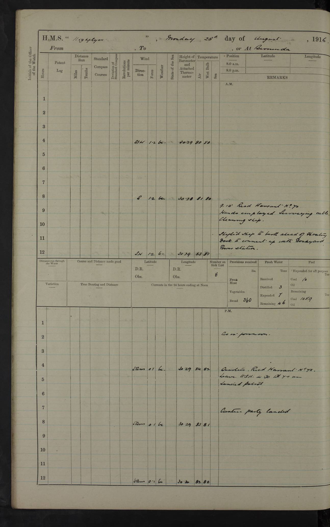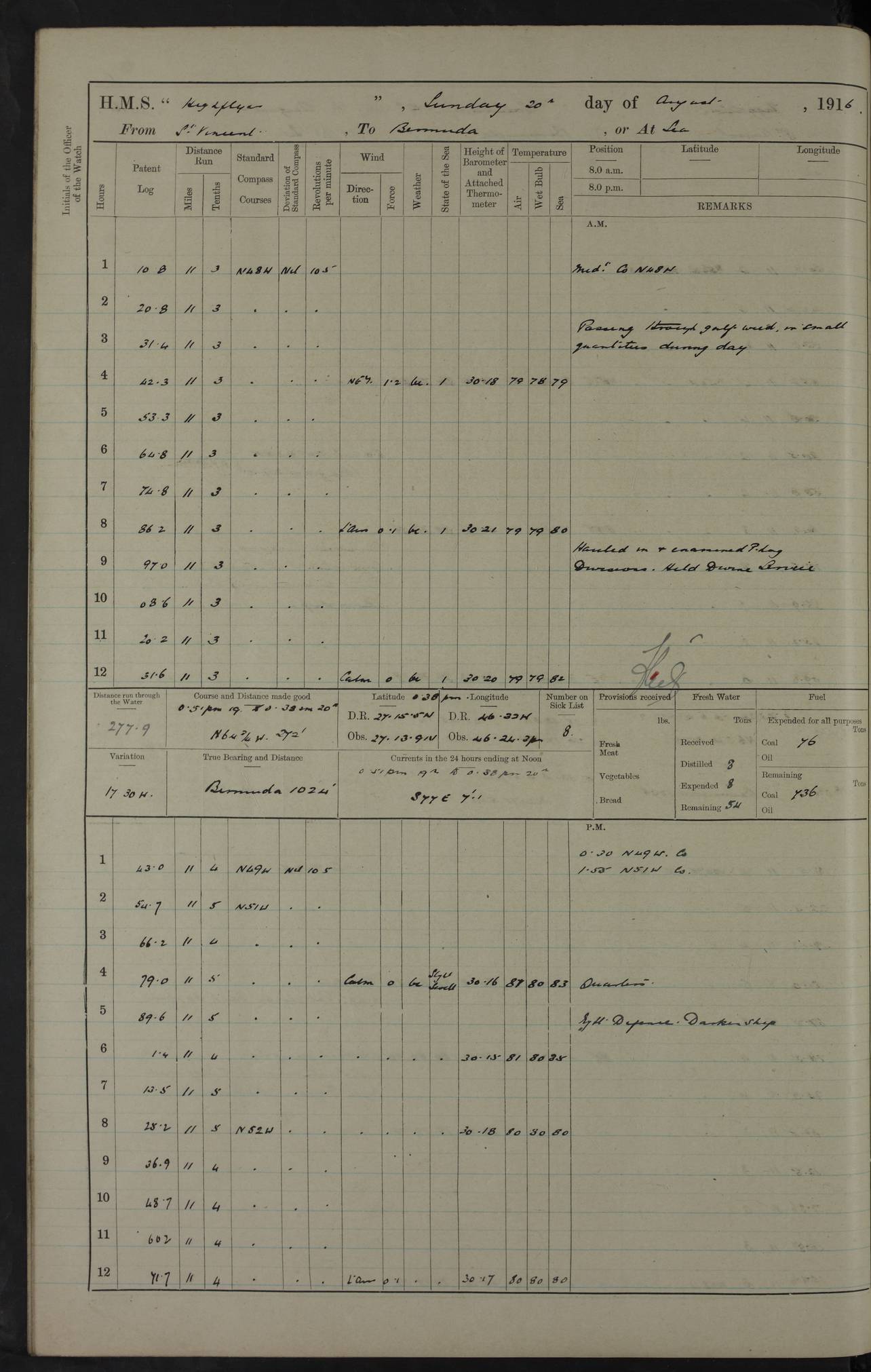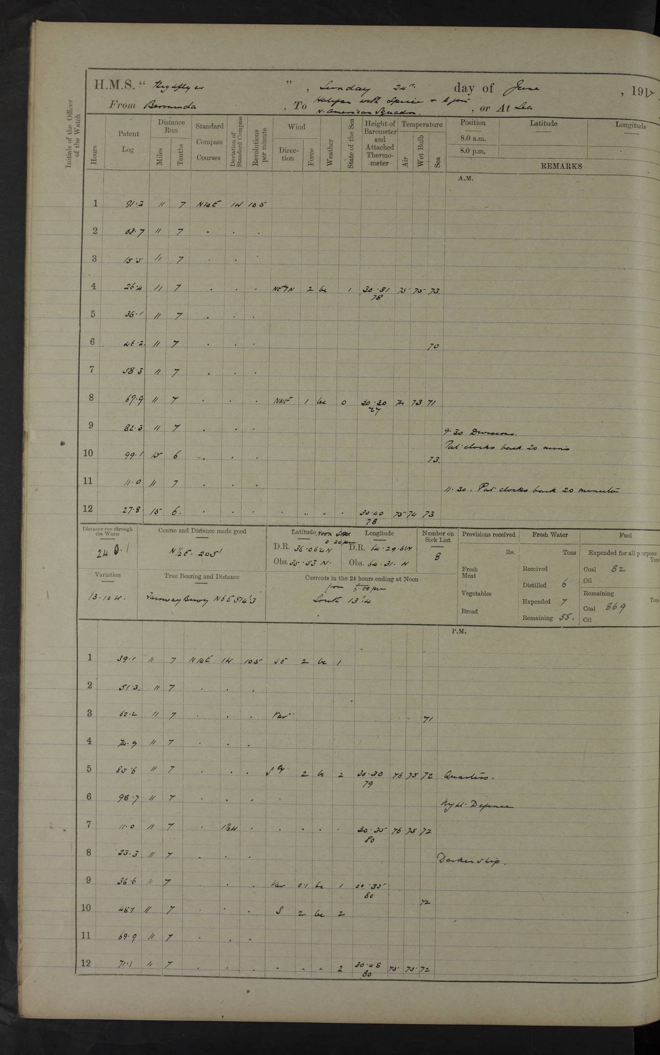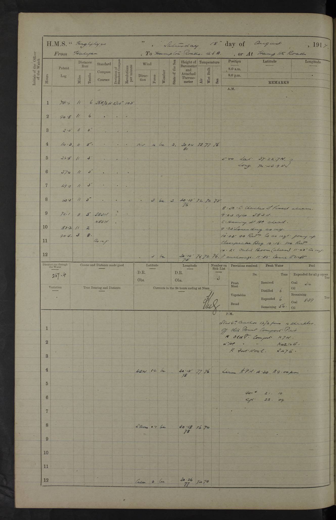 LOGS FOR JANUARY 1918 4caf86fecadfd34197018bbd: (http://oldweather.s3.amazonaws.com/ADM 53-44308/ADM 53-44308-0075_0.jpg) 4caf86fecadfd34197018bbe: (http://oldweather.s3.amazonaws.com/ADM 53-44308/ADM 53-44308-0075_1.jpg) January 1918 4caf86fecadfd34197018bbf: (http://oldweather.s3.amazonaws.com/ADM 53-44308/ADM 53-44308-0076_0.jpg) 4caf86fecadfd34197018bc0: (http://oldweather.s3.amazonaws.com/ADM 53-44308/ADM 53-44308-0076_1.jpg) 4caf86fecadfd34197018bc1: (http://oldweather.s3.amazonaws.com/ADM 53-44308/ADM 53-44308-0077_0.jpg) 4caf86fecadfd34197018bc2: (http://oldweather.s3.amazonaws.com/ADM 53-44308/ADM 53-44308-0077_1.jpg) January 1918 1–13 January 1918 Ship being repaired. Jan. 4: Mr. Iray w. Eng. RNR joined ship. Jan. 5: Discharged 1 sto. to Depot. Captain Worsley joined ship, Mr. Ritchie Ast. Eng. left ship for Portsmouth. Jan. 6: Captain Gamelt (?) discharged. Jan. 7: Ship’s company berthed in London with exception of fire party of 40 hands. Ship being converted from Cadet ship for use as Flagship C-in-C N.A.TH. Indies. 4caf86fecadfd34197018bc3: (http://oldweather.s3.amazonaws.com/ADM 53-44308/ADM 53-44308-0078_0.jpg) 14– 20 January 1918 January 1918 Ship being converted for use as flagship. 4caf86fecadfd34197018bc4: (http://oldweather.s3.amazonaws.com/ADM 53-44308/ADM 53-44308-0078_1.jpg) 21 January 1918 Devonport Lat 50.4, Long -3.0 S. Wiggett Art. Ass. Pay. joined. Remainder of hands returned from London. 15 Ratings discharged to Depot. 2 Ratings joined ship. 4caf86fecadfd34197018bc5: (http://oldweather.s3.amazonaws.com/ADM 53-44308/ADM 53-44308-0079_0.jpg) 22 January 1918 Devonport Lat 50.38, Long -4.19 Captain V. H. Haggard joined ship and took command. Lieut. Gordon Fellowes, Pay RNR, V. I. Butcher, Act. Ass. Pay, T. W. Anderson, Capt. A. N. Williams R.M.L.I. joined ship. 5 Ratings discharged to Depot. 3 Ratings joined from Depot. Drawing stores and gear. 4caf86fecadfd34197018bc6: (http://oldweather.s3.amazonaws.com/ADM 53-44308/ADM 53-44308-0079_1.jpg) 23 January 1918 Devonport Lat 50.38, Long -4.19 Secretary to C-in-C, W. P. Putt joined ship. Commander A. R. A. Macdonald joined ship for passage to ROXBURGH. Lieut. Simonds RMLI left ship. Cadet Adamson RCN joined ship for passage to Halifax. Vice-Admiral Sir Lowther Grant KCB, C-in-C N. America and West Indies came on board. 8 Ratings joined and 2 Ratings were discharged. 4caf86fecadfd34197018bc7: (http://oldweather.s3.amazonaws.com/ADM 53-44308/ADM 53-44308-0080_0.jpg) 24 January 1918 Plymouth to Bermuda and at sea. Lat 49.6, Long -5.9 4:45 am: Weighed and proceeded. KING ALFRED in company. 4caf86fecadfd34197018bc8: (http://oldweather.s3.amazonaws.com/ADM 53-44308/ADM 53-44308-0080_1.jpg) 25 January 1918 Lat 48.0, Long -13.0 4:15 am: T.B.D.s parted company. 6:40 am: Port lower boom carried away by sea. 8:30 am: HMS KING ALFRED proceeded independently. 4caf86fecadfd34197018bc9: (http://oldweather.s3.amazonaws.com/ADM 53-44308/ADM 53-44308-0081_0.jpg) 26 January 1918 Lat 47.0, Long -19.0 Intermittent zig-zag courses. 4caf86fecadfd34197018bca: (http://oldweather.s3.amazonaws.com/ADM 53-44308/ADM 53-44308-0081_1.jpg) 27 January 1918 Lat 46.0, Long -24.0 Held Divine Service. 4caf86fecadfd34197018bcb: (http://oldweather.s3.amazonaws.com/ADM 53-44308/ADM 53-44308-0082_0.jpg) 28 January 1918 At Sea Lat 45.0, Long -27.9 11:35 am: P. Side of F. Bridge and shelter partially destroyed by sea. 4caf86fecadfd34197018bcc: (http://oldweather.s3.amazonaws.com/ADM 53-44308/ADM 53-44308-0082_1.jpg) 29 January 1918 Lat 43.0, Long -30.0 10:55 pm: Altered course south for Fayal Id. for coal on account of weather experienced. 4caf86fecadfd34197018bcd: (http://oldweather.s3.amazonaws.com/ADM 53-44308/ADM 53-44308-0083_0.jpg) 30 January 1918 Lat 41.0, Long -30.0 Refitting and cleaning ship. 4caf86fecadfd34197018bce: (http://oldweather.s3.amazonaws.com/ADM 53-44308/ADM 53-44308-0083_1.jpg) 31 January 1918 At Sea & Azores Lat 38.5, Long -28.6 6:15 am: Sighted San Jorge Id. S15E 7:45 am: Anchored. pm: Coaling ship. LOGS FOR FEBRUARY 1918 4caf86fecadfd34197018bcf: (http://oldweather.s3.amazonaws.com/ADM 53-44308/ADM 53-44308-0084_0.jpg) 4caf86fecadfd34197018bd0: (http://oldweather.s3.amazonaws.com/ADM 53-44308/ADM 53-44308-0084_1.jpg) 4caf86fecadfd34197018bd1: (http://oldweather.s3.amazonaws.com/ADM 53-44308/ADM 53-44308-0085_0.jpg) 4caf86fecadfd34197018bd2: (http://oldweather.s3.amazonaws.com/ADM 53-44308/ADM 53-44308-0085_1.jpg) 4caf86fecadfd34197018bd3: (http://oldweather.s3.amazonaws.com/ADM 53-44308/ADM 53-44308-0086_0.jpg) 4caf86fecadfd34197018bd4: (http://oldweather.s3.amazonaws.com/ADM 53-44308/ADM 53-44308-0086_1.jpg) 1 February 1918 At Sea and Horta, Fayal Lat 38.0, Long -29.0 5:40 am: Proceeded as req. 6:57 am: Compreda Pt. N12E. 4caf86fecadfd34197018bd5: (http://oldweather.s3.amazonaws.com/ADM 53-44308/ADM 53-44308-0087_0.jpg) 2 February 1918 Lat 37.0, Long -33.0 Cleaning ship. 4caf86fecadfd34197018bd6: (http://oldweather.s3.amazonaws.com/ADM 53-44308/ADM 53-44308-0087_1.jpg) 3 February 1918 Lat 36.9, Long -36.0 4caf86fecadfd34197018bd7: (http://oldweather.s3.amazonaws.com/ADM 53-44308/ADM 53-44308-0088_0.jpg) 4 February 1918 Lat 36.0, Long -40.5 At instruction and cleaning ship. 4caf86fecadfd34197018bd8: (http://oldweather.s3.amazonaws.com/ADM 53-44308/ADM 53-44308-0088_1.jpg) 5 February 1918 Lat 35.3, Long -44.8 O.S. Gunnery training class at instruction. Boys at school and signals. Remainder refitting. 4caf86fecadfd34197018bd9: (http://oldweather.s3.amazonaws.com/ADM 53-44308/ADM 53-44308-0089_0.jpg) 6 February 1918 Lat 34.0, Long -47.8 4:30 pm: Read Warrant No. 86. 4caf86fecadfd34197018bda: (http://oldweather.s3.amazonaws.com/ADM 53-44308/ADM 53-44308-0089_1.jpg) 7 February 1918 Lat 34.0, Long -52.0 10:25 pm: Port engine stopped for repairs. 4caf86fecadfd34197018bdb: (http://oldweather.s3.amazonaws.com/ADM 53-44308/ADM 53-44308-0090_0.jpg) 8 February 1918 Lat 33.0, Long -56.0 11:30 am: P. Engine working. 4caf86fecadfd34197018bdc: