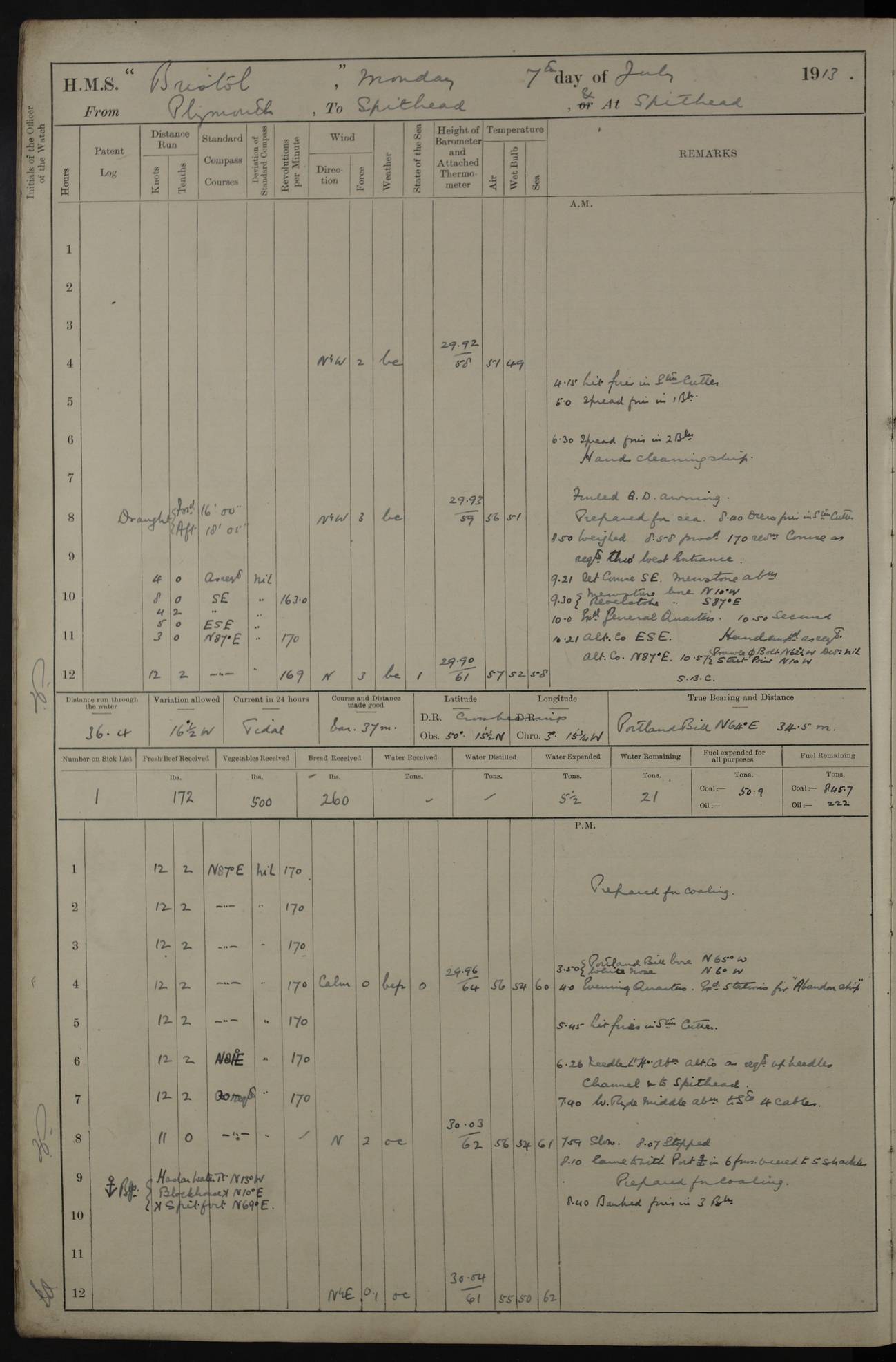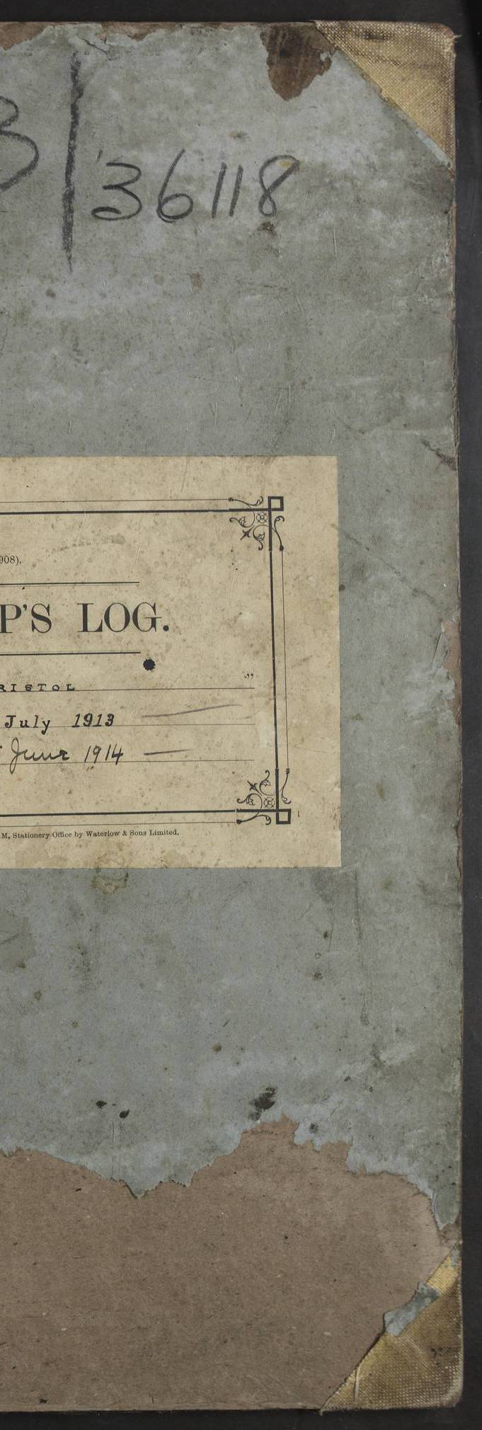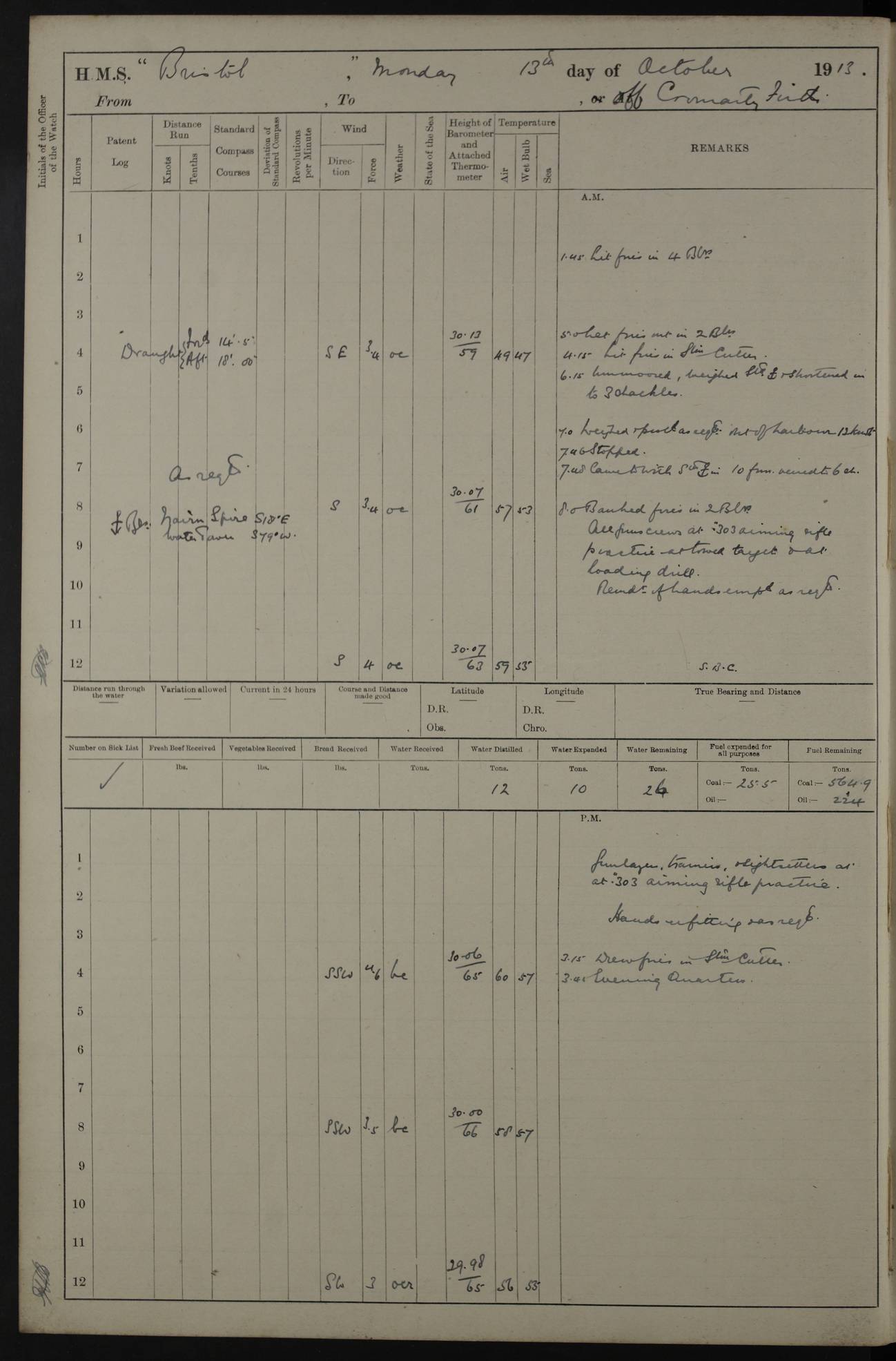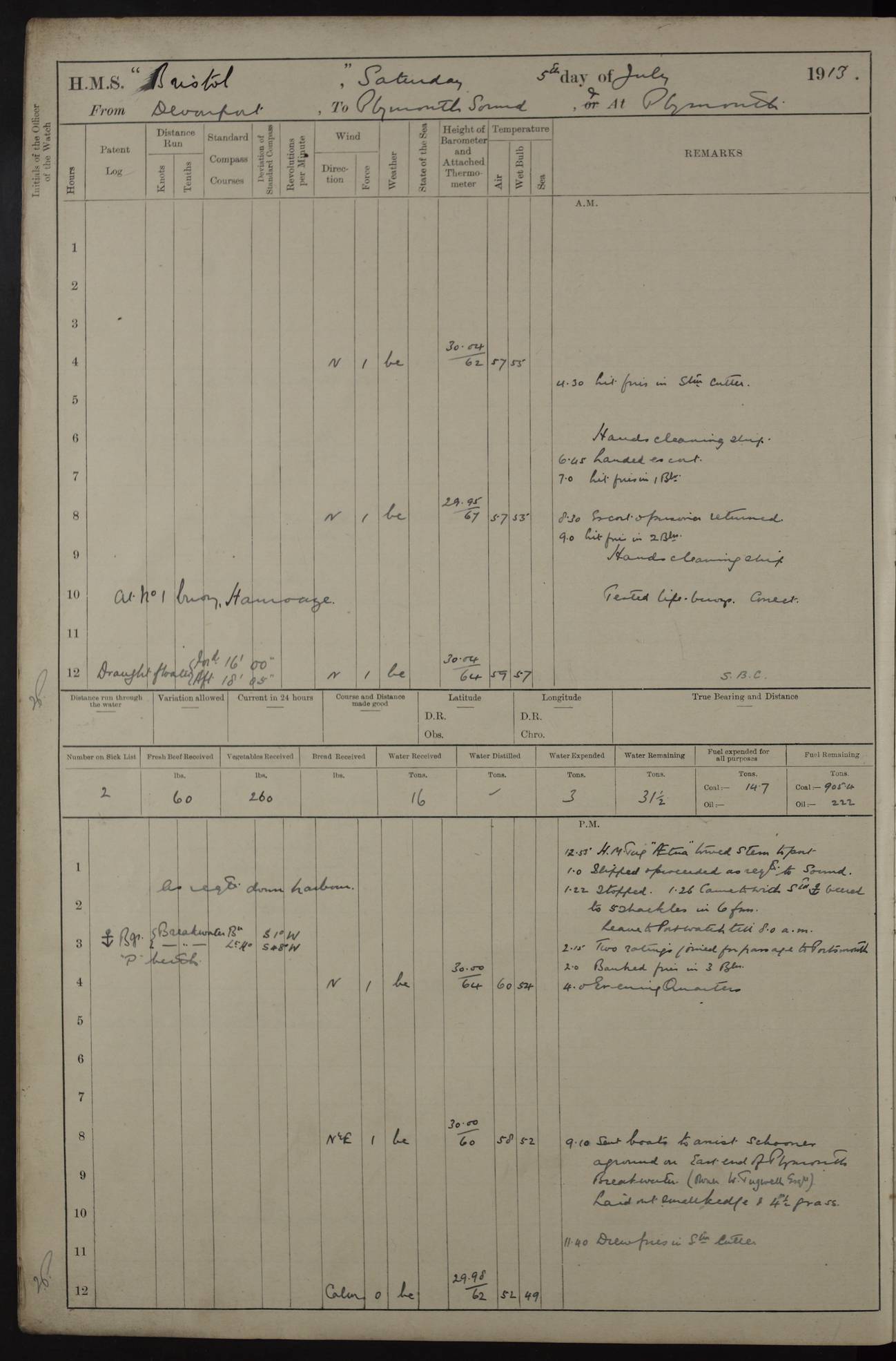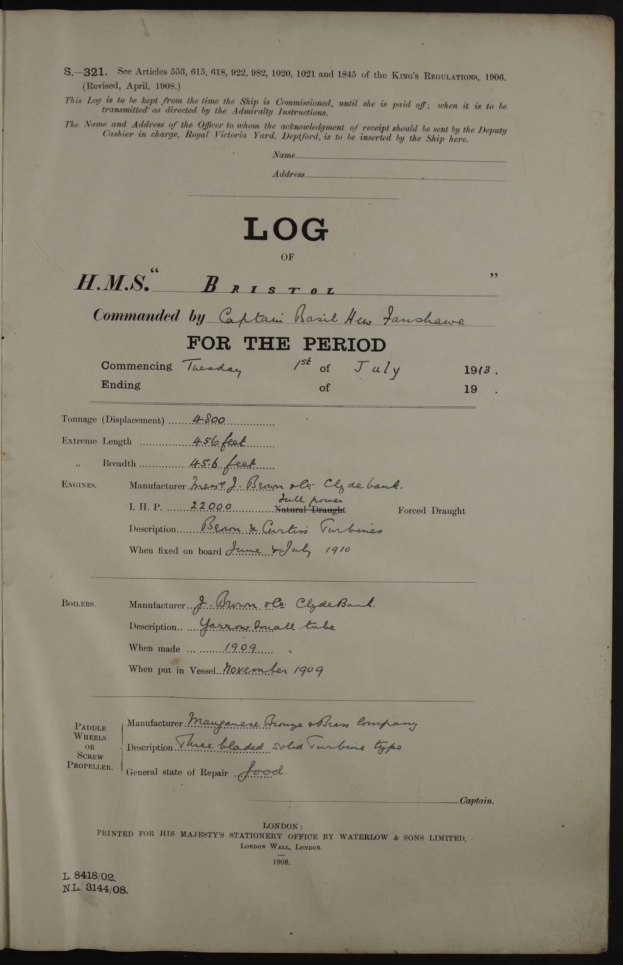 (Maps prepared using Journey Plotter, developed by Maikel. The Plots can only be approximate. They are made by joining-up positions on successive days, and sometimes positions are not given. There will therefore be occasions when the ship appears to have travelled overland) LOG BOOK – JULY 1ST 1913 TO JUNE 21ST 1914 4ef4f40ce53e0a0c91001323: (https://s3.amazonaws.com:443/oldweather/ADM53-36118/0001_0.jpg) 4ef4f40ce53e0a0c91001324: (https://s3.amazonaws.com:443/oldweather/ADM53-36118/0001_1.jpg) 4ef4f40de53e0a0c91001325: (https://s3.amazonaws.com:443/oldweather/ADM53-36118/0002_0.jpg) 4ef4f40de53e0a0c91001326: (https://s3.amazonaws.com:443/oldweather/ADM53-36118/0002_1.jpg) 4ef4f40de53e0a0c91001327: (https://s3.amazonaws.com:443/oldweather/ADM53-36118/0003_0.jpg) 4ef4f40de53e0a0c91001328: (https://s3.amazonaws.com:443/oldweather/ADM53-36118/0003_1.jpg) 4ef4f40de53e0a0c91001329: (https://s3.amazonaws.com:443/oldweather/ADM53-36118/0004_0.jpg) 4ef4f40de53e0a0c9100132a: (https://s3.amazonaws.com:443/oldweather/ADM53-36118/0004_1.jpg) LOG OF H.M.S. BRISTOL Commanded by Captain Basil Hew Fanshawe FOR THE PERIOD Commencing 1st of July 1913 Ending 21st of June 1914 Followed by her technical detail 4ef4f40de53e0a0c9100132b: (https://s3.amazonaws.com:443/oldweather/ADM53-36118/0005_0.jpg) Directions 4ef4f40de53e0a0c9100132c: (https://s3.amazonaws.com:443/oldweather/ADM53-36118/0005_1.jpg) Establishment of Ship’s Company: Full Commission: Officers: 18. Seamen: 111. Boys: 13. Marines: 28. Engine-room establishment: 168. Other non-executive ratings: 43. Total: 381 Active Commision: Officers: 14. Seamen: 53. Boys: 0. Marines: 17. Engine-room establishment: 64. Other non-executive ratings: 27. Total 175 Armament: Forecastle: 1 6” B.L. PV* Quarterdeck: 1 6” B.L. PV* Starboard waist: 5 4” B.L. PIV* Port waist: 5 4” B.L. PIV* 4 3 pounder for Saluting purpose, 2 in each battery Torpedo Two 18” submerged tubes Boats: 1 30 feet Steam Cutter 1 34 feet Cutter 2 30 feet Cutters 1 30 feet Gig 3 27 feet Whalers 2 18 feet Skiffs