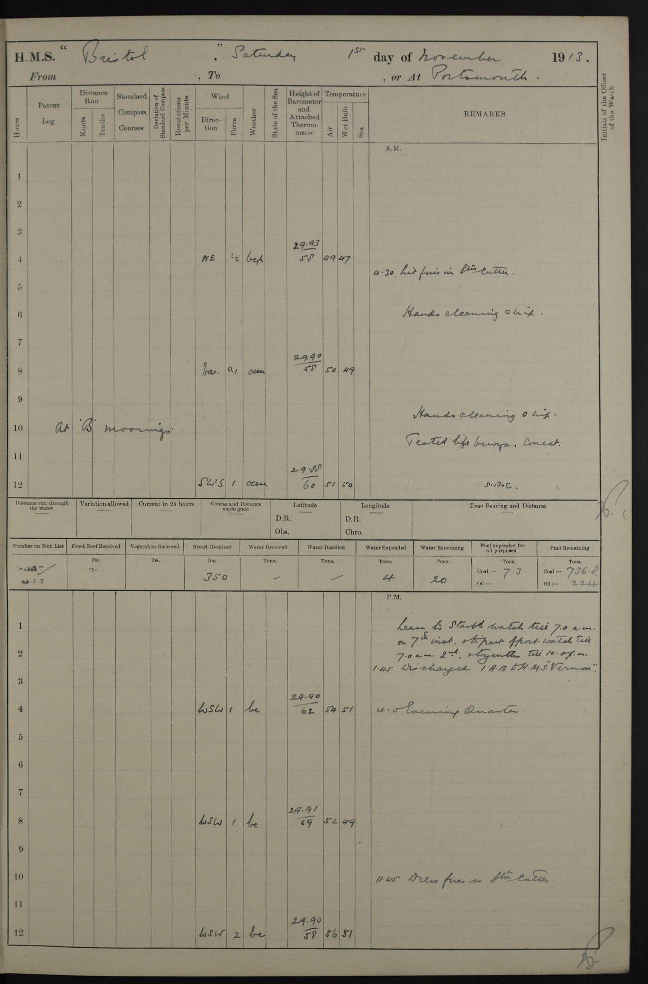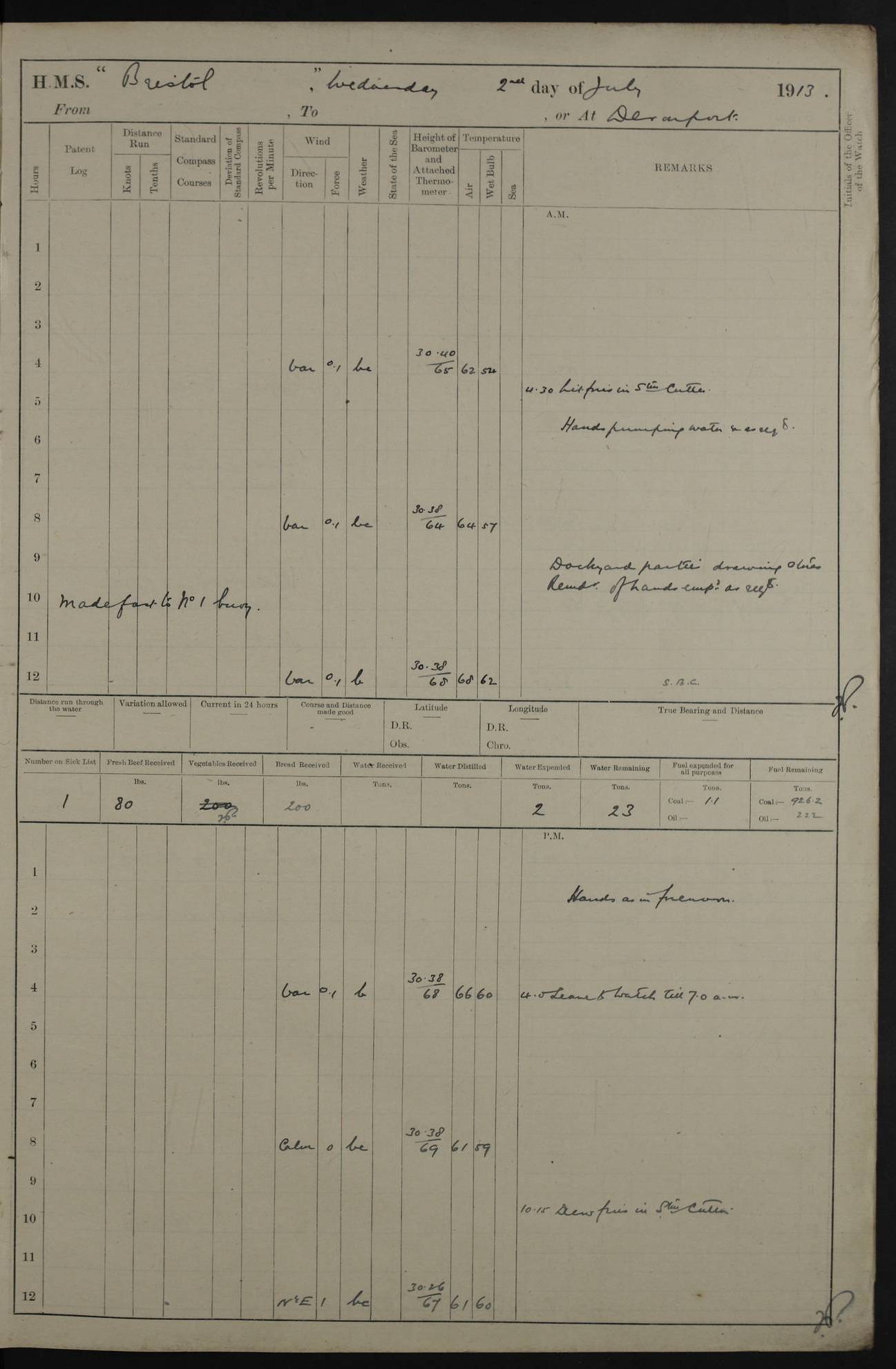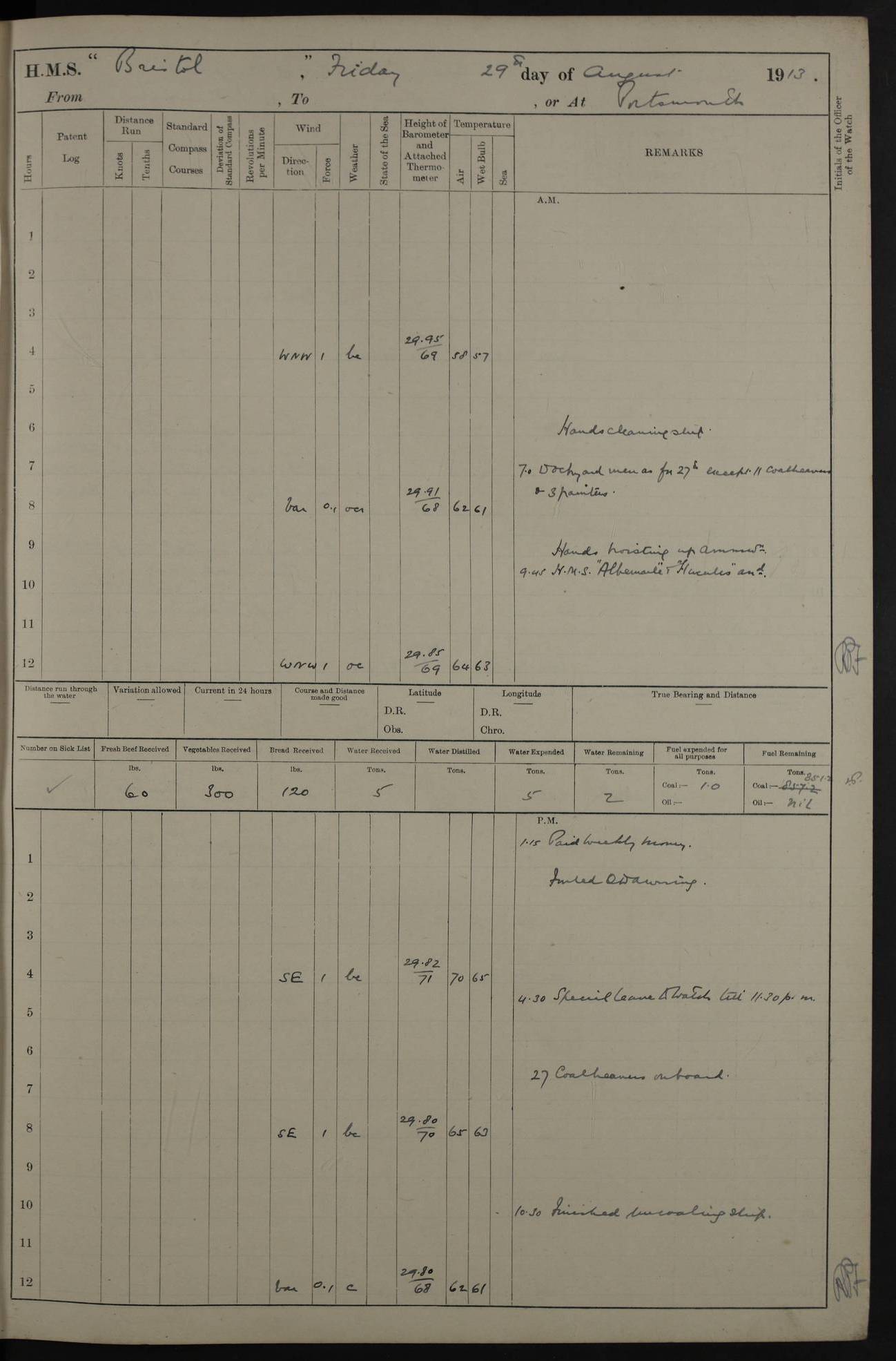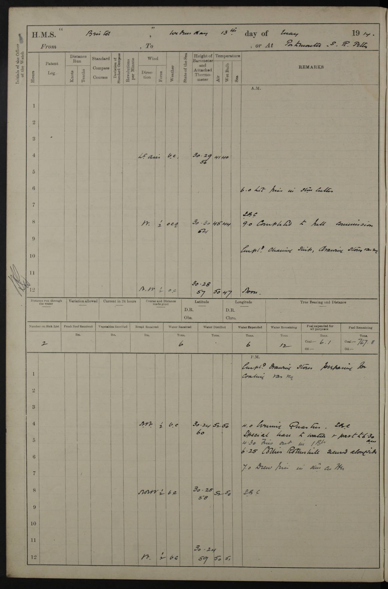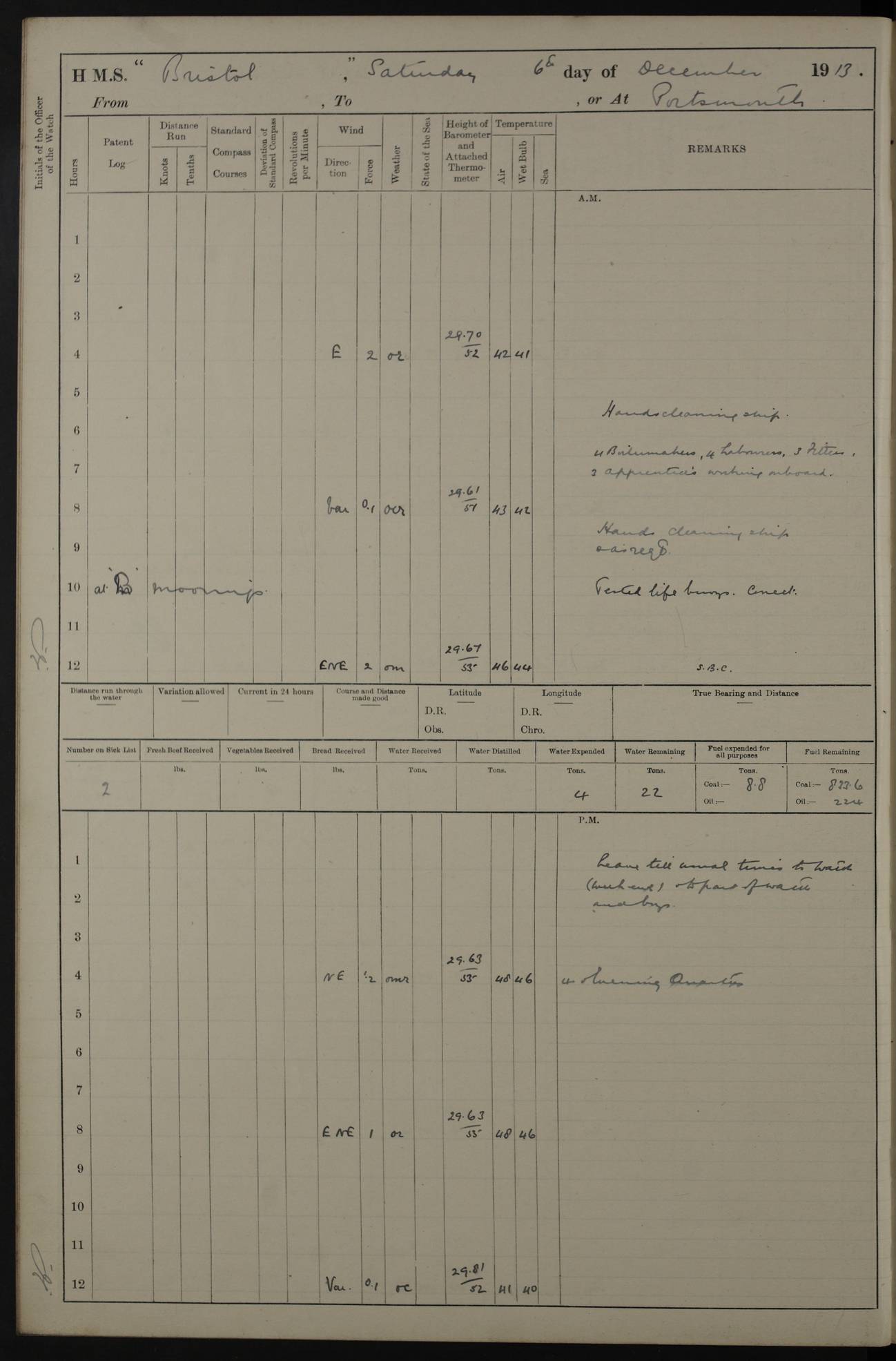 (Maps prepared using Journey Plotter, developed by Maikel. The Plots can only be approximate. They are made by joining-up positions on successive days, and sometimes positions are not given. There will therefore be occasions when the ship appears to have travelled overland) LOG BOOK – JULY 1ST 1913 TO JUNE 21ST 1914 4ef4f40ce53e0a0c91001323: (https://s3.amazonaws.com:443/oldweather/ADM53-36118/0001_0.jpg) 4ef4f40ce53e0a0c91001324: (https://s3.amazonaws.com:443/oldweather/ADM53-36118/0001_1.jpg) 4ef4f40de53e0a0c91001325: (https://s3.amazonaws.com:443/oldweather/ADM53-36118/0002_0.jpg) 4ef4f40de53e0a0c91001326: (https://s3.amazonaws.com:443/oldweather/ADM53-36118/0002_1.jpg) 4ef4f40de53e0a0c91001327: (https://s3.amazonaws.com:443/oldweather/ADM53-36118/0003_0.jpg) 4ef4f40de53e0a0c91001328: (https://s3.amazonaws.com:443/oldweather/ADM53-36118/0003_1.jpg) 4ef4f40de53e0a0c91001329: (https://s3.amazonaws.com:443/oldweather/ADM53-36118/0004_0.jpg) 4ef4f40de53e0a0c9100132a: (https://s3.amazonaws.com:443/oldweather/ADM53-36118/0004_1.jpg) LOG OF H.M.S. BRISTOL Commanded by Captain Basil Hew Fanshawe FOR THE PERIOD Commencing 1st of July 1913 Ending 21st of June 1914 Followed by her technical detail 4ef4f40de53e0a0c9100132b: (https://s3.amazonaws.com:443/oldweather/ADM53-36118/0005_0.jpg) Directions 4ef4f40de53e0a0c9100132c: (https://s3.amazonaws.com:443/oldweather/ADM53-36118/0005_1.jpg) Establishment of Ship’s Company: Full Commission: Officers: 18. Seamen: 111. Boys: 13. Marines: 28. Engine-room establishment: 168. Other non-executive ratings: 43. Total: 381 Active Commision: Officers: 14. Seamen: 53. Boys: 0. Marines: 17. Engine-room establishment: 64. Other non-executive ratings: 27. Total 175 Armament: Forecastle: 1 6” B.L. PV* Quarterdeck: 1 6” B.L. PV* Starboard waist: 5 4” B.L. PIV* Port waist: 5 4” B.L. PIV* 4 3 pounder for Saluting purpose, 2 in each battery Torpedo Two 18” submerged tubes Boats: 1 30 feet Steam Cutter 1 34 feet Cutter 2 30 feet Cutters 1 30 feet Gig 3 27 feet Whalers 2 18 feet Skiffs