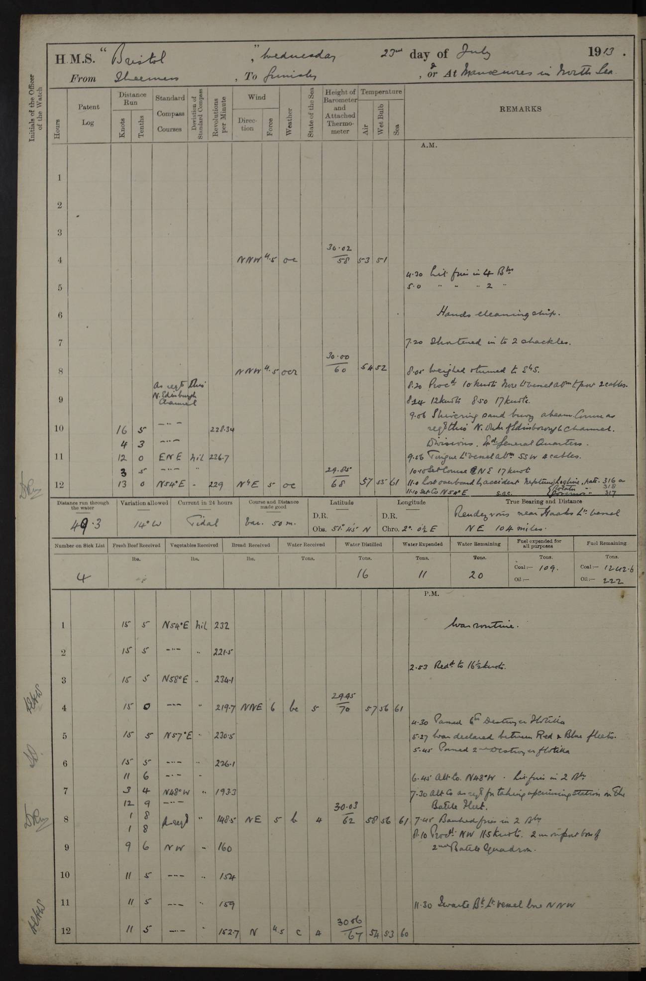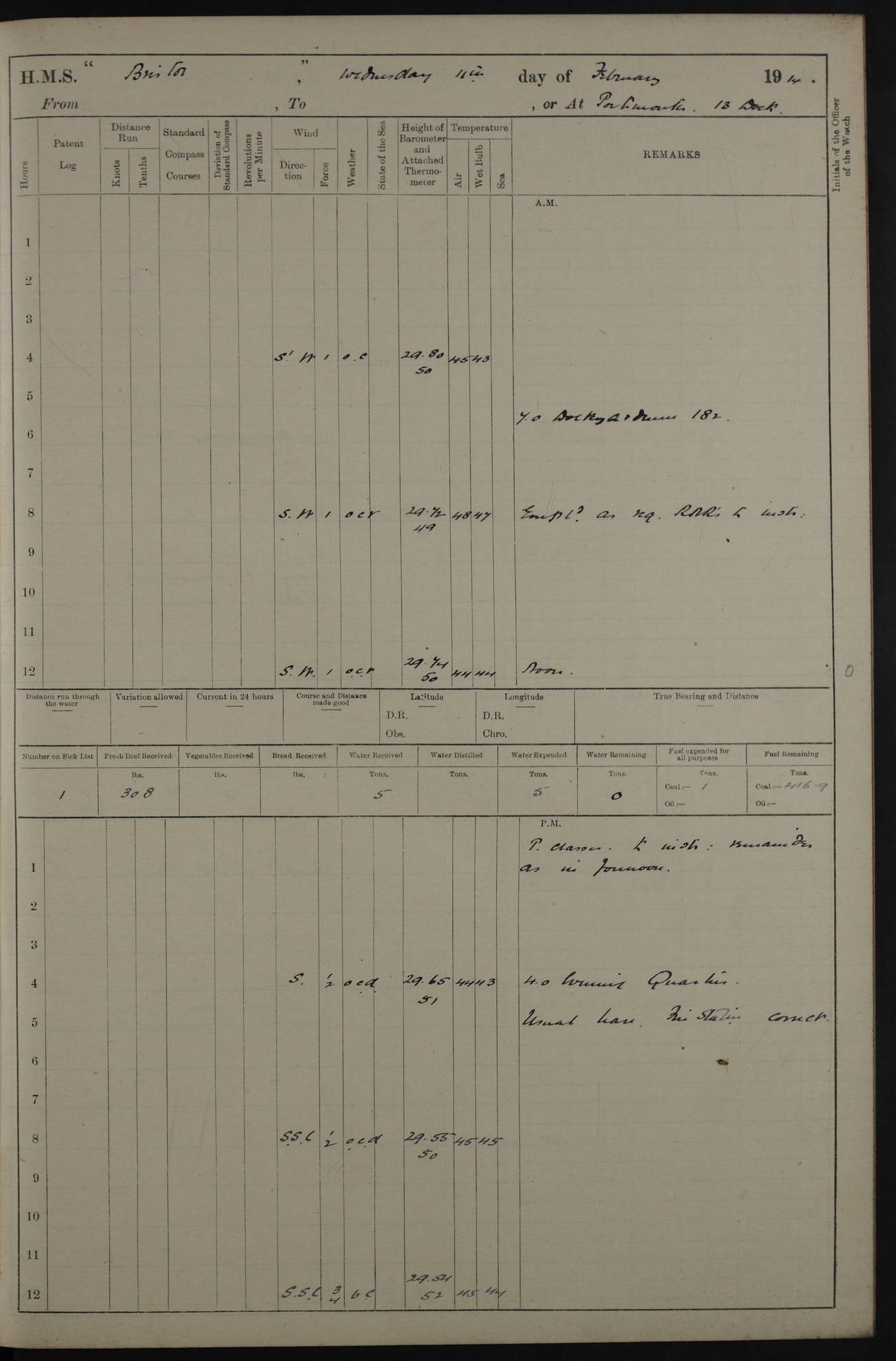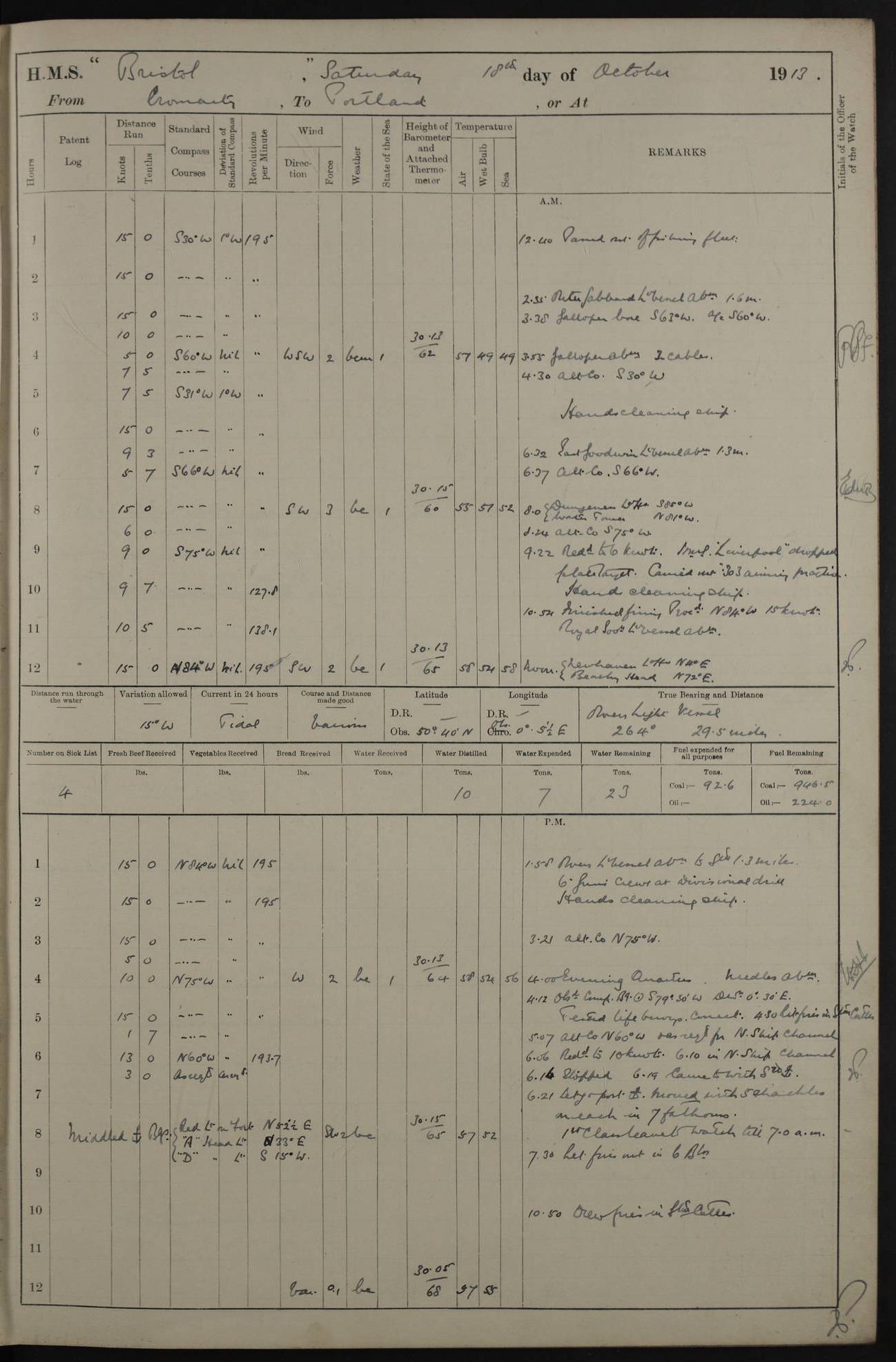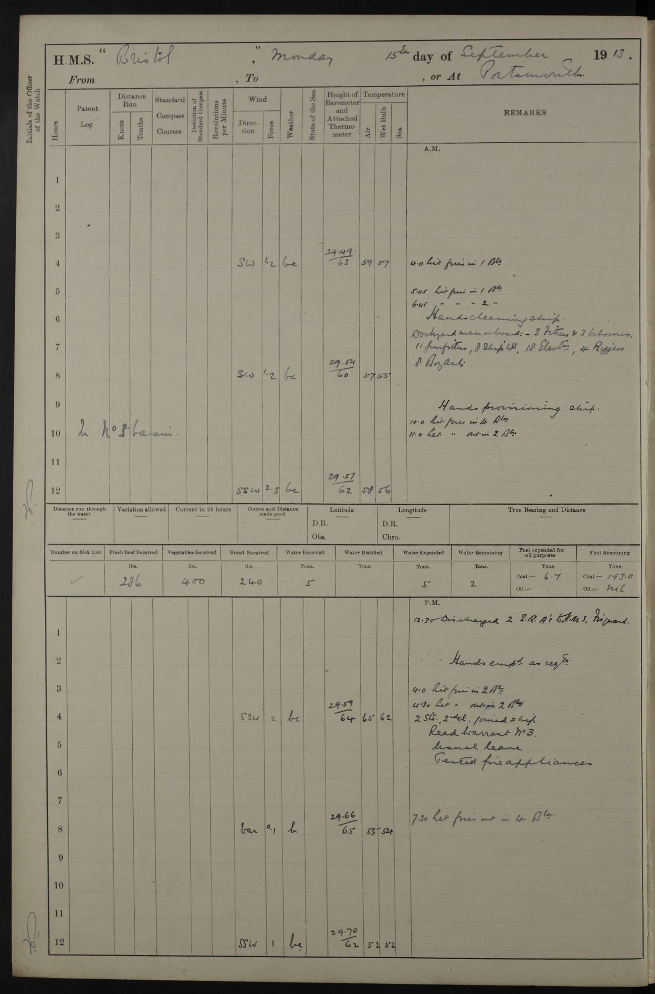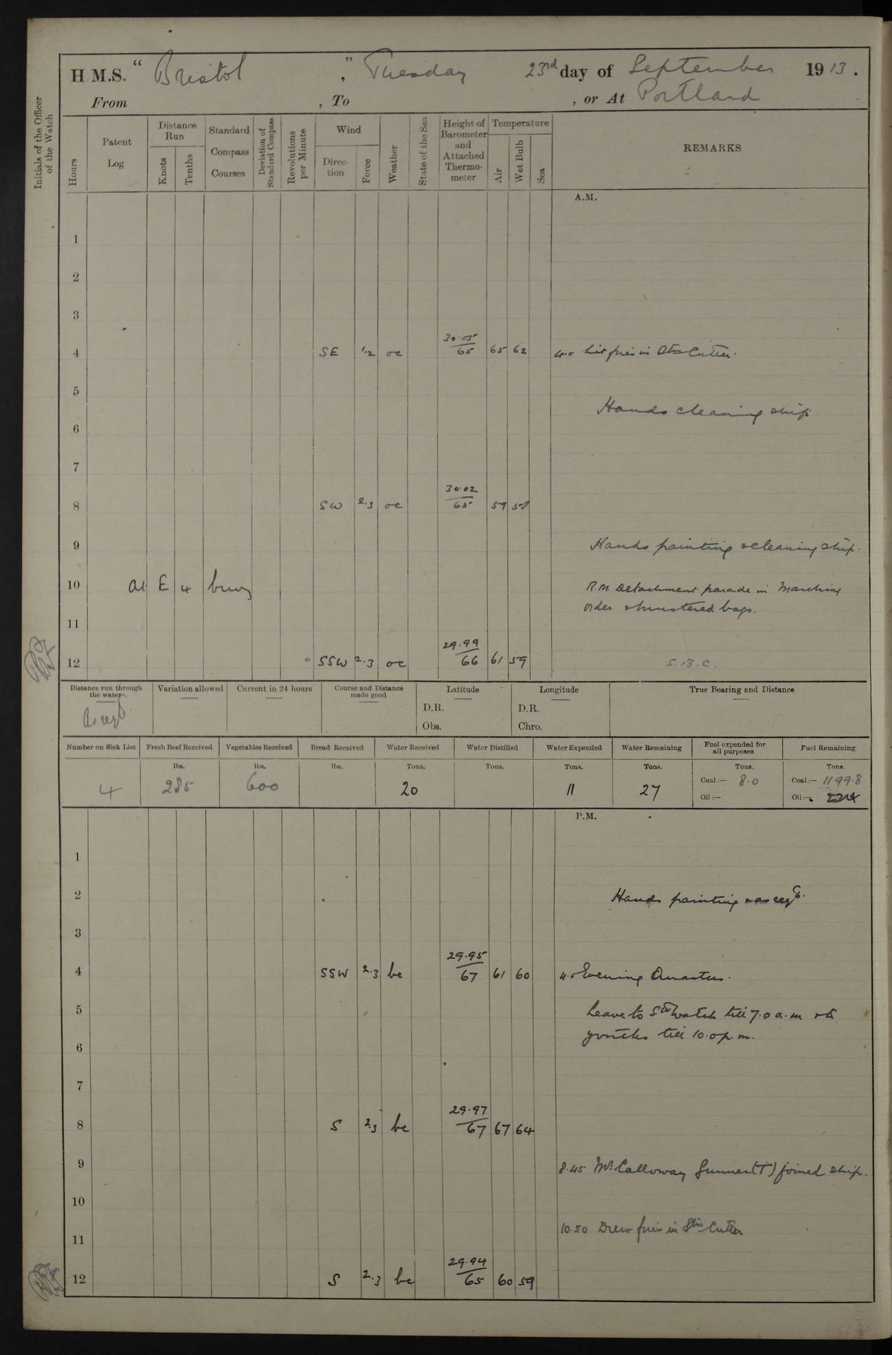 (Maps prepared using Journey Plotter, developed by Maikel. The Plots can only be approximate. They are made by joining-up positions on successive days, and sometimes positions are not given. There will therefore be occasions when the ship appears to have travelled overland) LOG BOOK – JULY 1ST 1913 TO JUNE 21ST 1914 4ef4f40ce53e0a0c91001323: (https://s3.amazonaws.com:443/oldweather/ADM53-36118/0001_0.jpg) 4ef4f40ce53e0a0c91001324: (https://s3.amazonaws.com:443/oldweather/ADM53-36118/0001_1.jpg) 4ef4f40de53e0a0c91001325: (https://s3.amazonaws.com:443/oldweather/ADM53-36118/0002_0.jpg) 4ef4f40de53e0a0c91001326: (https://s3.amazonaws.com:443/oldweather/ADM53-36118/0002_1.jpg) 4ef4f40de53e0a0c91001327: (https://s3.amazonaws.com:443/oldweather/ADM53-36118/0003_0.jpg) 4ef4f40de53e0a0c91001328: (https://s3.amazonaws.com:443/oldweather/ADM53-36118/0003_1.jpg) 4ef4f40de53e0a0c91001329: (https://s3.amazonaws.com:443/oldweather/ADM53-36118/0004_0.jpg) 4ef4f40de53e0a0c9100132a: (https://s3.amazonaws.com:443/oldweather/ADM53-36118/0004_1.jpg) LOG OF H.M.S. BRISTOL Commanded by Captain Basil Hew Fanshawe FOR THE PERIOD Commencing 1st of July 1913 Ending 21st of June 1914 Followed by her technical detail 4ef4f40de53e0a0c9100132b: (https://s3.amazonaws.com:443/oldweather/ADM53-36118/0005_0.jpg) Directions 4ef4f40de53e0a0c9100132c: (https://s3.amazonaws.com:443/oldweather/ADM53-36118/0005_1.jpg) Establishment of Ship’s Company: Full Commission: Officers: 18. Seamen: 111. Boys: 13. Marines: 28. Engine-room establishment: 168. Other non-executive ratings: 43. Total: 381 Active Commision: Officers: 14. Seamen: 53. Boys: 0. Marines: 17. Engine-room establishment: 64. Other non-executive ratings: 27. Total 175 Armament: Forecastle: 1 6” B.L. PV* Quarterdeck: 1 6” B.L. PV* Starboard waist: 5 4” B.L. PIV* Port waist: 5 4” B.L. PIV* 4 3 pounder for Saluting purpose, 2 in each battery Torpedo Two 18” submerged tubes Boats: 1 30 feet Steam Cutter 1 34 feet Cutter 2 30 feet Cutters 1 30 feet Gig 3 27 feet Whalers 2 18 feet Skiffs