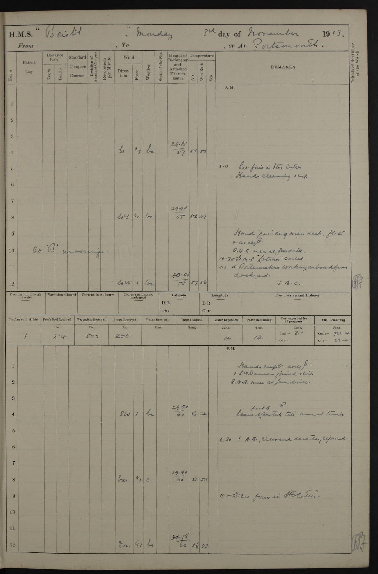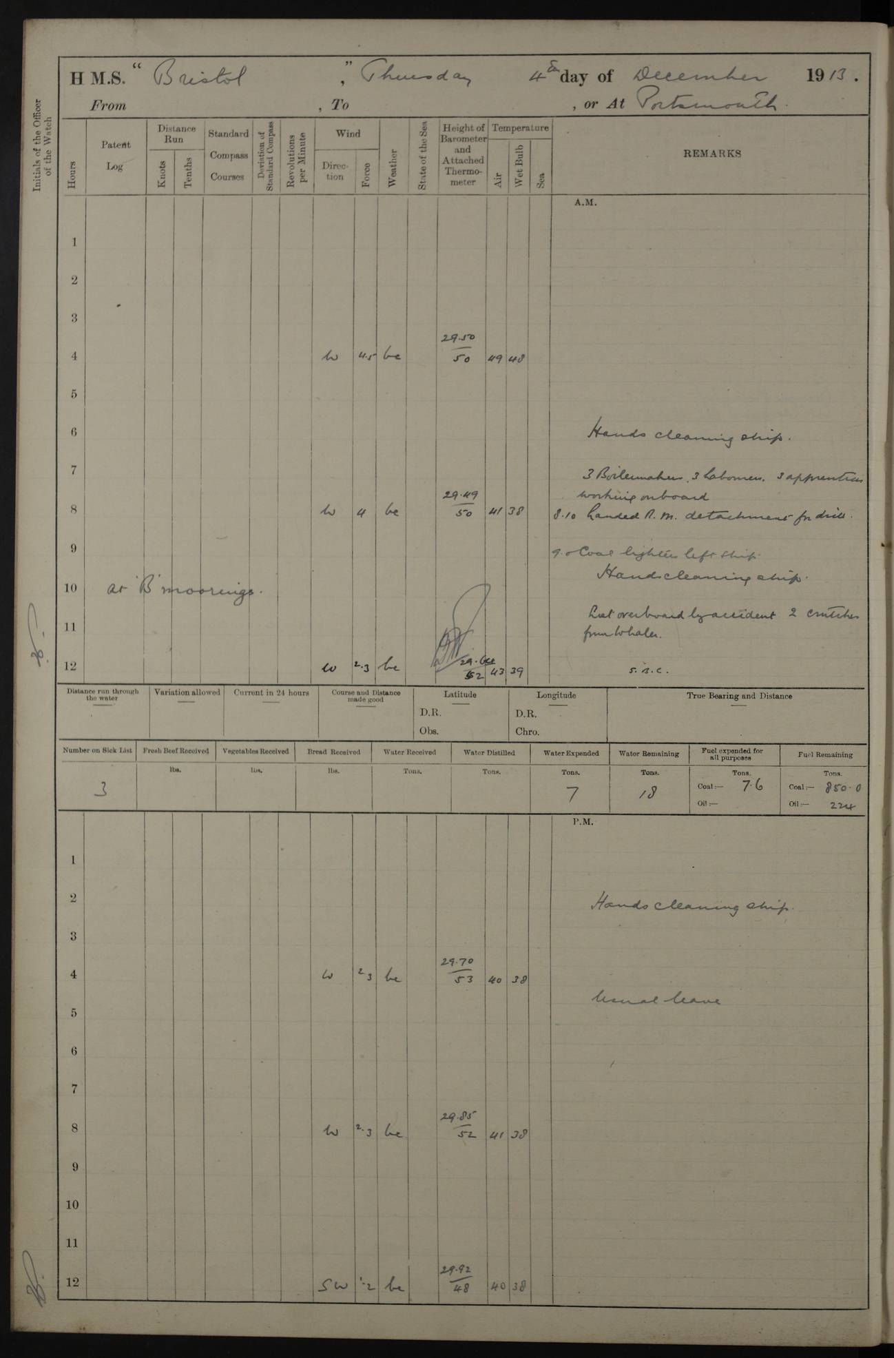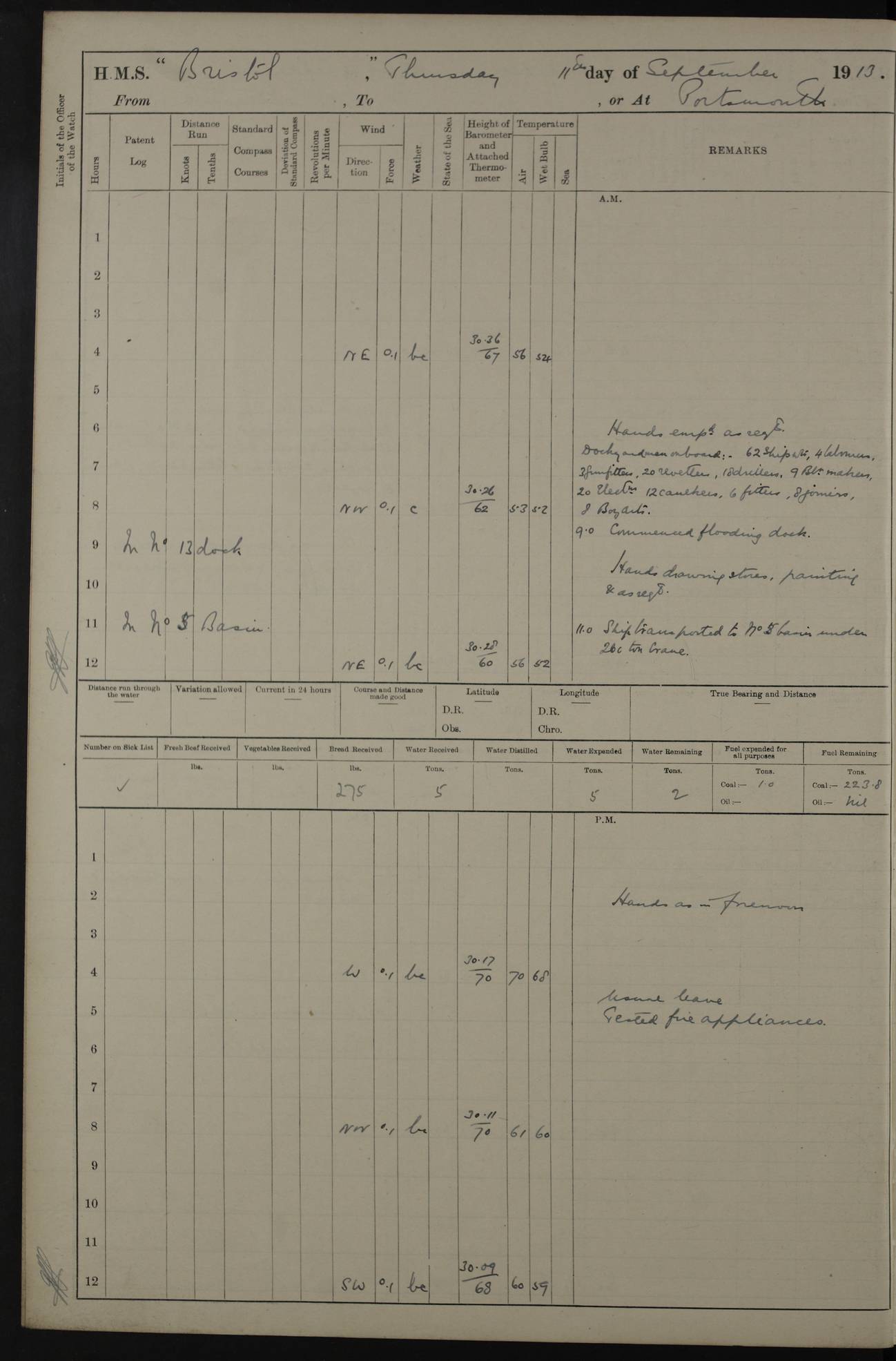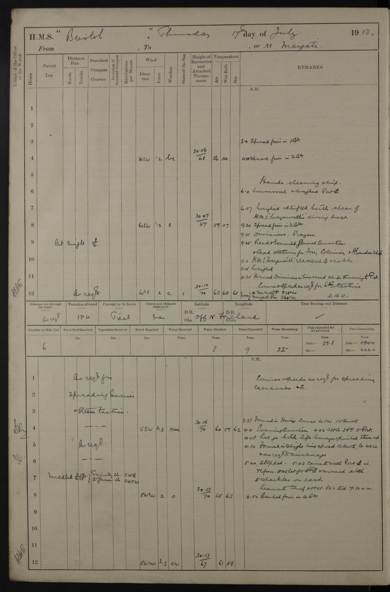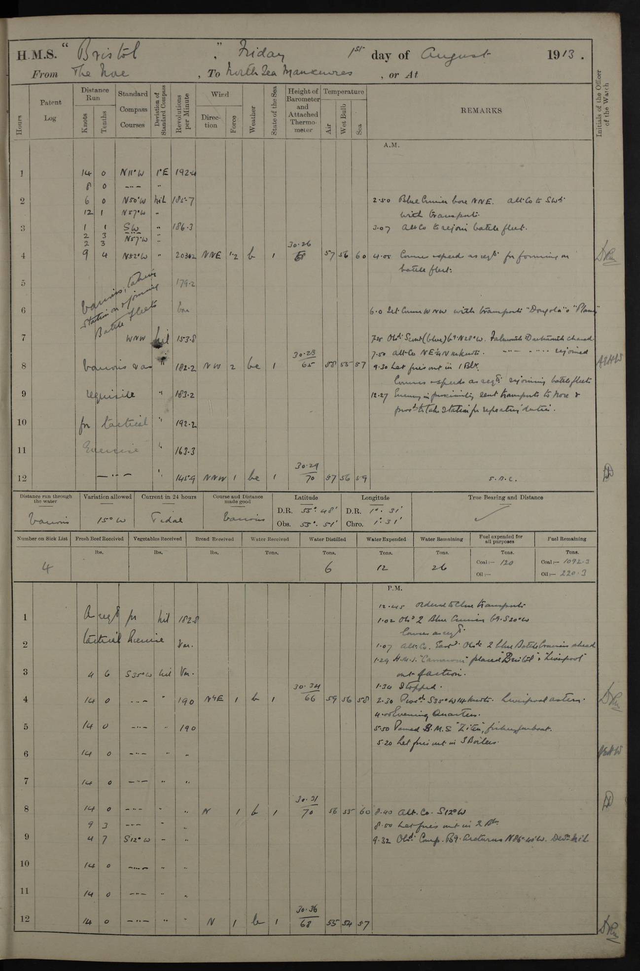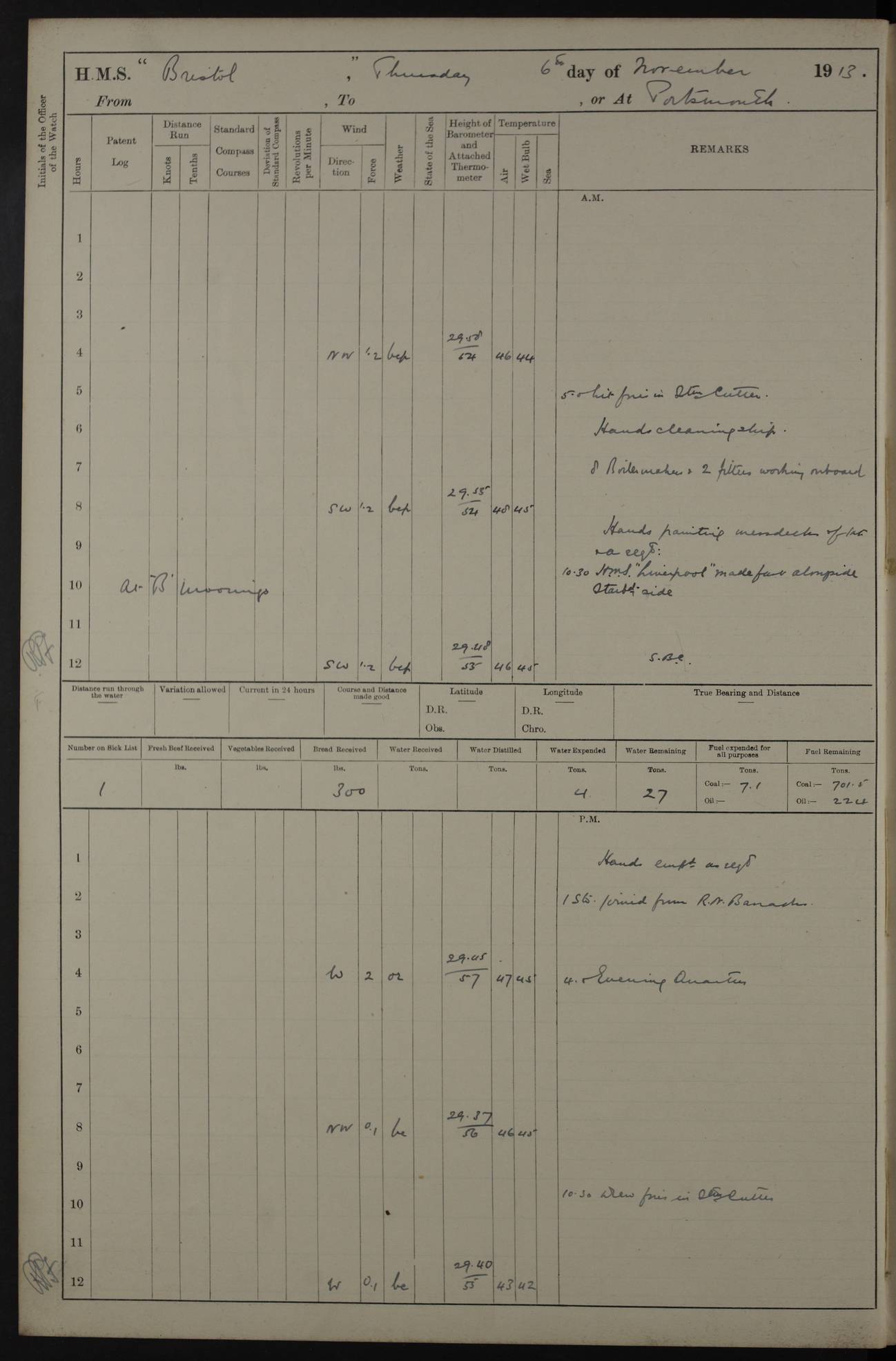 (Maps prepared using Journey Plotter, developed by Maikel. The Plots can only be approximate. They are made by joining-up positions on successive days, and sometimes positions are not given. There will therefore be occasions when the ship appears to have travelled overland) LOG BOOK – JULY 1ST 1913 TO JUNE 21ST 1914 4ef4f40ce53e0a0c91001323: (https://s3.amazonaws.com:443/oldweather/ADM53-36118/0001_0.jpg) 4ef4f40ce53e0a0c91001324: (https://s3.amazonaws.com:443/oldweather/ADM53-36118/0001_1.jpg) 4ef4f40de53e0a0c91001325: (https://s3.amazonaws.com:443/oldweather/ADM53-36118/0002_0.jpg) 4ef4f40de53e0a0c91001326: (https://s3.amazonaws.com:443/oldweather/ADM53-36118/0002_1.jpg) 4ef4f40de53e0a0c91001327: (https://s3.amazonaws.com:443/oldweather/ADM53-36118/0003_0.jpg) 4ef4f40de53e0a0c91001328: (https://s3.amazonaws.com:443/oldweather/ADM53-36118/0003_1.jpg) 4ef4f40de53e0a0c91001329: (https://s3.amazonaws.com:443/oldweather/ADM53-36118/0004_0.jpg) 4ef4f40de53e0a0c9100132a: (https://s3.amazonaws.com:443/oldweather/ADM53-36118/0004_1.jpg) LOG OF H.M.S. BRISTOL Commanded by Captain Basil Hew Fanshawe FOR THE PERIOD Commencing 1st of July 1913 Ending 21st of June 1914 Followed by her technical detail 4ef4f40de53e0a0c9100132b: (https://s3.amazonaws.com:443/oldweather/ADM53-36118/0005_0.jpg) Directions 4ef4f40de53e0a0c9100132c: (https://s3.amazonaws.com:443/oldweather/ADM53-36118/0005_1.jpg) Establishment of Ship’s Company: Full Commission: Officers: 18. Seamen: 111. Boys: 13. Marines: 28. Engine-room establishment: 168. Other non-executive ratings: 43. Total: 381 Active Commision: Officers: 14. Seamen: 53. Boys: 0. Marines: 17. Engine-room establishment: 64. Other non-executive ratings: 27. Total 175 Armament: Forecastle: 1 6” B.L. PV* Quarterdeck: 1 6” B.L. PV* Starboard waist: 5 4” B.L. PIV* Port waist: 5 4” B.L. PIV* 4 3 pounder for Saluting purpose, 2 in each battery Torpedo Two 18” submerged tubes Boats: 1 30 feet Steam Cutter 1 34 feet Cutter 2 30 feet Cutters 1 30 feet Gig 3 27 feet Whalers 2 18 feet Skiffs