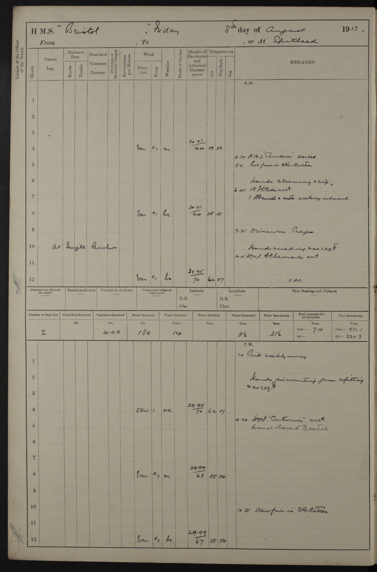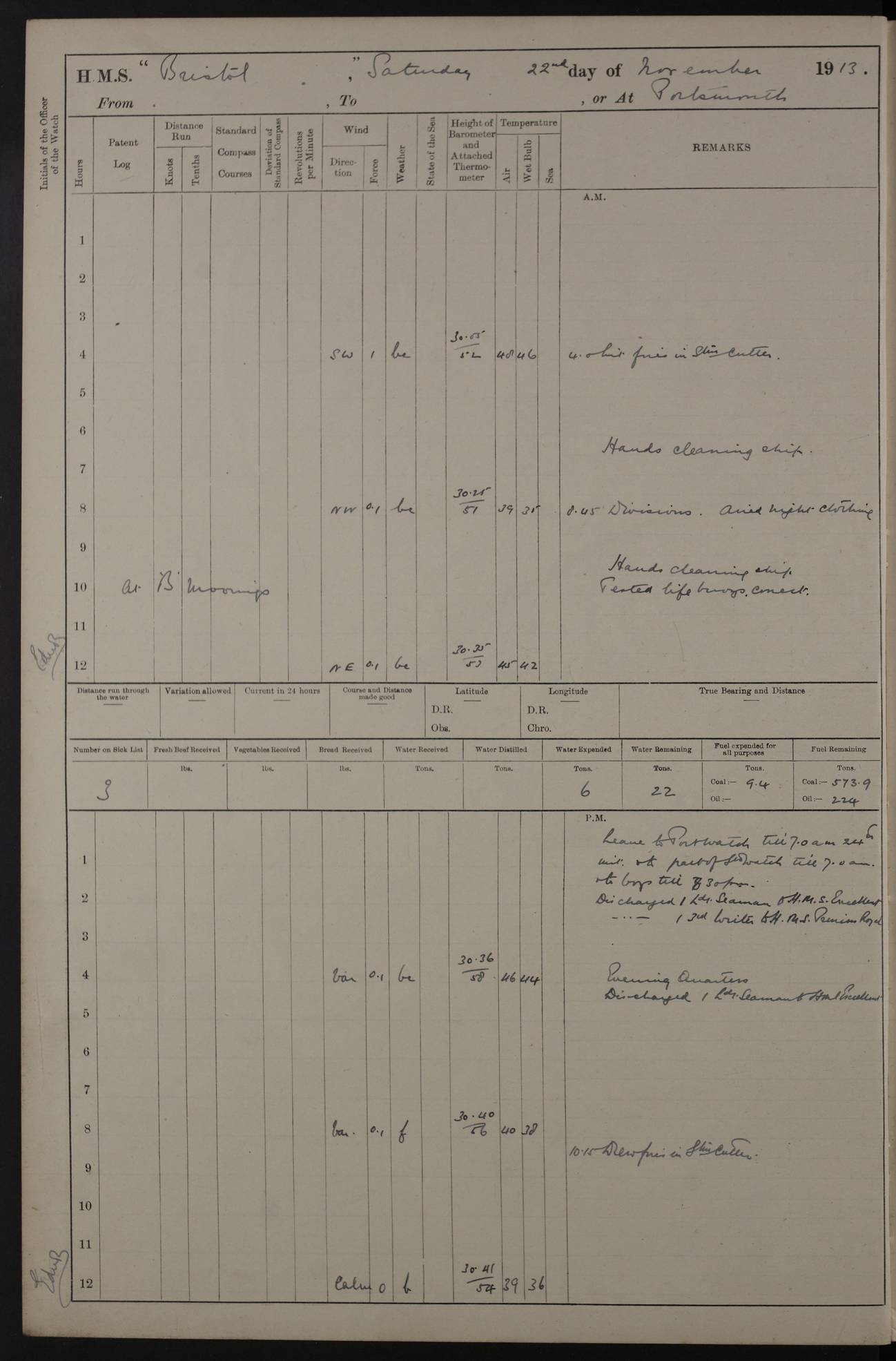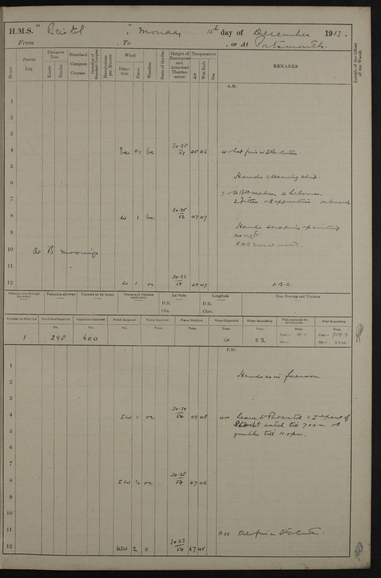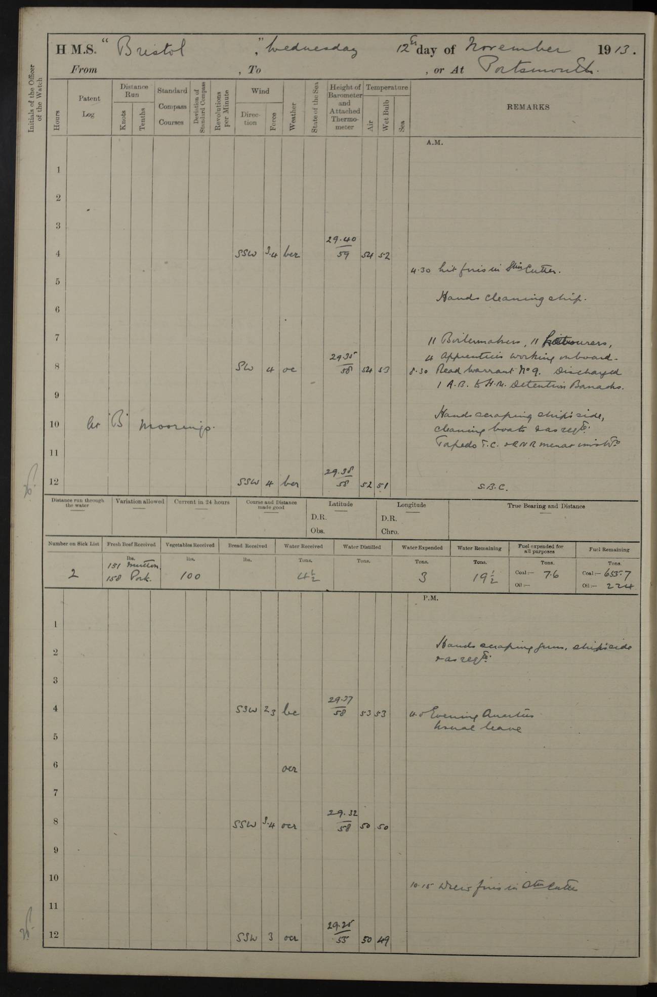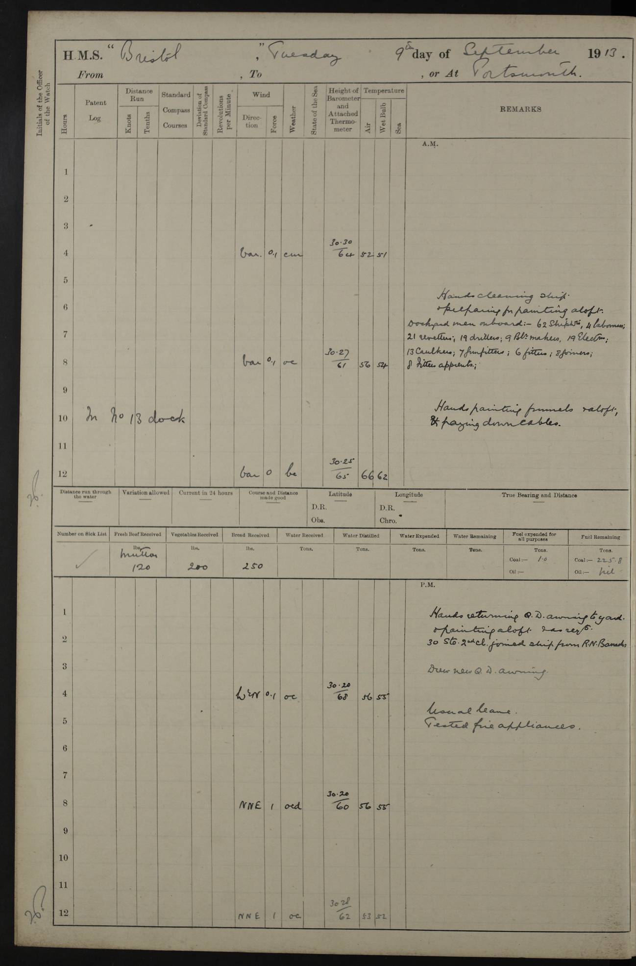 (Maps prepared using Journey Plotter, developed by Maikel. The Plots can only be approximate. They are made by joining-up positions on successive days, and sometimes positions are not given. There will therefore be occasions when the ship appears to have travelled overland) LOG BOOK – JULY 1ST 1913 TO JUNE 21ST 1914 4ef4f40ce53e0a0c91001323: (https://s3.amazonaws.com:443/oldweather/ADM53-36118/0001_0.jpg) 4ef4f40ce53e0a0c91001324: (https://s3.amazonaws.com:443/oldweather/ADM53-36118/0001_1.jpg) 4ef4f40de53e0a0c91001325: (https://s3.amazonaws.com:443/oldweather/ADM53-36118/0002_0.jpg) 4ef4f40de53e0a0c91001326: (https://s3.amazonaws.com:443/oldweather/ADM53-36118/0002_1.jpg) 4ef4f40de53e0a0c91001327: (https://s3.amazonaws.com:443/oldweather/ADM53-36118/0003_0.jpg) 4ef4f40de53e0a0c91001328: (https://s3.amazonaws.com:443/oldweather/ADM53-36118/0003_1.jpg) 4ef4f40de53e0a0c91001329: (https://s3.amazonaws.com:443/oldweather/ADM53-36118/0004_0.jpg) 4ef4f40de53e0a0c9100132a: (https://s3.amazonaws.com:443/oldweather/ADM53-36118/0004_1.jpg) LOG OF H.M.S. BRISTOL Commanded by Captain Basil Hew Fanshawe FOR THE PERIOD Commencing 1st of July 1913 Ending 21st of June 1914 Followed by her technical detail 4ef4f40de53e0a0c9100132b: (https://s3.amazonaws.com:443/oldweather/ADM53-36118/0005_0.jpg) Directions 4ef4f40de53e0a0c9100132c: (https://s3.amazonaws.com:443/oldweather/ADM53-36118/0005_1.jpg) Establishment of Ship’s Company: Full Commission: Officers: 18. Seamen: 111. Boys: 13. Marines: 28. Engine-room establishment: 168. Other non-executive ratings: 43. Total: 381 Active Commision: Officers: 14. Seamen: 53. Boys: 0. Marines: 17. Engine-room establishment: 64. Other non-executive ratings: 27. Total 175 Armament: Forecastle: 1 6” B.L. PV* Quarterdeck: 1 6” B.L. PV* Starboard waist: 5 4” B.L. PIV* Port waist: 5 4” B.L. PIV* 4 3 pounder for Saluting purpose, 2 in each battery Torpedo Two 18” submerged tubes Boats: 1 30 feet Steam Cutter 1 34 feet Cutter 2 30 feet Cutters 1 30 feet Gig 3 27 feet Whalers 2 18 feet Skiffs