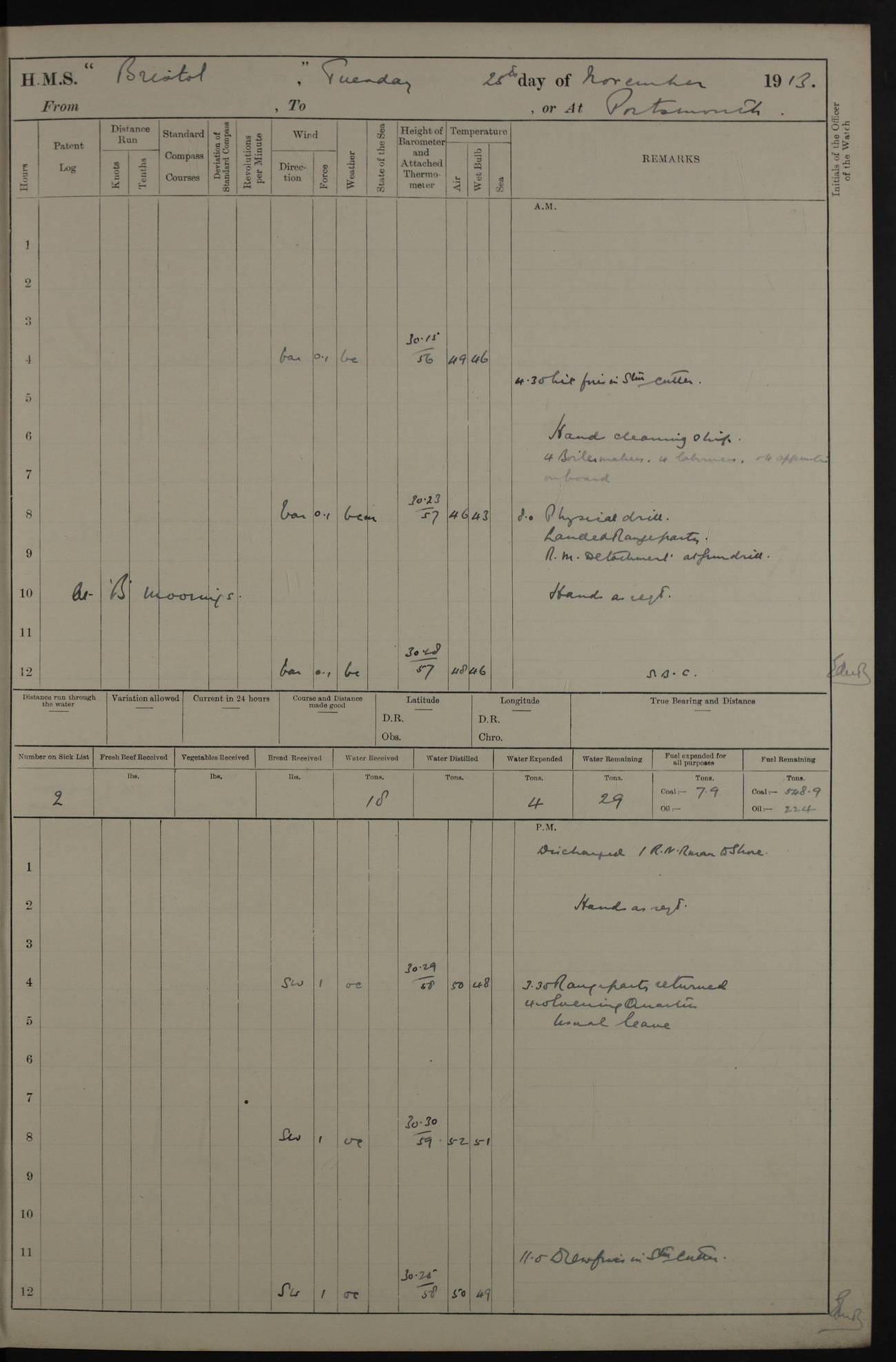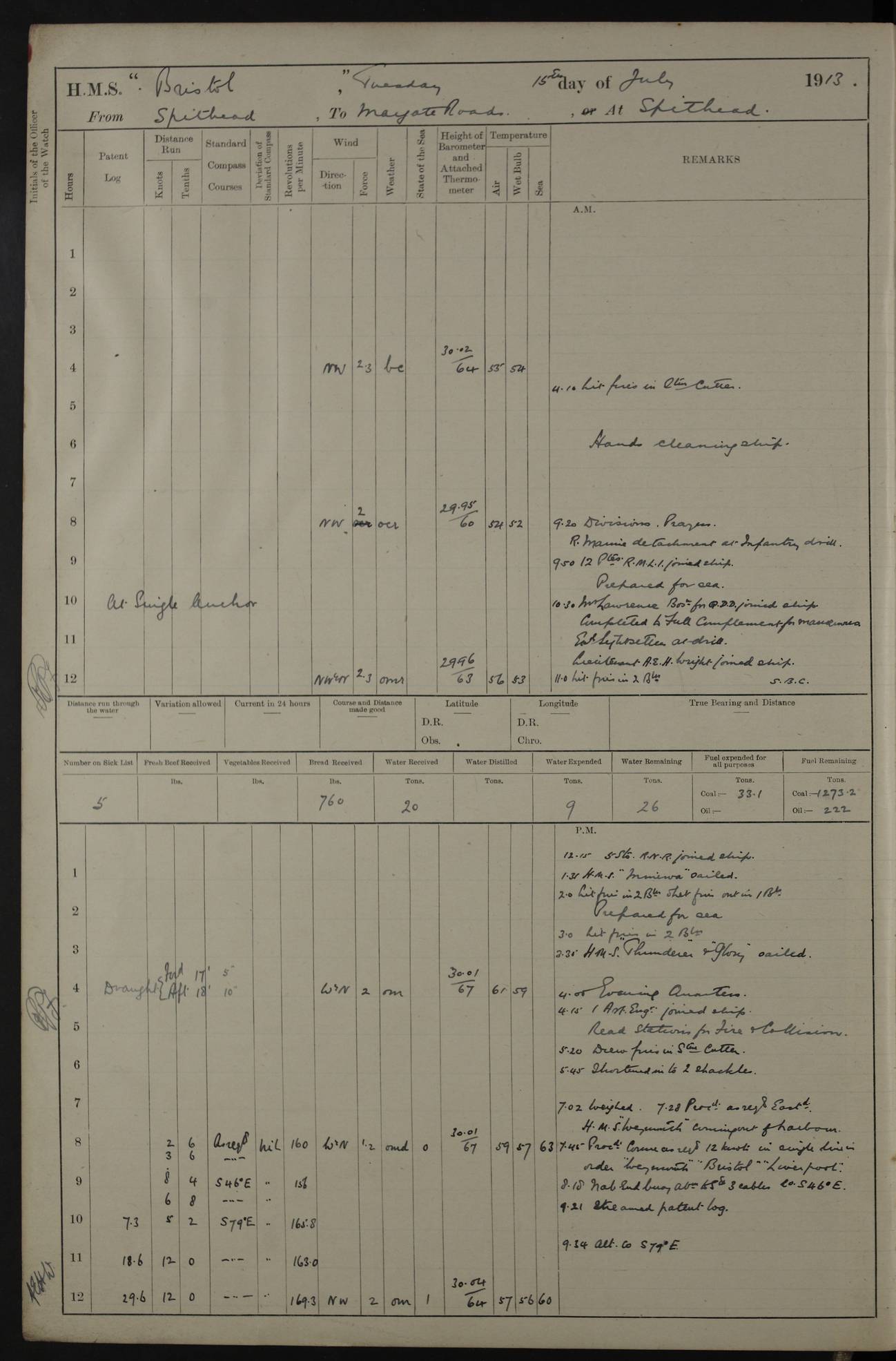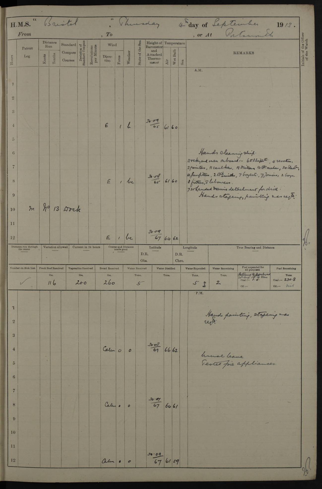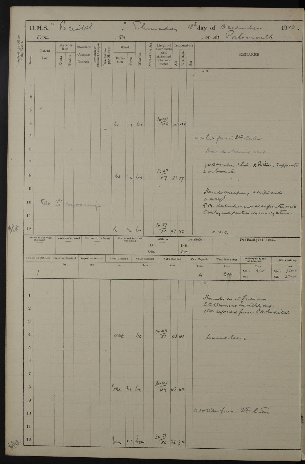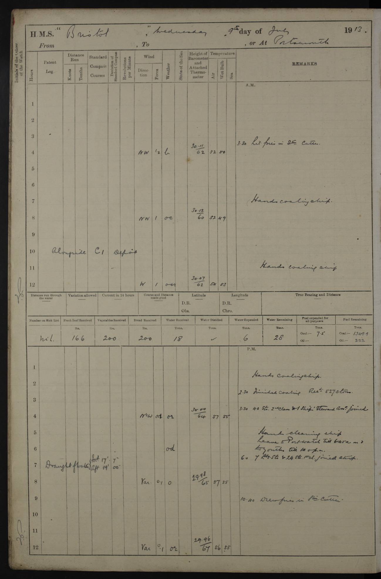 (Maps prepared using Journey Plotter, developed by Maikel. The Plots can only be approximate. They are made by joining-up positions on successive days, and sometimes positions are not given. There will therefore be occasions when the ship appears to have travelled overland) LOG BOOK – JULY 1ST 1913 TO JUNE 21ST 1914 4ef4f40ce53e0a0c91001323: (https://s3.amazonaws.com:443/oldweather/ADM53-36118/0001_0.jpg) 4ef4f40ce53e0a0c91001324: (https://s3.amazonaws.com:443/oldweather/ADM53-36118/0001_1.jpg) 4ef4f40de53e0a0c91001325: (https://s3.amazonaws.com:443/oldweather/ADM53-36118/0002_0.jpg) 4ef4f40de53e0a0c91001326: (https://s3.amazonaws.com:443/oldweather/ADM53-36118/0002_1.jpg) 4ef4f40de53e0a0c91001327: (https://s3.amazonaws.com:443/oldweather/ADM53-36118/0003_0.jpg) 4ef4f40de53e0a0c91001328: (https://s3.amazonaws.com:443/oldweather/ADM53-36118/0003_1.jpg) 4ef4f40de53e0a0c91001329: (https://s3.amazonaws.com:443/oldweather/ADM53-36118/0004_0.jpg) 4ef4f40de53e0a0c9100132a: (https://s3.amazonaws.com:443/oldweather/ADM53-36118/0004_1.jpg) LOG OF H.M.S. BRISTOL Commanded by Captain Basil Hew Fanshawe FOR THE PERIOD Commencing 1st of July 1913 Ending 21st of June 1914 Followed by her technical detail 4ef4f40de53e0a0c9100132b: (https://s3.amazonaws.com:443/oldweather/ADM53-36118/0005_0.jpg) Directions 4ef4f40de53e0a0c9100132c: (https://s3.amazonaws.com:443/oldweather/ADM53-36118/0005_1.jpg) Establishment of Ship’s Company: Full Commission: Officers: 18. Seamen: 111. Boys: 13. Marines: 28. Engine-room establishment: 168. Other non-executive ratings: 43. Total: 381 Active Commision: Officers: 14. Seamen: 53. Boys: 0. Marines: 17. Engine-room establishment: 64. Other non-executive ratings: 27. Total 175 Armament: Forecastle: 1 6” B.L. PV* Quarterdeck: 1 6” B.L. PV* Starboard waist: 5 4” B.L. PIV* Port waist: 5 4” B.L. PIV* 4 3 pounder for Saluting purpose, 2 in each battery Torpedo Two 18” submerged tubes Boats: 1 30 feet Steam Cutter 1 34 feet Cutter 2 30 feet Cutters 1 30 feet Gig 3 27 feet Whalers 2 18 feet Skiffs