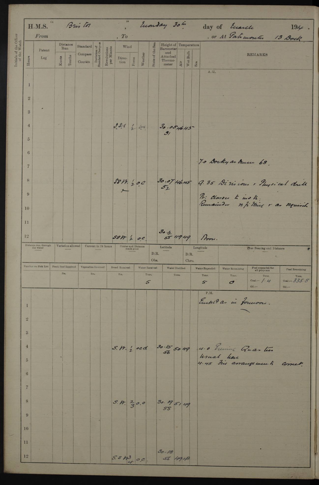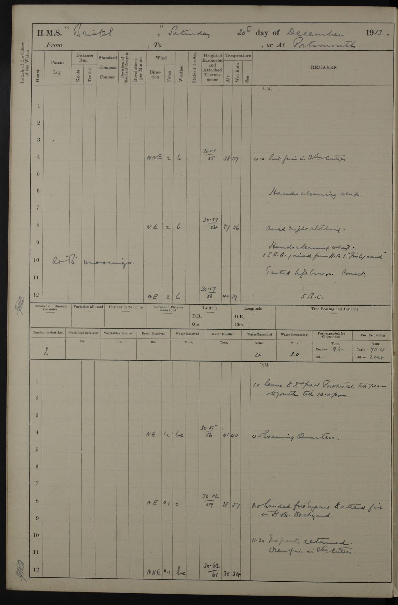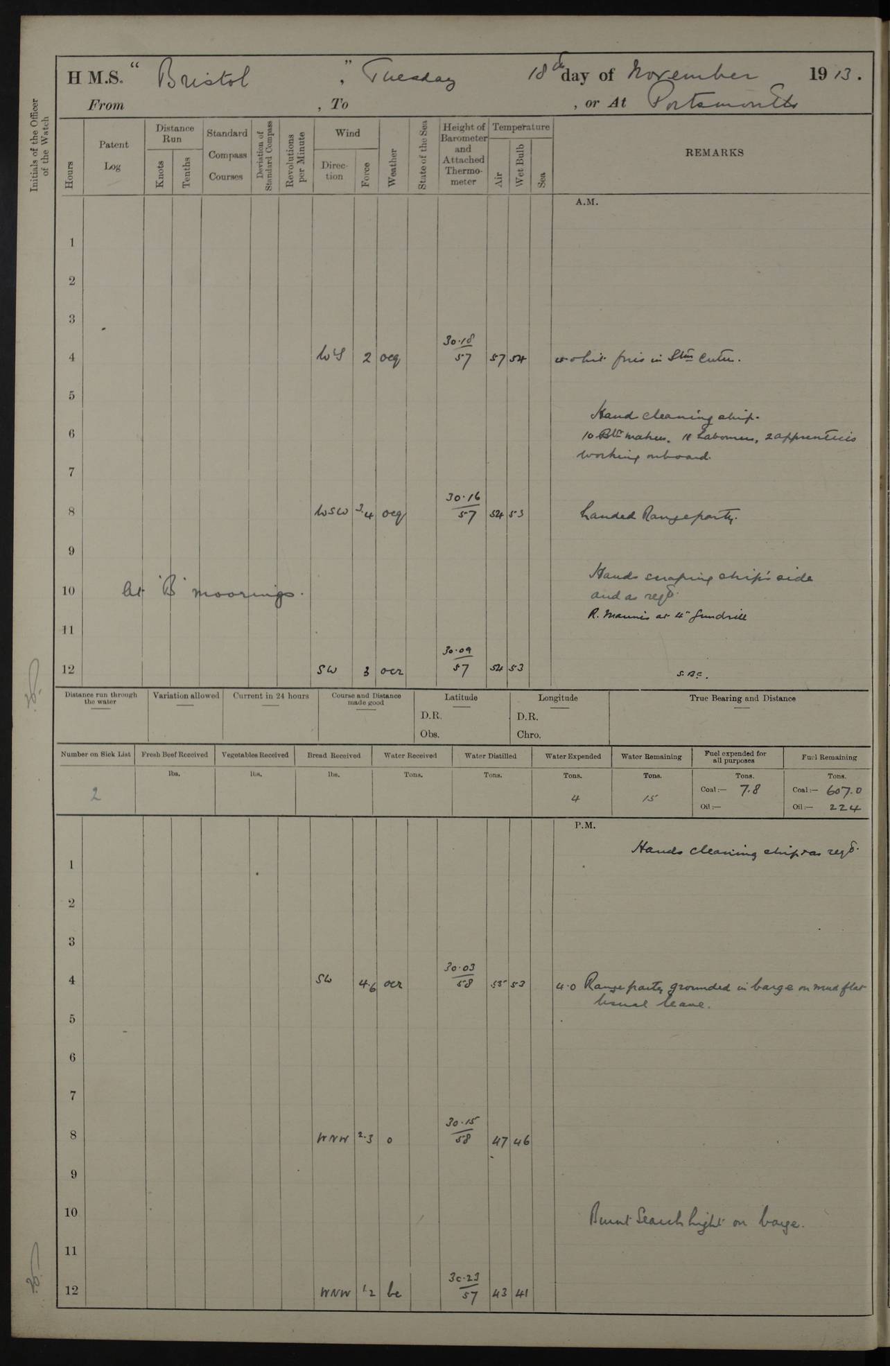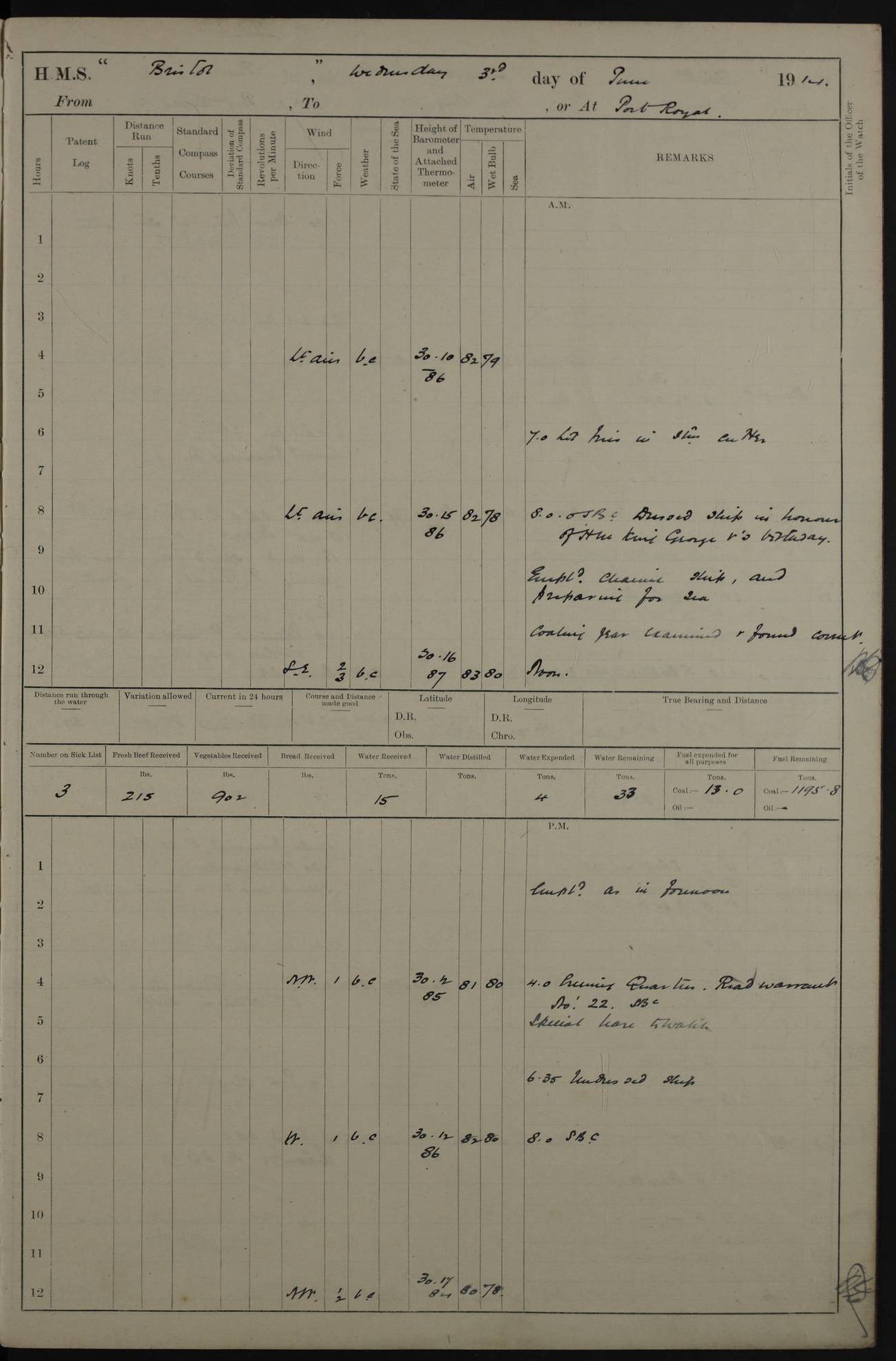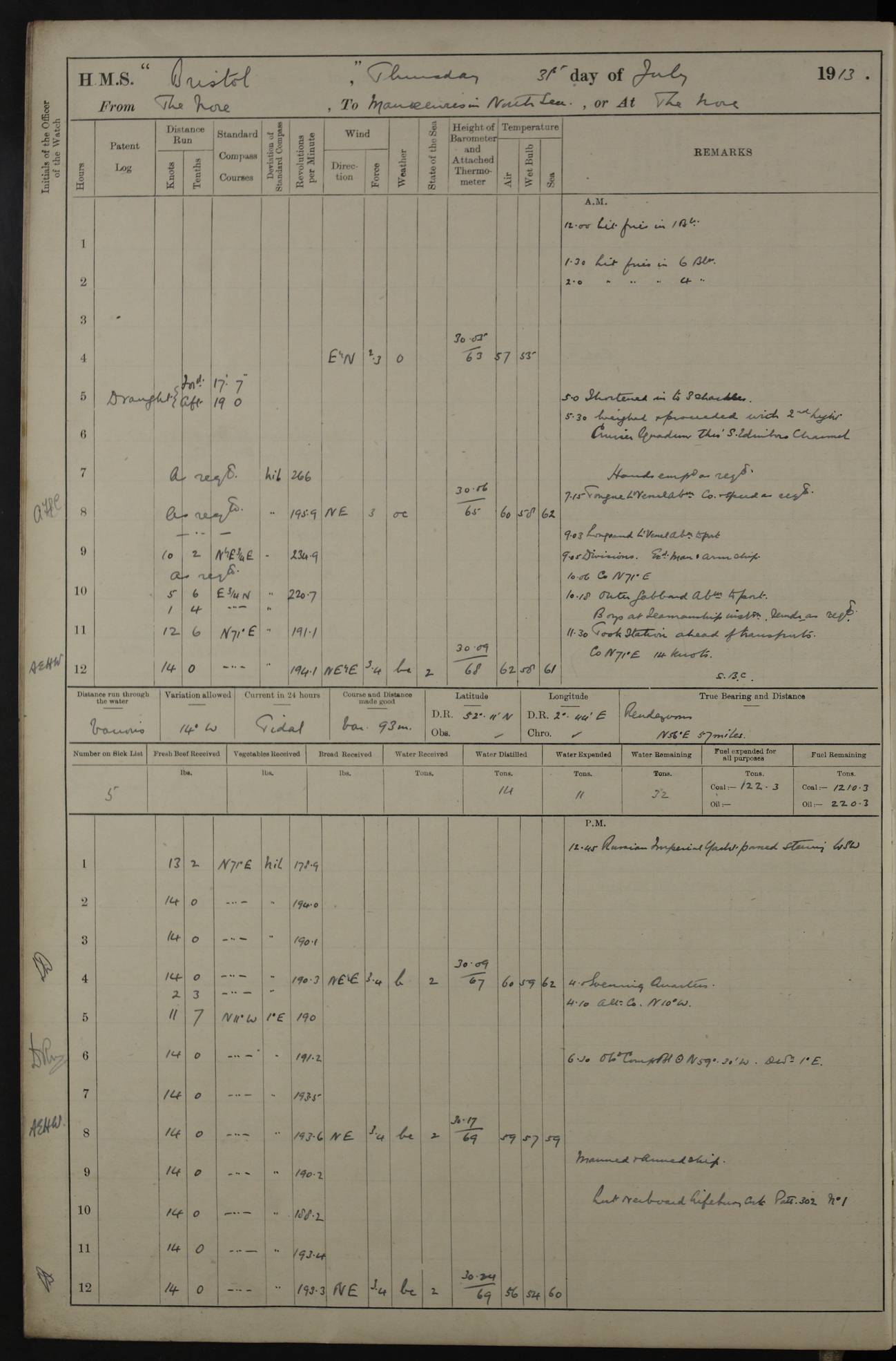 (Maps prepared using Journey Plotter, developed by Maikel. The Plots can only be approximate. They are made by joining-up positions on successive days, and sometimes positions are not given. There will therefore be occasions when the ship appears to have travelled overland) LOG BOOK – JULY 1ST 1913 TO JUNE 21ST 1914 4ef4f40ce53e0a0c91001323: (https://s3.amazonaws.com:443/oldweather/ADM53-36118/0001_0.jpg) 4ef4f40ce53e0a0c91001324: (https://s3.amazonaws.com:443/oldweather/ADM53-36118/0001_1.jpg) 4ef4f40de53e0a0c91001325: (https://s3.amazonaws.com:443/oldweather/ADM53-36118/0002_0.jpg) 4ef4f40de53e0a0c91001326: (https://s3.amazonaws.com:443/oldweather/ADM53-36118/0002_1.jpg) 4ef4f40de53e0a0c91001327: (https://s3.amazonaws.com:443/oldweather/ADM53-36118/0003_0.jpg) 4ef4f40de53e0a0c91001328: (https://s3.amazonaws.com:443/oldweather/ADM53-36118/0003_1.jpg) 4ef4f40de53e0a0c91001329: (https://s3.amazonaws.com:443/oldweather/ADM53-36118/0004_0.jpg) 4ef4f40de53e0a0c9100132a: (https://s3.amazonaws.com:443/oldweather/ADM53-36118/0004_1.jpg) LOG OF H.M.S. BRISTOL Commanded by Captain Basil Hew Fanshawe FOR THE PERIOD Commencing 1st of July 1913 Ending 21st of June 1914 Followed by her technical detail 4ef4f40de53e0a0c9100132b: (https://s3.amazonaws.com:443/oldweather/ADM53-36118/0005_0.jpg) Directions 4ef4f40de53e0a0c9100132c: (https://s3.amazonaws.com:443/oldweather/ADM53-36118/0005_1.jpg) Establishment of Ship’s Company: Full Commission: Officers: 18. Seamen: 111. Boys: 13. Marines: 28. Engine-room establishment: 168. Other non-executive ratings: 43. Total: 381 Active Commision: Officers: 14. Seamen: 53. Boys: 0. Marines: 17. Engine-room establishment: 64. Other non-executive ratings: 27. Total 175 Armament: Forecastle: 1 6” B.L. PV* Quarterdeck: 1 6” B.L. PV* Starboard waist: 5 4” B.L. PIV* Port waist: 5 4” B.L. PIV* 4 3 pounder for Saluting purpose, 2 in each battery Torpedo Two 18” submerged tubes Boats: 1 30 feet Steam Cutter 1 34 feet Cutter 2 30 feet Cutters 1 30 feet Gig 3 27 feet Whalers 2 18 feet Skiffs