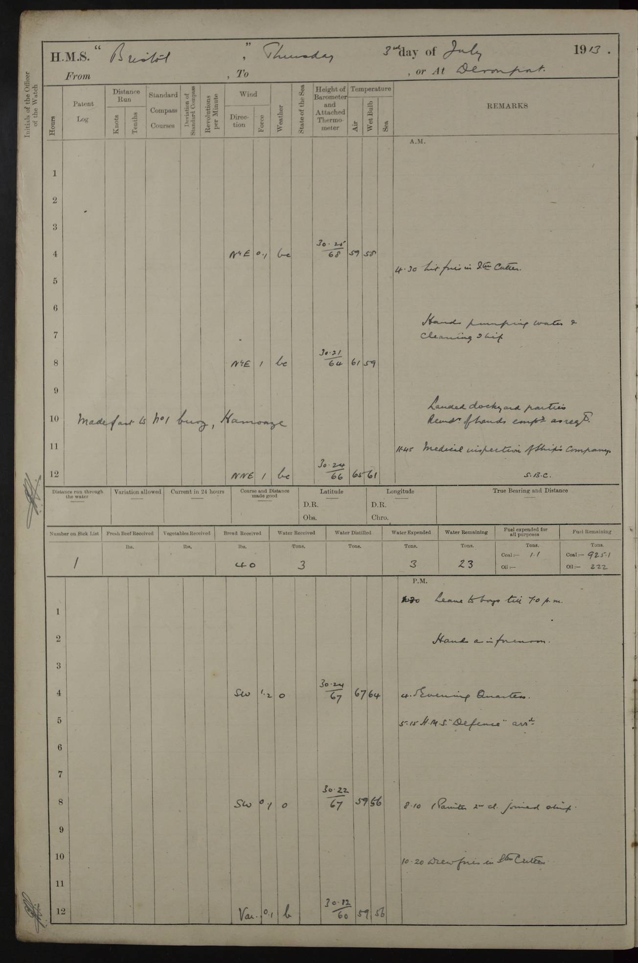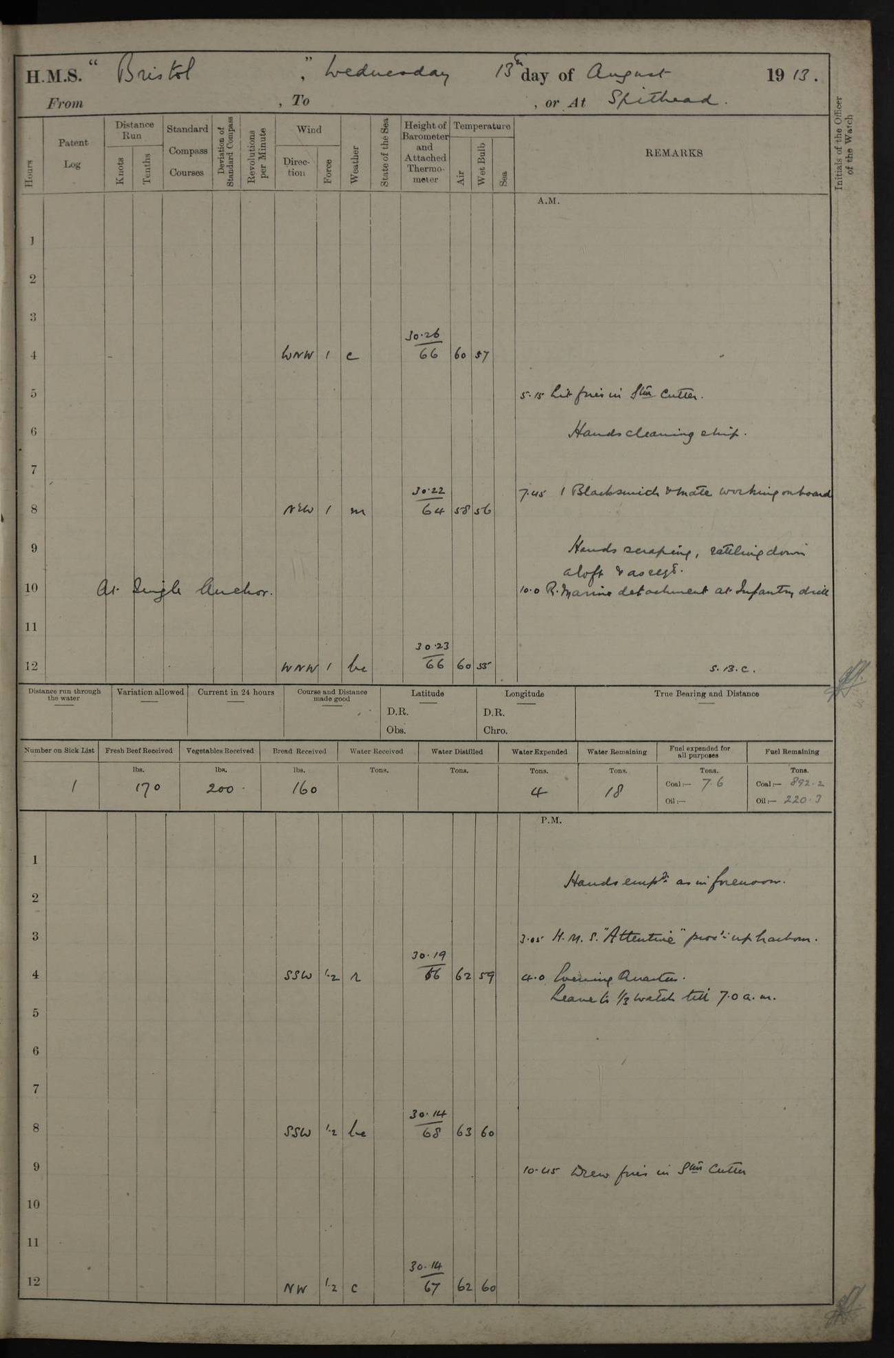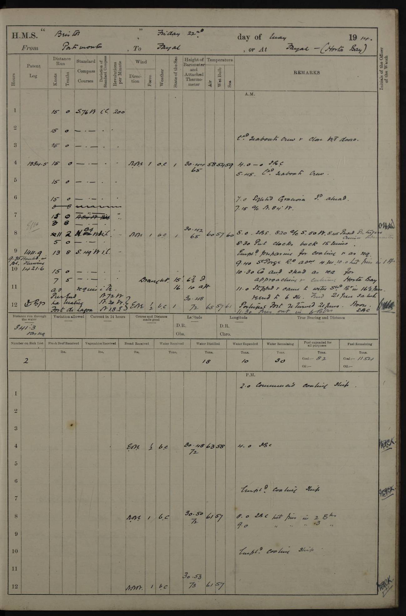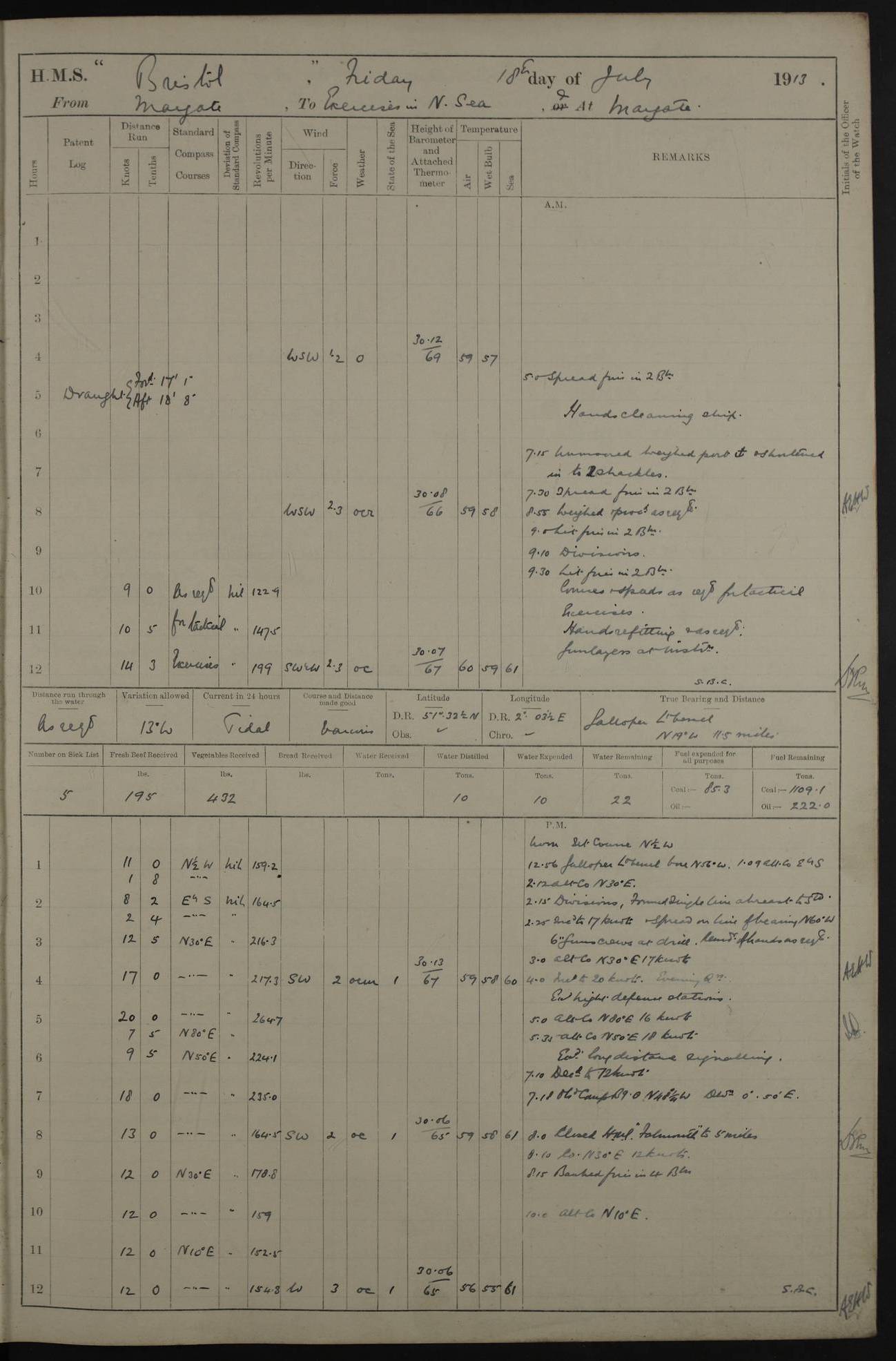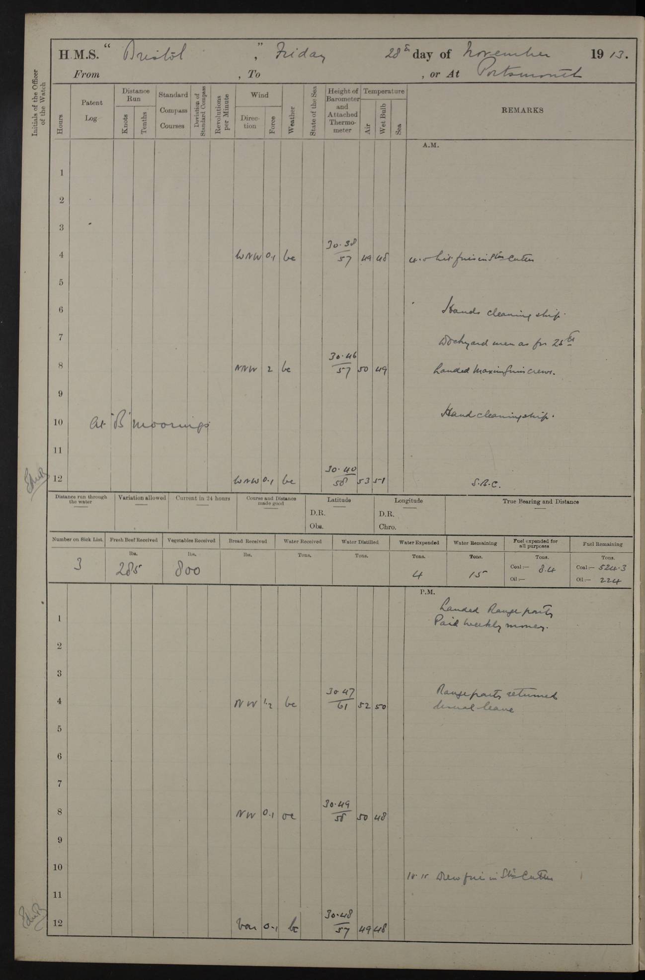 (Maps prepared using Journey Plotter, developed by Maikel. The Plots can only be approximate. They are made by joining-up positions on successive days, and sometimes positions are not given. There will therefore be occasions when the ship appears to have travelled overland) LOG BOOK – JULY 1ST 1913 TO JUNE 21ST 1914 4ef4f40ce53e0a0c91001323: (https://s3.amazonaws.com:443/oldweather/ADM53-36118/0001_0.jpg) 4ef4f40ce53e0a0c91001324: (https://s3.amazonaws.com:443/oldweather/ADM53-36118/0001_1.jpg) 4ef4f40de53e0a0c91001325: (https://s3.amazonaws.com:443/oldweather/ADM53-36118/0002_0.jpg) 4ef4f40de53e0a0c91001326: (https://s3.amazonaws.com:443/oldweather/ADM53-36118/0002_1.jpg) 4ef4f40de53e0a0c91001327: (https://s3.amazonaws.com:443/oldweather/ADM53-36118/0003_0.jpg) 4ef4f40de53e0a0c91001328: (https://s3.amazonaws.com:443/oldweather/ADM53-36118/0003_1.jpg) 4ef4f40de53e0a0c91001329: (https://s3.amazonaws.com:443/oldweather/ADM53-36118/0004_0.jpg) 4ef4f40de53e0a0c9100132a: (https://s3.amazonaws.com:443/oldweather/ADM53-36118/0004_1.jpg) LOG OF H.M.S. BRISTOL Commanded by Captain Basil Hew Fanshawe FOR THE PERIOD Commencing 1st of July 1913 Ending 21st of June 1914 Followed by her technical detail 4ef4f40de53e0a0c9100132b: (https://s3.amazonaws.com:443/oldweather/ADM53-36118/0005_0.jpg) Directions 4ef4f40de53e0a0c9100132c: (https://s3.amazonaws.com:443/oldweather/ADM53-36118/0005_1.jpg) Establishment of Ship’s Company: Full Commission: Officers: 18. Seamen: 111. Boys: 13. Marines: 28. Engine-room establishment: 168. Other non-executive ratings: 43. Total: 381 Active Commision: Officers: 14. Seamen: 53. Boys: 0. Marines: 17. Engine-room establishment: 64. Other non-executive ratings: 27. Total 175 Armament: Forecastle: 1 6” B.L. PV* Quarterdeck: 1 6” B.L. PV* Starboard waist: 5 4” B.L. PIV* Port waist: 5 4” B.L. PIV* 4 3 pounder for Saluting purpose, 2 in each battery Torpedo Two 18” submerged tubes Boats: 1 30 feet Steam Cutter 1 34 feet Cutter 2 30 feet Cutters 1 30 feet Gig 3 27 feet Whalers 2 18 feet Skiffs