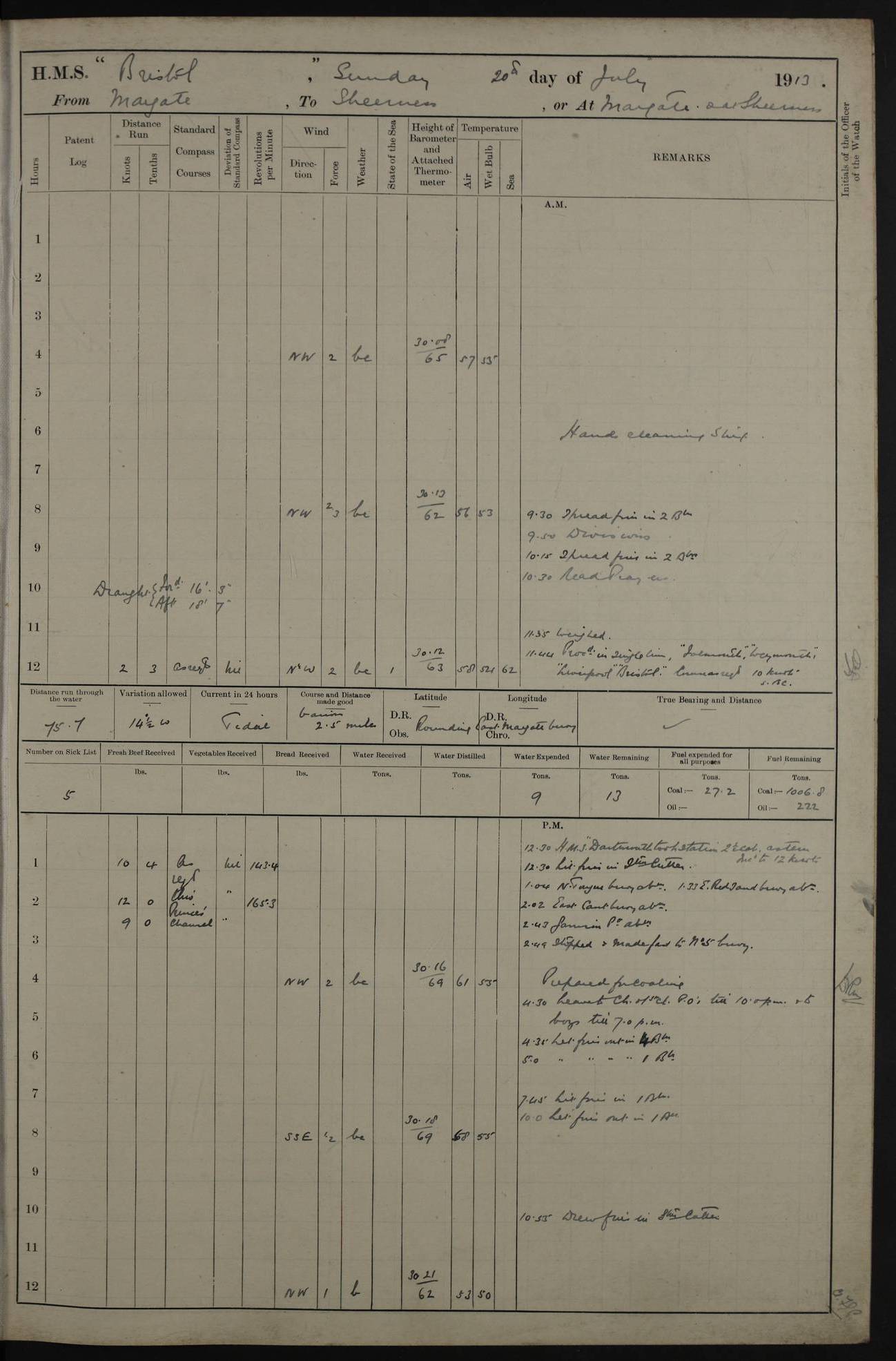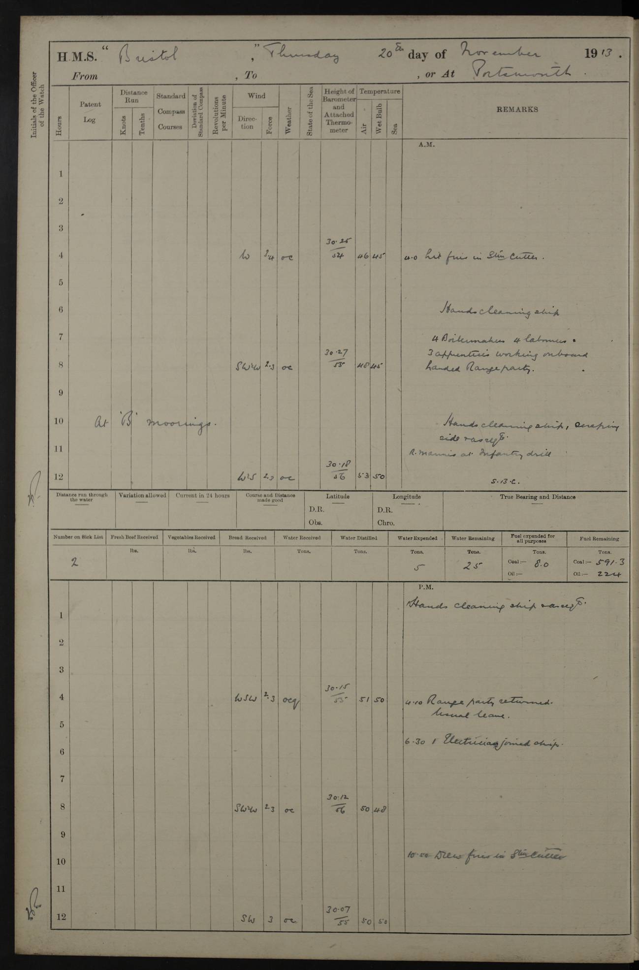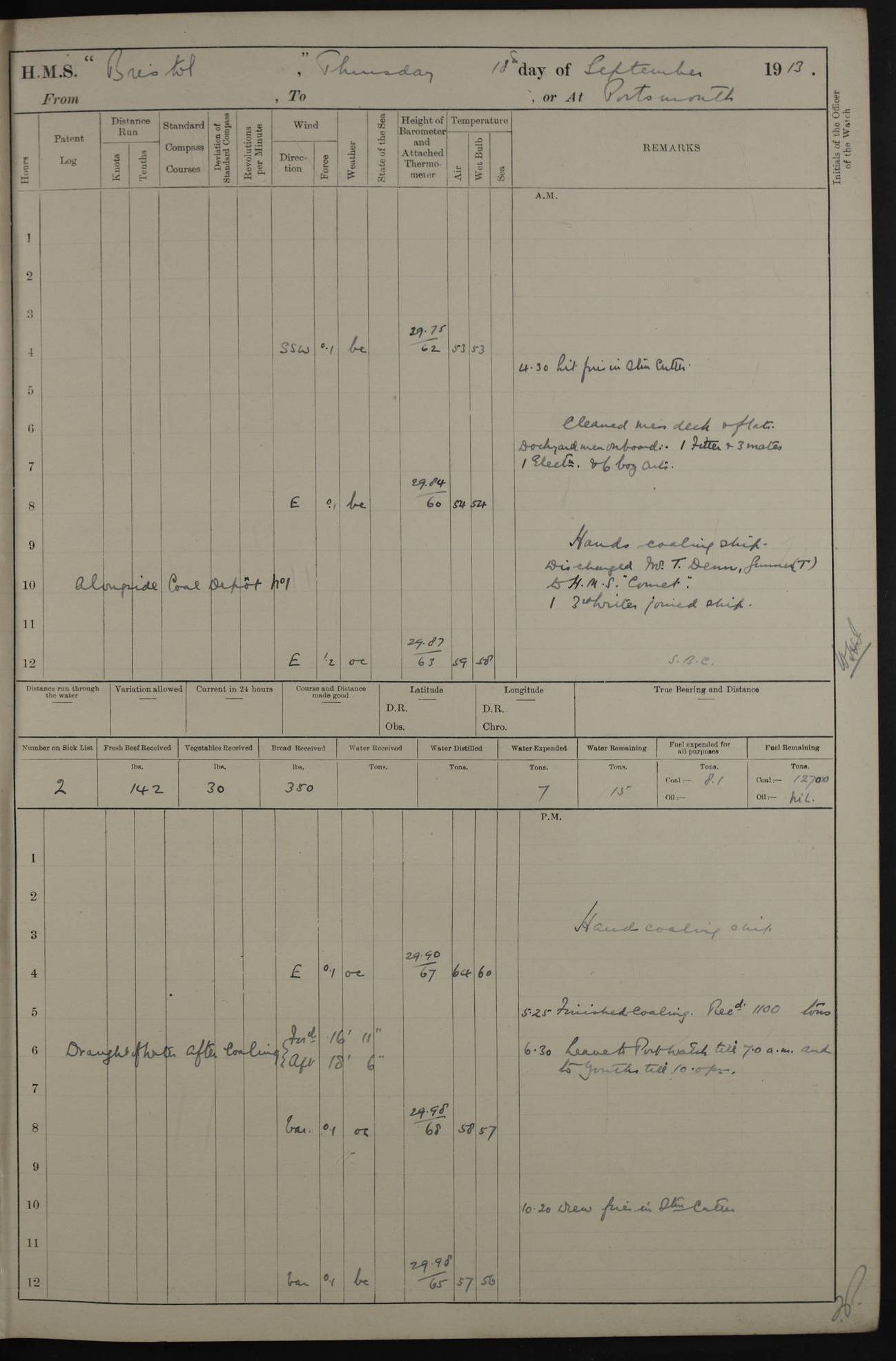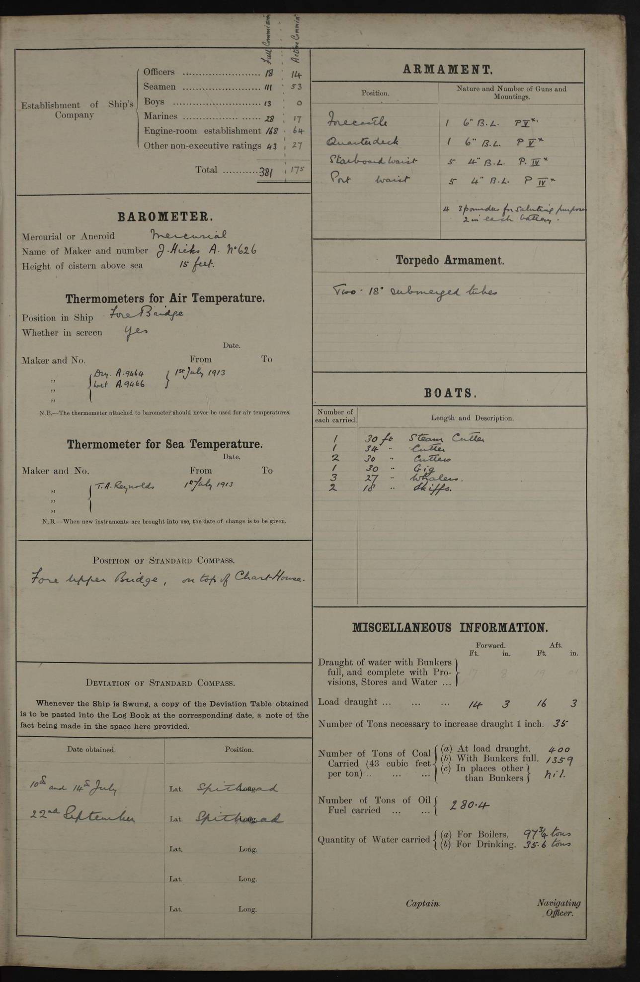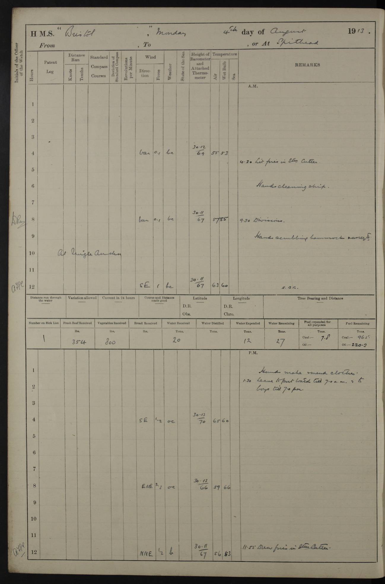 (Maps prepared using Journey Plotter, developed by Maikel. The Plots can only be approximate. They are made by joining-up positions on successive days, and sometimes positions are not given. There will therefore be occasions when the ship appears to have travelled overland) LOG BOOK – JULY 1ST 1913 TO JUNE 21ST 1914 4ef4f40ce53e0a0c91001323: (https://s3.amazonaws.com:443/oldweather/ADM53-36118/0001_0.jpg) 4ef4f40ce53e0a0c91001324: (https://s3.amazonaws.com:443/oldweather/ADM53-36118/0001_1.jpg) 4ef4f40de53e0a0c91001325: (https://s3.amazonaws.com:443/oldweather/ADM53-36118/0002_0.jpg) 4ef4f40de53e0a0c91001326: (https://s3.amazonaws.com:443/oldweather/ADM53-36118/0002_1.jpg) 4ef4f40de53e0a0c91001327: (https://s3.amazonaws.com:443/oldweather/ADM53-36118/0003_0.jpg) 4ef4f40de53e0a0c91001328: (https://s3.amazonaws.com:443/oldweather/ADM53-36118/0003_1.jpg) 4ef4f40de53e0a0c91001329: (https://s3.amazonaws.com:443/oldweather/ADM53-36118/0004_0.jpg) 4ef4f40de53e0a0c9100132a: (https://s3.amazonaws.com:443/oldweather/ADM53-36118/0004_1.jpg) LOG OF H.M.S. BRISTOL Commanded by Captain Basil Hew Fanshawe FOR THE PERIOD Commencing 1st of July 1913 Ending 21st of June 1914 Followed by her technical detail 4ef4f40de53e0a0c9100132b: (https://s3.amazonaws.com:443/oldweather/ADM53-36118/0005_0.jpg) Directions 4ef4f40de53e0a0c9100132c: (https://s3.amazonaws.com:443/oldweather/ADM53-36118/0005_1.jpg) Establishment of Ship’s Company: Full Commission: Officers: 18. Seamen: 111. Boys: 13. Marines: 28. Engine-room establishment: 168. Other non-executive ratings: 43. Total: 381 Active Commision: Officers: 14. Seamen: 53. Boys: 0. Marines: 17. Engine-room establishment: 64. Other non-executive ratings: 27. Total 175 Armament: Forecastle: 1 6” B.L. PV* Quarterdeck: 1 6” B.L. PV* Starboard waist: 5 4” B.L. PIV* Port waist: 5 4” B.L. PIV* 4 3 pounder for Saluting purpose, 2 in each battery Torpedo Two 18” submerged tubes Boats: 1 30 feet Steam Cutter 1 34 feet Cutter 2 30 feet Cutters 1 30 feet Gig 3 27 feet Whalers 2 18 feet Skiffs