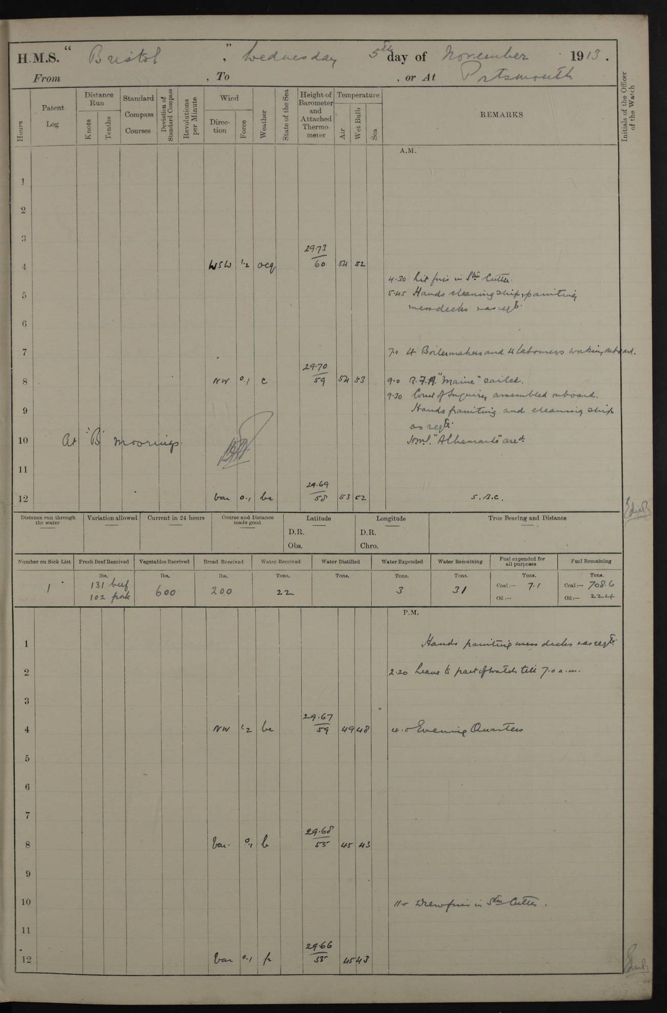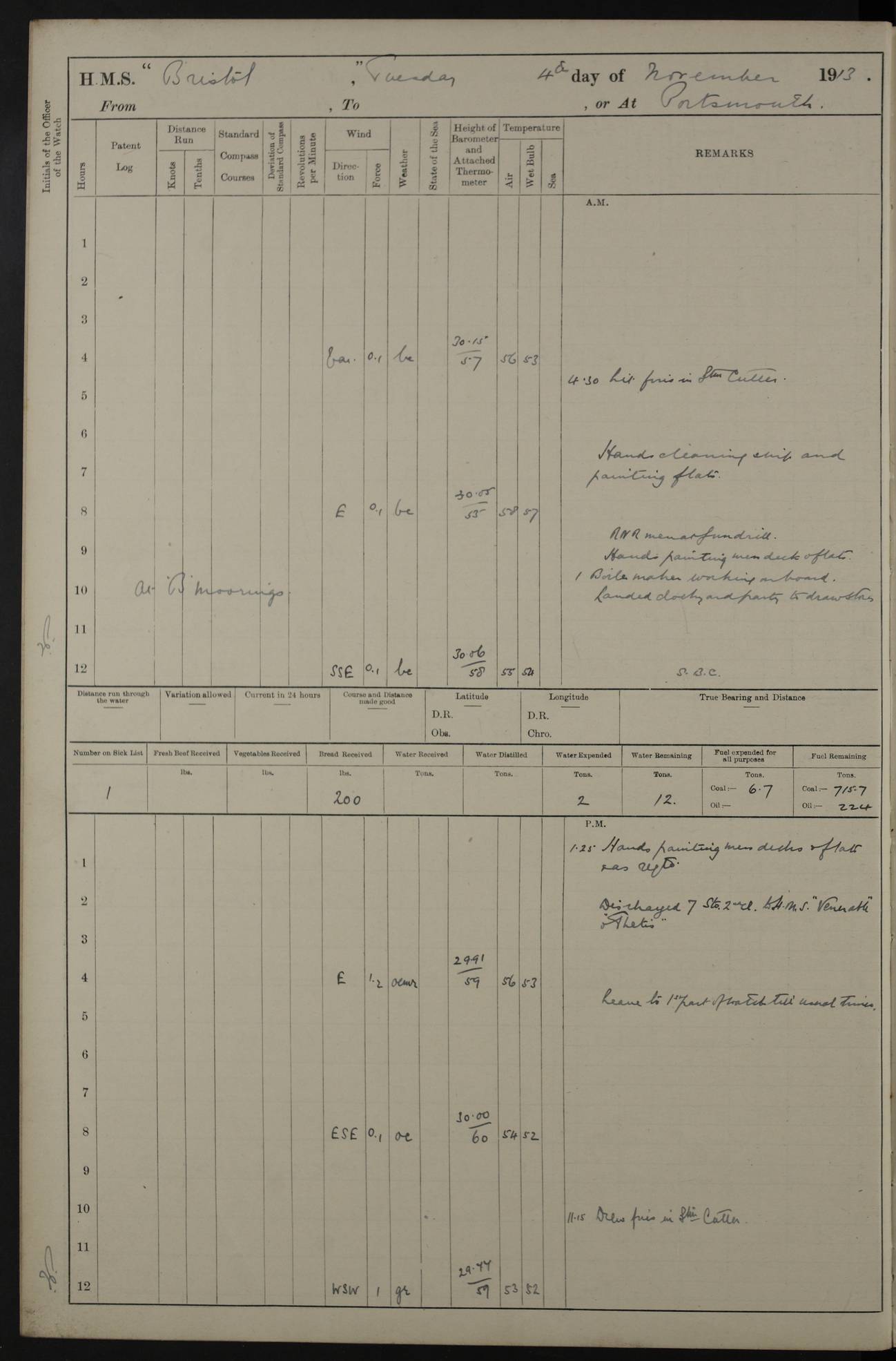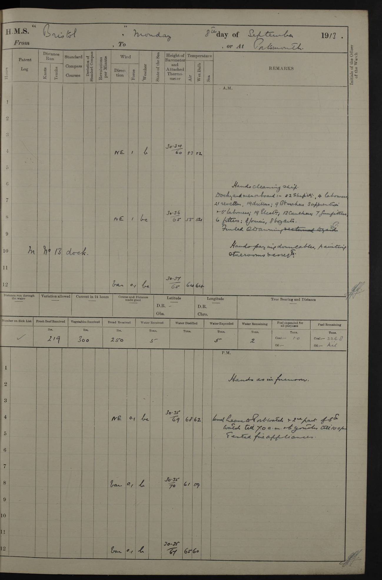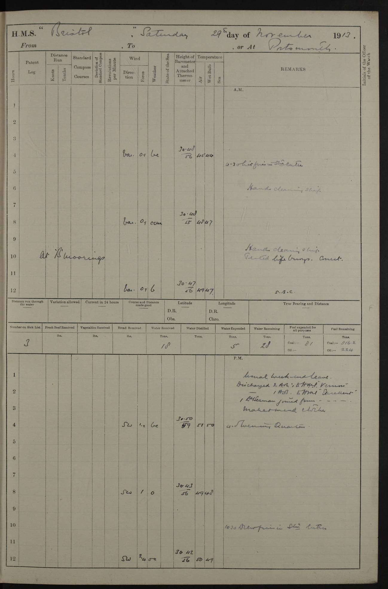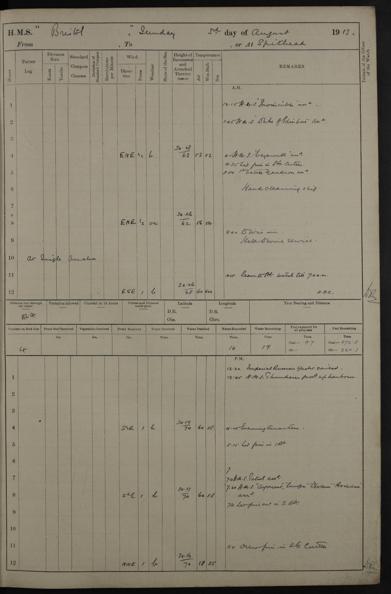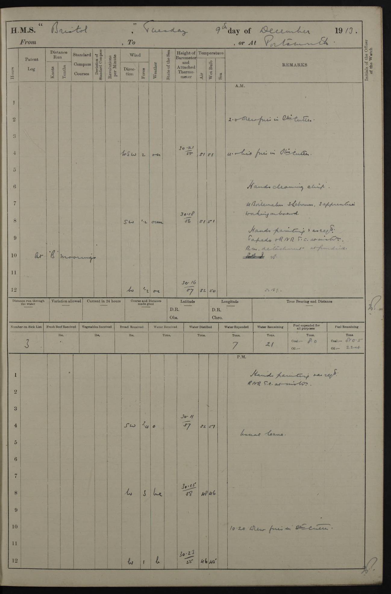 (Maps prepared using Journey Plotter, developed by Maikel. The Plots can only be approximate. They are made by joining-up positions on successive days, and sometimes positions are not given. There will therefore be occasions when the ship appears to have travelled overland) LOG BOOK – JULY 1ST 1913 TO JUNE 21ST 1914 4ef4f40ce53e0a0c91001323: (https://s3.amazonaws.com:443/oldweather/ADM53-36118/0001_0.jpg) 4ef4f40ce53e0a0c91001324: (https://s3.amazonaws.com:443/oldweather/ADM53-36118/0001_1.jpg) 4ef4f40de53e0a0c91001325: (https://s3.amazonaws.com:443/oldweather/ADM53-36118/0002_0.jpg) 4ef4f40de53e0a0c91001326: (https://s3.amazonaws.com:443/oldweather/ADM53-36118/0002_1.jpg) 4ef4f40de53e0a0c91001327: (https://s3.amazonaws.com:443/oldweather/ADM53-36118/0003_0.jpg) 4ef4f40de53e0a0c91001328: (https://s3.amazonaws.com:443/oldweather/ADM53-36118/0003_1.jpg) 4ef4f40de53e0a0c91001329: (https://s3.amazonaws.com:443/oldweather/ADM53-36118/0004_0.jpg) 4ef4f40de53e0a0c9100132a: (https://s3.amazonaws.com:443/oldweather/ADM53-36118/0004_1.jpg) LOG OF H.M.S. BRISTOL Commanded by Captain Basil Hew Fanshawe FOR THE PERIOD Commencing 1st of July 1913 Ending 21st of June 1914 Followed by her technical detail 4ef4f40de53e0a0c9100132b: (https://s3.amazonaws.com:443/oldweather/ADM53-36118/0005_0.jpg) Directions 4ef4f40de53e0a0c9100132c: (https://s3.amazonaws.com:443/oldweather/ADM53-36118/0005_1.jpg) Establishment of Ship’s Company: Full Commission: Officers: 18. Seamen: 111. Boys: 13. Marines: 28. Engine-room establishment: 168. Other non-executive ratings: 43. Total: 381 Active Commision: Officers: 14. Seamen: 53. Boys: 0. Marines: 17. Engine-room establishment: 64. Other non-executive ratings: 27. Total 175 Armament: Forecastle: 1 6” B.L. PV* Quarterdeck: 1 6” B.L. PV* Starboard waist: 5 4” B.L. PIV* Port waist: 5 4” B.L. PIV* 4 3 pounder for Saluting purpose, 2 in each battery Torpedo Two 18” submerged tubes Boats: 1 30 feet Steam Cutter 1 34 feet Cutter 2 30 feet Cutters 1 30 feet Gig 3 27 feet Whalers 2 18 feet Skiffs