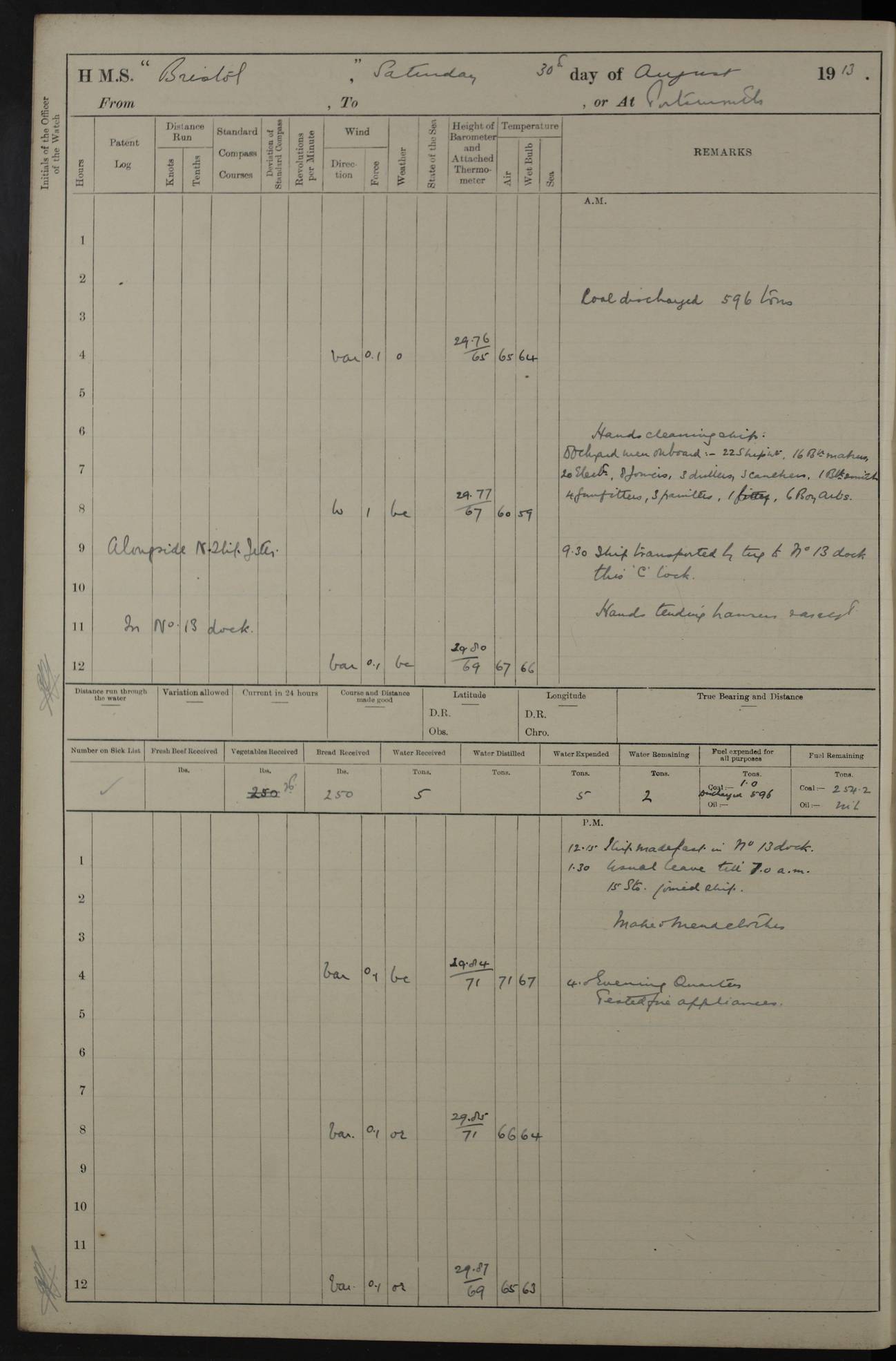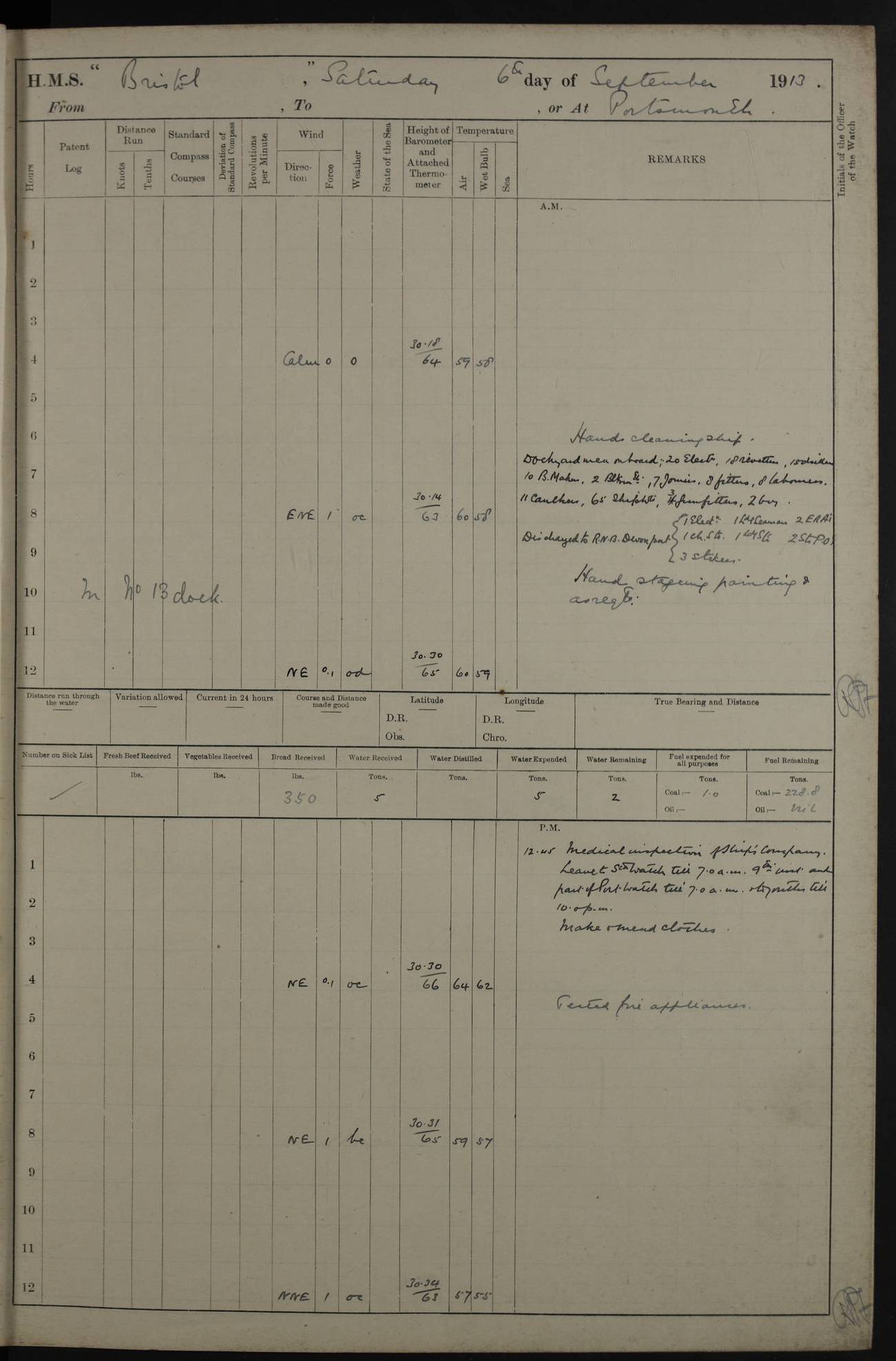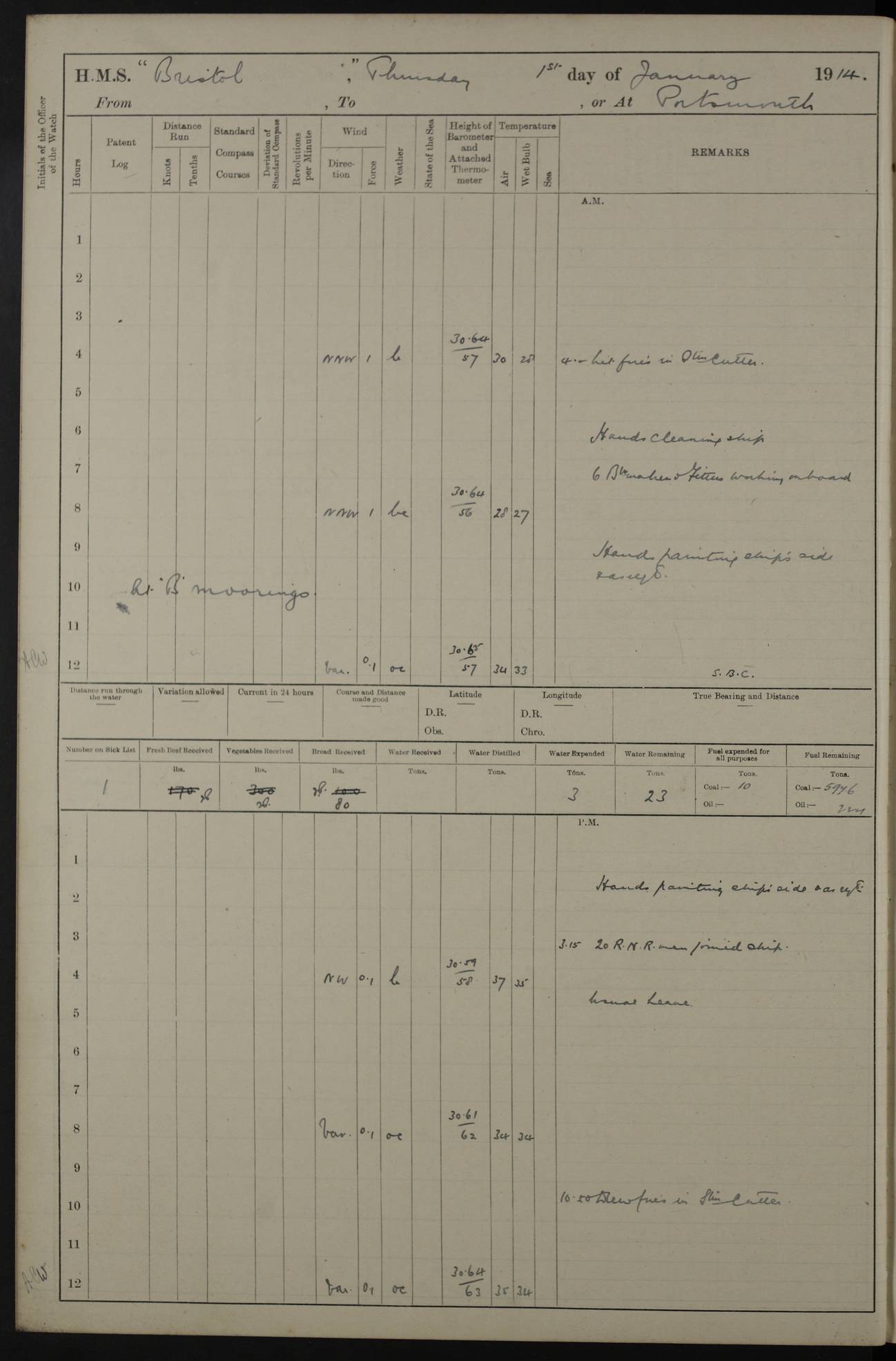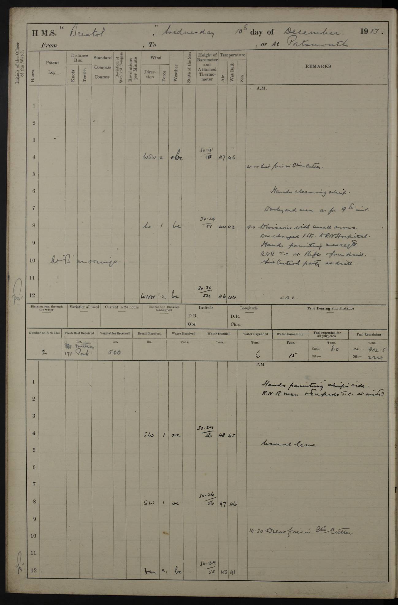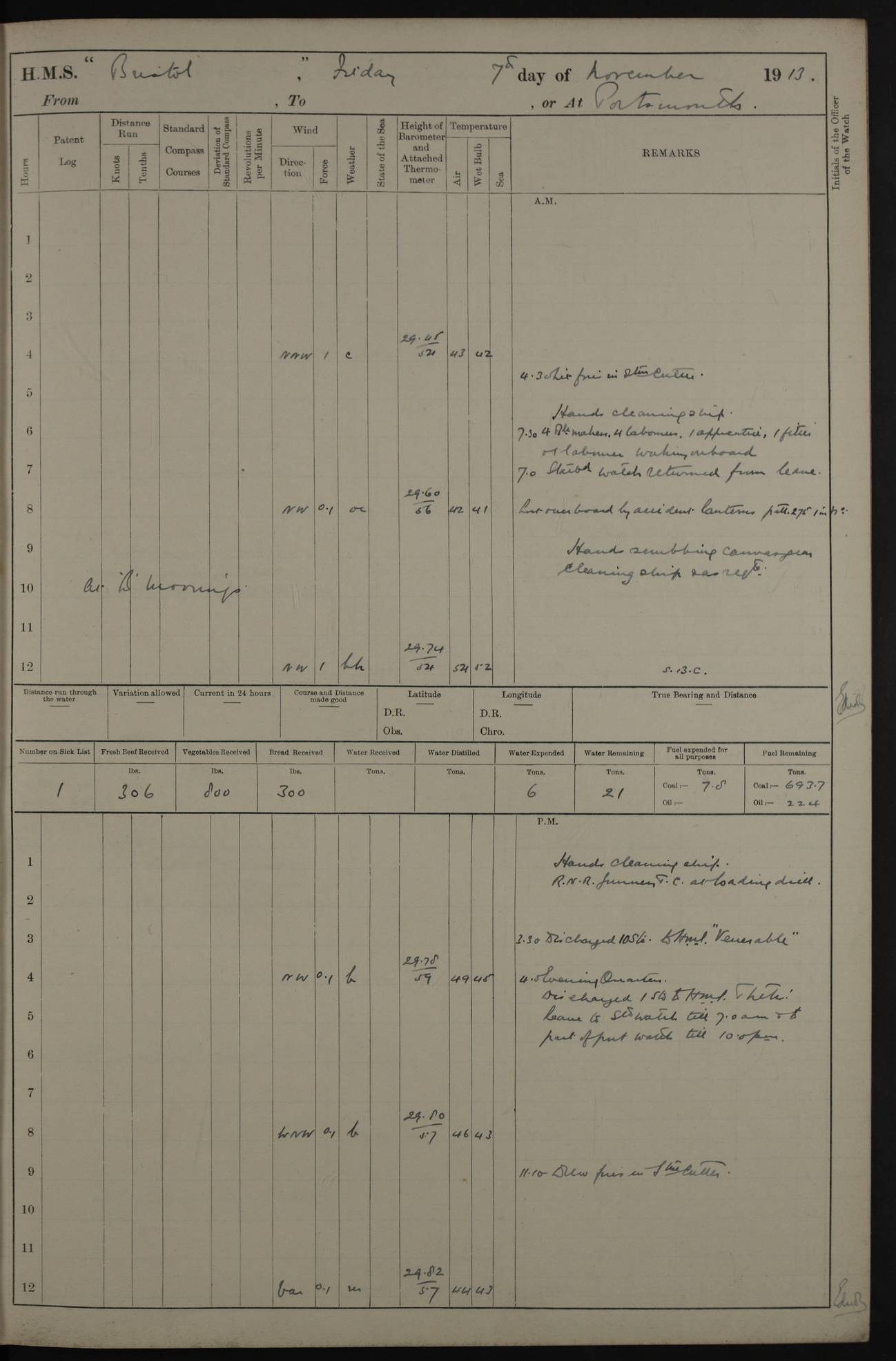 (Maps prepared using Journey Plotter, developed by Maikel. The Plots can only be approximate. They are made by joining-up positions on successive days, and sometimes positions are not given. There will therefore be occasions when the ship appears to have travelled overland) LOG BOOK – JULY 1ST 1913 TO JUNE 21ST 1914 4ef4f40ce53e0a0c91001323: (https://s3.amazonaws.com:443/oldweather/ADM53-36118/0001_0.jpg) 4ef4f40ce53e0a0c91001324: (https://s3.amazonaws.com:443/oldweather/ADM53-36118/0001_1.jpg) 4ef4f40de53e0a0c91001325: (https://s3.amazonaws.com:443/oldweather/ADM53-36118/0002_0.jpg) 4ef4f40de53e0a0c91001326: (https://s3.amazonaws.com:443/oldweather/ADM53-36118/0002_1.jpg) 4ef4f40de53e0a0c91001327: (https://s3.amazonaws.com:443/oldweather/ADM53-36118/0003_0.jpg) 4ef4f40de53e0a0c91001328: (https://s3.amazonaws.com:443/oldweather/ADM53-36118/0003_1.jpg) 4ef4f40de53e0a0c91001329: (https://s3.amazonaws.com:443/oldweather/ADM53-36118/0004_0.jpg) 4ef4f40de53e0a0c9100132a: (https://s3.amazonaws.com:443/oldweather/ADM53-36118/0004_1.jpg) LOG OF H.M.S. BRISTOL Commanded by Captain Basil Hew Fanshawe FOR THE PERIOD Commencing 1st of July 1913 Ending 21st of June 1914 Followed by her technical detail 4ef4f40de53e0a0c9100132b: (https://s3.amazonaws.com:443/oldweather/ADM53-36118/0005_0.jpg) Directions 4ef4f40de53e0a0c9100132c: (https://s3.amazonaws.com:443/oldweather/ADM53-36118/0005_1.jpg) Establishment of Ship’s Company: Full Commission: Officers: 18. Seamen: 111. Boys: 13. Marines: 28. Engine-room establishment: 168. Other non-executive ratings: 43. Total: 381 Active Commision: Officers: 14. Seamen: 53. Boys: 0. Marines: 17. Engine-room establishment: 64. Other non-executive ratings: 27. Total 175 Armament: Forecastle: 1 6” B.L. PV* Quarterdeck: 1 6” B.L. PV* Starboard waist: 5 4” B.L. PIV* Port waist: 5 4” B.L. PIV* 4 3 pounder for Saluting purpose, 2 in each battery Torpedo Two 18” submerged tubes Boats: 1 30 feet Steam Cutter 1 34 feet Cutter 2 30 feet Cutters 1 30 feet Gig 3 27 feet Whalers 2 18 feet Skiffs