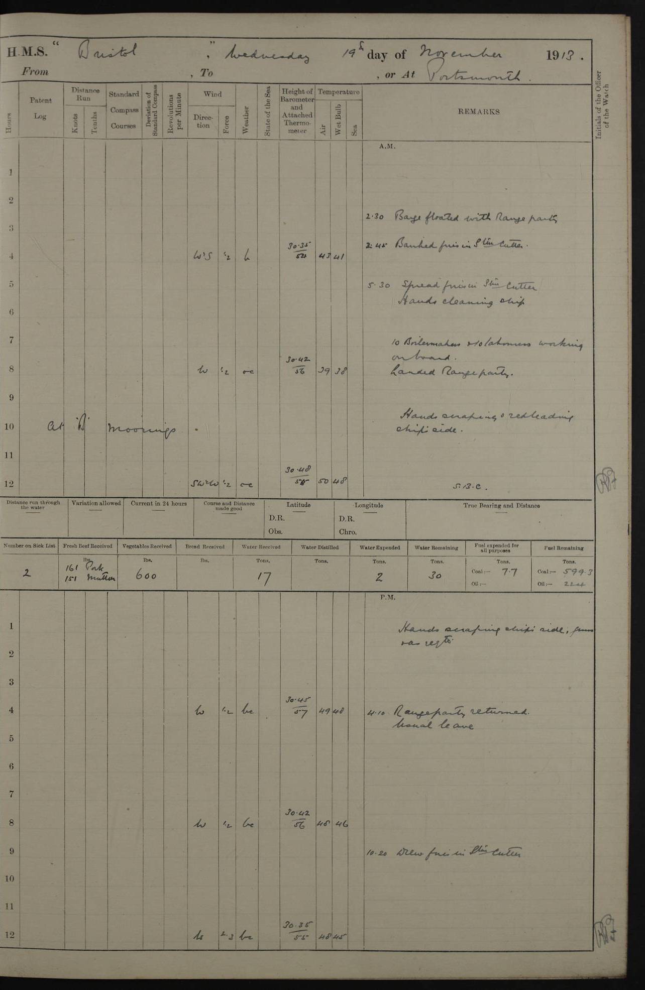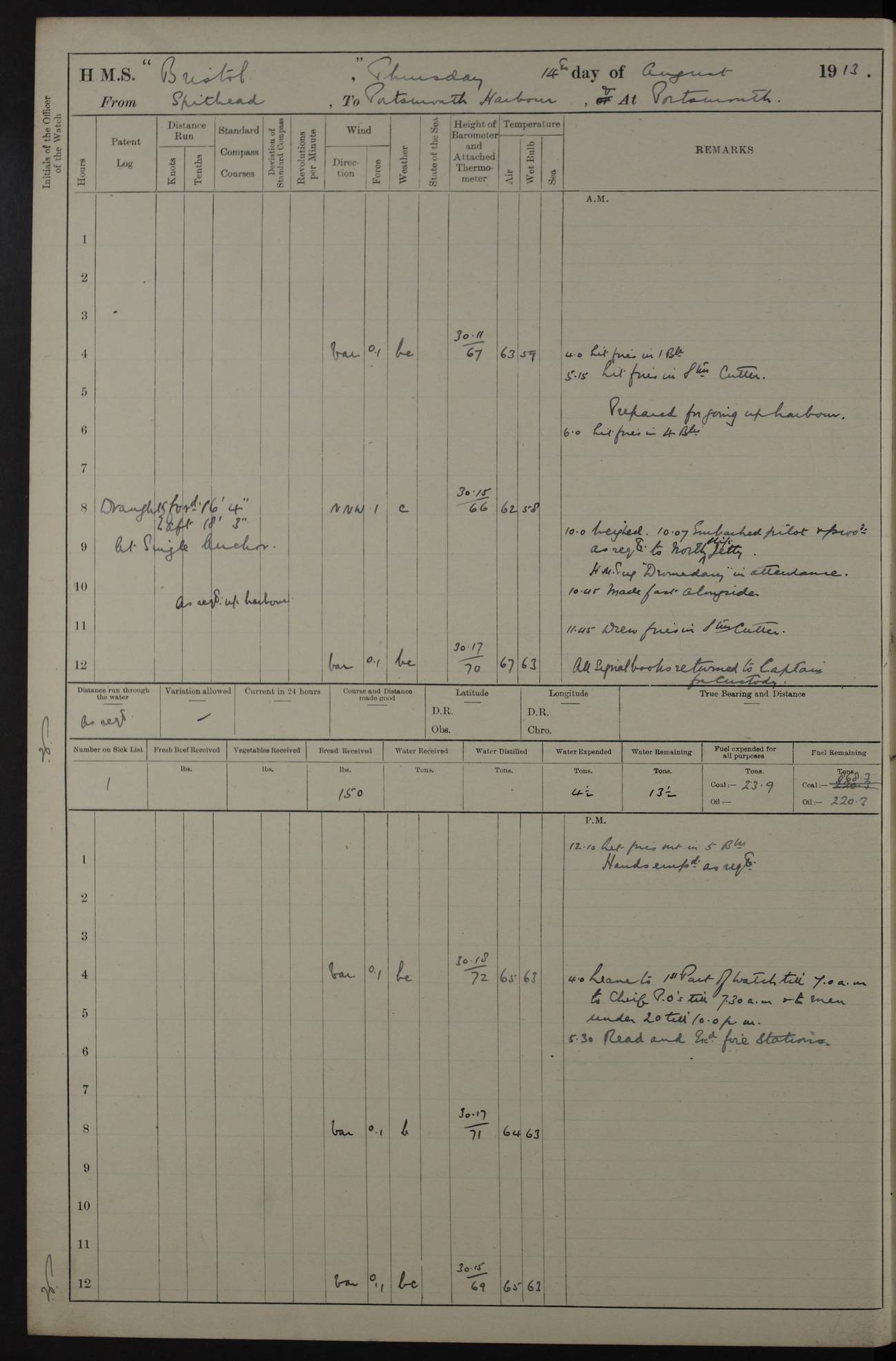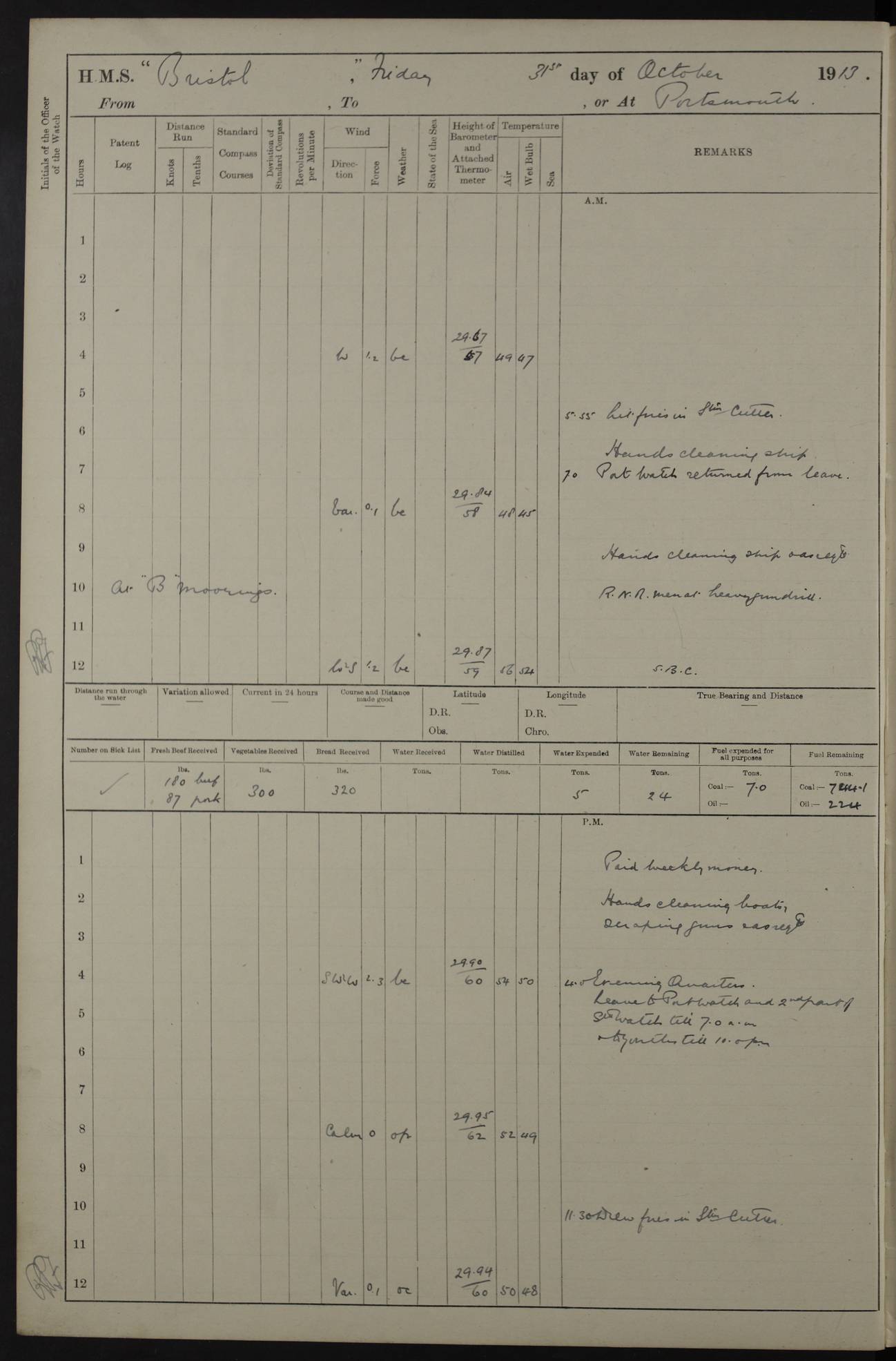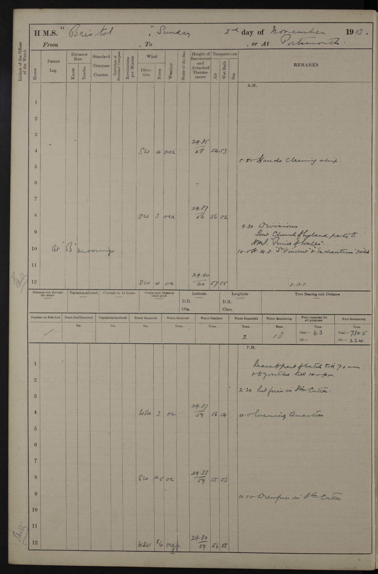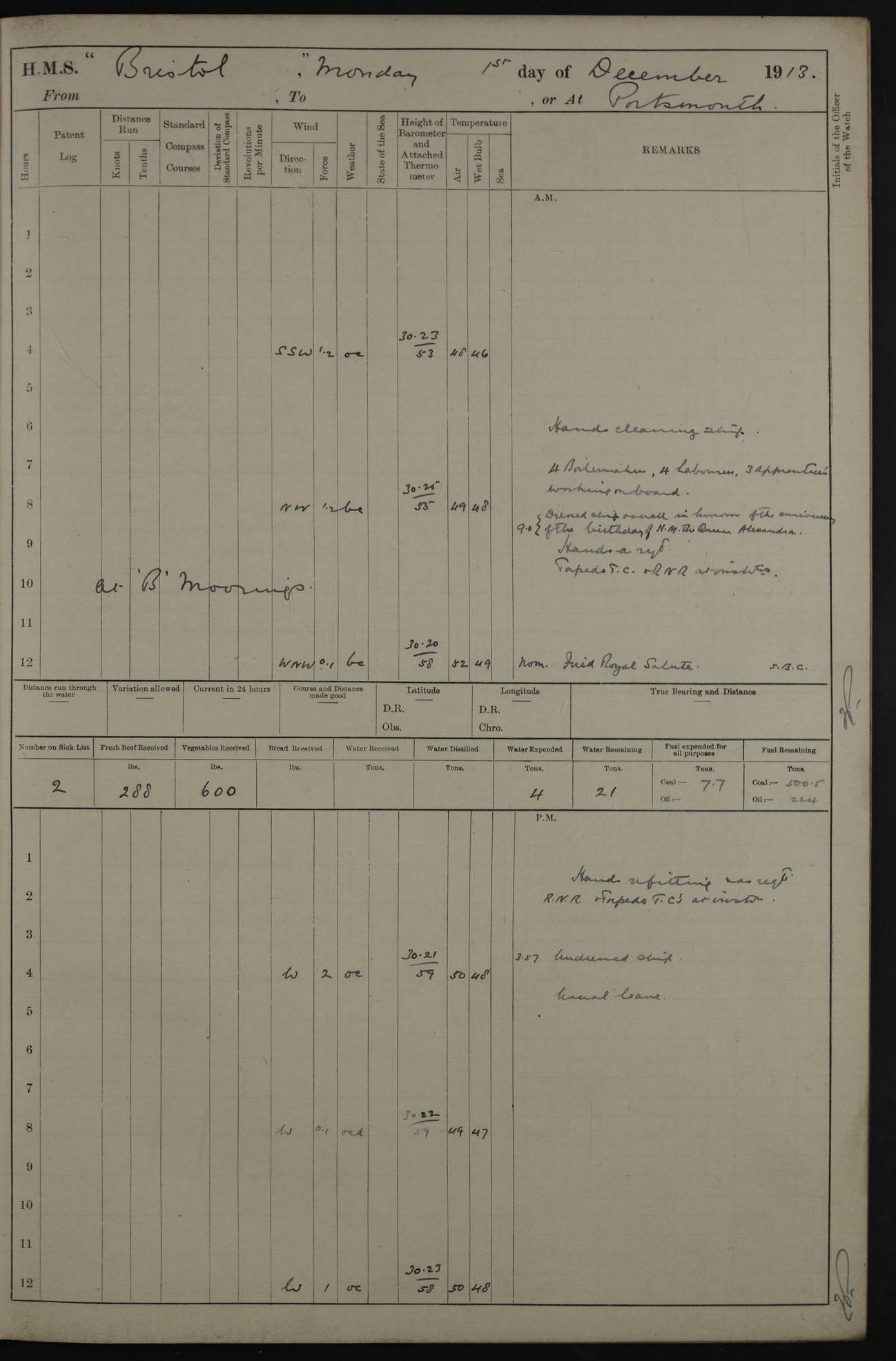 (Maps prepared using Journey Plotter, developed by Maikel. The Plots can only be approximate. They are made by joining-up positions on successive days, and sometimes positions are not given. There will therefore be occasions when the ship appears to have travelled overland) LOG BOOK – JULY 1ST 1913 TO JUNE 21ST 1914 4ef4f40ce53e0a0c91001323: (https://s3.amazonaws.com:443/oldweather/ADM53-36118/0001_0.jpg) 4ef4f40ce53e0a0c91001324: (https://s3.amazonaws.com:443/oldweather/ADM53-36118/0001_1.jpg) 4ef4f40de53e0a0c91001325: (https://s3.amazonaws.com:443/oldweather/ADM53-36118/0002_0.jpg) 4ef4f40de53e0a0c91001326: (https://s3.amazonaws.com:443/oldweather/ADM53-36118/0002_1.jpg) 4ef4f40de53e0a0c91001327: (https://s3.amazonaws.com:443/oldweather/ADM53-36118/0003_0.jpg) 4ef4f40de53e0a0c91001328: (https://s3.amazonaws.com:443/oldweather/ADM53-36118/0003_1.jpg) 4ef4f40de53e0a0c91001329: (https://s3.amazonaws.com:443/oldweather/ADM53-36118/0004_0.jpg) 4ef4f40de53e0a0c9100132a: (https://s3.amazonaws.com:443/oldweather/ADM53-36118/0004_1.jpg) LOG OF H.M.S. BRISTOL Commanded by Captain Basil Hew Fanshawe FOR THE PERIOD Commencing 1st of July 1913 Ending 21st of June 1914 Followed by her technical detail 4ef4f40de53e0a0c9100132b: (https://s3.amazonaws.com:443/oldweather/ADM53-36118/0005_0.jpg) Directions 4ef4f40de53e0a0c9100132c: (https://s3.amazonaws.com:443/oldweather/ADM53-36118/0005_1.jpg) Establishment of Ship’s Company: Full Commission: Officers: 18. Seamen: 111. Boys: 13. Marines: 28. Engine-room establishment: 168. Other non-executive ratings: 43. Total: 381 Active Commision: Officers: 14. Seamen: 53. Boys: 0. Marines: 17. Engine-room establishment: 64. Other non-executive ratings: 27. Total 175 Armament: Forecastle: 1 6” B.L. PV* Quarterdeck: 1 6” B.L. PV* Starboard waist: 5 4” B.L. PIV* Port waist: 5 4” B.L. PIV* 4 3 pounder for Saluting purpose, 2 in each battery Torpedo Two 18” submerged tubes Boats: 1 30 feet Steam Cutter 1 34 feet Cutter 2 30 feet Cutters 1 30 feet Gig 3 27 feet Whalers 2 18 feet Skiffs