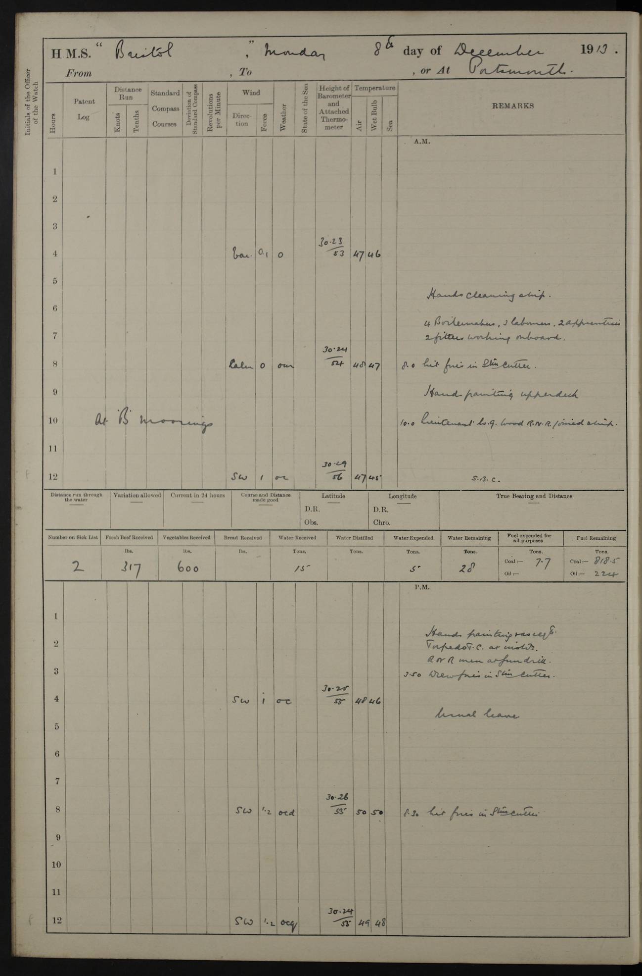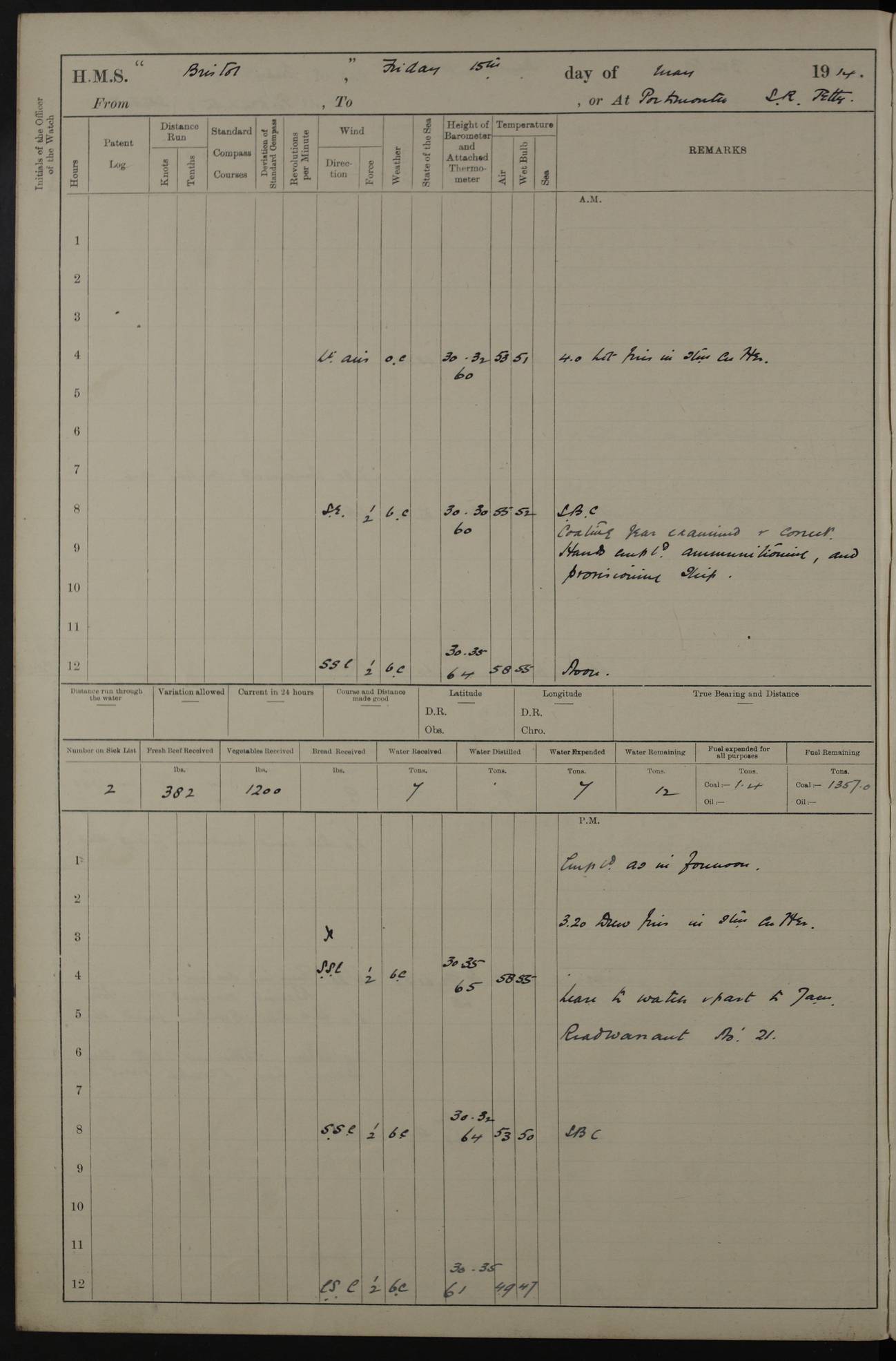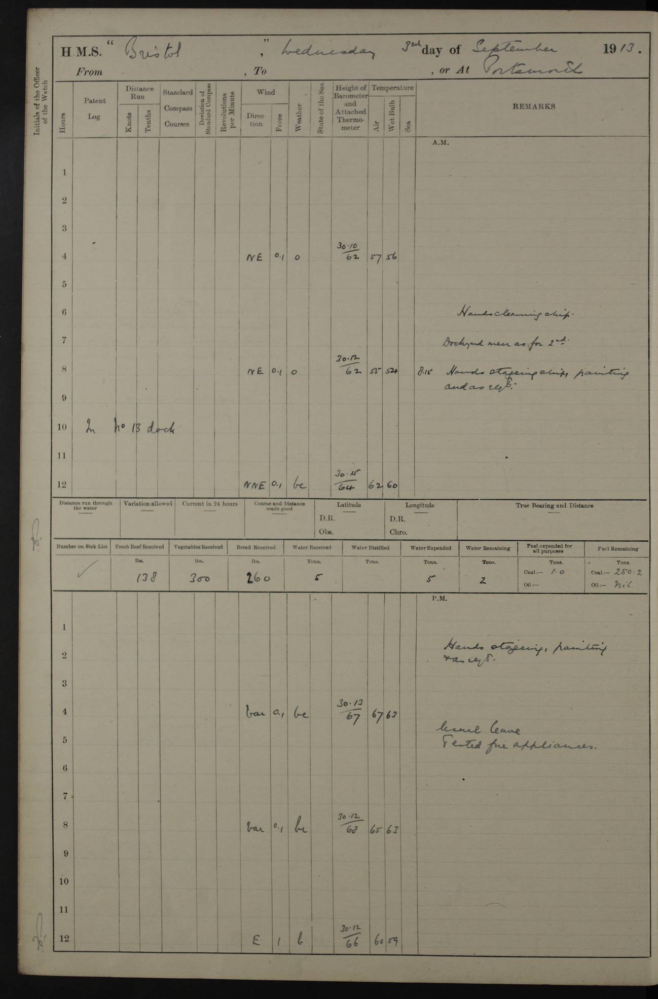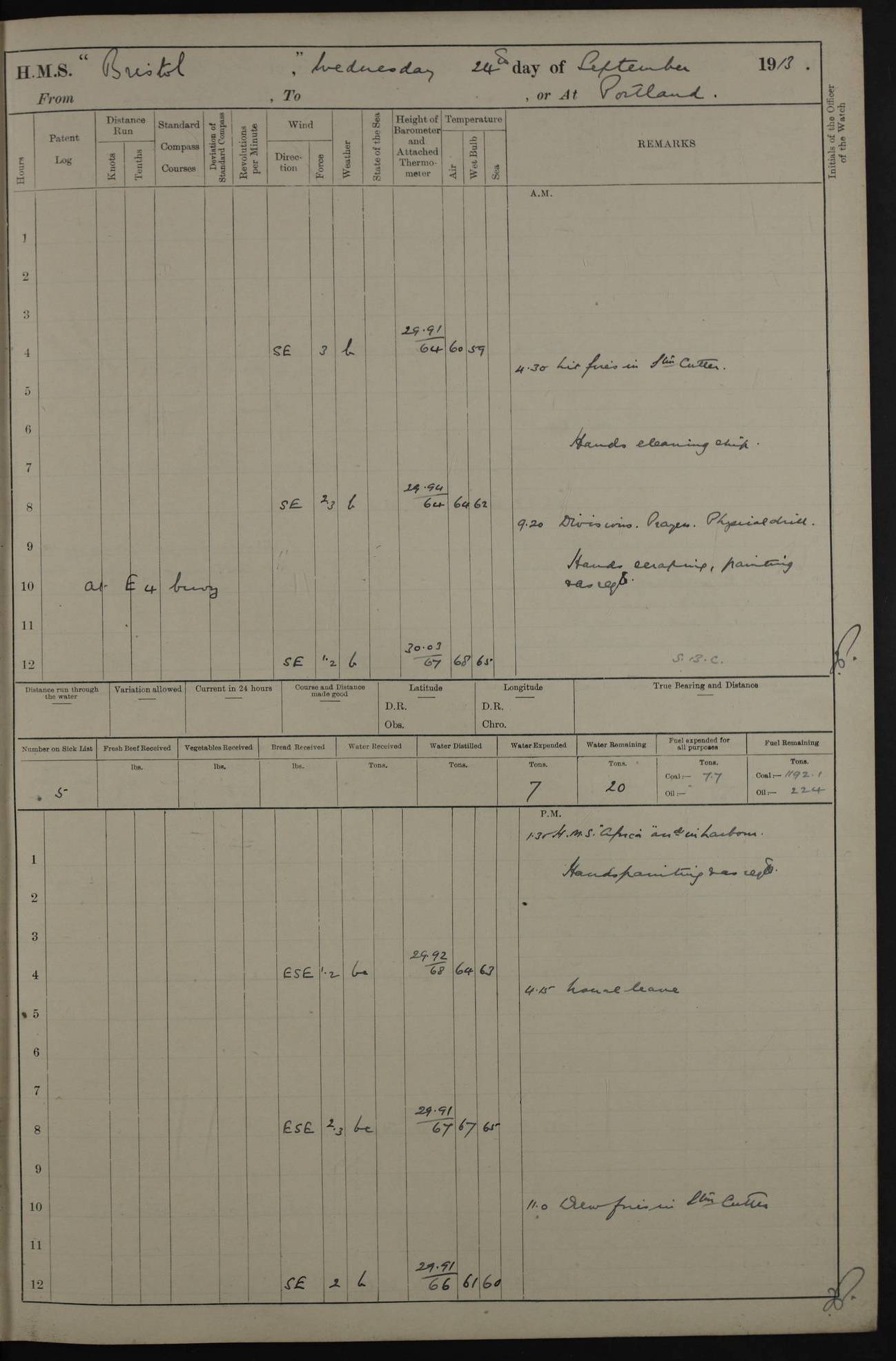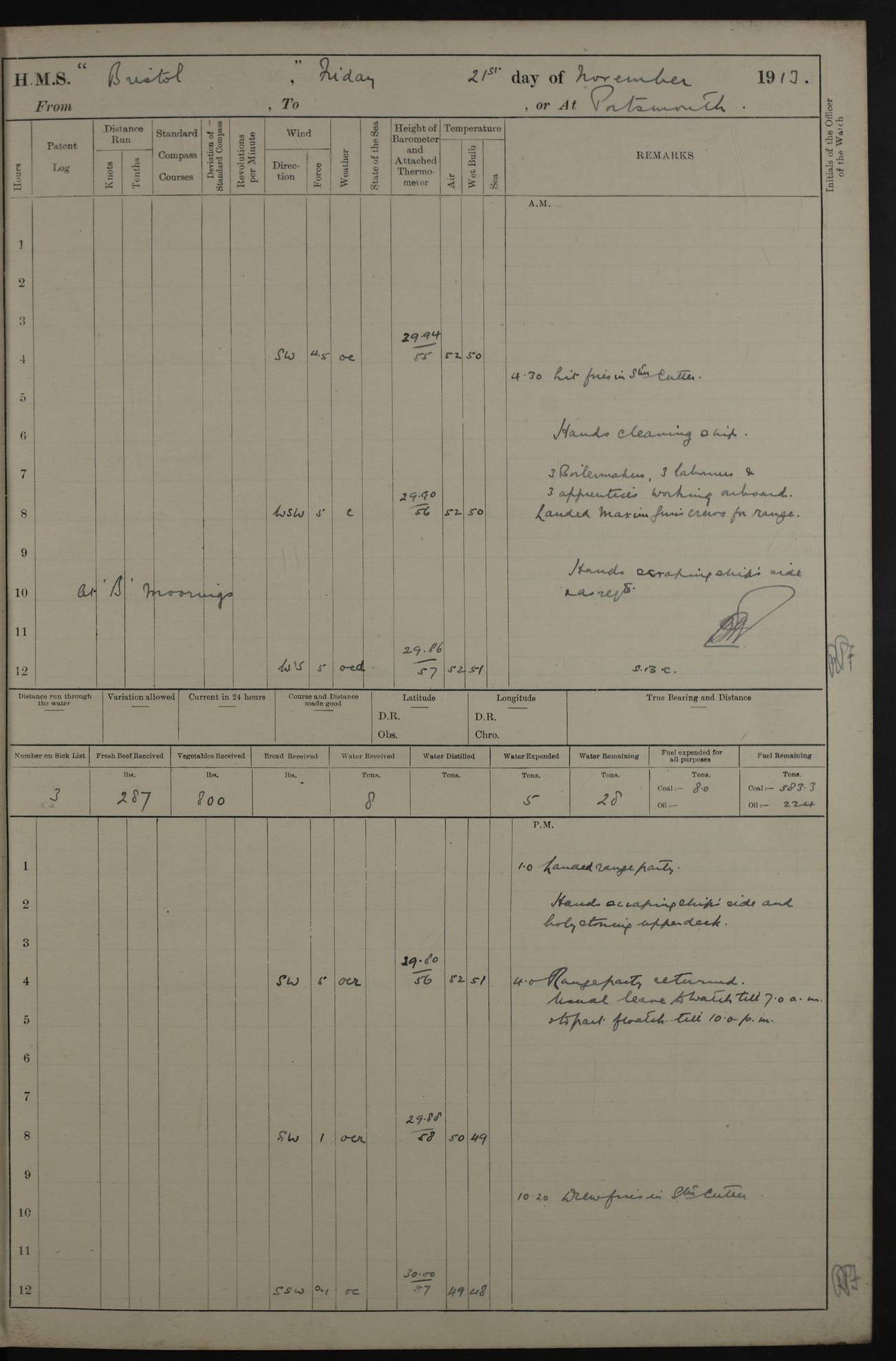 (Maps prepared using Journey Plotter, developed by Maikel. The Plots can only be approximate. They are made by joining-up positions on successive days, and sometimes positions are not given. There will therefore be occasions when the ship appears to have travelled overland) LOG BOOK – JULY 1ST 1913 TO JUNE 21ST 1914 4ef4f40ce53e0a0c91001323: (https://s3.amazonaws.com:443/oldweather/ADM53-36118/0001_0.jpg) 4ef4f40ce53e0a0c91001324: (https://s3.amazonaws.com:443/oldweather/ADM53-36118/0001_1.jpg) 4ef4f40de53e0a0c91001325: (https://s3.amazonaws.com:443/oldweather/ADM53-36118/0002_0.jpg) 4ef4f40de53e0a0c91001326: (https://s3.amazonaws.com:443/oldweather/ADM53-36118/0002_1.jpg) 4ef4f40de53e0a0c91001327: (https://s3.amazonaws.com:443/oldweather/ADM53-36118/0003_0.jpg) 4ef4f40de53e0a0c91001328: (https://s3.amazonaws.com:443/oldweather/ADM53-36118/0003_1.jpg) 4ef4f40de53e0a0c91001329: (https://s3.amazonaws.com:443/oldweather/ADM53-36118/0004_0.jpg) 4ef4f40de53e0a0c9100132a: (https://s3.amazonaws.com:443/oldweather/ADM53-36118/0004_1.jpg) LOG OF H.M.S. BRISTOL Commanded by Captain Basil Hew Fanshawe FOR THE PERIOD Commencing 1st of July 1913 Ending 21st of June 1914 Followed by her technical detail 4ef4f40de53e0a0c9100132b: (https://s3.amazonaws.com:443/oldweather/ADM53-36118/0005_0.jpg) Directions 4ef4f40de53e0a0c9100132c: (https://s3.amazonaws.com:443/oldweather/ADM53-36118/0005_1.jpg) Establishment of Ship’s Company: Full Commission: Officers: 18. Seamen: 111. Boys: 13. Marines: 28. Engine-room establishment: 168. Other non-executive ratings: 43. Total: 381 Active Commision: Officers: 14. Seamen: 53. Boys: 0. Marines: 17. Engine-room establishment: 64. Other non-executive ratings: 27. Total 175 Armament: Forecastle: 1 6” B.L. PV* Quarterdeck: 1 6” B.L. PV* Starboard waist: 5 4” B.L. PIV* Port waist: 5 4” B.L. PIV* 4 3 pounder for Saluting purpose, 2 in each battery Torpedo Two 18” submerged tubes Boats: 1 30 feet Steam Cutter 1 34 feet Cutter 2 30 feet Cutters 1 30 feet Gig 3 27 feet Whalers 2 18 feet Skiffs