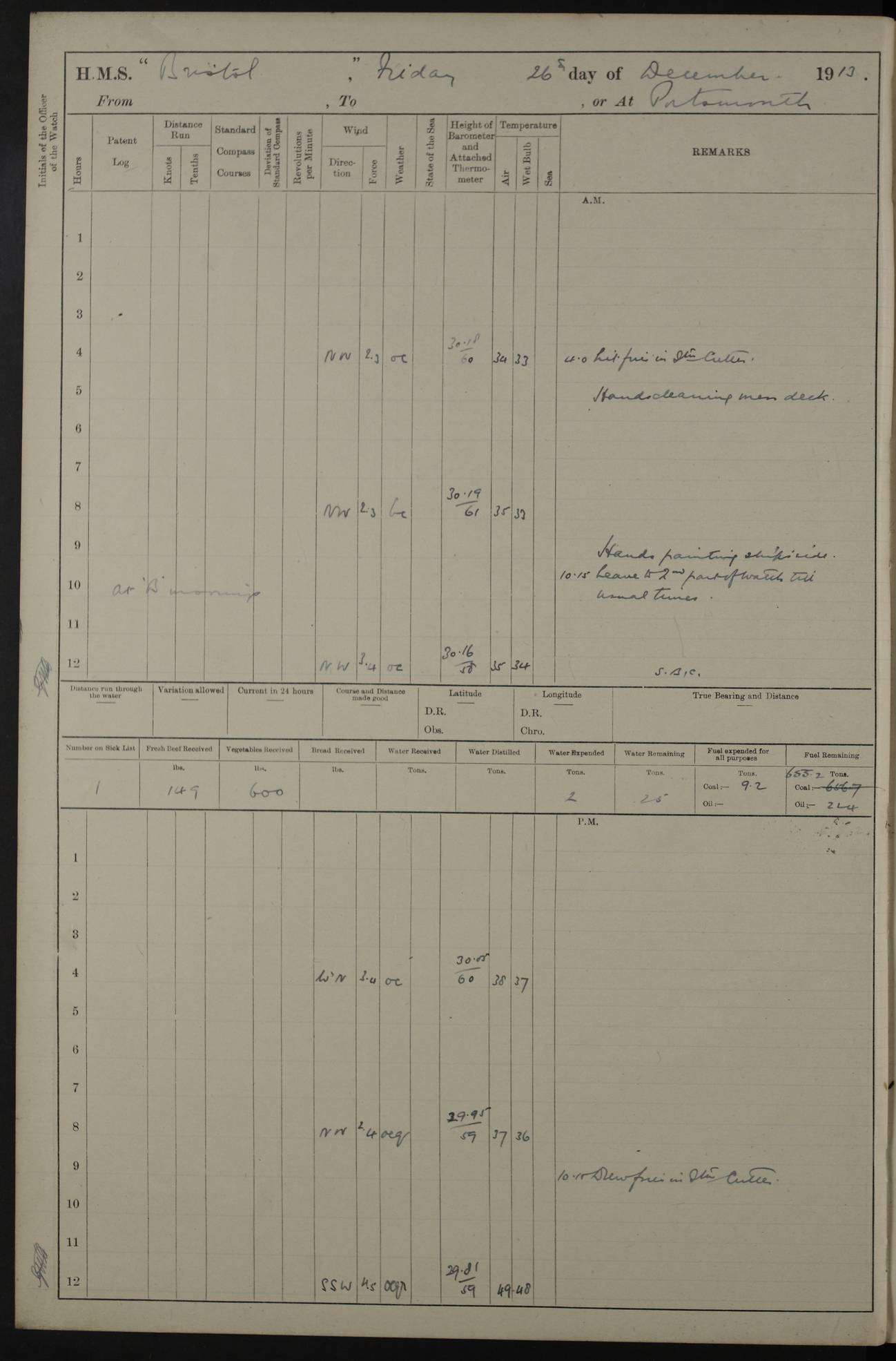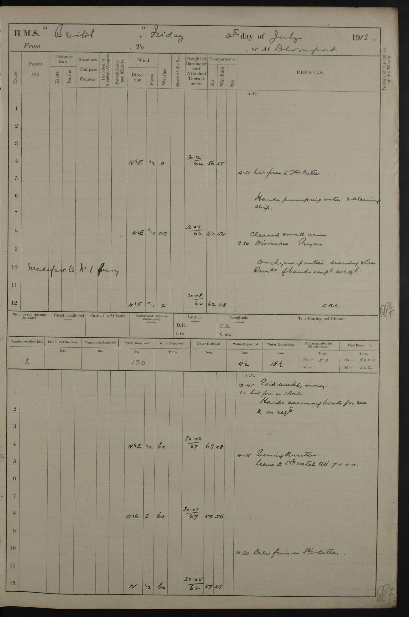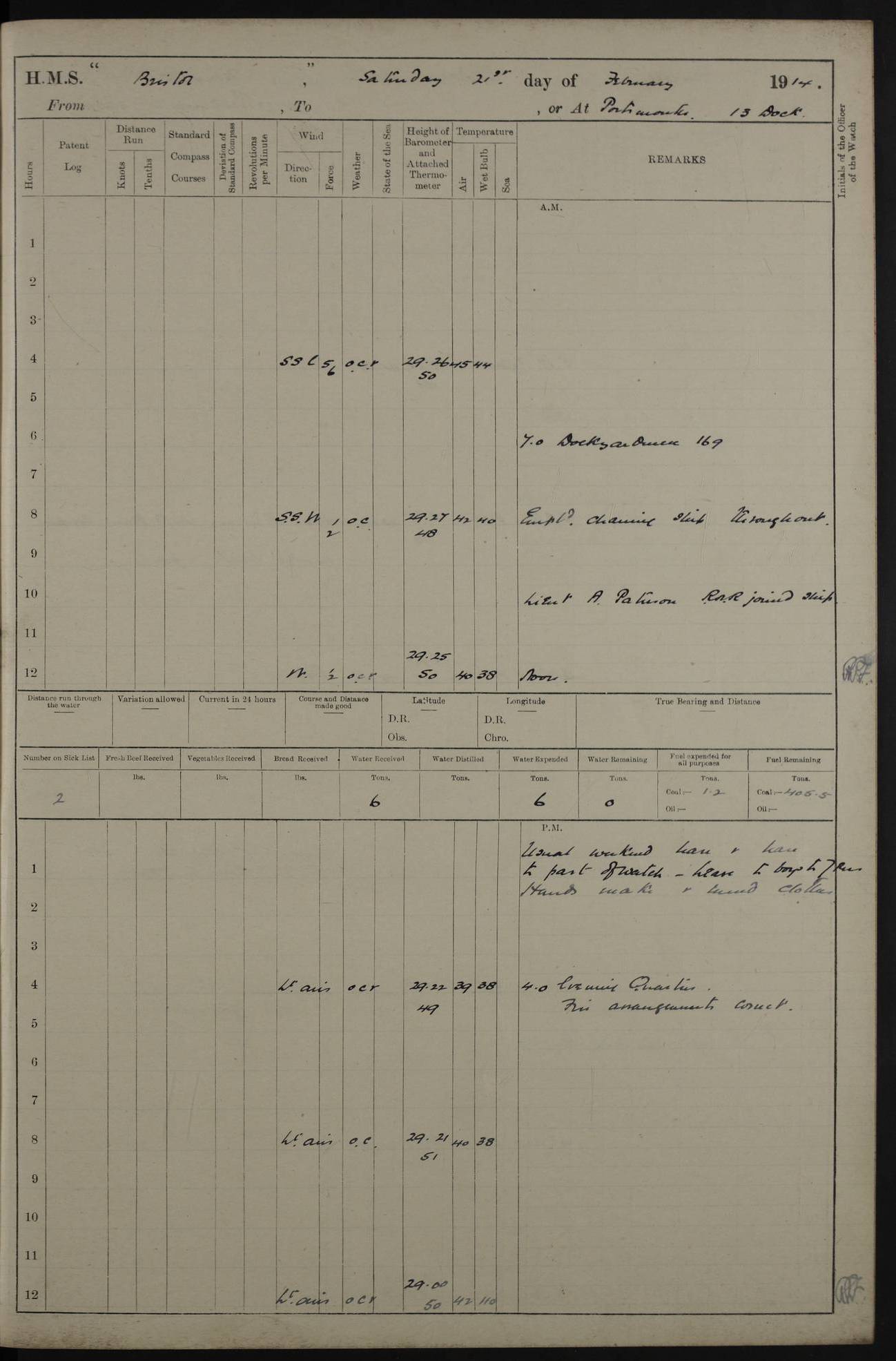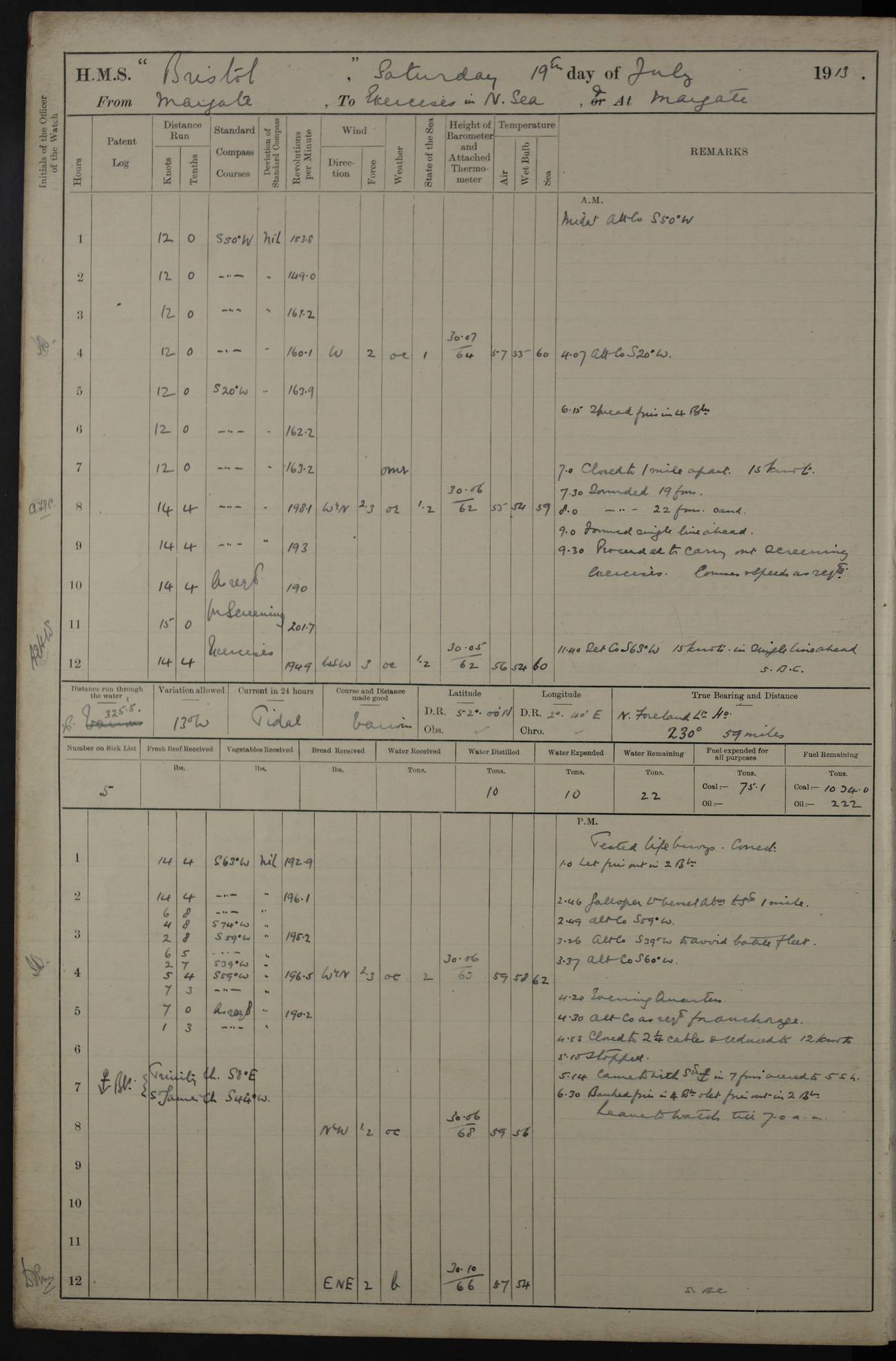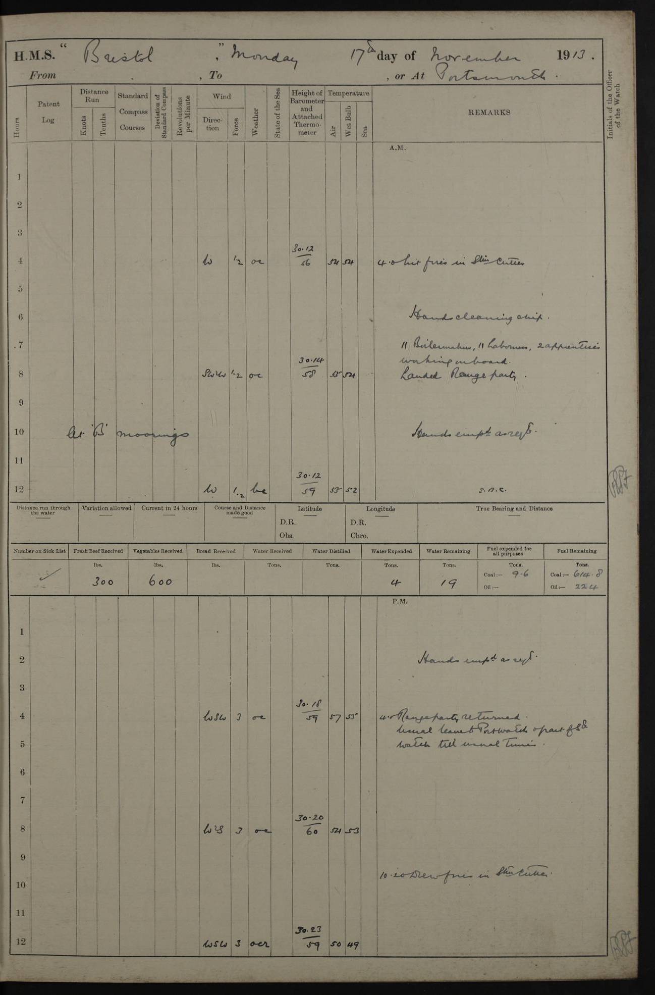 (Maps prepared using Journey Plotter, developed by Maikel. The Plots can only be approximate. They are made by joining-up positions on successive days, and sometimes positions are not given. There will therefore be occasions when the ship appears to have travelled overland) LOG BOOK – JULY 1ST 1913 TO JUNE 21ST 1914 4ef4f40ce53e0a0c91001323: (https://s3.amazonaws.com:443/oldweather/ADM53-36118/0001_0.jpg) 4ef4f40ce53e0a0c91001324: (https://s3.amazonaws.com:443/oldweather/ADM53-36118/0001_1.jpg) 4ef4f40de53e0a0c91001325: (https://s3.amazonaws.com:443/oldweather/ADM53-36118/0002_0.jpg) 4ef4f40de53e0a0c91001326: (https://s3.amazonaws.com:443/oldweather/ADM53-36118/0002_1.jpg) 4ef4f40de53e0a0c91001327: (https://s3.amazonaws.com:443/oldweather/ADM53-36118/0003_0.jpg) 4ef4f40de53e0a0c91001328: (https://s3.amazonaws.com:443/oldweather/ADM53-36118/0003_1.jpg) 4ef4f40de53e0a0c91001329: (https://s3.amazonaws.com:443/oldweather/ADM53-36118/0004_0.jpg) 4ef4f40de53e0a0c9100132a: (https://s3.amazonaws.com:443/oldweather/ADM53-36118/0004_1.jpg) LOG OF H.M.S. BRISTOL Commanded by Captain Basil Hew Fanshawe FOR THE PERIOD Commencing 1st of July 1913 Ending 21st of June 1914 Followed by her technical detail 4ef4f40de53e0a0c9100132b: (https://s3.amazonaws.com:443/oldweather/ADM53-36118/0005_0.jpg) Directions 4ef4f40de53e0a0c9100132c: (https://s3.amazonaws.com:443/oldweather/ADM53-36118/0005_1.jpg) Establishment of Ship’s Company: Full Commission: Officers: 18. Seamen: 111. Boys: 13. Marines: 28. Engine-room establishment: 168. Other non-executive ratings: 43. Total: 381 Active Commision: Officers: 14. Seamen: 53. Boys: 0. Marines: 17. Engine-room establishment: 64. Other non-executive ratings: 27. Total 175 Armament: Forecastle: 1 6” B.L. PV* Quarterdeck: 1 6” B.L. PV* Starboard waist: 5 4” B.L. PIV* Port waist: 5 4” B.L. PIV* 4 3 pounder for Saluting purpose, 2 in each battery Torpedo Two 18” submerged tubes Boats: 1 30 feet Steam Cutter 1 34 feet Cutter 2 30 feet Cutters 1 30 feet Gig 3 27 feet Whalers 2 18 feet Skiffs