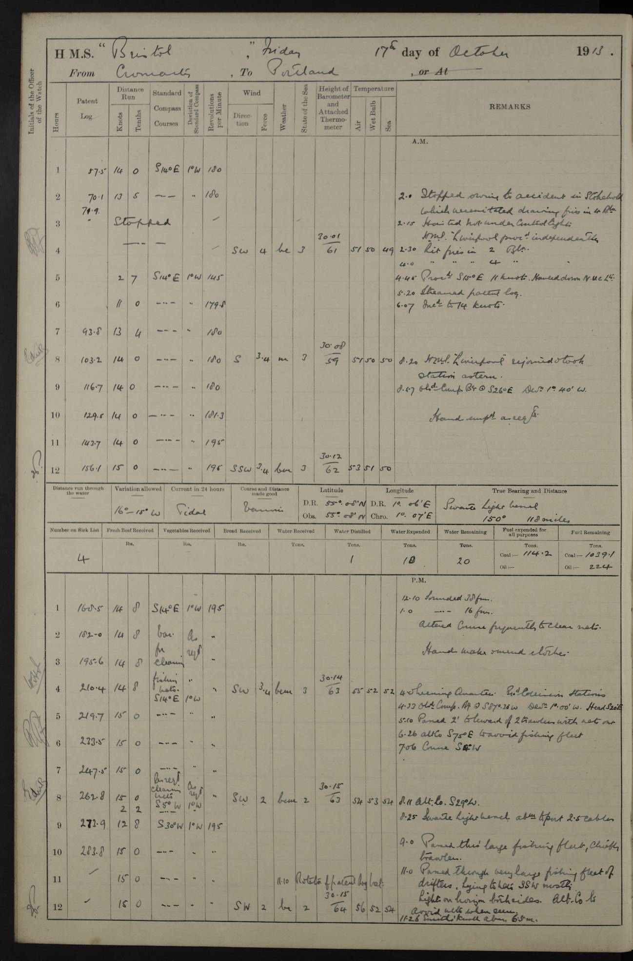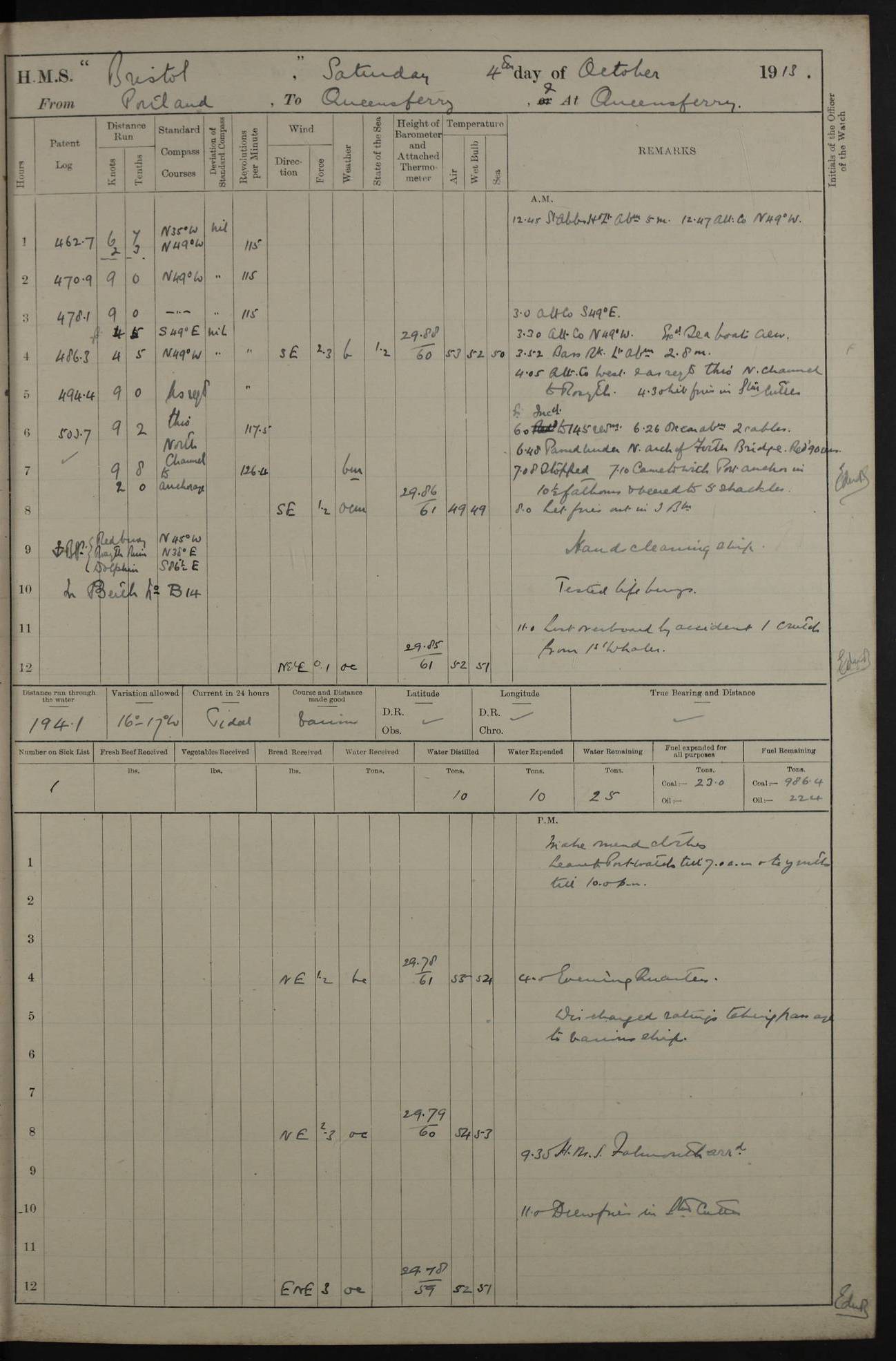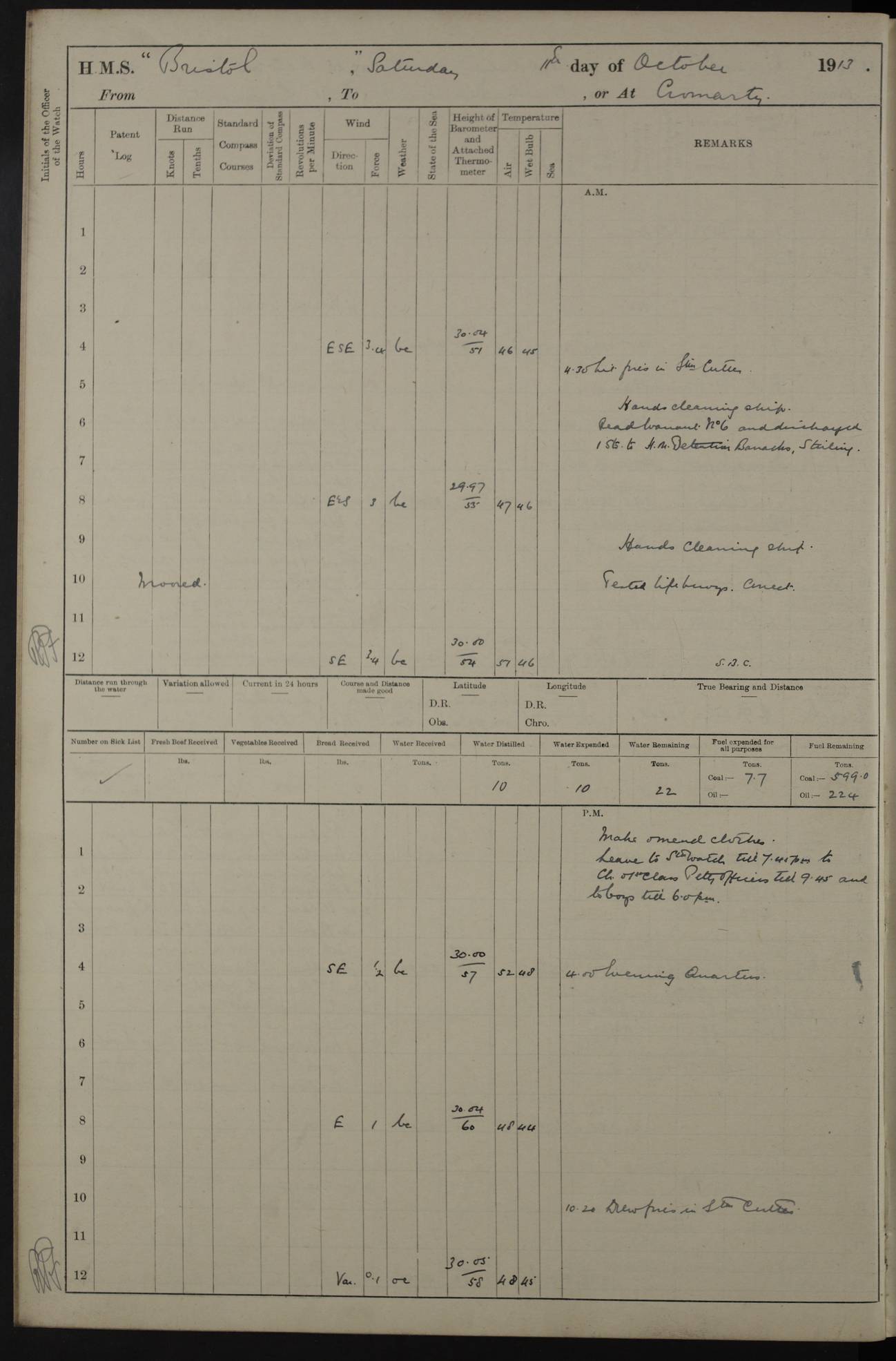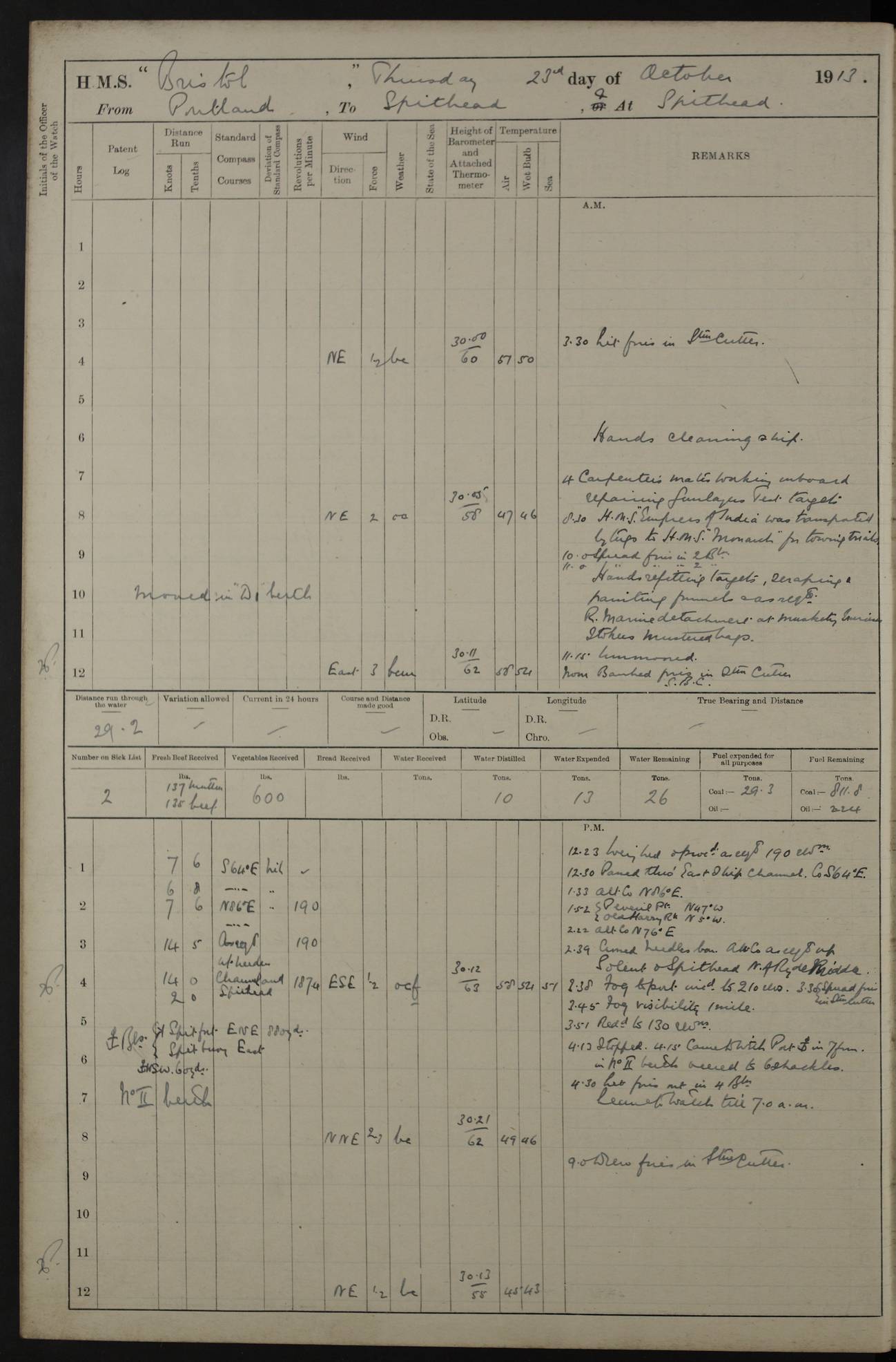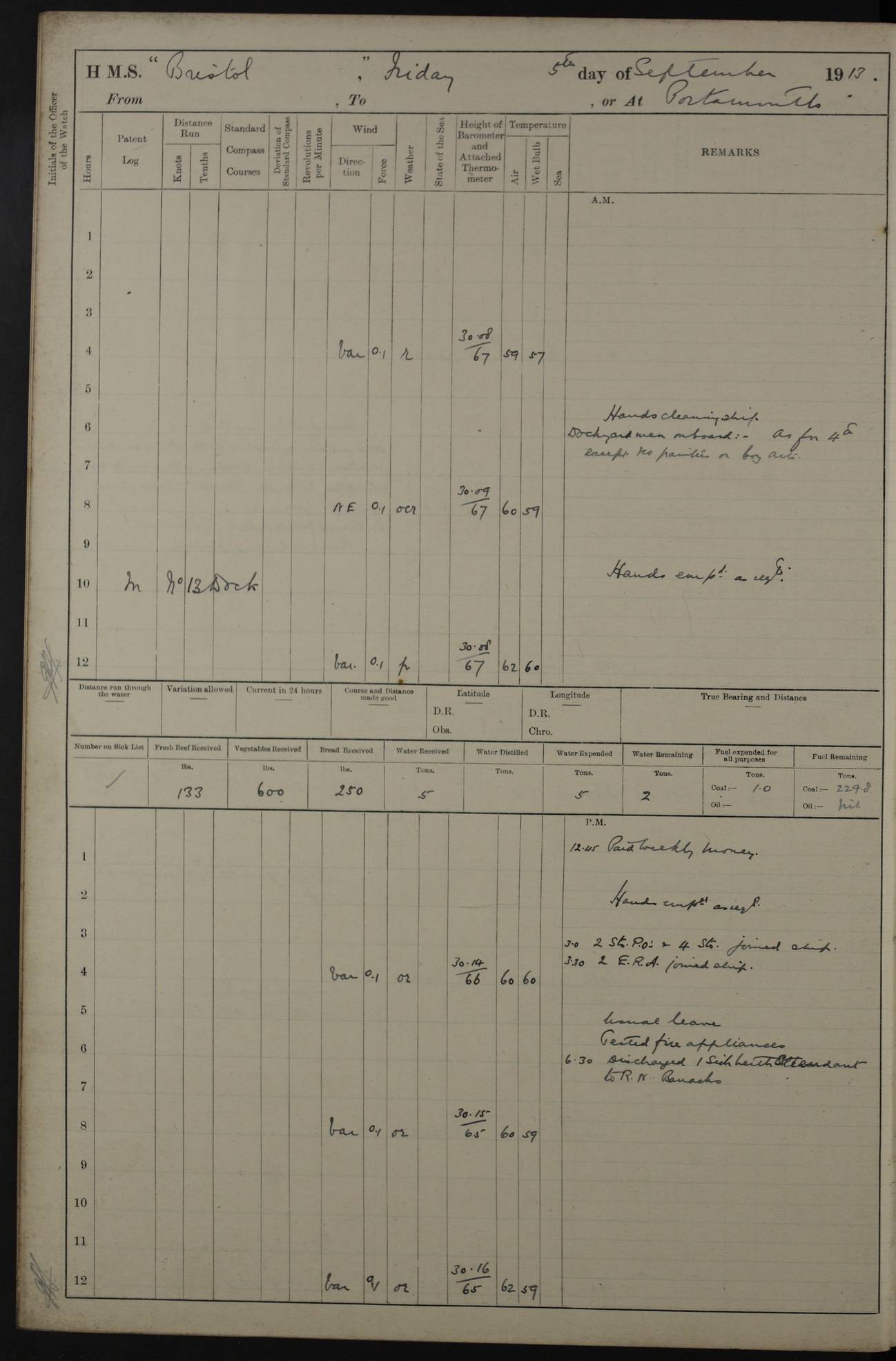 (Maps prepared using Journey Plotter, developed by Maikel. The Plots can only be approximate. They are made by joining-up positions on successive days, and sometimes positions are not given. There will therefore be occasions when the ship appears to have travelled overland) LOG BOOK – JULY 1ST 1913 TO JUNE 21ST 1914 4ef4f40ce53e0a0c91001323: (https://s3.amazonaws.com:443/oldweather/ADM53-36118/0001_0.jpg) 4ef4f40ce53e0a0c91001324: (https://s3.amazonaws.com:443/oldweather/ADM53-36118/0001_1.jpg) 4ef4f40de53e0a0c91001325: (https://s3.amazonaws.com:443/oldweather/ADM53-36118/0002_0.jpg) 4ef4f40de53e0a0c91001326: (https://s3.amazonaws.com:443/oldweather/ADM53-36118/0002_1.jpg) 4ef4f40de53e0a0c91001327: (https://s3.amazonaws.com:443/oldweather/ADM53-36118/0003_0.jpg) 4ef4f40de53e0a0c91001328: (https://s3.amazonaws.com:443/oldweather/ADM53-36118/0003_1.jpg) 4ef4f40de53e0a0c91001329: (https://s3.amazonaws.com:443/oldweather/ADM53-36118/0004_0.jpg) 4ef4f40de53e0a0c9100132a: (https://s3.amazonaws.com:443/oldweather/ADM53-36118/0004_1.jpg) LOG OF H.M.S. BRISTOL Commanded by Captain Basil Hew Fanshawe FOR THE PERIOD Commencing 1st of July 1913 Ending 21st of June 1914 Followed by her technical detail 4ef4f40de53e0a0c9100132b: (https://s3.amazonaws.com:443/oldweather/ADM53-36118/0005_0.jpg) Directions 4ef4f40de53e0a0c9100132c: (https://s3.amazonaws.com:443/oldweather/ADM53-36118/0005_1.jpg) Establishment of Ship’s Company: Full Commission: Officers: 18. Seamen: 111. Boys: 13. Marines: 28. Engine-room establishment: 168. Other non-executive ratings: 43. Total: 381 Active Commision: Officers: 14. Seamen: 53. Boys: 0. Marines: 17. Engine-room establishment: 64. Other non-executive ratings: 27. Total 175 Armament: Forecastle: 1 6” B.L. PV* Quarterdeck: 1 6” B.L. PV* Starboard waist: 5 4” B.L. PIV* Port waist: 5 4” B.L. PIV* 4 3 pounder for Saluting purpose, 2 in each battery Torpedo Two 18” submerged tubes Boats: 1 30 feet Steam Cutter 1 34 feet Cutter 2 30 feet Cutters 1 30 feet Gig 3 27 feet Whalers 2 18 feet Skiffs