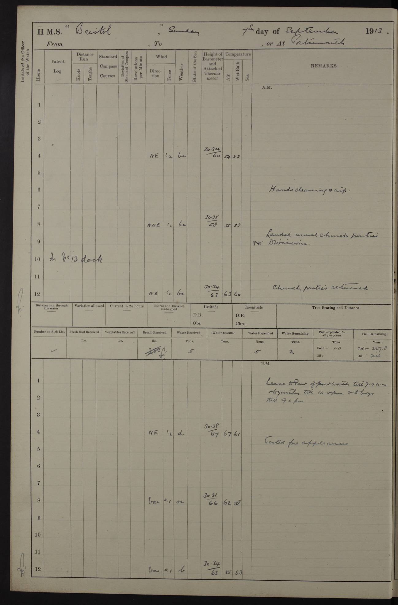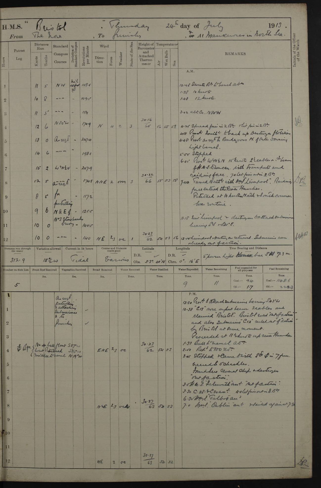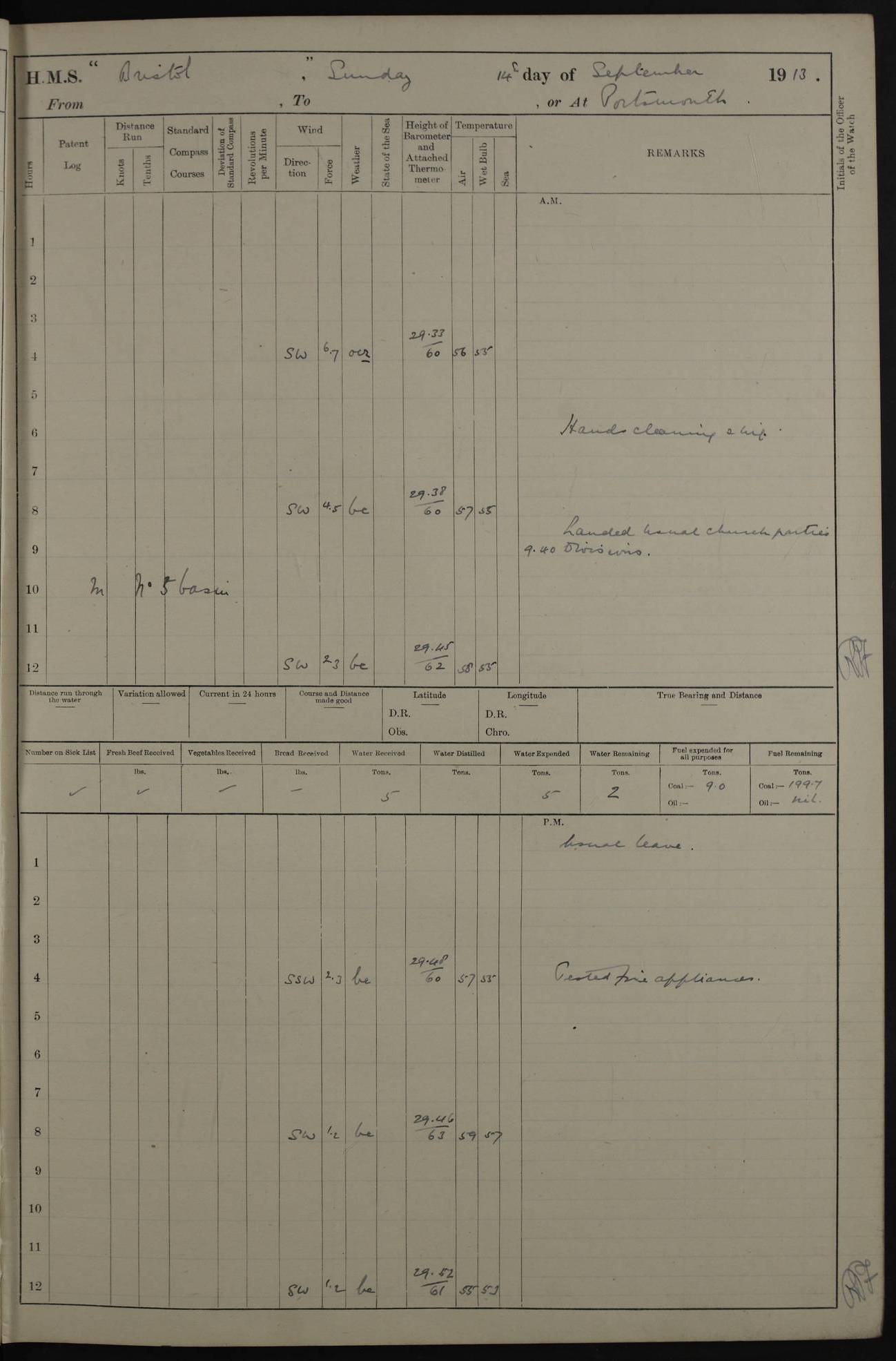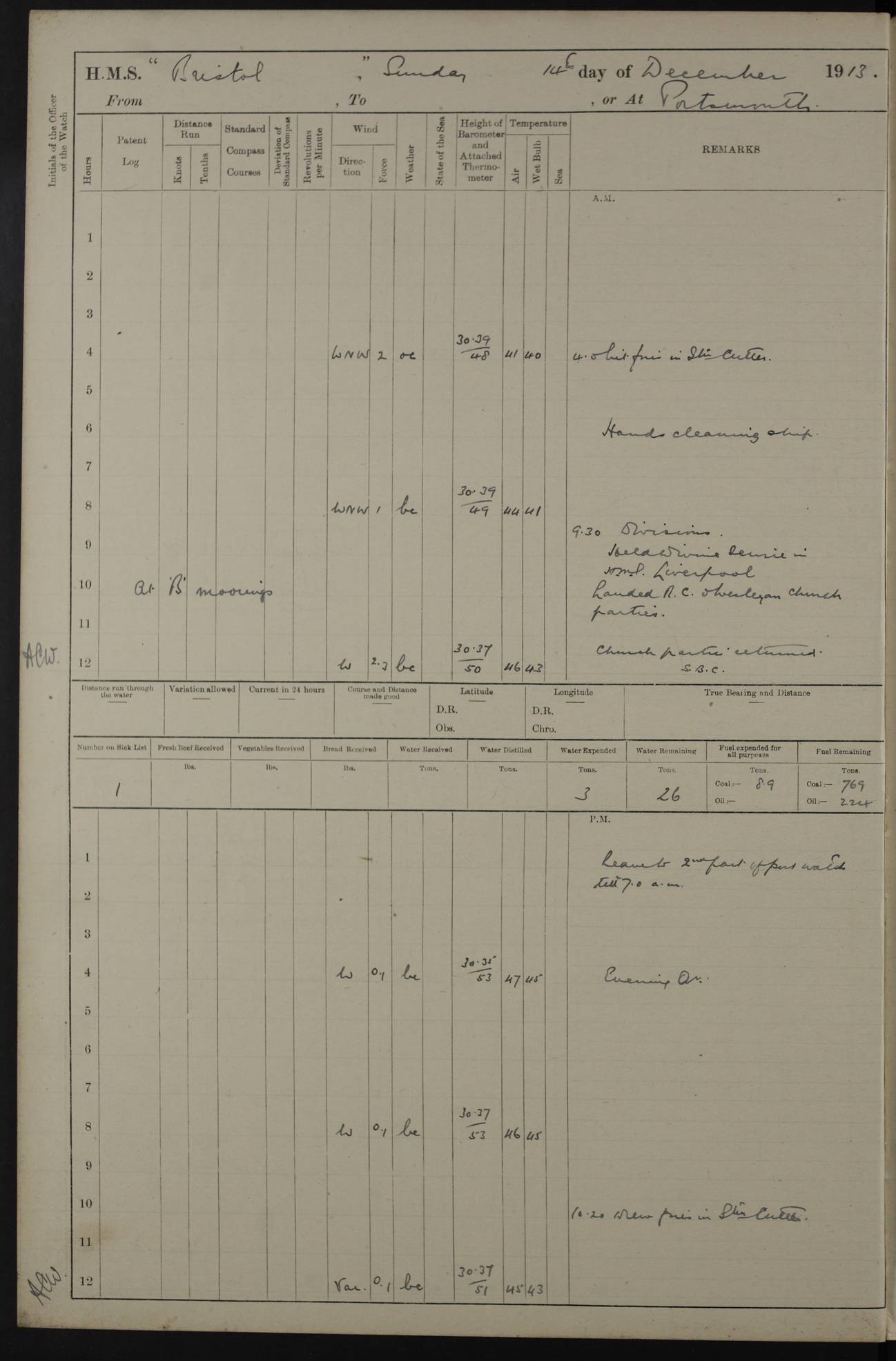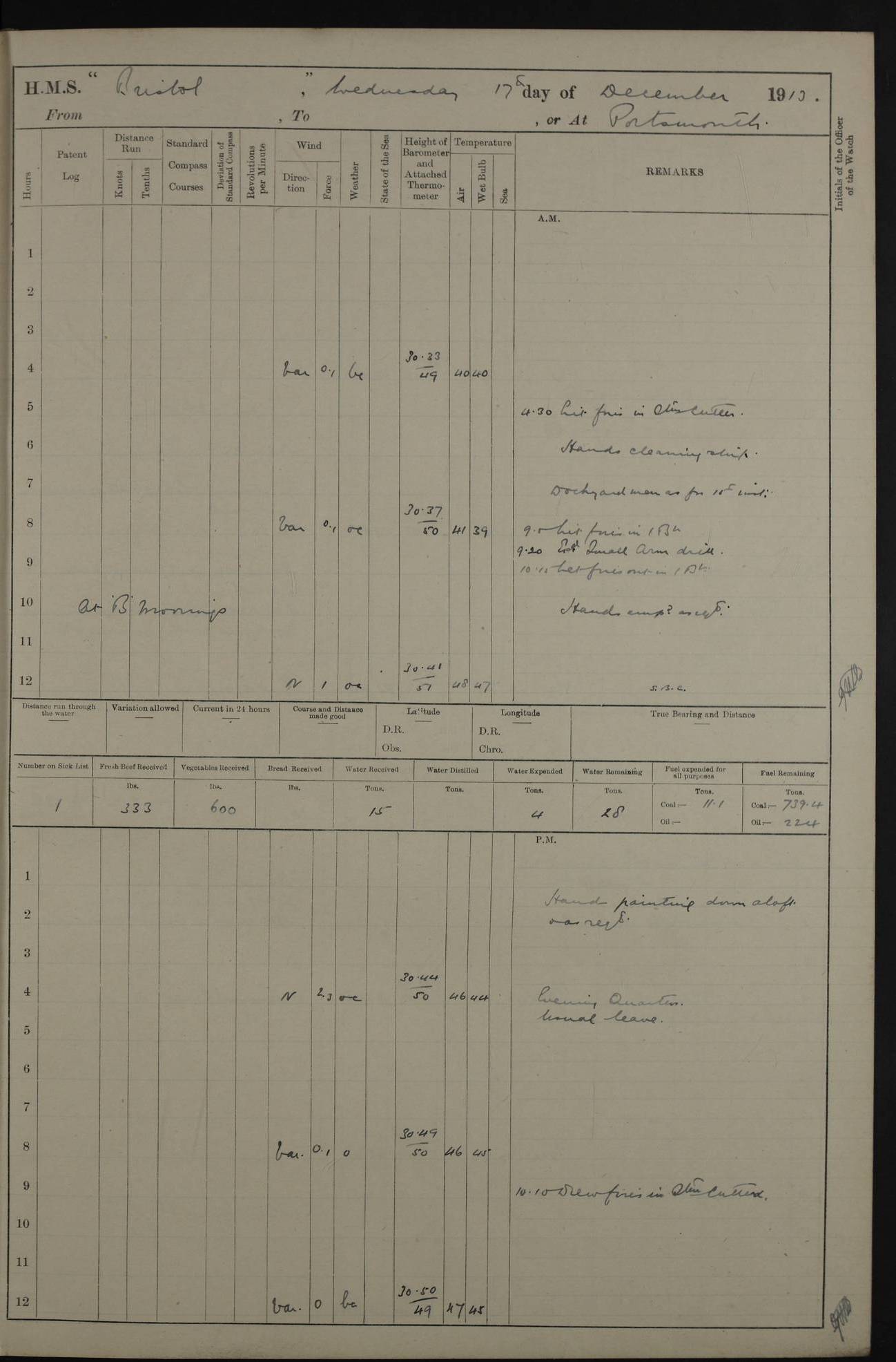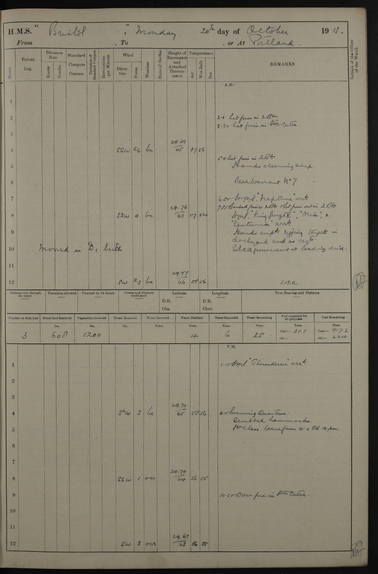 (Maps prepared using Journey Plotter, developed by Maikel. The Plots can only be approximate. They are made by joining-up positions on successive days, and sometimes positions are not given. There will therefore be occasions when the ship appears to have travelled overland) LOG BOOK – JULY 1ST 1913 TO JUNE 21ST 1914 4ef4f40ce53e0a0c91001323: (https://s3.amazonaws.com:443/oldweather/ADM53-36118/0001_0.jpg) 4ef4f40ce53e0a0c91001324: (https://s3.amazonaws.com:443/oldweather/ADM53-36118/0001_1.jpg) 4ef4f40de53e0a0c91001325: (https://s3.amazonaws.com:443/oldweather/ADM53-36118/0002_0.jpg) 4ef4f40de53e0a0c91001326: (https://s3.amazonaws.com:443/oldweather/ADM53-36118/0002_1.jpg) 4ef4f40de53e0a0c91001327: (https://s3.amazonaws.com:443/oldweather/ADM53-36118/0003_0.jpg) 4ef4f40de53e0a0c91001328: (https://s3.amazonaws.com:443/oldweather/ADM53-36118/0003_1.jpg) 4ef4f40de53e0a0c91001329: (https://s3.amazonaws.com:443/oldweather/ADM53-36118/0004_0.jpg) 4ef4f40de53e0a0c9100132a: (https://s3.amazonaws.com:443/oldweather/ADM53-36118/0004_1.jpg) LOG OF H.M.S. BRISTOL Commanded by Captain Basil Hew Fanshawe FOR THE PERIOD Commencing 1st of July 1913 Ending 21st of June 1914 Followed by her technical detail 4ef4f40de53e0a0c9100132b: (https://s3.amazonaws.com:443/oldweather/ADM53-36118/0005_0.jpg) Directions 4ef4f40de53e0a0c9100132c: (https://s3.amazonaws.com:443/oldweather/ADM53-36118/0005_1.jpg) Establishment of Ship’s Company: Full Commission: Officers: 18. Seamen: 111. Boys: 13. Marines: 28. Engine-room establishment: 168. Other non-executive ratings: 43. Total: 381 Active Commision: Officers: 14. Seamen: 53. Boys: 0. Marines: 17. Engine-room establishment: 64. Other non-executive ratings: 27. Total 175 Armament: Forecastle: 1 6” B.L. PV* Quarterdeck: 1 6” B.L. PV* Starboard waist: 5 4” B.L. PIV* Port waist: 5 4” B.L. PIV* 4 3 pounder for Saluting purpose, 2 in each battery Torpedo Two 18” submerged tubes Boats: 1 30 feet Steam Cutter 1 34 feet Cutter 2 30 feet Cutters 1 30 feet Gig 3 27 feet Whalers 2 18 feet Skiffs