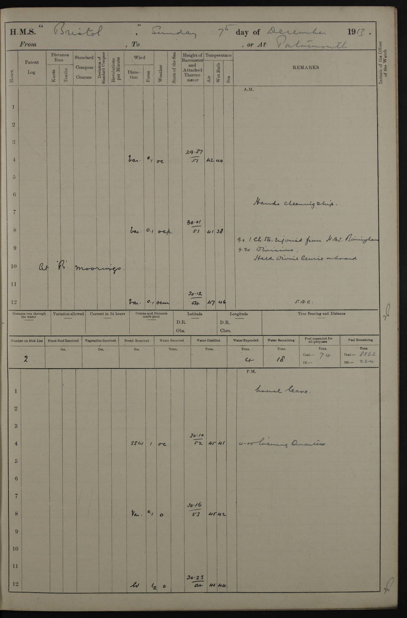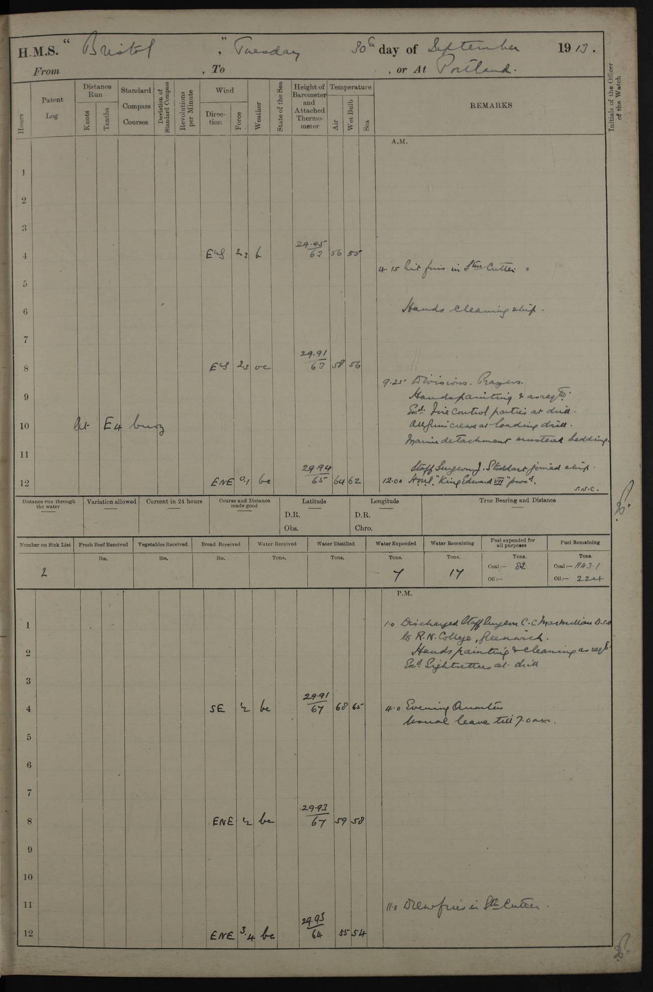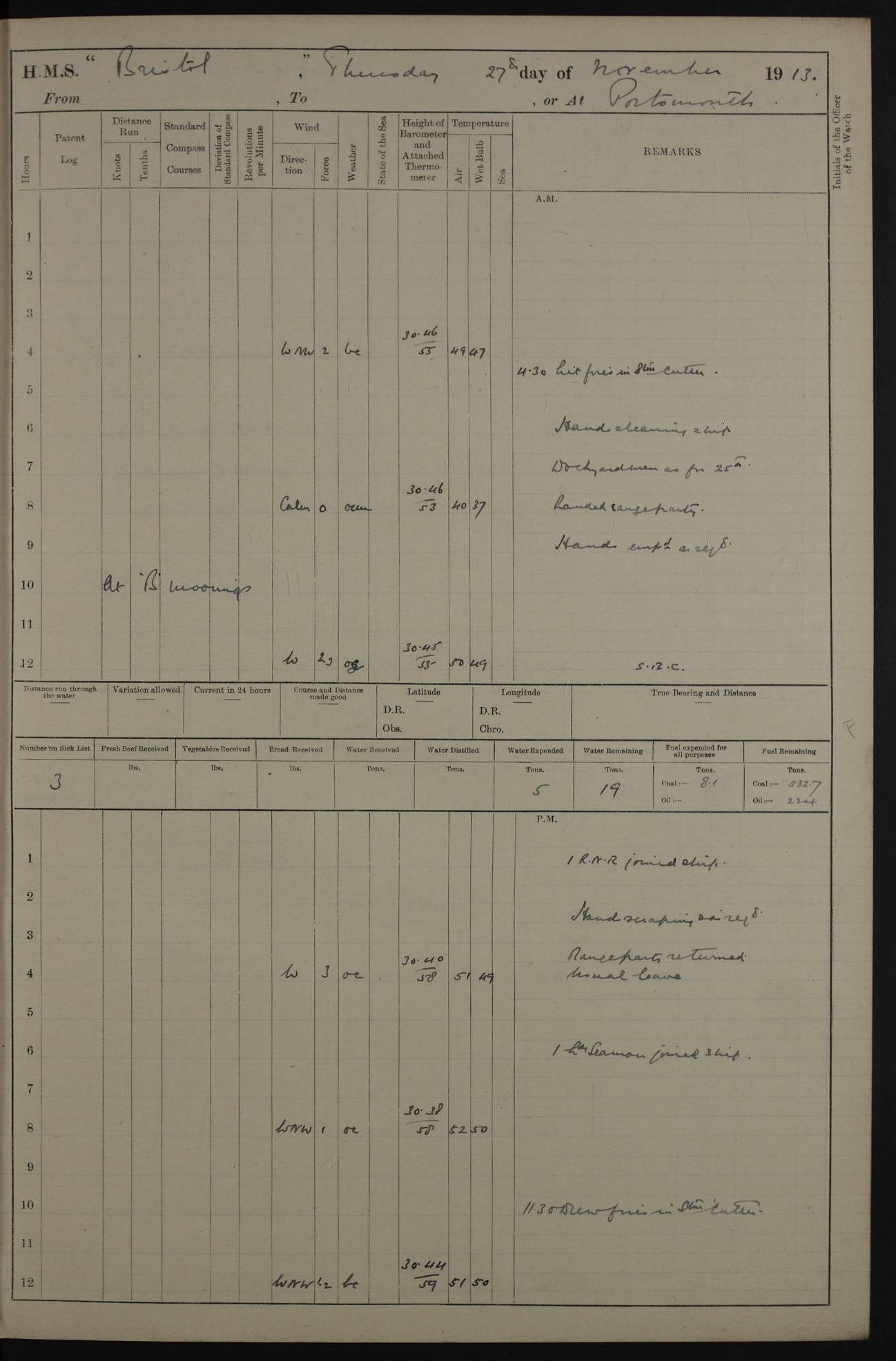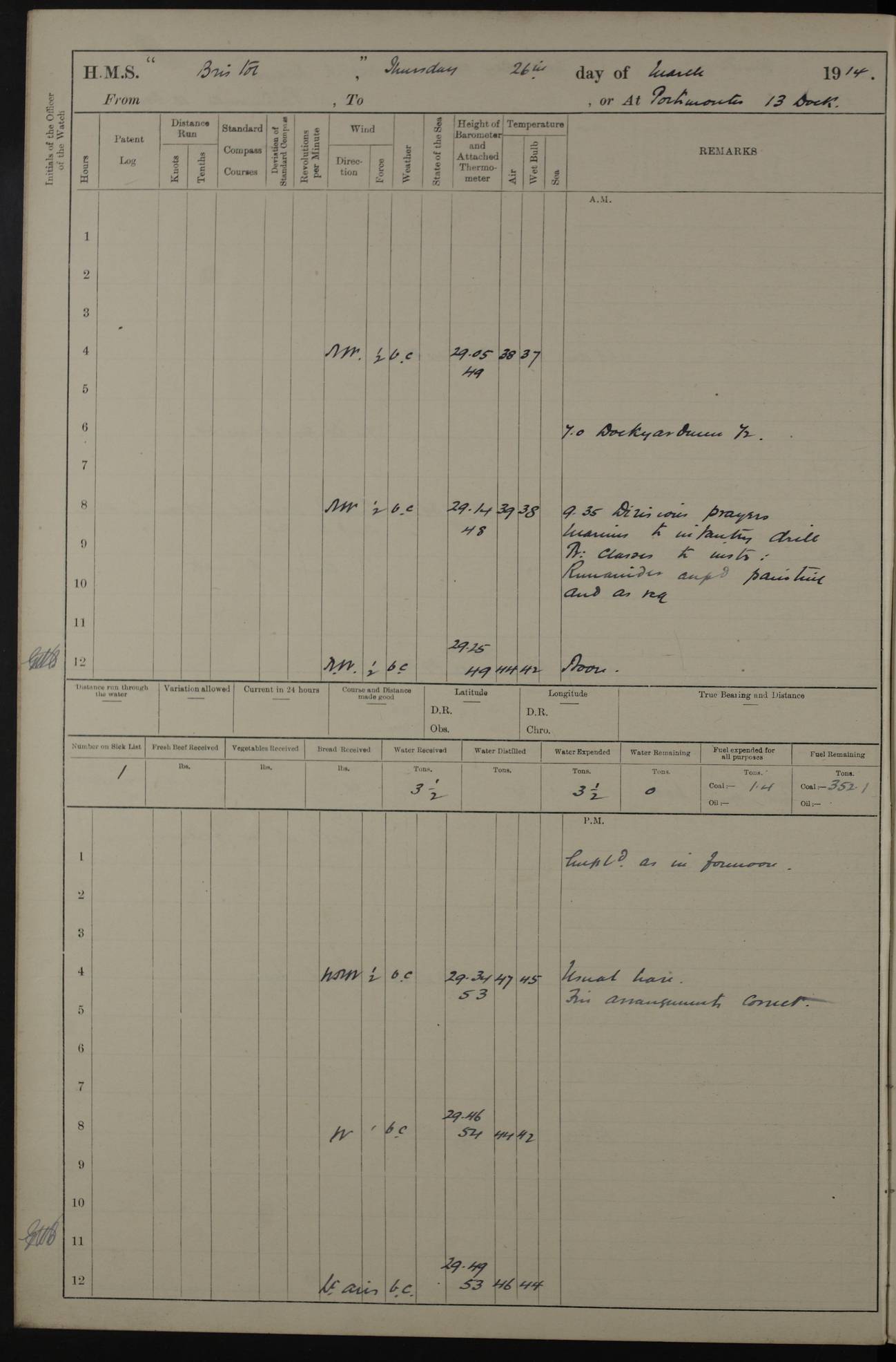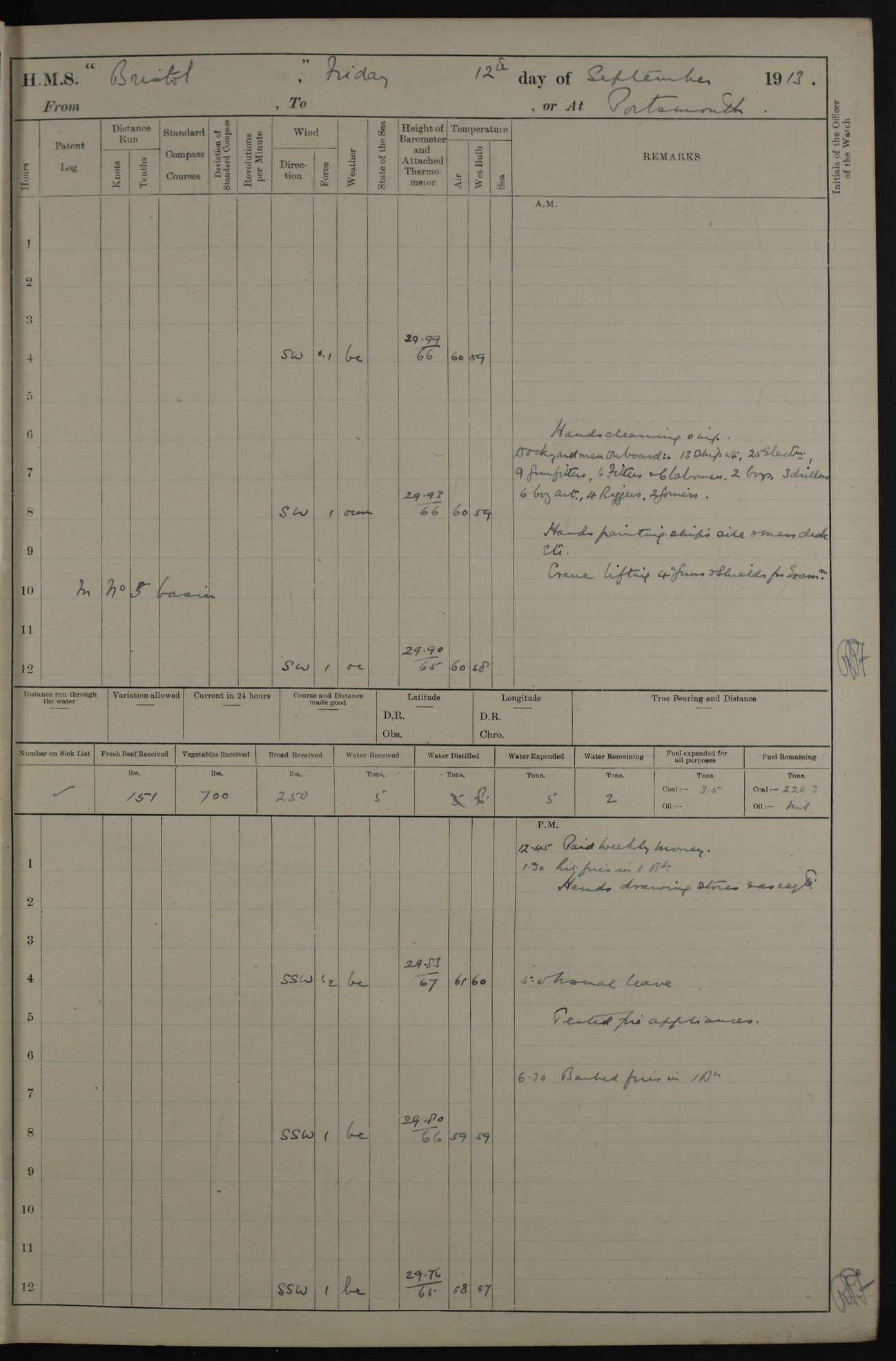 (Maps prepared using Journey Plotter, developed by Maikel. The Plots can only be approximate. They are made by joining-up positions on successive days, and sometimes positions are not given. There will therefore be occasions when the ship appears to have travelled overland) LOG BOOK – JULY 1ST 1913 TO JUNE 21ST 1914 4ef4f40ce53e0a0c91001323: (https://s3.amazonaws.com:443/oldweather/ADM53-36118/0001_0.jpg) 4ef4f40ce53e0a0c91001324: (https://s3.amazonaws.com:443/oldweather/ADM53-36118/0001_1.jpg) 4ef4f40de53e0a0c91001325: (https://s3.amazonaws.com:443/oldweather/ADM53-36118/0002_0.jpg) 4ef4f40de53e0a0c91001326: (https://s3.amazonaws.com:443/oldweather/ADM53-36118/0002_1.jpg) 4ef4f40de53e0a0c91001327: (https://s3.amazonaws.com:443/oldweather/ADM53-36118/0003_0.jpg) 4ef4f40de53e0a0c91001328: (https://s3.amazonaws.com:443/oldweather/ADM53-36118/0003_1.jpg) 4ef4f40de53e0a0c91001329: (https://s3.amazonaws.com:443/oldweather/ADM53-36118/0004_0.jpg) 4ef4f40de53e0a0c9100132a: (https://s3.amazonaws.com:443/oldweather/ADM53-36118/0004_1.jpg) LOG OF H.M.S. BRISTOL Commanded by Captain Basil Hew Fanshawe FOR THE PERIOD Commencing 1st of July 1913 Ending 21st of June 1914 Followed by her technical detail 4ef4f40de53e0a0c9100132b: (https://s3.amazonaws.com:443/oldweather/ADM53-36118/0005_0.jpg) Directions 4ef4f40de53e0a0c9100132c: (https://s3.amazonaws.com:443/oldweather/ADM53-36118/0005_1.jpg) Establishment of Ship’s Company: Full Commission: Officers: 18. Seamen: 111. Boys: 13. Marines: 28. Engine-room establishment: 168. Other non-executive ratings: 43. Total: 381 Active Commision: Officers: 14. Seamen: 53. Boys: 0. Marines: 17. Engine-room establishment: 64. Other non-executive ratings: 27. Total 175 Armament: Forecastle: 1 6” B.L. PV* Quarterdeck: 1 6” B.L. PV* Starboard waist: 5 4” B.L. PIV* Port waist: 5 4” B.L. PIV* 4 3 pounder for Saluting purpose, 2 in each battery Torpedo Two 18” submerged tubes Boats: 1 30 feet Steam Cutter 1 34 feet Cutter 2 30 feet Cutters 1 30 feet Gig 3 27 feet Whalers 2 18 feet Skiffs