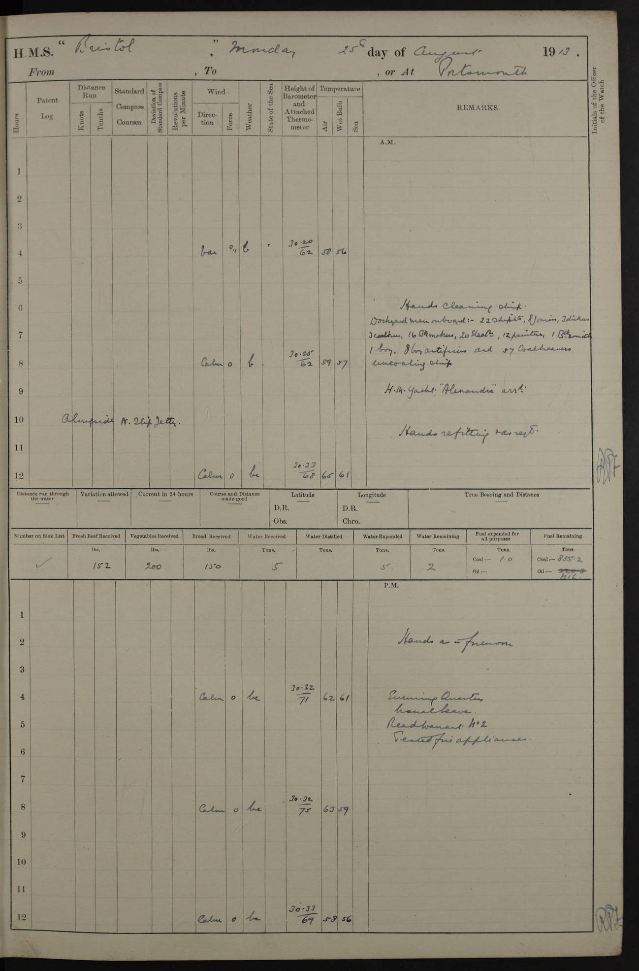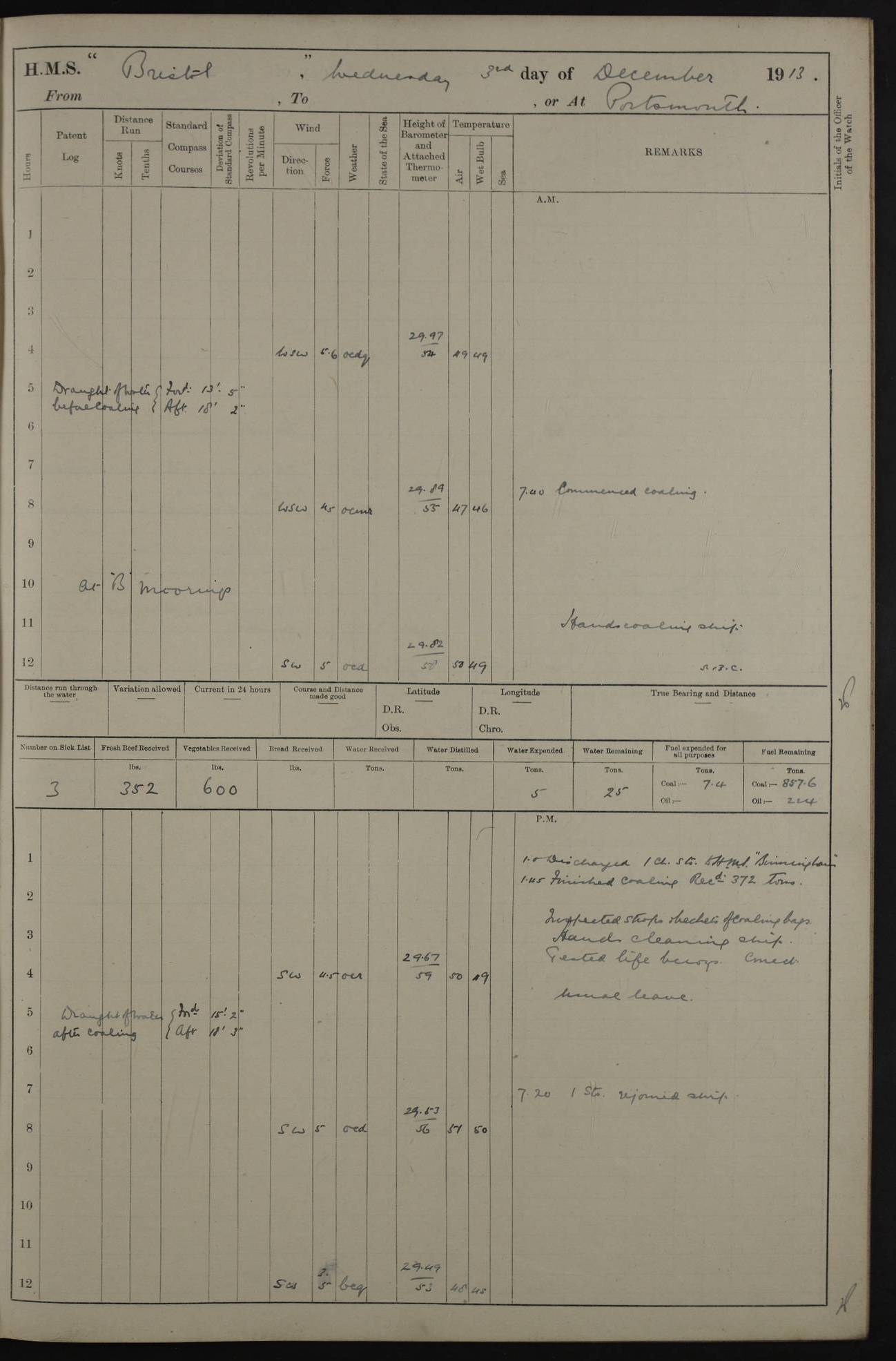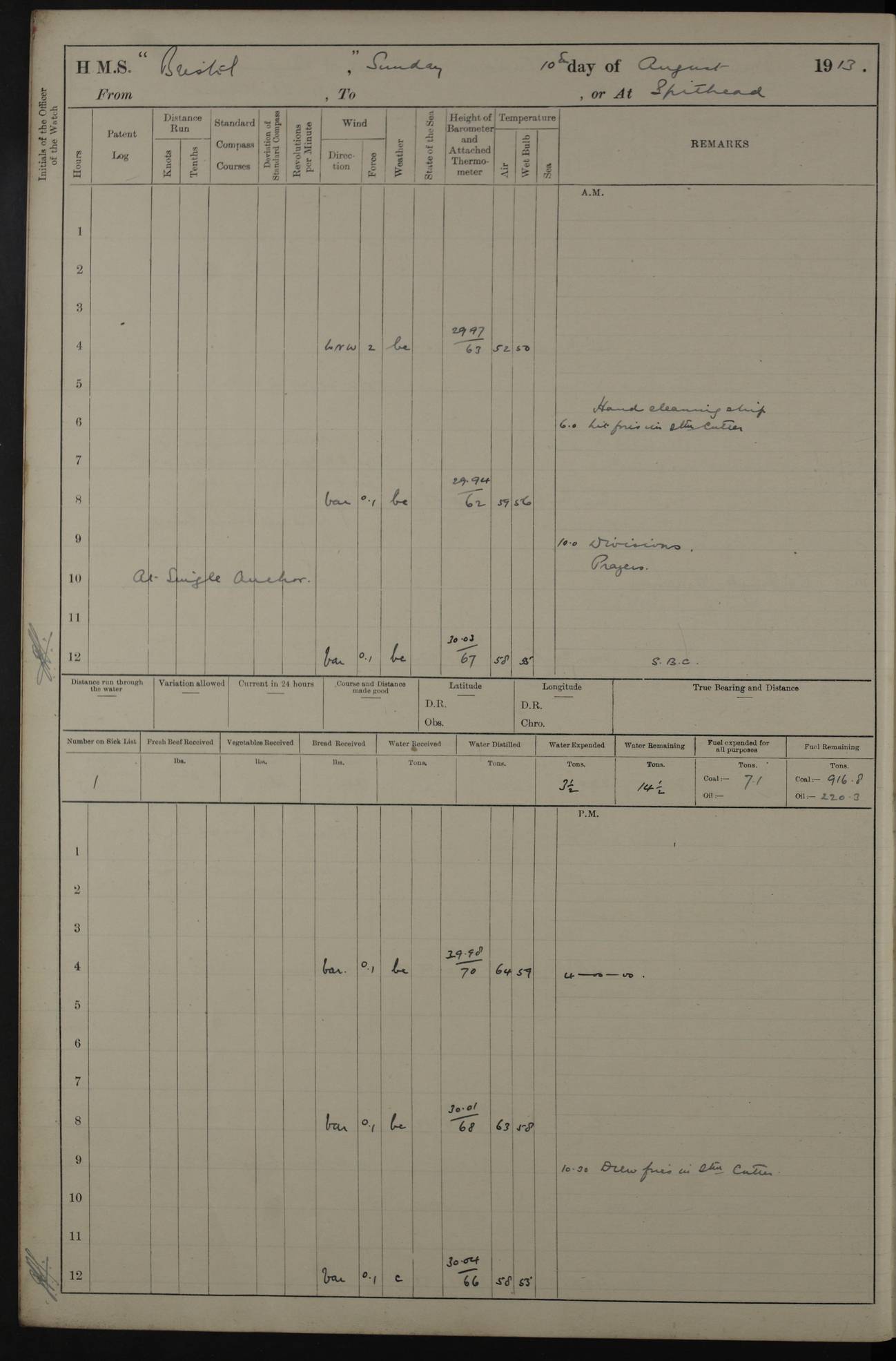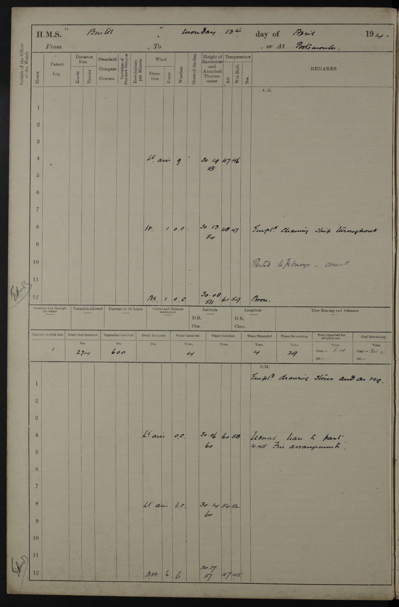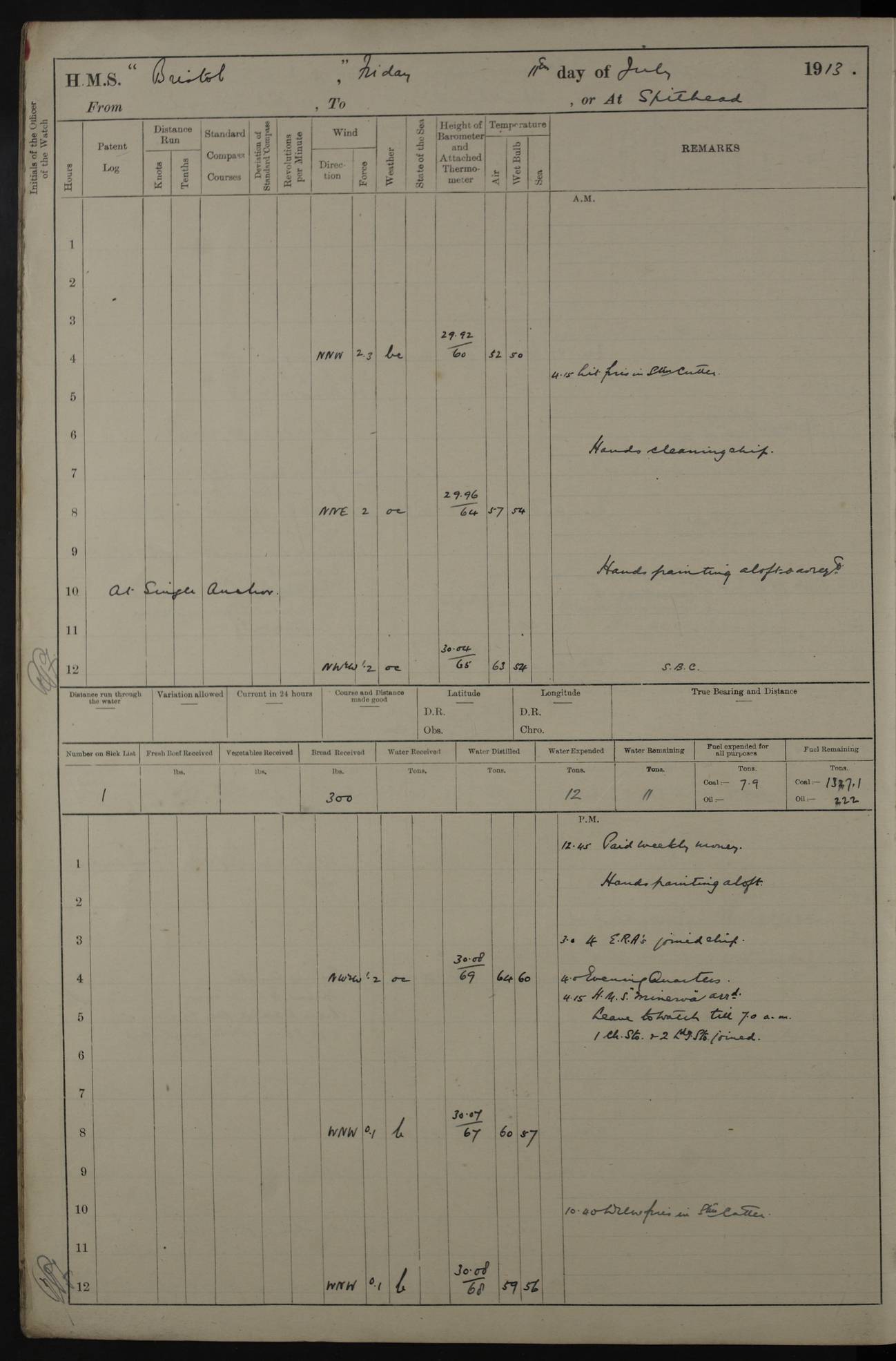 (Maps prepared using Journey Plotter, developed by Maikel. The Plots can only be approximate. They are made by joining-up positions on successive days, and sometimes positions are not given. There will therefore be occasions when the ship appears to have travelled overland) LOG BOOK – JULY 1ST 1913 TO JUNE 21ST 1914 4ef4f40ce53e0a0c91001323: (https://s3.amazonaws.com:443/oldweather/ADM53-36118/0001_0.jpg) 4ef4f40ce53e0a0c91001324: (https://s3.amazonaws.com:443/oldweather/ADM53-36118/0001_1.jpg) 4ef4f40de53e0a0c91001325: (https://s3.amazonaws.com:443/oldweather/ADM53-36118/0002_0.jpg) 4ef4f40de53e0a0c91001326: (https://s3.amazonaws.com:443/oldweather/ADM53-36118/0002_1.jpg) 4ef4f40de53e0a0c91001327: (https://s3.amazonaws.com:443/oldweather/ADM53-36118/0003_0.jpg) 4ef4f40de53e0a0c91001328: (https://s3.amazonaws.com:443/oldweather/ADM53-36118/0003_1.jpg) 4ef4f40de53e0a0c91001329: (https://s3.amazonaws.com:443/oldweather/ADM53-36118/0004_0.jpg) 4ef4f40de53e0a0c9100132a: (https://s3.amazonaws.com:443/oldweather/ADM53-36118/0004_1.jpg) LOG OF H.M.S. BRISTOL Commanded by Captain Basil Hew Fanshawe FOR THE PERIOD Commencing 1st of July 1913 Ending 21st of June 1914 Followed by her technical detail 4ef4f40de53e0a0c9100132b: (https://s3.amazonaws.com:443/oldweather/ADM53-36118/0005_0.jpg) Directions 4ef4f40de53e0a0c9100132c: (https://s3.amazonaws.com:443/oldweather/ADM53-36118/0005_1.jpg) Establishment of Ship’s Company: Full Commission: Officers: 18. Seamen: 111. Boys: 13. Marines: 28. Engine-room establishment: 168. Other non-executive ratings: 43. Total: 381 Active Commision: Officers: 14. Seamen: 53. Boys: 0. Marines: 17. Engine-room establishment: 64. Other non-executive ratings: 27. Total 175 Armament: Forecastle: 1 6” B.L. PV* Quarterdeck: 1 6” B.L. PV* Starboard waist: 5 4” B.L. PIV* Port waist: 5 4” B.L. PIV* 4 3 pounder for Saluting purpose, 2 in each battery Torpedo Two 18” submerged tubes Boats: 1 30 feet Steam Cutter 1 34 feet Cutter 2 30 feet Cutters 1 30 feet Gig 3 27 feet Whalers 2 18 feet Skiffs