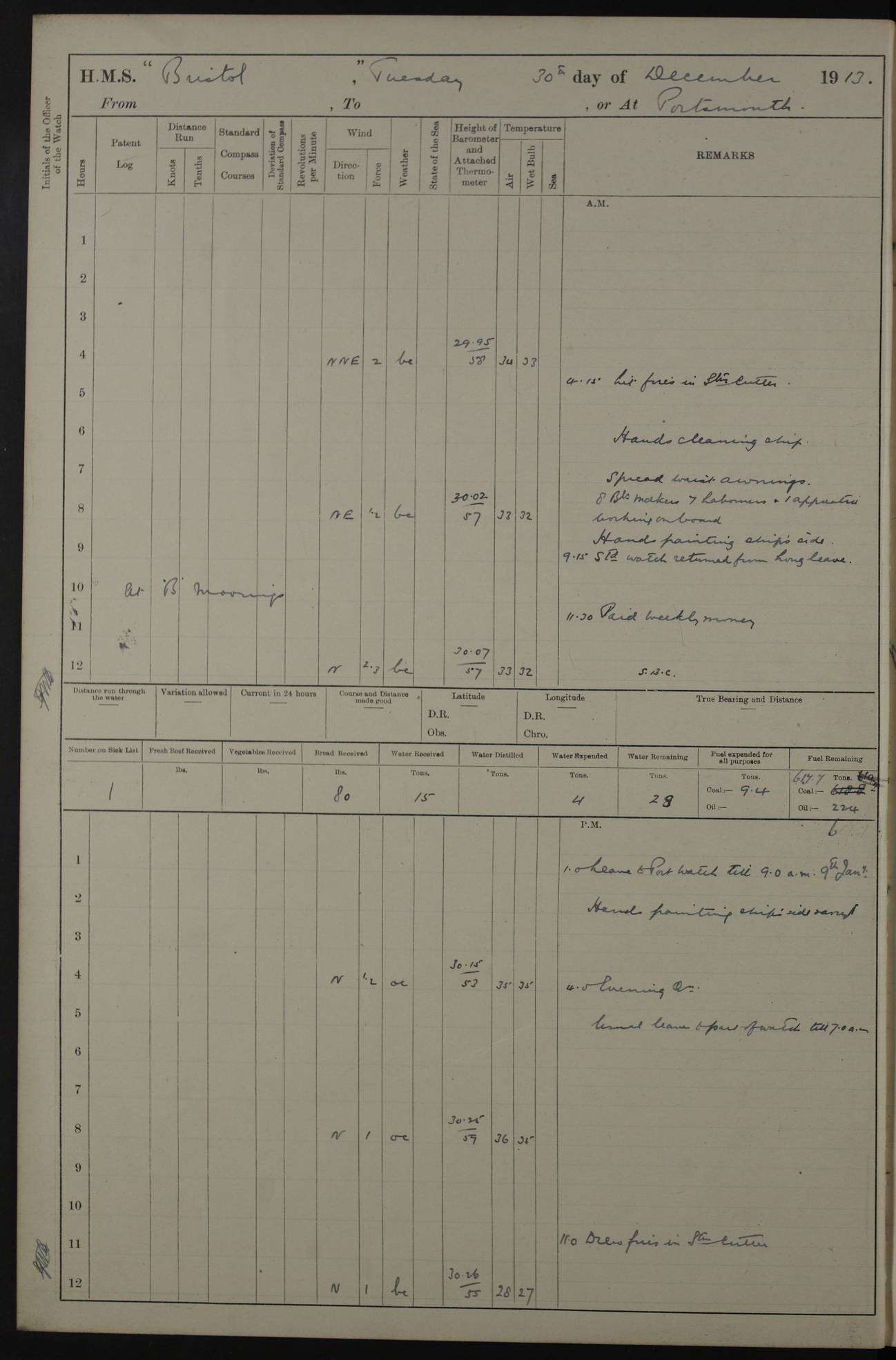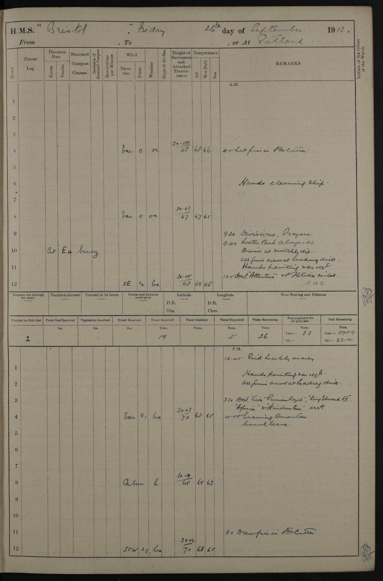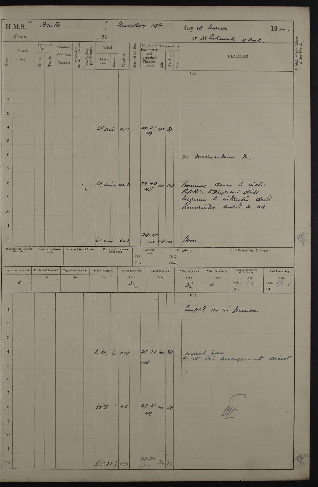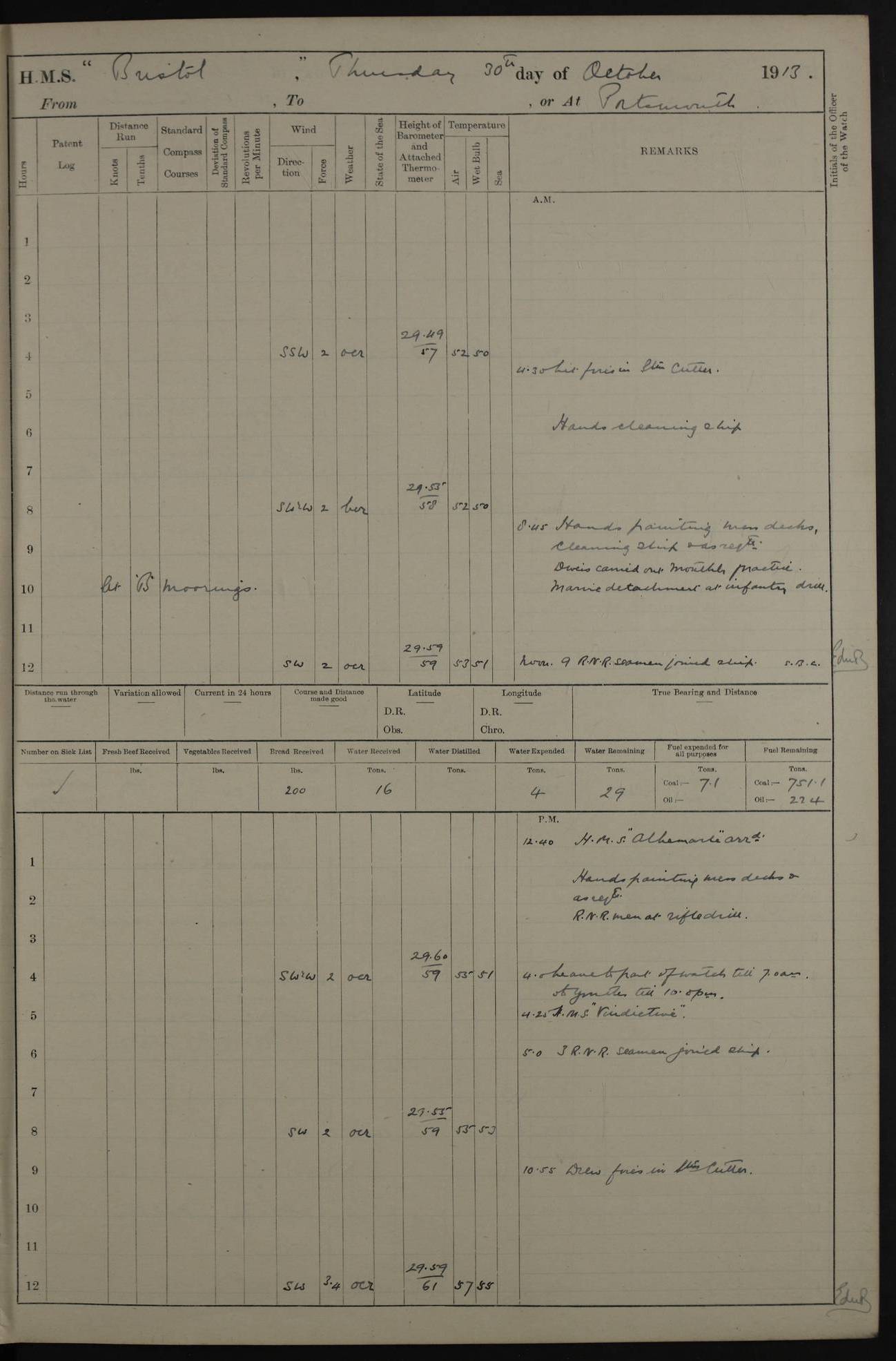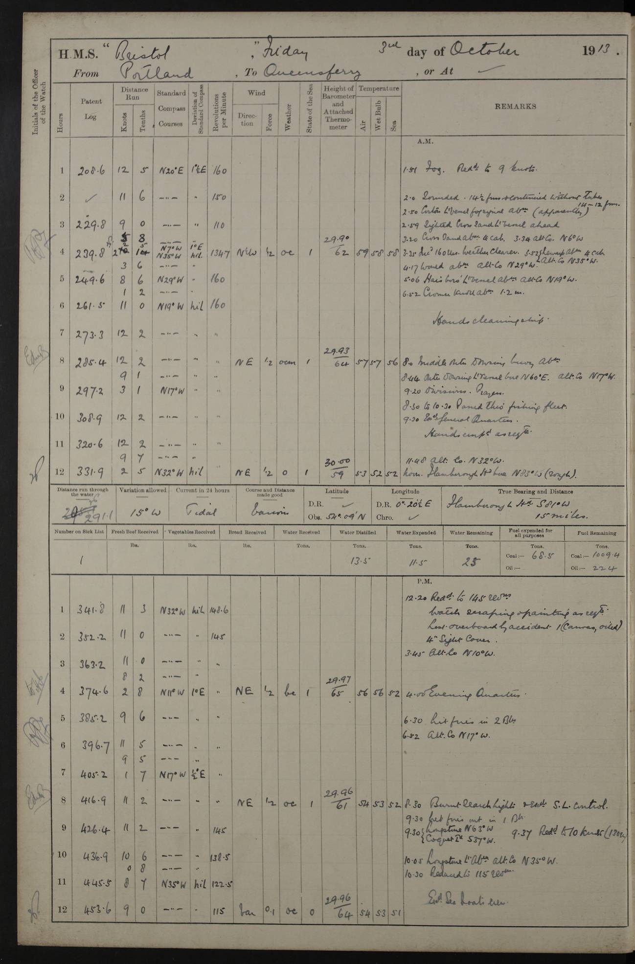 (Maps prepared using Journey Plotter, developed by Maikel. The Plots can only be approximate. They are made by joining-up positions on successive days, and sometimes positions are not given. There will therefore be occasions when the ship appears to have travelled overland) LOG BOOK – JULY 1ST 1913 TO JUNE 21ST 1914 4ef4f40ce53e0a0c91001323: (https://s3.amazonaws.com:443/oldweather/ADM53-36118/0001_0.jpg) 4ef4f40ce53e0a0c91001324: (https://s3.amazonaws.com:443/oldweather/ADM53-36118/0001_1.jpg) 4ef4f40de53e0a0c91001325: (https://s3.amazonaws.com:443/oldweather/ADM53-36118/0002_0.jpg) 4ef4f40de53e0a0c91001326: (https://s3.amazonaws.com:443/oldweather/ADM53-36118/0002_1.jpg) 4ef4f40de53e0a0c91001327: (https://s3.amazonaws.com:443/oldweather/ADM53-36118/0003_0.jpg) 4ef4f40de53e0a0c91001328: (https://s3.amazonaws.com:443/oldweather/ADM53-36118/0003_1.jpg) 4ef4f40de53e0a0c91001329: (https://s3.amazonaws.com:443/oldweather/ADM53-36118/0004_0.jpg) 4ef4f40de53e0a0c9100132a: (https://s3.amazonaws.com:443/oldweather/ADM53-36118/0004_1.jpg) LOG OF H.M.S. BRISTOL Commanded by Captain Basil Hew Fanshawe FOR THE PERIOD Commencing 1st of July 1913 Ending 21st of June 1914 Followed by her technical detail 4ef4f40de53e0a0c9100132b: (https://s3.amazonaws.com:443/oldweather/ADM53-36118/0005_0.jpg) Directions 4ef4f40de53e0a0c9100132c: (https://s3.amazonaws.com:443/oldweather/ADM53-36118/0005_1.jpg) Establishment of Ship’s Company: Full Commission: Officers: 18. Seamen: 111. Boys: 13. Marines: 28. Engine-room establishment: 168. Other non-executive ratings: 43. Total: 381 Active Commision: Officers: 14. Seamen: 53. Boys: 0. Marines: 17. Engine-room establishment: 64. Other non-executive ratings: 27. Total 175 Armament: Forecastle: 1 6” B.L. PV* Quarterdeck: 1 6” B.L. PV* Starboard waist: 5 4” B.L. PIV* Port waist: 5 4” B.L. PIV* 4 3 pounder for Saluting purpose, 2 in each battery Torpedo Two 18” submerged tubes Boats: 1 30 feet Steam Cutter 1 34 feet Cutter 2 30 feet Cutters 1 30 feet Gig 3 27 feet Whalers 2 18 feet Skiffs