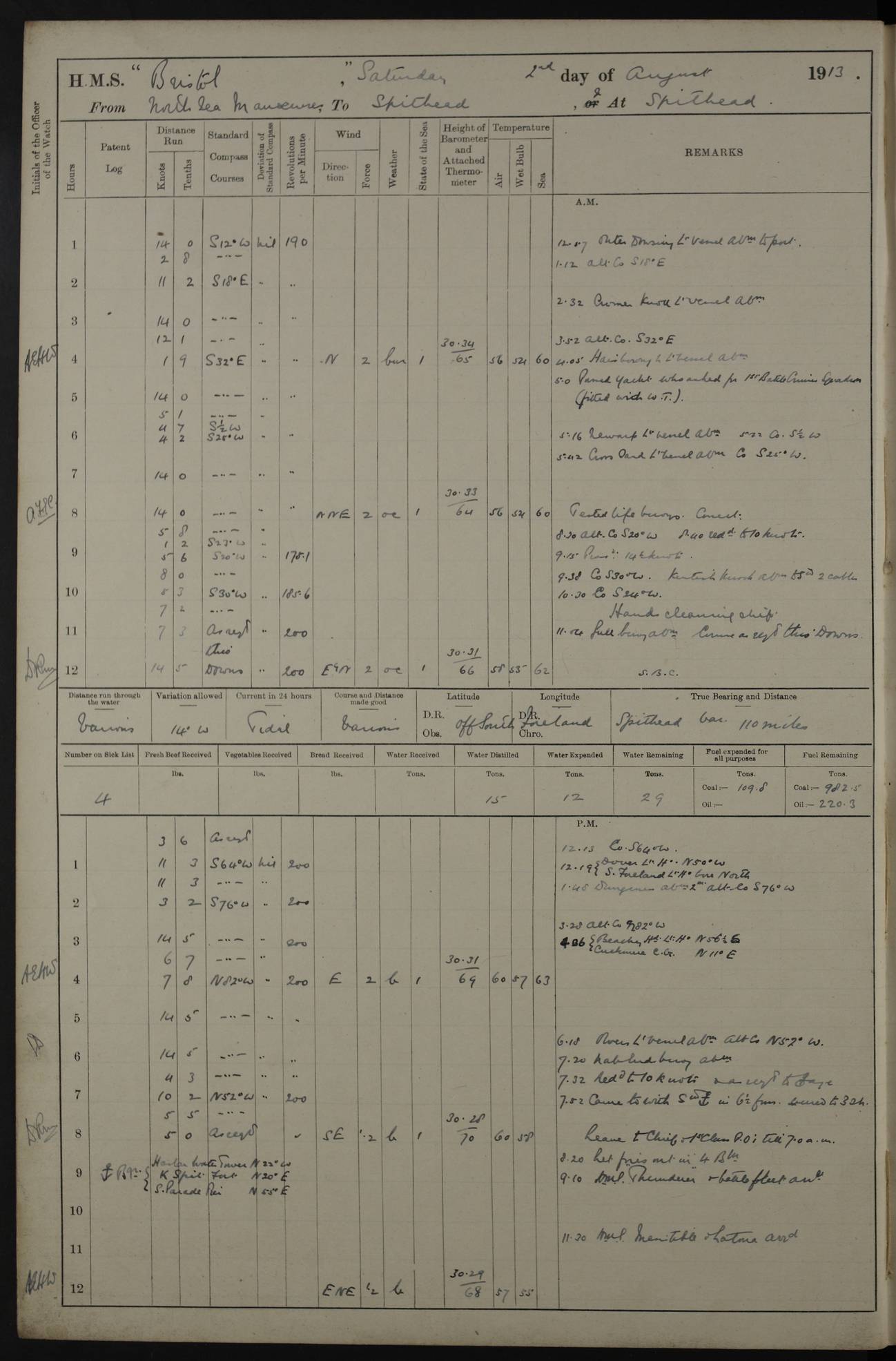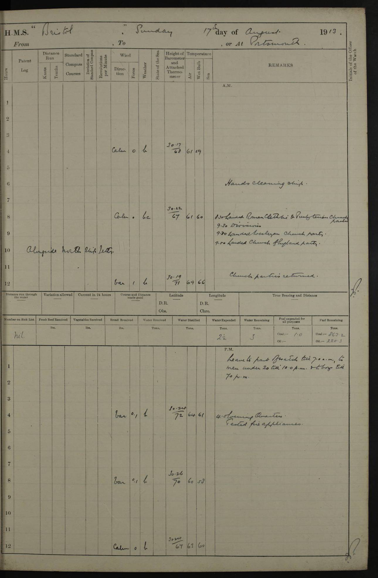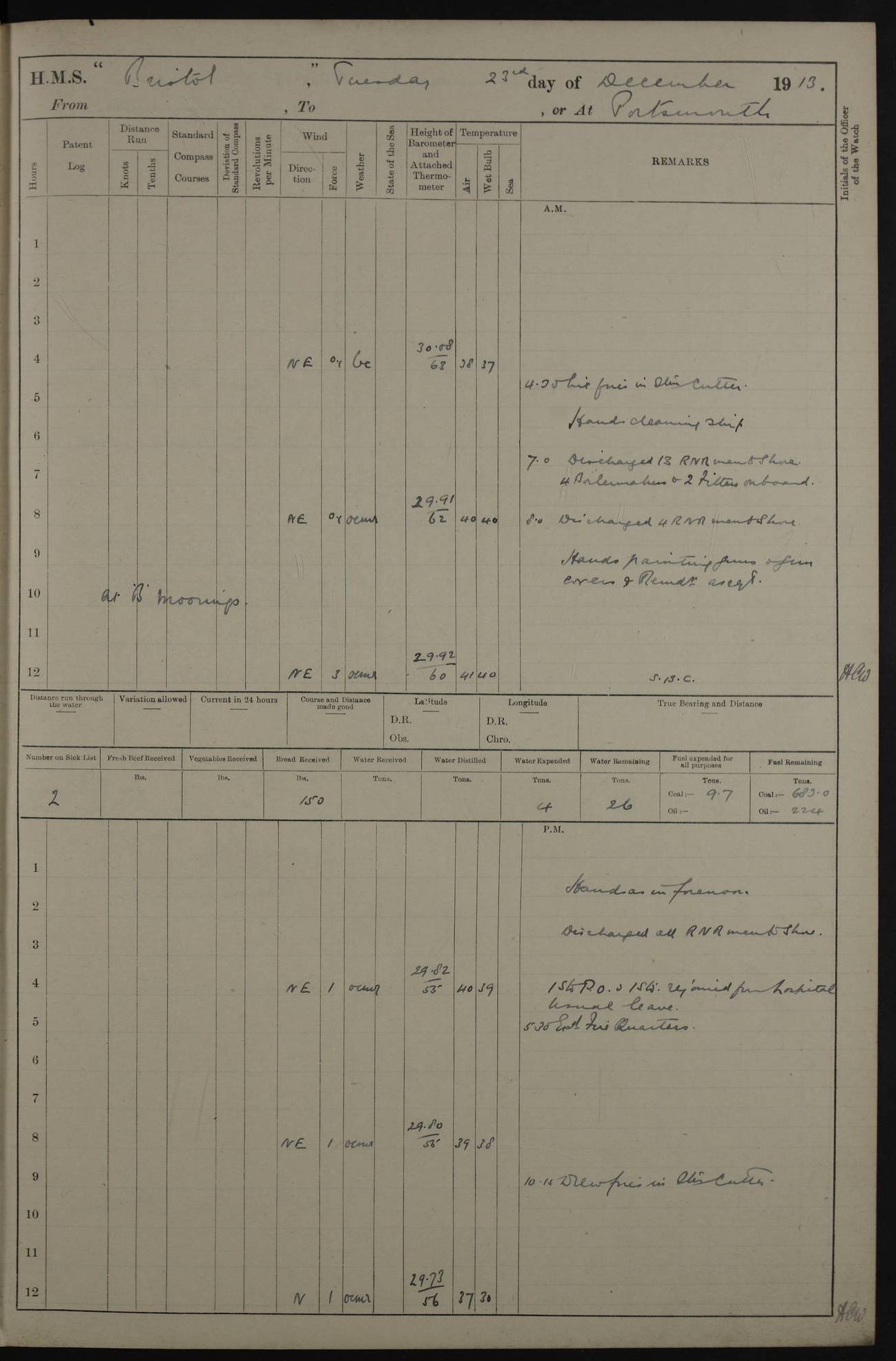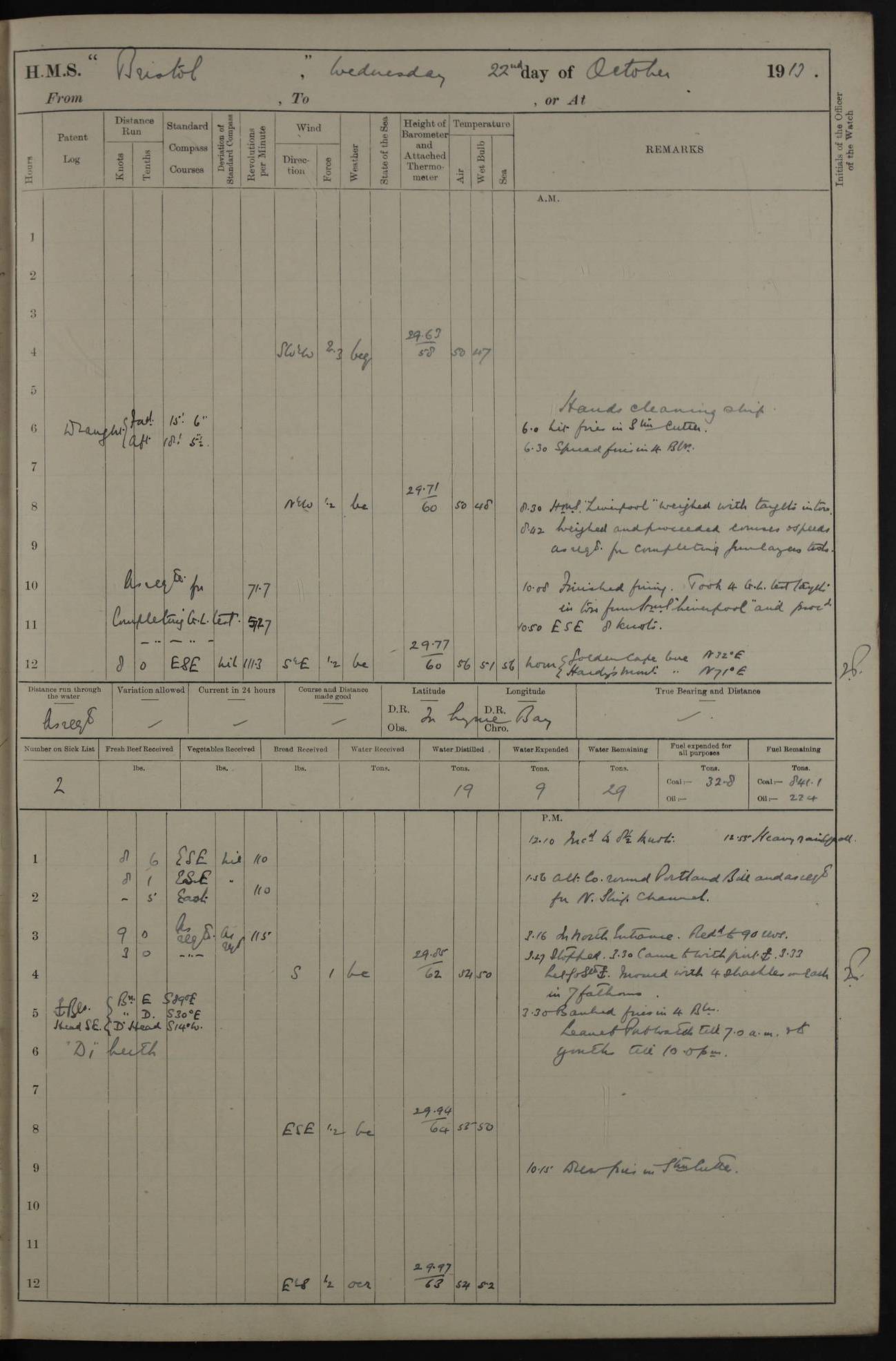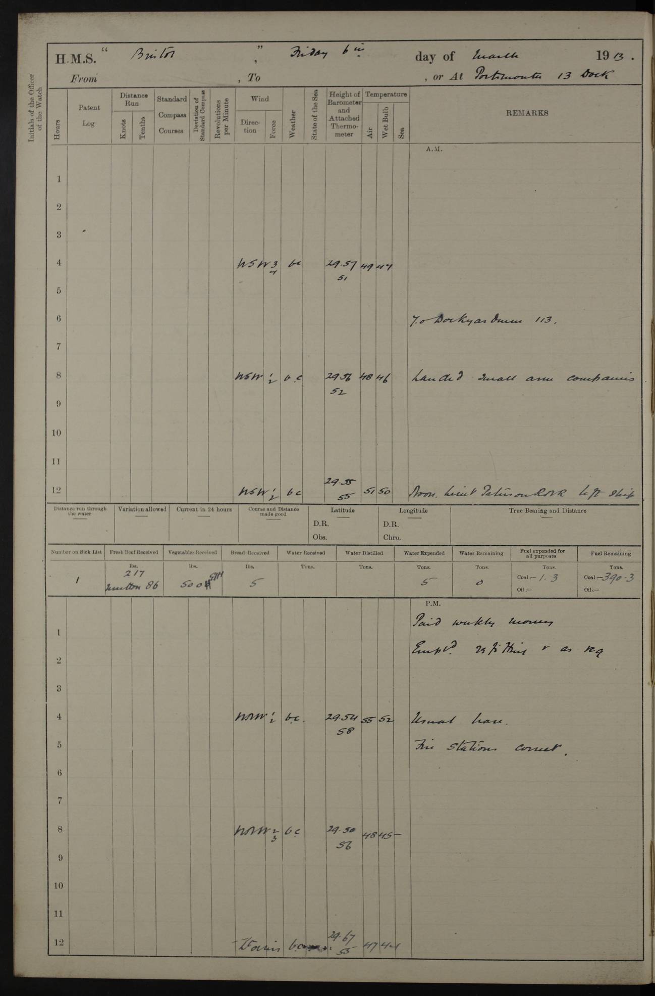 (Maps prepared using Journey Plotter, developed by Maikel. The Plots can only be approximate. They are made by joining-up positions on successive days, and sometimes positions are not given. There will therefore be occasions when the ship appears to have travelled overland) LOG BOOK – JULY 1ST 1913 TO JUNE 21ST 1914 4ef4f40ce53e0a0c91001323: (https://s3.amazonaws.com:443/oldweather/ADM53-36118/0001_0.jpg) 4ef4f40ce53e0a0c91001324: (https://s3.amazonaws.com:443/oldweather/ADM53-36118/0001_1.jpg) 4ef4f40de53e0a0c91001325: (https://s3.amazonaws.com:443/oldweather/ADM53-36118/0002_0.jpg) 4ef4f40de53e0a0c91001326: (https://s3.amazonaws.com:443/oldweather/ADM53-36118/0002_1.jpg) 4ef4f40de53e0a0c91001327: (https://s3.amazonaws.com:443/oldweather/ADM53-36118/0003_0.jpg) 4ef4f40de53e0a0c91001328: (https://s3.amazonaws.com:443/oldweather/ADM53-36118/0003_1.jpg) 4ef4f40de53e0a0c91001329: (https://s3.amazonaws.com:443/oldweather/ADM53-36118/0004_0.jpg) 4ef4f40de53e0a0c9100132a: (https://s3.amazonaws.com:443/oldweather/ADM53-36118/0004_1.jpg) LOG OF H.M.S. BRISTOL Commanded by Captain Basil Hew Fanshawe FOR THE PERIOD Commencing 1st of July 1913 Ending 21st of June 1914 Followed by her technical detail 4ef4f40de53e0a0c9100132b: (https://s3.amazonaws.com:443/oldweather/ADM53-36118/0005_0.jpg) Directions 4ef4f40de53e0a0c9100132c: (https://s3.amazonaws.com:443/oldweather/ADM53-36118/0005_1.jpg) Establishment of Ship’s Company: Full Commission: Officers: 18. Seamen: 111. Boys: 13. Marines: 28. Engine-room establishment: 168. Other non-executive ratings: 43. Total: 381 Active Commision: Officers: 14. Seamen: 53. Boys: 0. Marines: 17. Engine-room establishment: 64. Other non-executive ratings: 27. Total 175 Armament: Forecastle: 1 6” B.L. PV* Quarterdeck: 1 6” B.L. PV* Starboard waist: 5 4” B.L. PIV* Port waist: 5 4” B.L. PIV* 4 3 pounder for Saluting purpose, 2 in each battery Torpedo Two 18” submerged tubes Boats: 1 30 feet Steam Cutter 1 34 feet Cutter 2 30 feet Cutters 1 30 feet Gig 3 27 feet Whalers 2 18 feet Skiffs