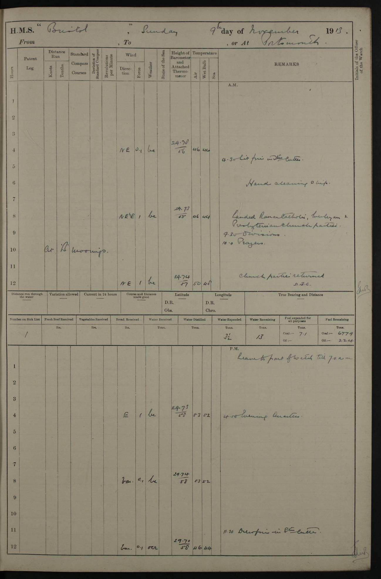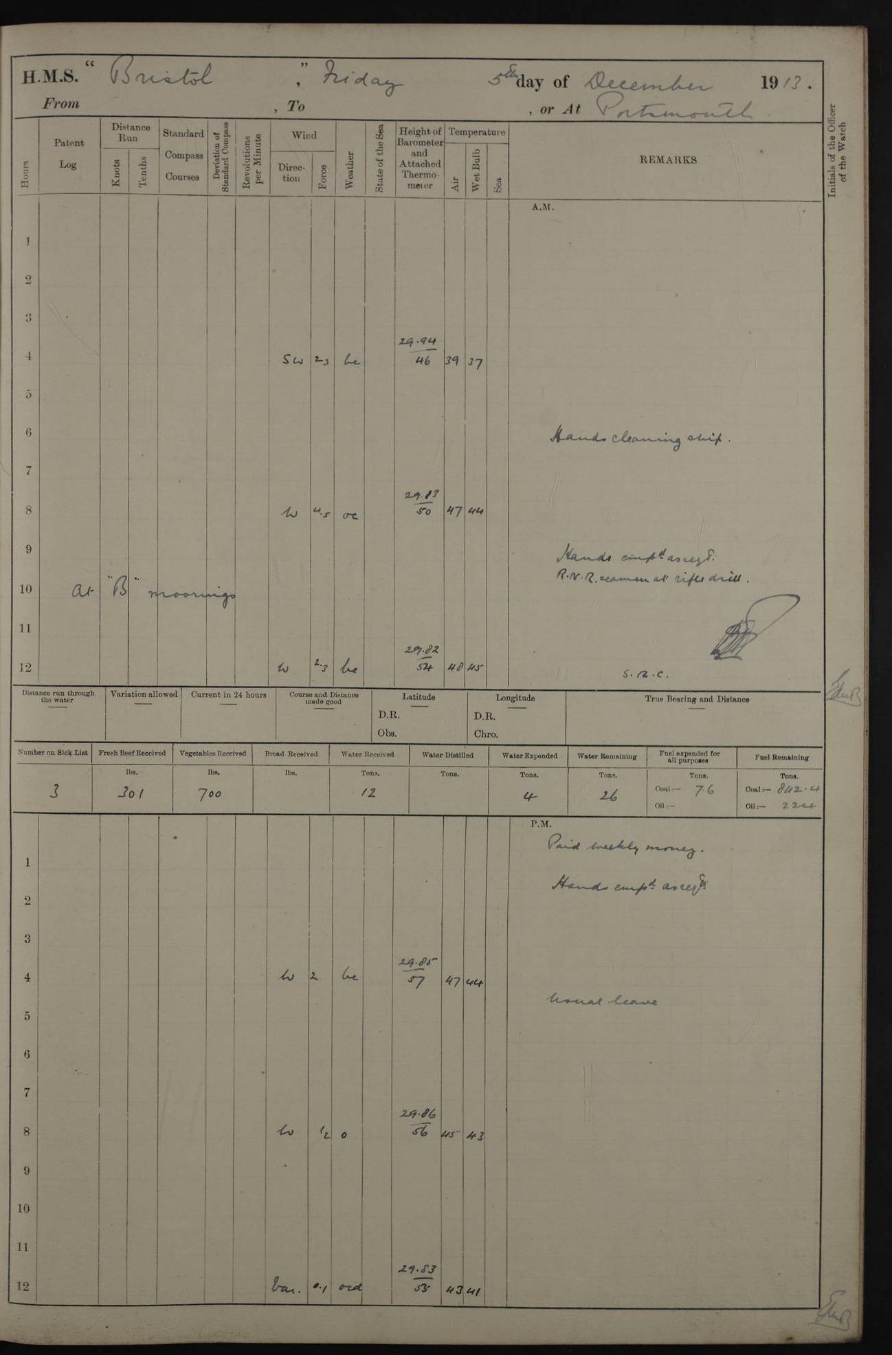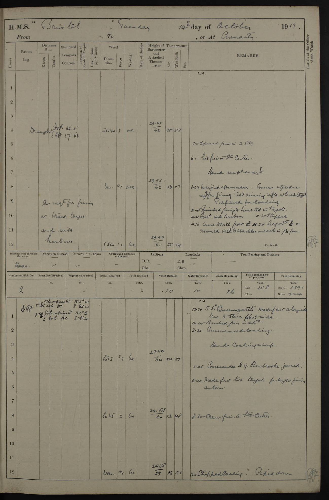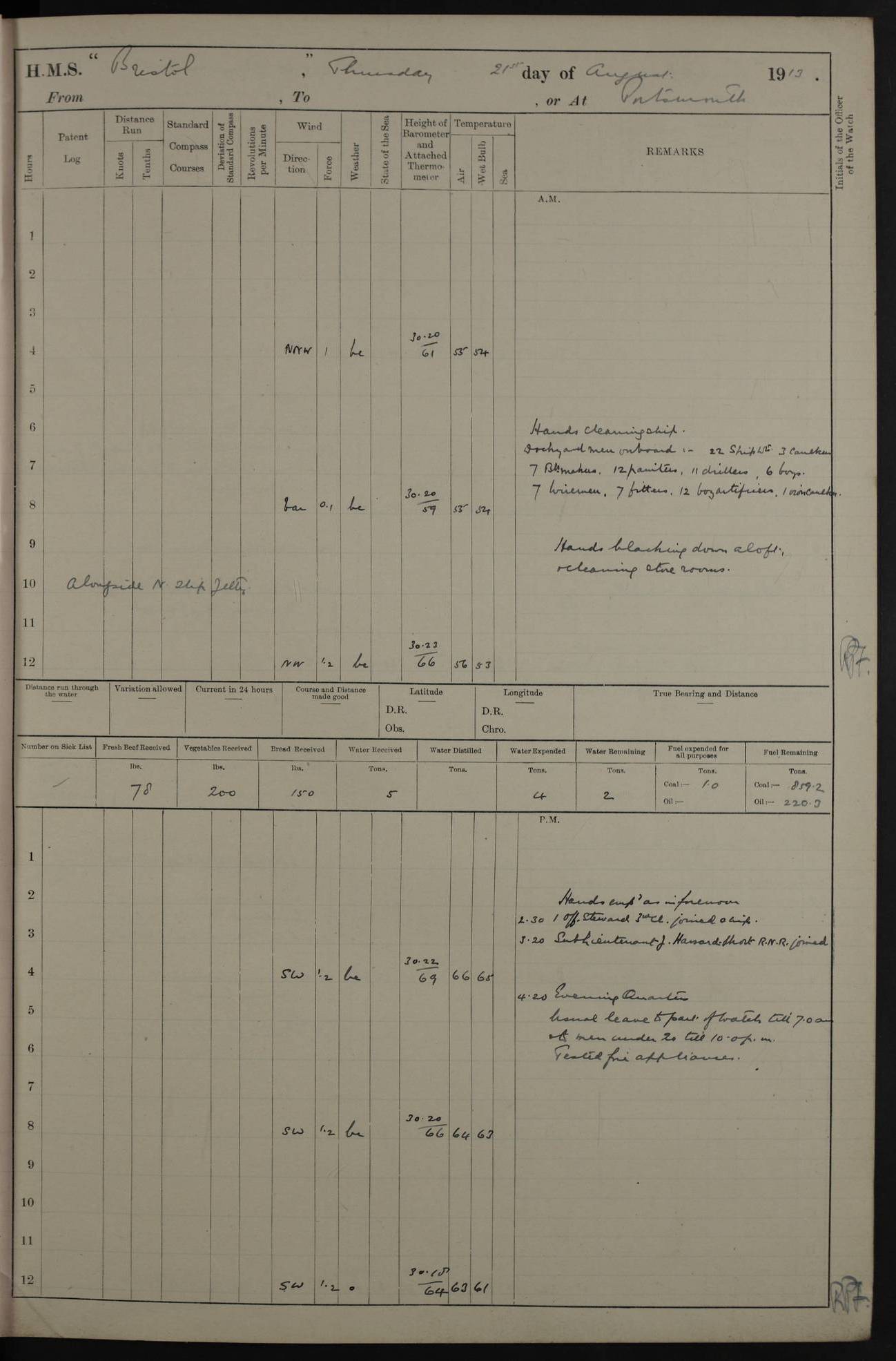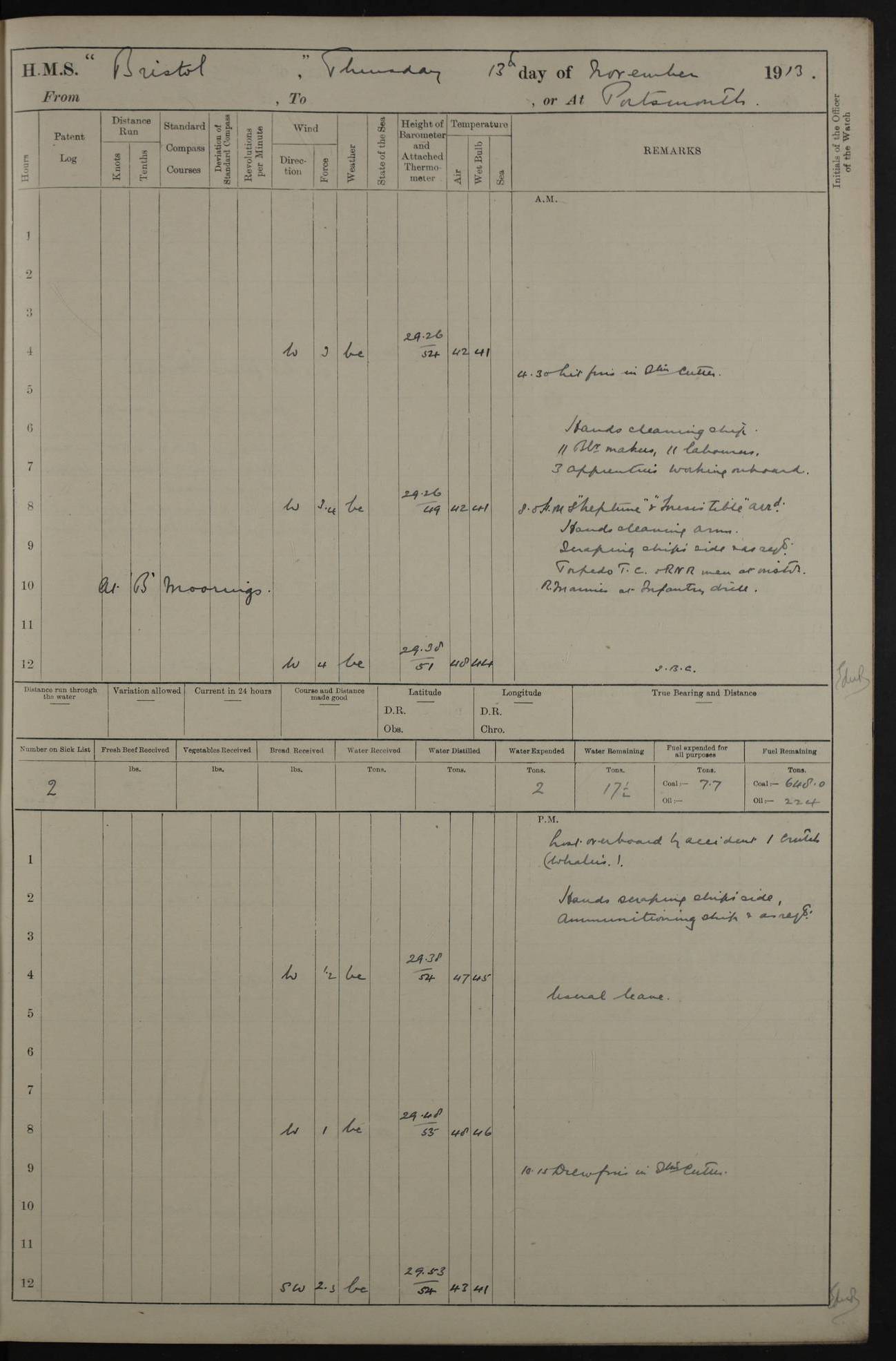 (Maps prepared using Journey Plotter, developed by Maikel. The Plots can only be approximate. They are made by joining-up positions on successive days, and sometimes positions are not given. There will therefore be occasions when the ship appears to have travelled overland) LOG BOOK – JULY 1ST 1913 TO JUNE 21ST 1914 4ef4f40ce53e0a0c91001323: (https://s3.amazonaws.com:443/oldweather/ADM53-36118/0001_0.jpg) 4ef4f40ce53e0a0c91001324: (https://s3.amazonaws.com:443/oldweather/ADM53-36118/0001_1.jpg) 4ef4f40de53e0a0c91001325: (https://s3.amazonaws.com:443/oldweather/ADM53-36118/0002_0.jpg) 4ef4f40de53e0a0c91001326: (https://s3.amazonaws.com:443/oldweather/ADM53-36118/0002_1.jpg) 4ef4f40de53e0a0c91001327: (https://s3.amazonaws.com:443/oldweather/ADM53-36118/0003_0.jpg) 4ef4f40de53e0a0c91001328: (https://s3.amazonaws.com:443/oldweather/ADM53-36118/0003_1.jpg) 4ef4f40de53e0a0c91001329: (https://s3.amazonaws.com:443/oldweather/ADM53-36118/0004_0.jpg) 4ef4f40de53e0a0c9100132a: (https://s3.amazonaws.com:443/oldweather/ADM53-36118/0004_1.jpg) LOG OF H.M.S. BRISTOL Commanded by Captain Basil Hew Fanshawe FOR THE PERIOD Commencing 1st of July 1913 Ending 21st of June 1914 Followed by her technical detail 4ef4f40de53e0a0c9100132b: (https://s3.amazonaws.com:443/oldweather/ADM53-36118/0005_0.jpg) Directions 4ef4f40de53e0a0c9100132c: (https://s3.amazonaws.com:443/oldweather/ADM53-36118/0005_1.jpg) Establishment of Ship’s Company: Full Commission: Officers: 18. Seamen: 111. Boys: 13. Marines: 28. Engine-room establishment: 168. Other non-executive ratings: 43. Total: 381 Active Commision: Officers: 14. Seamen: 53. Boys: 0. Marines: 17. Engine-room establishment: 64. Other non-executive ratings: 27. Total 175 Armament: Forecastle: 1 6” B.L. PV* Quarterdeck: 1 6” B.L. PV* Starboard waist: 5 4” B.L. PIV* Port waist: 5 4” B.L. PIV* 4 3 pounder for Saluting purpose, 2 in each battery Torpedo Two 18” submerged tubes Boats: 1 30 feet Steam Cutter 1 34 feet Cutter 2 30 feet Cutters 1 30 feet Gig 3 27 feet Whalers 2 18 feet Skiffs
