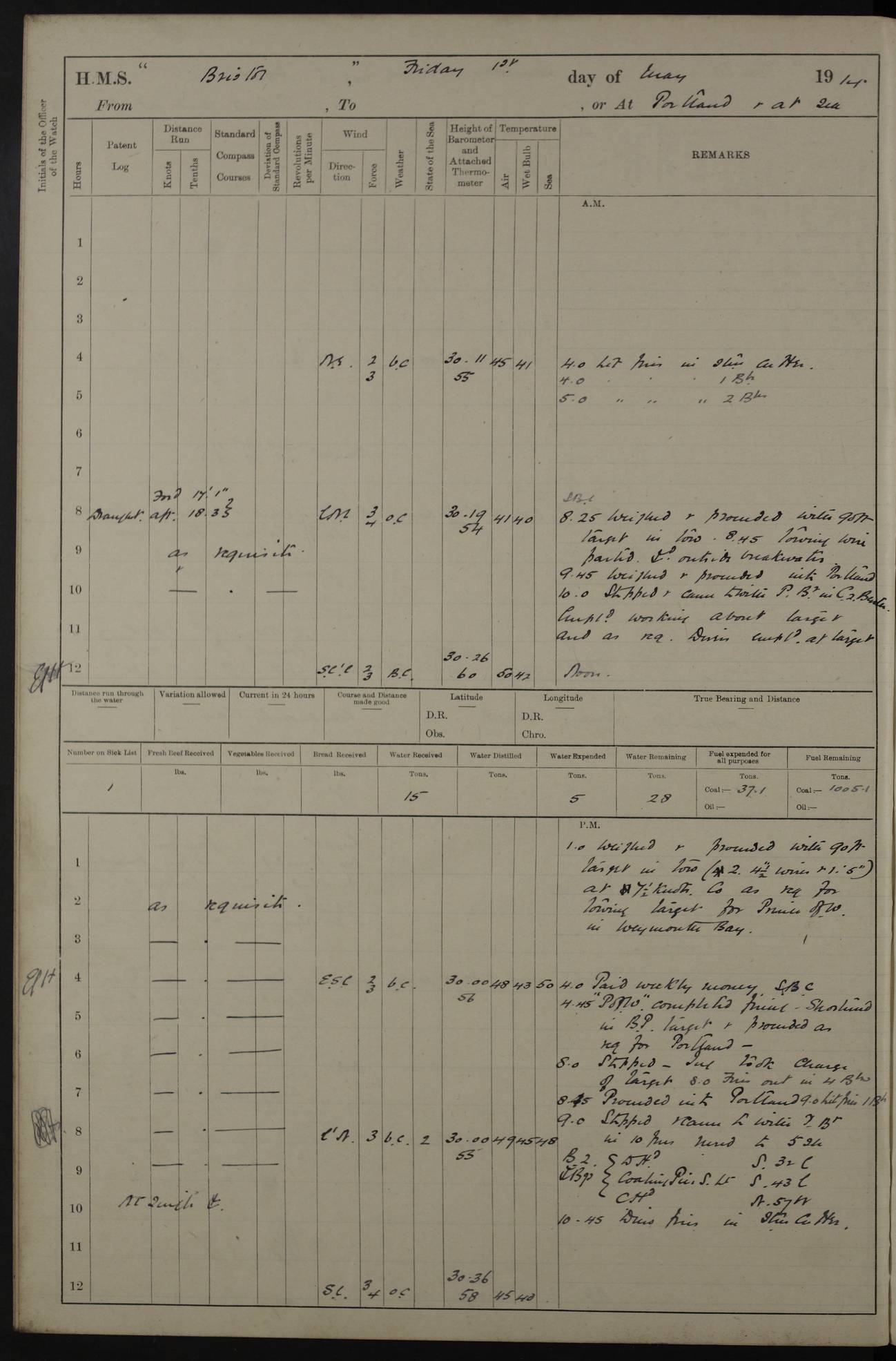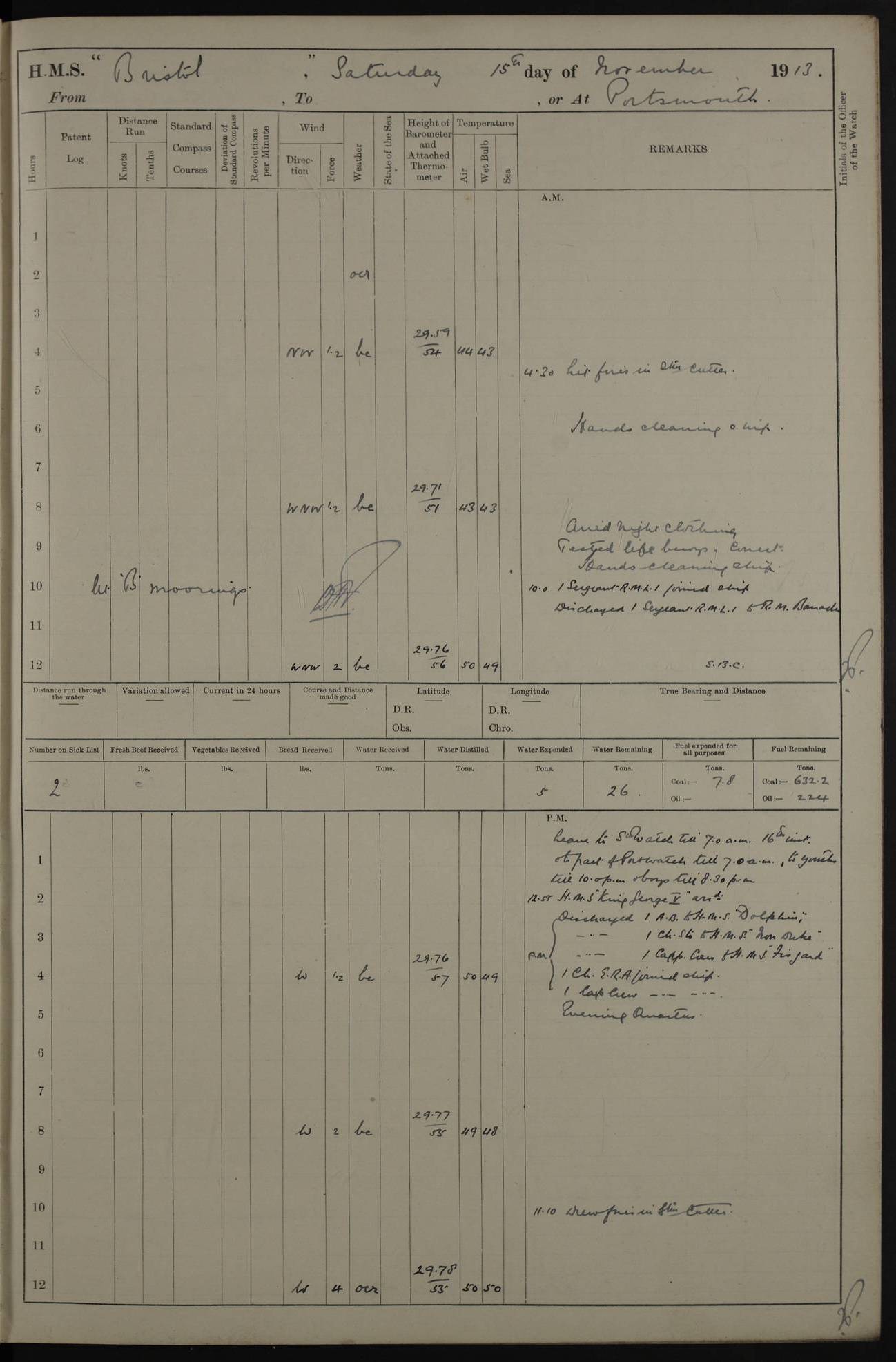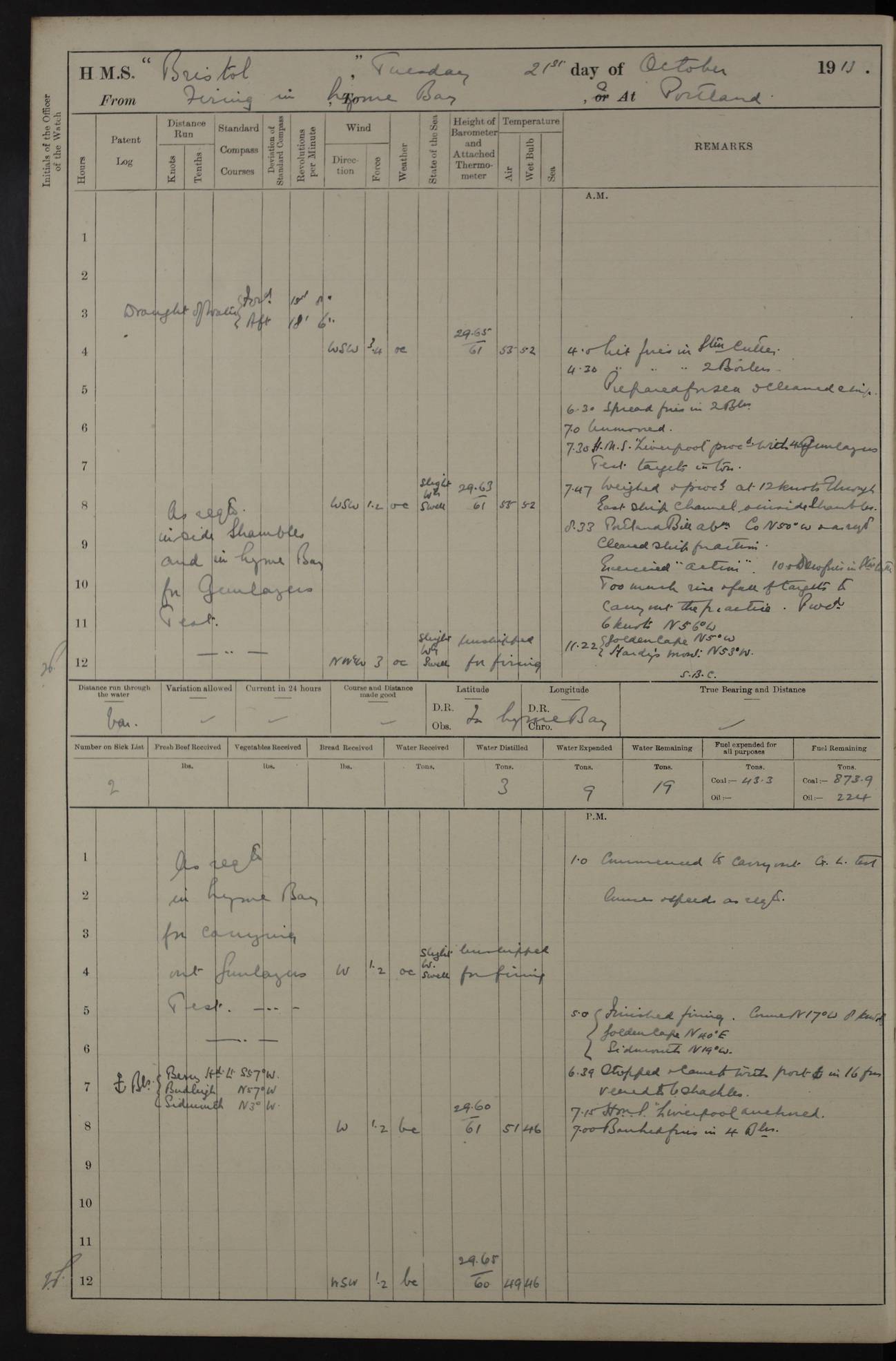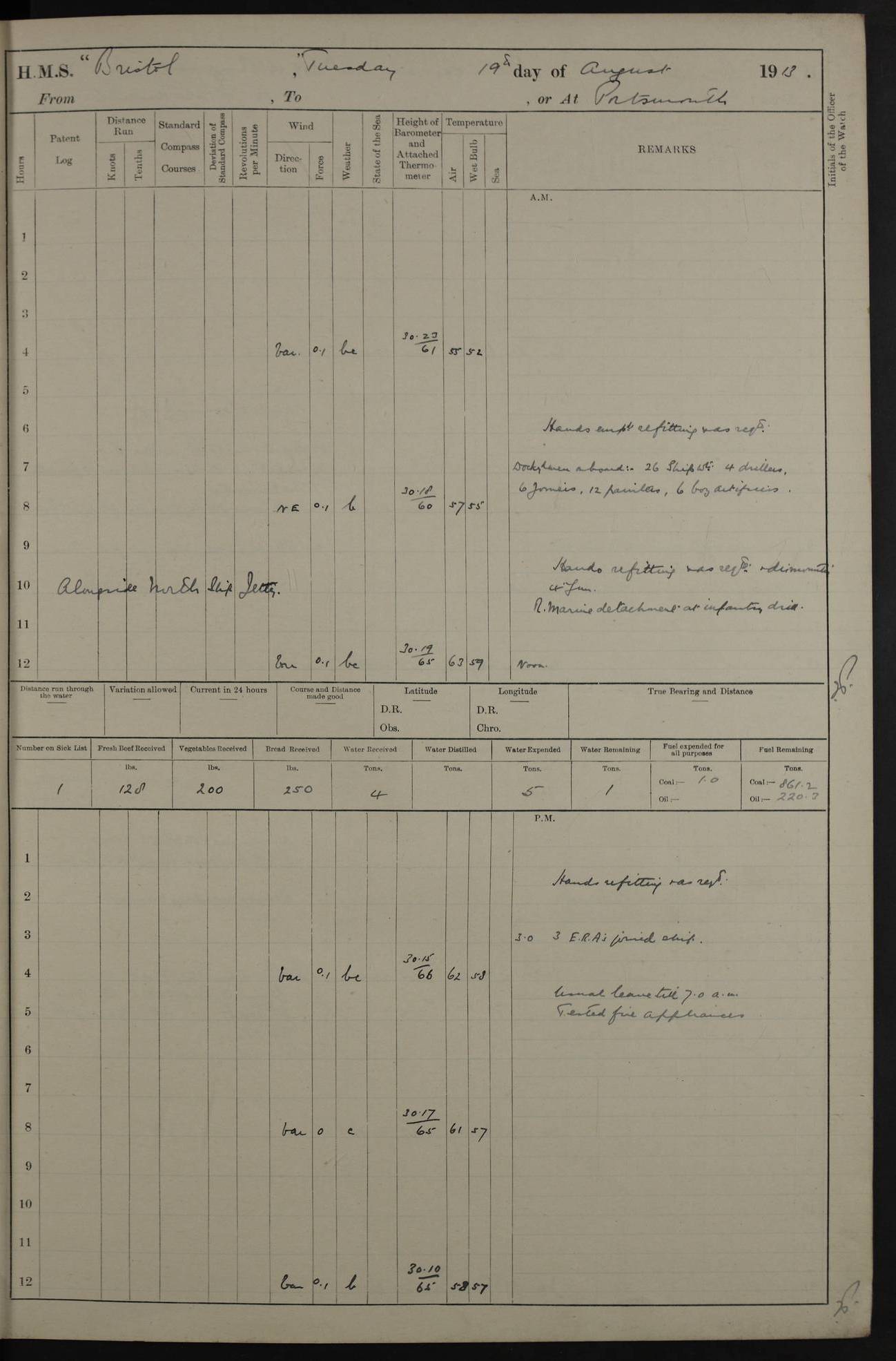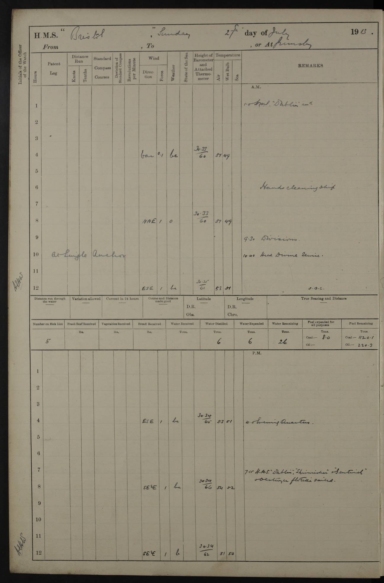 (Maps prepared using Journey Plotter, developed by Maikel. The Plots can only be approximate. They are made by joining-up positions on successive days, and sometimes positions are not given. There will therefore be occasions when the ship appears to have travelled overland) LOG BOOK – JULY 1ST 1913 TO JUNE 21ST 1914 4ef4f40ce53e0a0c91001323: (https://s3.amazonaws.com:443/oldweather/ADM53-36118/0001_0.jpg) 4ef4f40ce53e0a0c91001324: (https://s3.amazonaws.com:443/oldweather/ADM53-36118/0001_1.jpg) 4ef4f40de53e0a0c91001325: (https://s3.amazonaws.com:443/oldweather/ADM53-36118/0002_0.jpg) 4ef4f40de53e0a0c91001326: (https://s3.amazonaws.com:443/oldweather/ADM53-36118/0002_1.jpg) 4ef4f40de53e0a0c91001327: (https://s3.amazonaws.com:443/oldweather/ADM53-36118/0003_0.jpg) 4ef4f40de53e0a0c91001328: (https://s3.amazonaws.com:443/oldweather/ADM53-36118/0003_1.jpg) 4ef4f40de53e0a0c91001329: (https://s3.amazonaws.com:443/oldweather/ADM53-36118/0004_0.jpg) 4ef4f40de53e0a0c9100132a: (https://s3.amazonaws.com:443/oldweather/ADM53-36118/0004_1.jpg) LOG OF H.M.S. BRISTOL Commanded by Captain Basil Hew Fanshawe FOR THE PERIOD Commencing 1st of July 1913 Ending 21st of June 1914 Followed by her technical detail 4ef4f40de53e0a0c9100132b: (https://s3.amazonaws.com:443/oldweather/ADM53-36118/0005_0.jpg) Directions 4ef4f40de53e0a0c9100132c: (https://s3.amazonaws.com:443/oldweather/ADM53-36118/0005_1.jpg) Establishment of Ship’s Company: Full Commission: Officers: 18. Seamen: 111. Boys: 13. Marines: 28. Engine-room establishment: 168. Other non-executive ratings: 43. Total: 381 Active Commision: Officers: 14. Seamen: 53. Boys: 0. Marines: 17. Engine-room establishment: 64. Other non-executive ratings: 27. Total 175 Armament: Forecastle: 1 6” B.L. PV* Quarterdeck: 1 6” B.L. PV* Starboard waist: 5 4” B.L. PIV* Port waist: 5 4” B.L. PIV* 4 3 pounder for Saluting purpose, 2 in each battery Torpedo Two 18” submerged tubes Boats: 1 30 feet Steam Cutter 1 34 feet Cutter 2 30 feet Cutters 1 30 feet Gig 3 27 feet Whalers 2 18 feet Skiffs