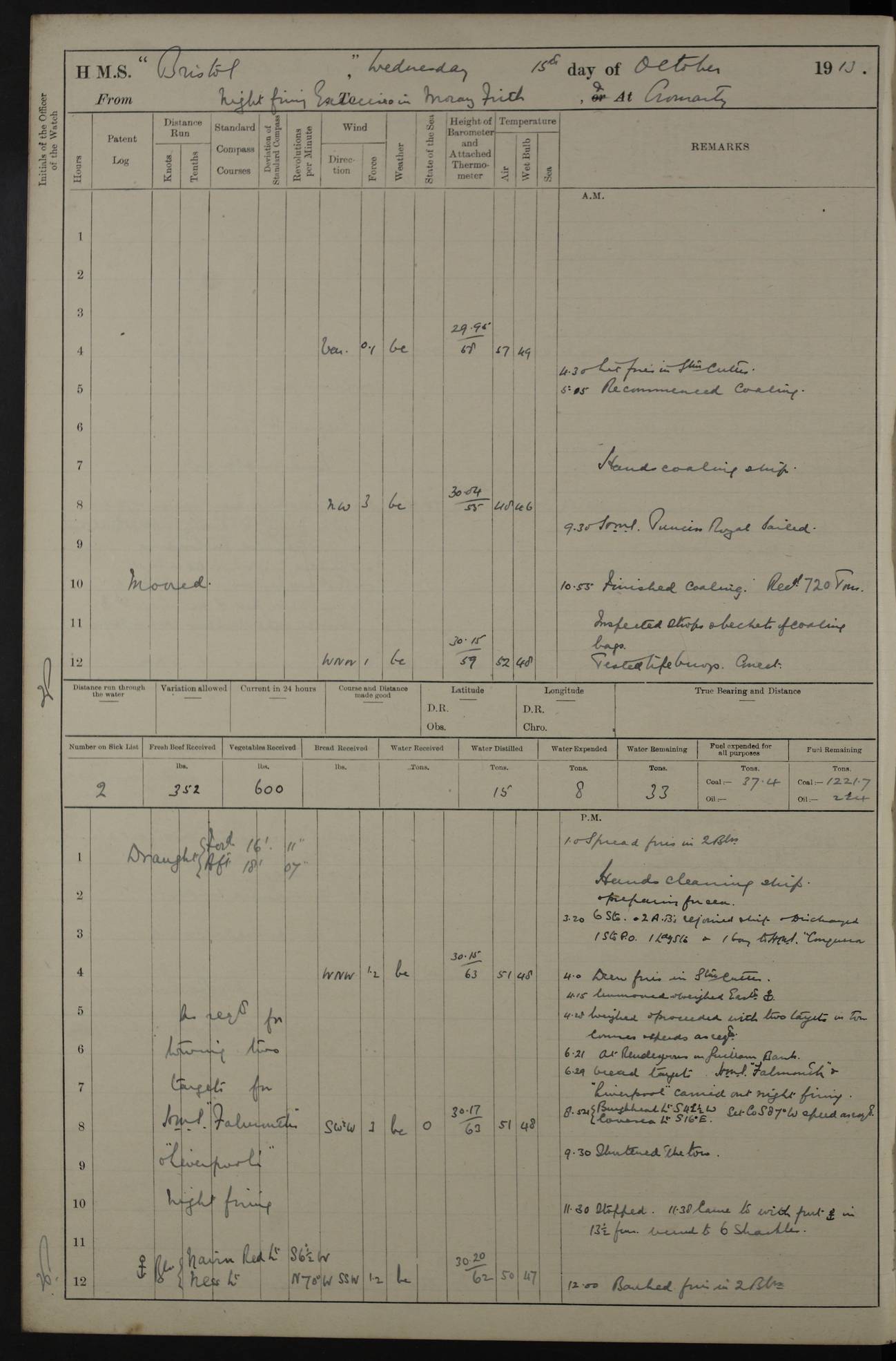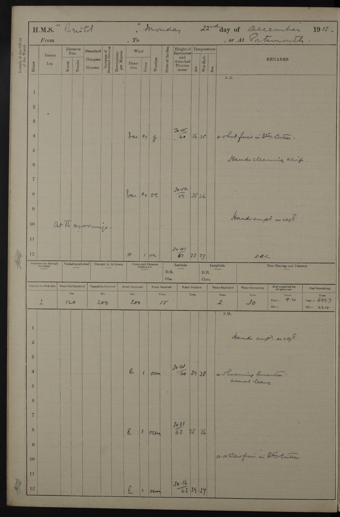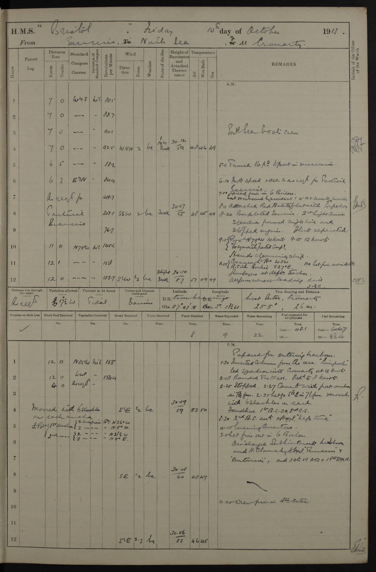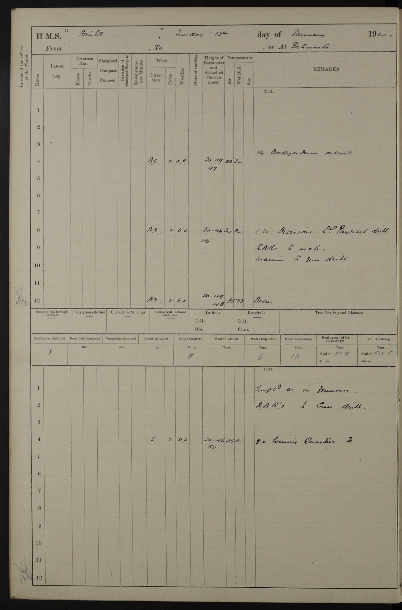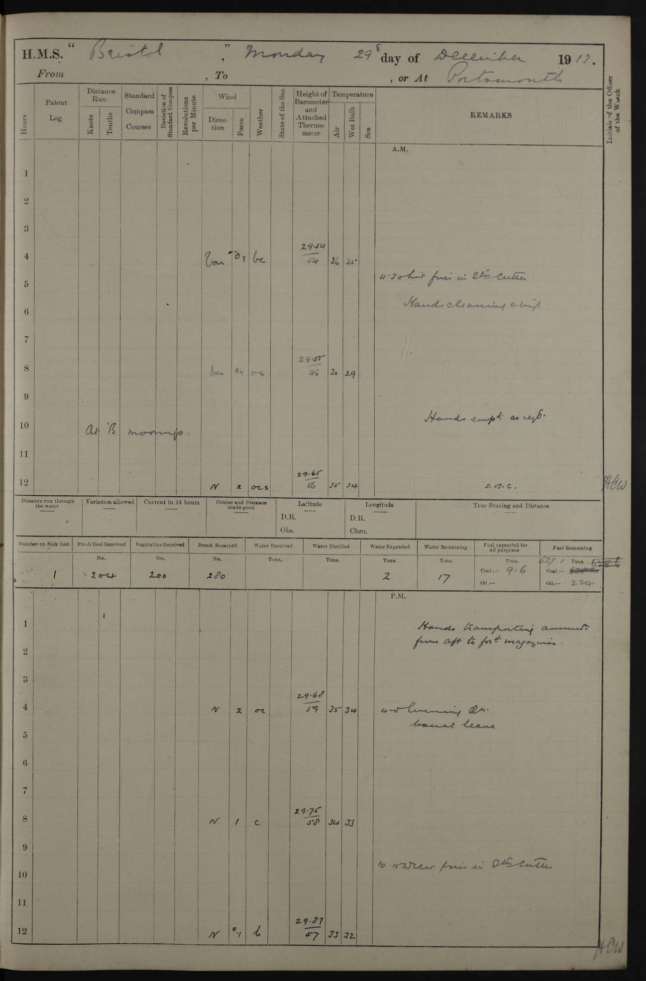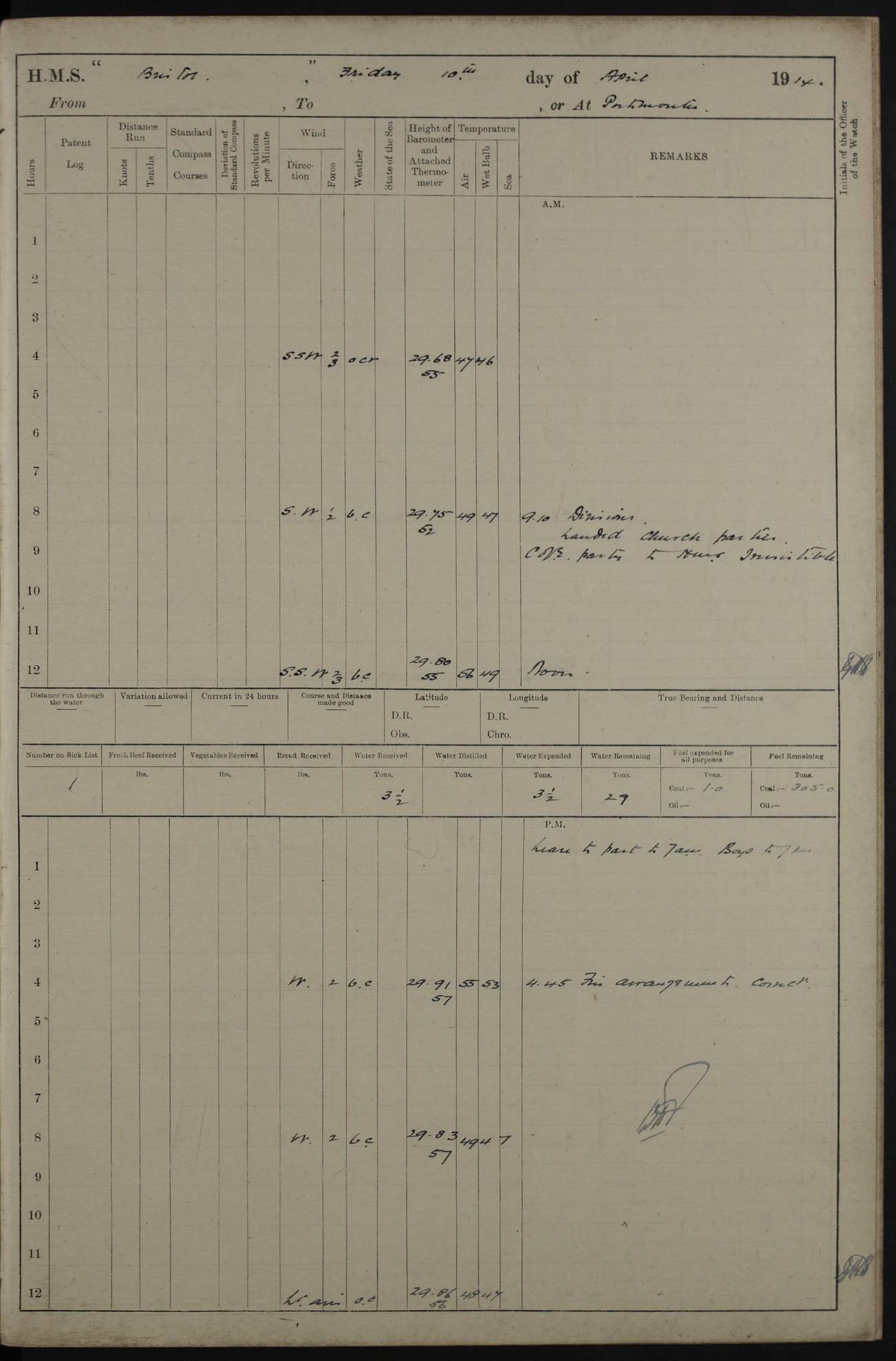 (Maps prepared using Journey Plotter, developed by Maikel. The Plots can only be approximate. They are made by joining-up positions on successive days, and sometimes positions are not given. There will therefore be occasions when the ship appears to have travelled overland) LOG BOOK – JULY 1ST 1913 TO JUNE 21ST 1914 4ef4f40ce53e0a0c91001323: (https://s3.amazonaws.com:443/oldweather/ADM53-36118/0001_0.jpg) 4ef4f40ce53e0a0c91001324: (https://s3.amazonaws.com:443/oldweather/ADM53-36118/0001_1.jpg) 4ef4f40de53e0a0c91001325: (https://s3.amazonaws.com:443/oldweather/ADM53-36118/0002_0.jpg) 4ef4f40de53e0a0c91001326: (https://s3.amazonaws.com:443/oldweather/ADM53-36118/0002_1.jpg) 4ef4f40de53e0a0c91001327: (https://s3.amazonaws.com:443/oldweather/ADM53-36118/0003_0.jpg) 4ef4f40de53e0a0c91001328: (https://s3.amazonaws.com:443/oldweather/ADM53-36118/0003_1.jpg) 4ef4f40de53e0a0c91001329: (https://s3.amazonaws.com:443/oldweather/ADM53-36118/0004_0.jpg) 4ef4f40de53e0a0c9100132a: (https://s3.amazonaws.com:443/oldweather/ADM53-36118/0004_1.jpg) LOG OF H.M.S. BRISTOL Commanded by Captain Basil Hew Fanshawe FOR THE PERIOD Commencing 1st of July 1913 Ending 21st of June 1914 Followed by her technical detail 4ef4f40de53e0a0c9100132b: (https://s3.amazonaws.com:443/oldweather/ADM53-36118/0005_0.jpg) Directions 4ef4f40de53e0a0c9100132c: (https://s3.amazonaws.com:443/oldweather/ADM53-36118/0005_1.jpg) Establishment of Ship’s Company: Full Commission: Officers: 18. Seamen: 111. Boys: 13. Marines: 28. Engine-room establishment: 168. Other non-executive ratings: 43. Total: 381 Active Commision: Officers: 14. Seamen: 53. Boys: 0. Marines: 17. Engine-room establishment: 64. Other non-executive ratings: 27. Total 175 Armament: Forecastle: 1 6” B.L. PV* Quarterdeck: 1 6” B.L. PV* Starboard waist: 5 4” B.L. PIV* Port waist: 5 4” B.L. PIV* 4 3 pounder for Saluting purpose, 2 in each battery Torpedo Two 18” submerged tubes Boats: 1 30 feet Steam Cutter 1 34 feet Cutter 2 30 feet Cutters 1 30 feet Gig 3 27 feet Whalers 2 18 feet Skiffs