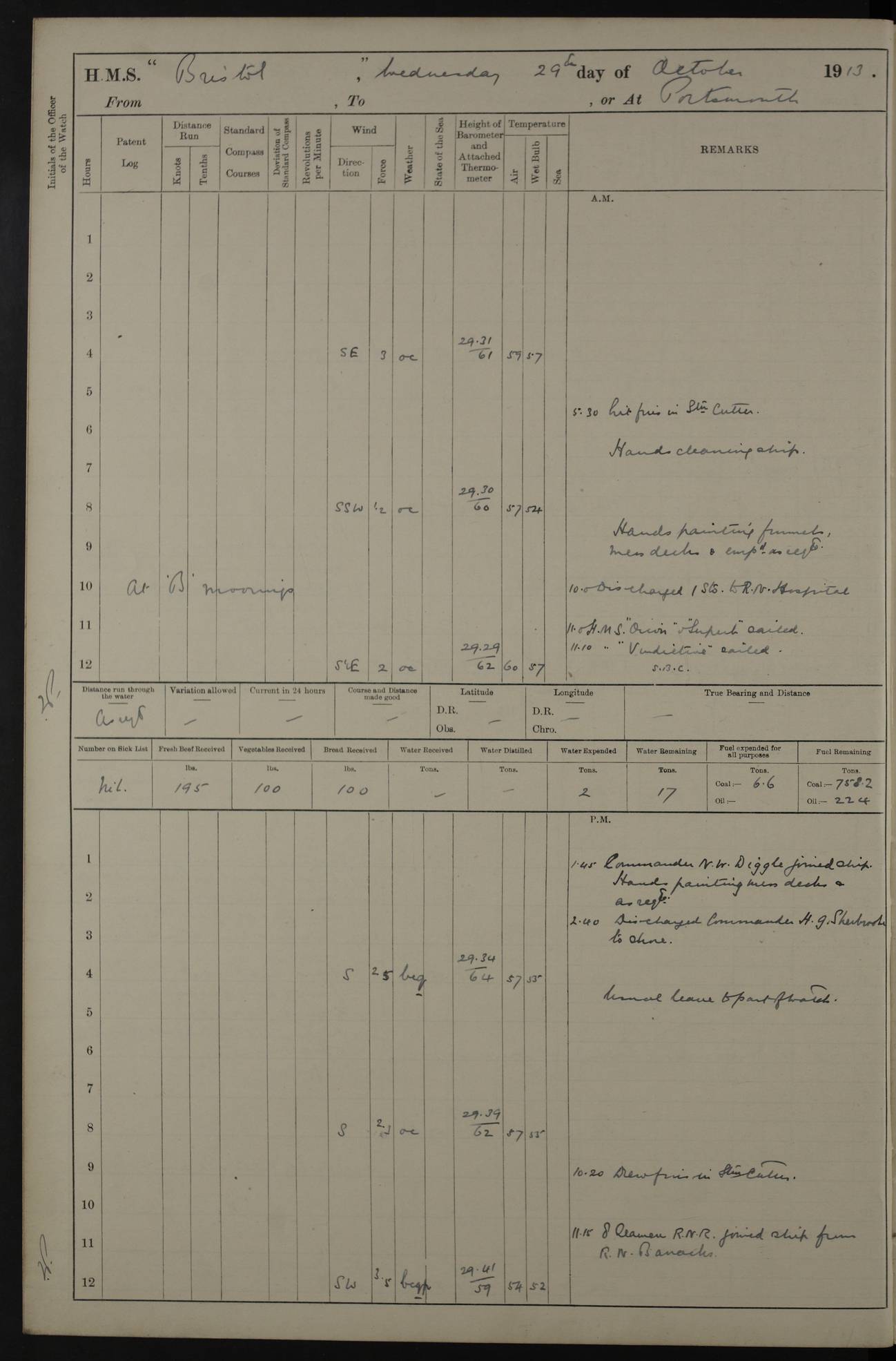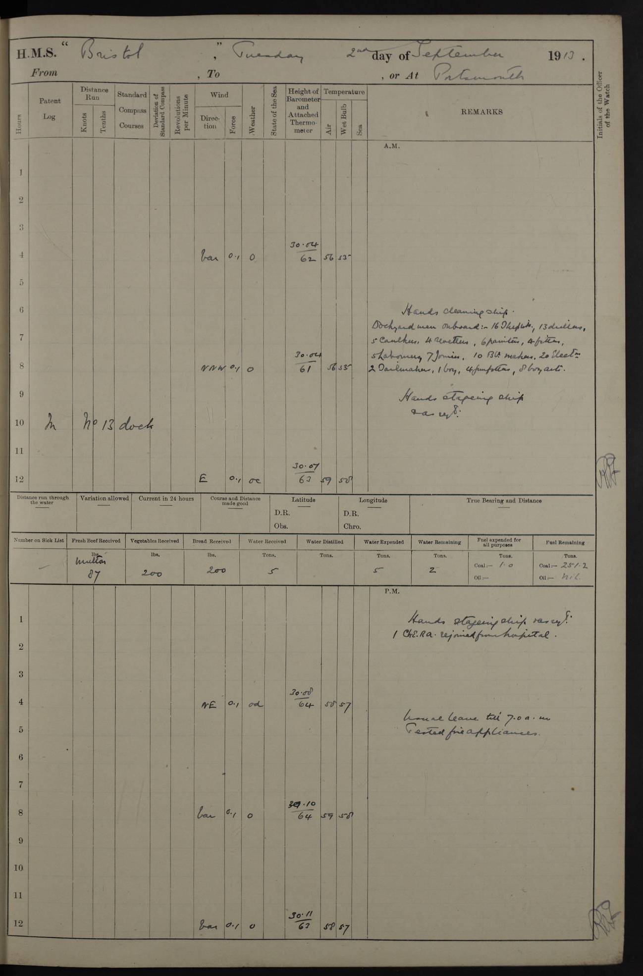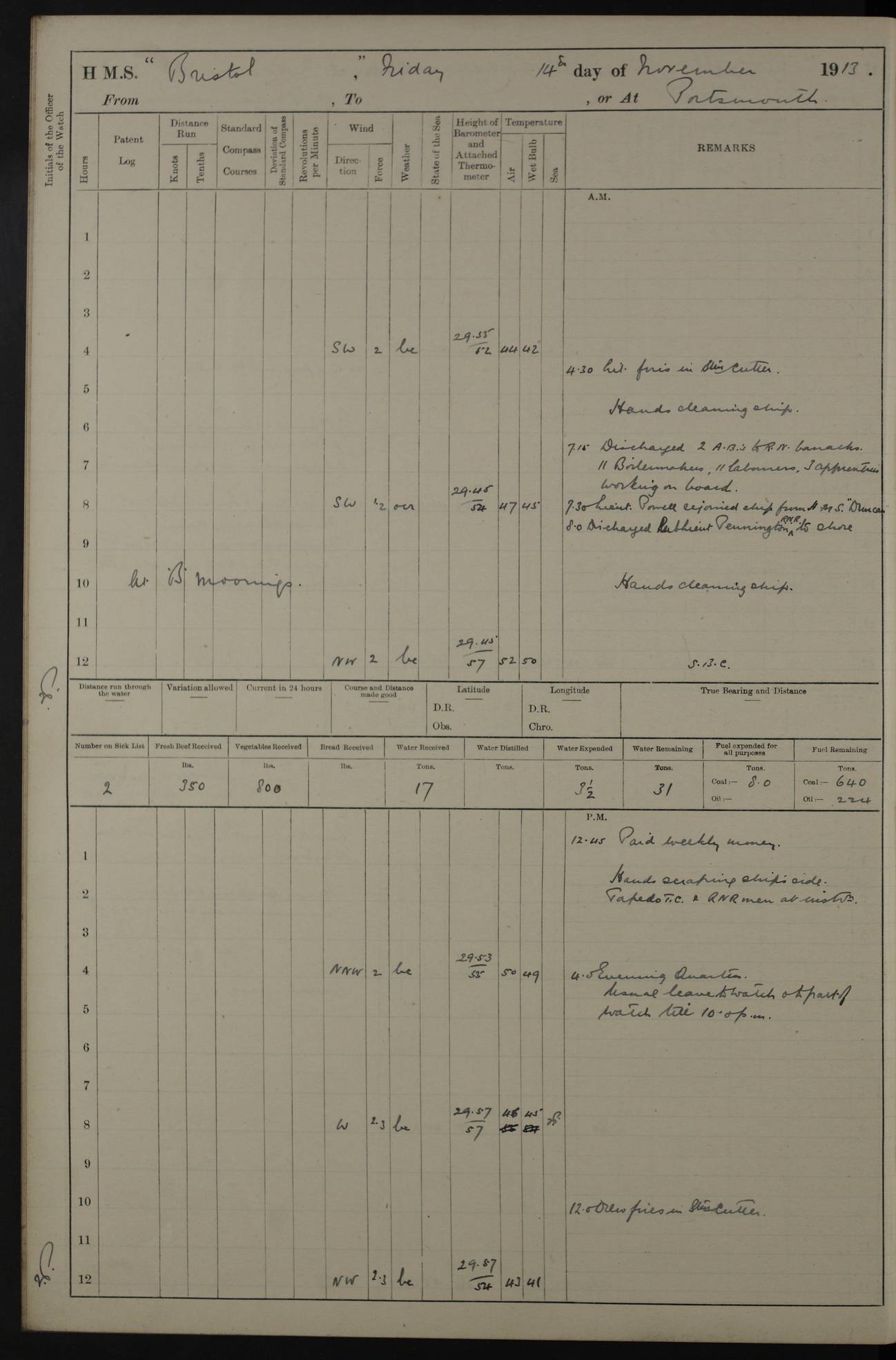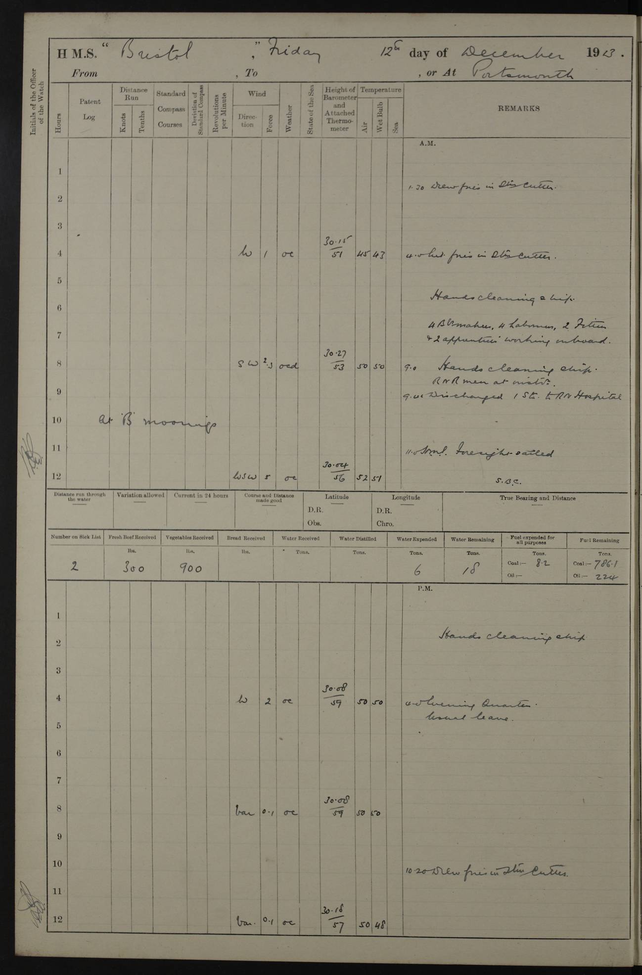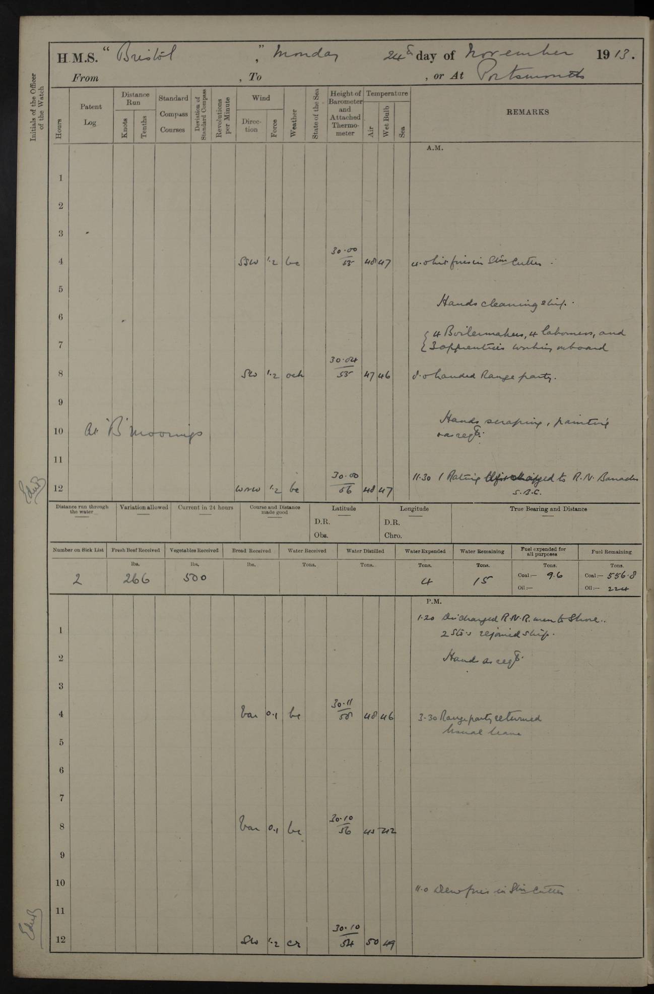 (Maps prepared using Journey Plotter, developed by Maikel. The Plots can only be approximate. They are made by joining-up positions on successive days, and sometimes positions are not given. There will therefore be occasions when the ship appears to have travelled overland) LOG BOOK – JULY 1ST 1913 TO JUNE 21ST 1914 4ef4f40ce53e0a0c91001323: (https://s3.amazonaws.com:443/oldweather/ADM53-36118/0001_0.jpg) 4ef4f40ce53e0a0c91001324: (https://s3.amazonaws.com:443/oldweather/ADM53-36118/0001_1.jpg) 4ef4f40de53e0a0c91001325: (https://s3.amazonaws.com:443/oldweather/ADM53-36118/0002_0.jpg) 4ef4f40de53e0a0c91001326: (https://s3.amazonaws.com:443/oldweather/ADM53-36118/0002_1.jpg) 4ef4f40de53e0a0c91001327: (https://s3.amazonaws.com:443/oldweather/ADM53-36118/0003_0.jpg) 4ef4f40de53e0a0c91001328: (https://s3.amazonaws.com:443/oldweather/ADM53-36118/0003_1.jpg) 4ef4f40de53e0a0c91001329: (https://s3.amazonaws.com:443/oldweather/ADM53-36118/0004_0.jpg) 4ef4f40de53e0a0c9100132a: (https://s3.amazonaws.com:443/oldweather/ADM53-36118/0004_1.jpg) LOG OF H.M.S. BRISTOL Commanded by Captain Basil Hew Fanshawe FOR THE PERIOD Commencing 1st of July 1913 Ending 21st of June 1914 Followed by her technical detail 4ef4f40de53e0a0c9100132b: (https://s3.amazonaws.com:443/oldweather/ADM53-36118/0005_0.jpg) Directions 4ef4f40de53e0a0c9100132c: (https://s3.amazonaws.com:443/oldweather/ADM53-36118/0005_1.jpg) Establishment of Ship’s Company: Full Commission: Officers: 18. Seamen: 111. Boys: 13. Marines: 28. Engine-room establishment: 168. Other non-executive ratings: 43. Total: 381 Active Commision: Officers: 14. Seamen: 53. Boys: 0. Marines: 17. Engine-room establishment: 64. Other non-executive ratings: 27. Total 175 Armament: Forecastle: 1 6” B.L. PV* Quarterdeck: 1 6” B.L. PV* Starboard waist: 5 4” B.L. PIV* Port waist: 5 4” B.L. PIV* 4 3 pounder for Saluting purpose, 2 in each battery Torpedo Two 18” submerged tubes Boats: 1 30 feet Steam Cutter 1 34 feet Cutter 2 30 feet Cutters 1 30 feet Gig 3 27 feet Whalers 2 18 feet Skiffs