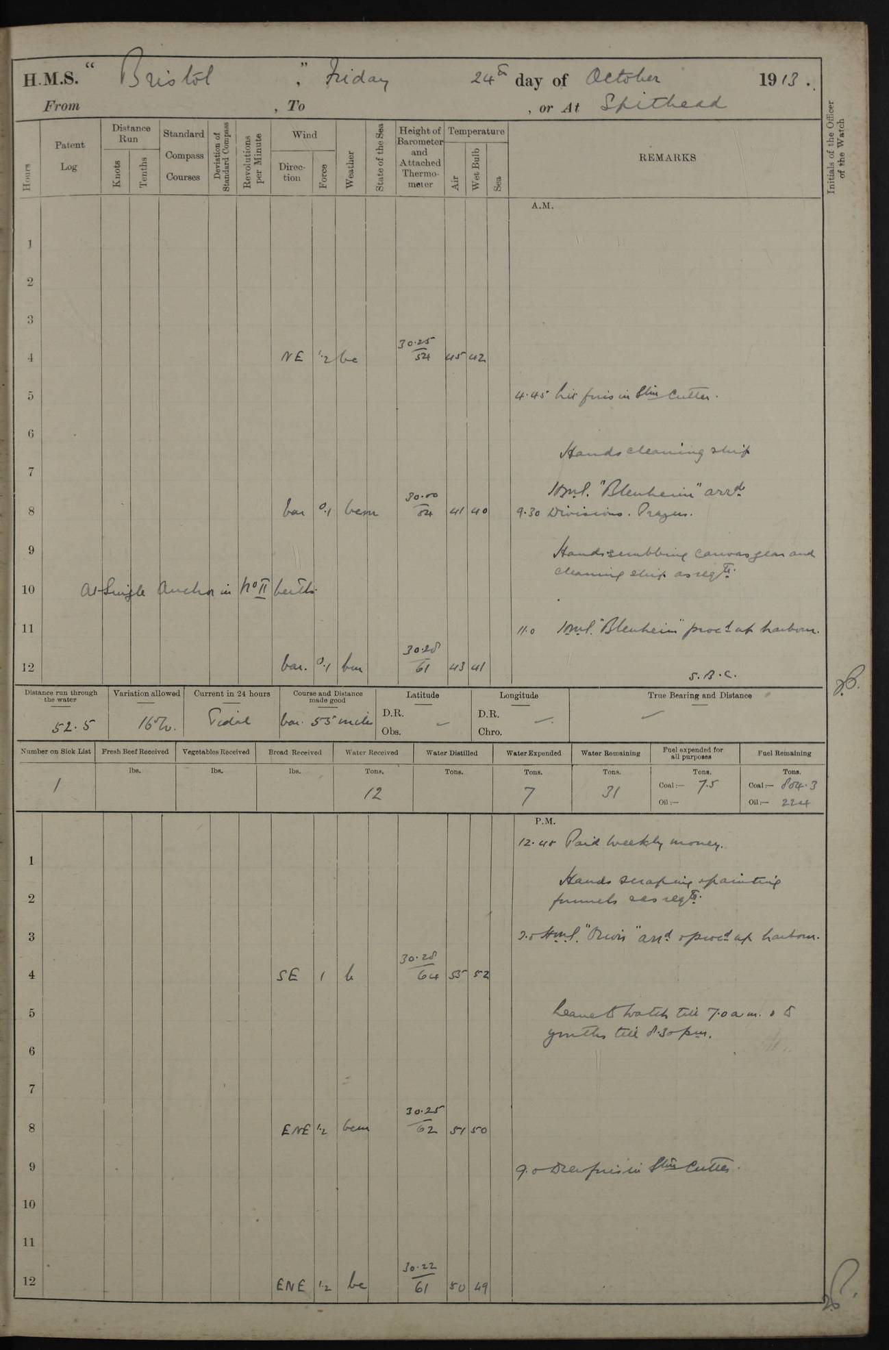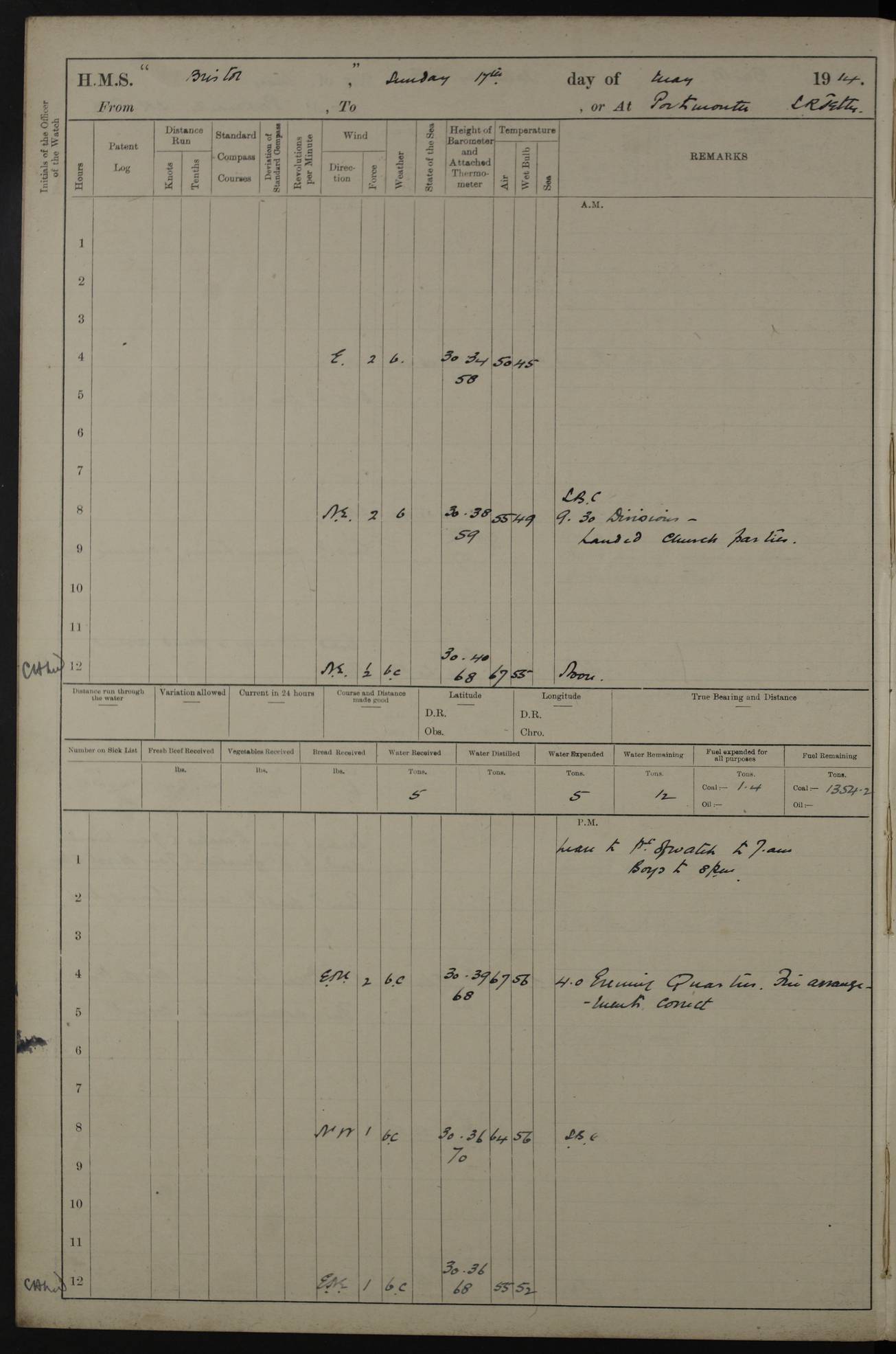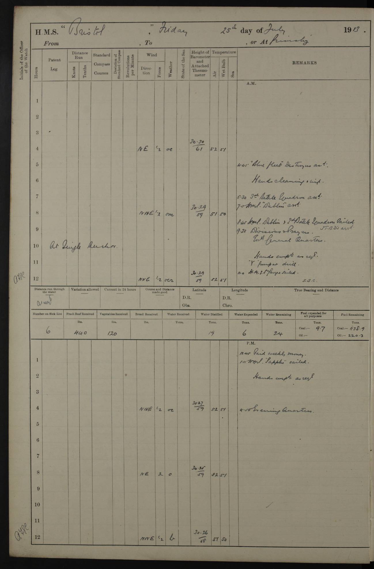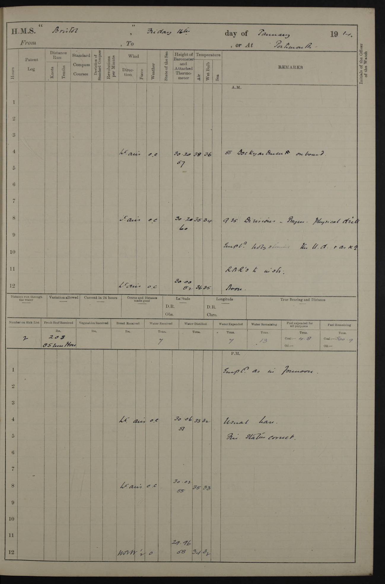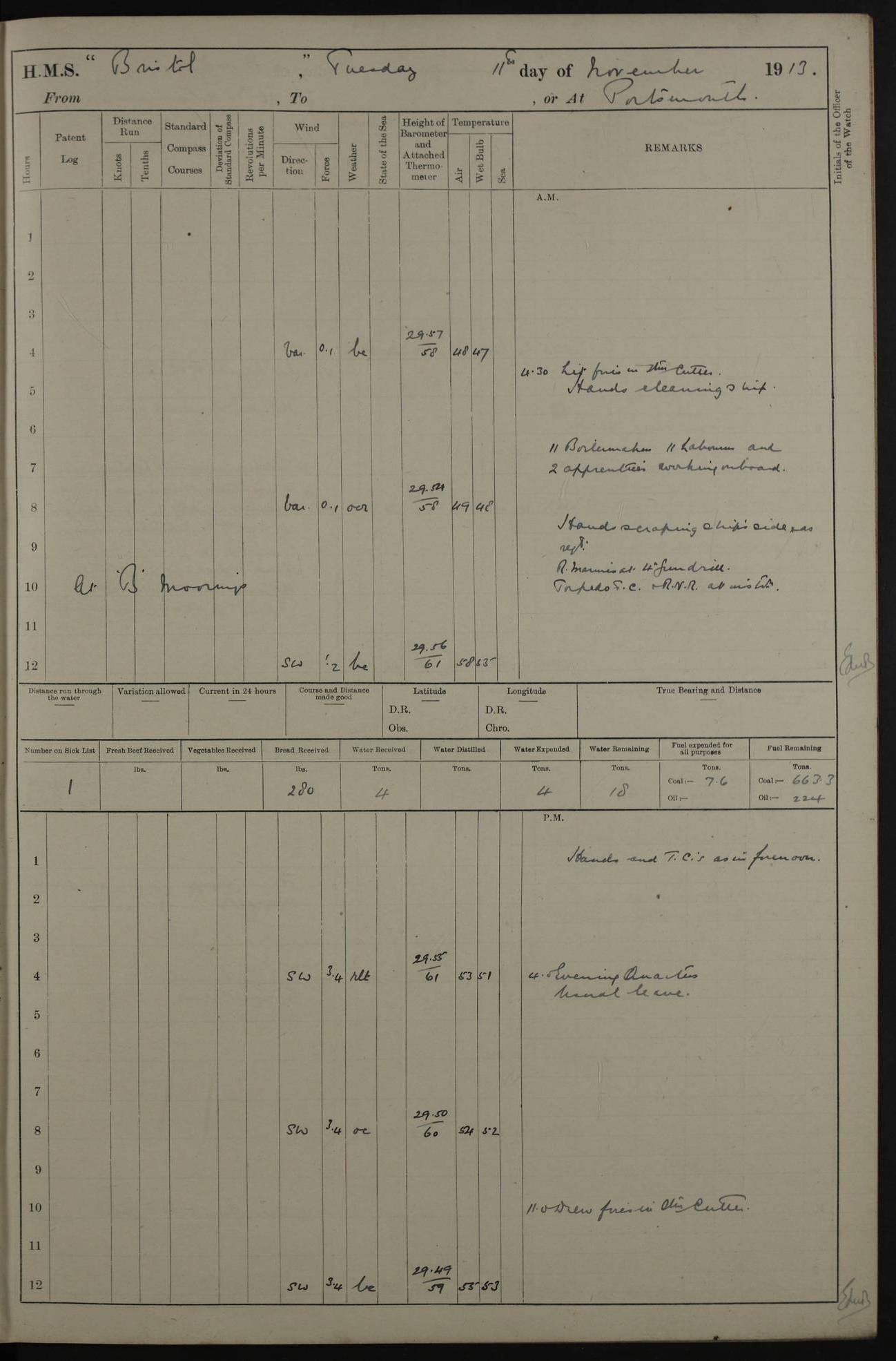 (Maps prepared using Journey Plotter, developed by Maikel. The Plots can only be approximate. They are made by joining-up positions on successive days, and sometimes positions are not given. There will therefore be occasions when the ship appears to have travelled overland) LOG BOOK – JULY 1ST 1913 TO JUNE 21ST 1914 4ef4f40ce53e0a0c91001323: (https://s3.amazonaws.com:443/oldweather/ADM53-36118/0001_0.jpg) 4ef4f40ce53e0a0c91001324: (https://s3.amazonaws.com:443/oldweather/ADM53-36118/0001_1.jpg) 4ef4f40de53e0a0c91001325: (https://s3.amazonaws.com:443/oldweather/ADM53-36118/0002_0.jpg) 4ef4f40de53e0a0c91001326: (https://s3.amazonaws.com:443/oldweather/ADM53-36118/0002_1.jpg) 4ef4f40de53e0a0c91001327: (https://s3.amazonaws.com:443/oldweather/ADM53-36118/0003_0.jpg) 4ef4f40de53e0a0c91001328: (https://s3.amazonaws.com:443/oldweather/ADM53-36118/0003_1.jpg) 4ef4f40de53e0a0c91001329: (https://s3.amazonaws.com:443/oldweather/ADM53-36118/0004_0.jpg) 4ef4f40de53e0a0c9100132a: (https://s3.amazonaws.com:443/oldweather/ADM53-36118/0004_1.jpg) LOG OF H.M.S. BRISTOL Commanded by Captain Basil Hew Fanshawe FOR THE PERIOD Commencing 1st of July 1913 Ending 21st of June 1914 Followed by her technical detail 4ef4f40de53e0a0c9100132b: (https://s3.amazonaws.com:443/oldweather/ADM53-36118/0005_0.jpg) Directions 4ef4f40de53e0a0c9100132c: (https://s3.amazonaws.com:443/oldweather/ADM53-36118/0005_1.jpg) Establishment of Ship’s Company: Full Commission: Officers: 18. Seamen: 111. Boys: 13. Marines: 28. Engine-room establishment: 168. Other non-executive ratings: 43. Total: 381 Active Commision: Officers: 14. Seamen: 53. Boys: 0. Marines: 17. Engine-room establishment: 64. Other non-executive ratings: 27. Total 175 Armament: Forecastle: 1 6” B.L. PV* Quarterdeck: 1 6” B.L. PV* Starboard waist: 5 4” B.L. PIV* Port waist: 5 4” B.L. PIV* 4 3 pounder for Saluting purpose, 2 in each battery Torpedo Two 18” submerged tubes Boats: 1 30 feet Steam Cutter 1 34 feet Cutter 2 30 feet Cutters 1 30 feet Gig 3 27 feet Whalers 2 18 feet Skiffs