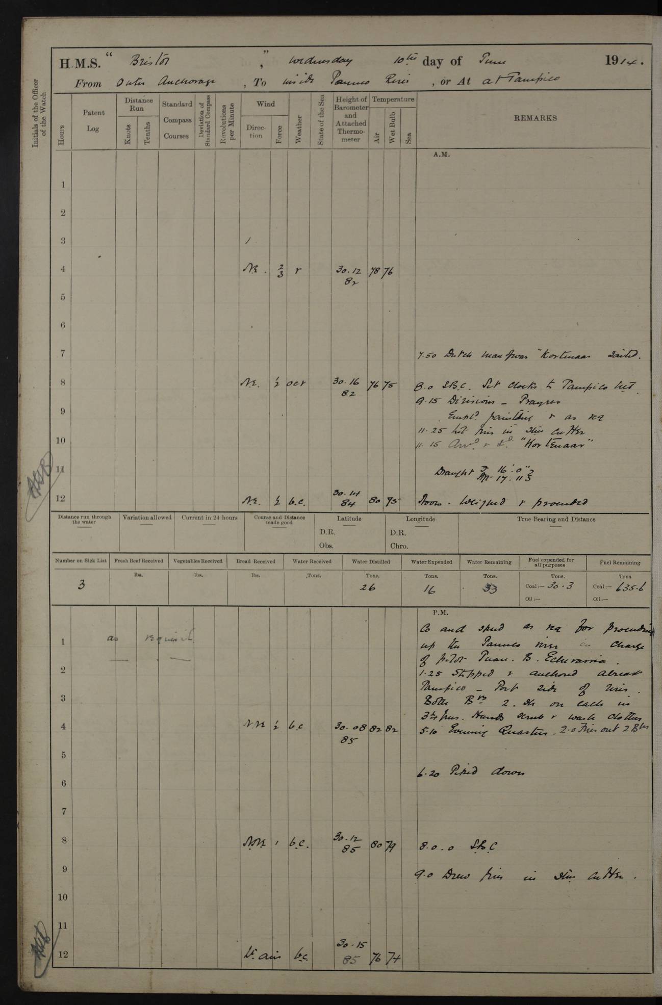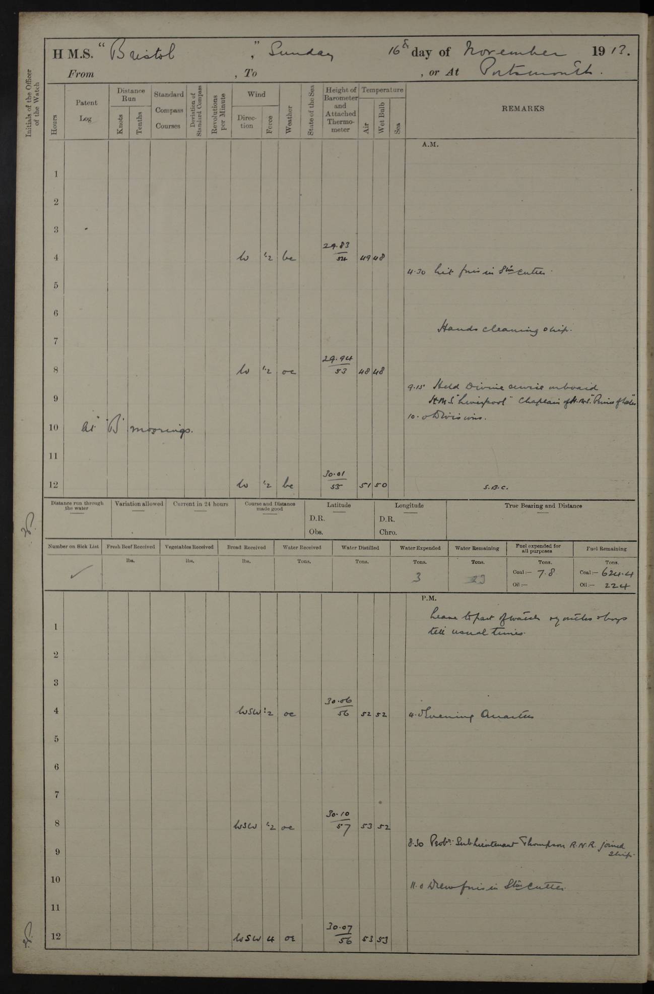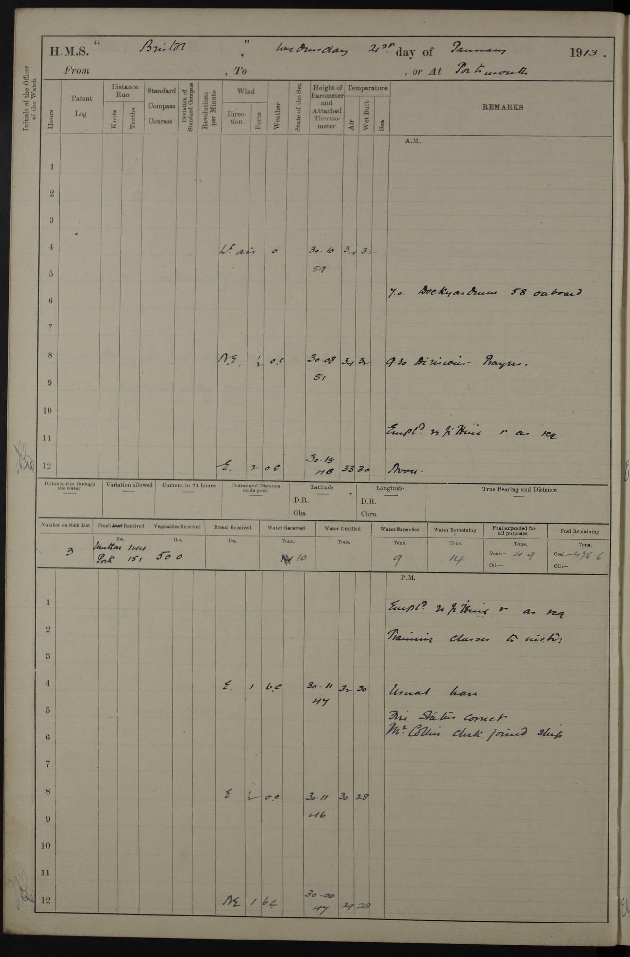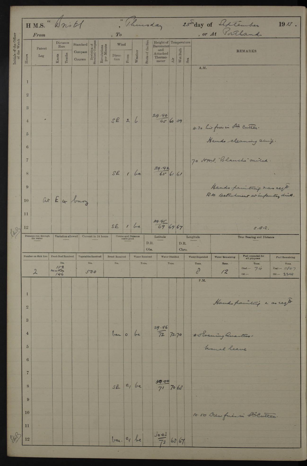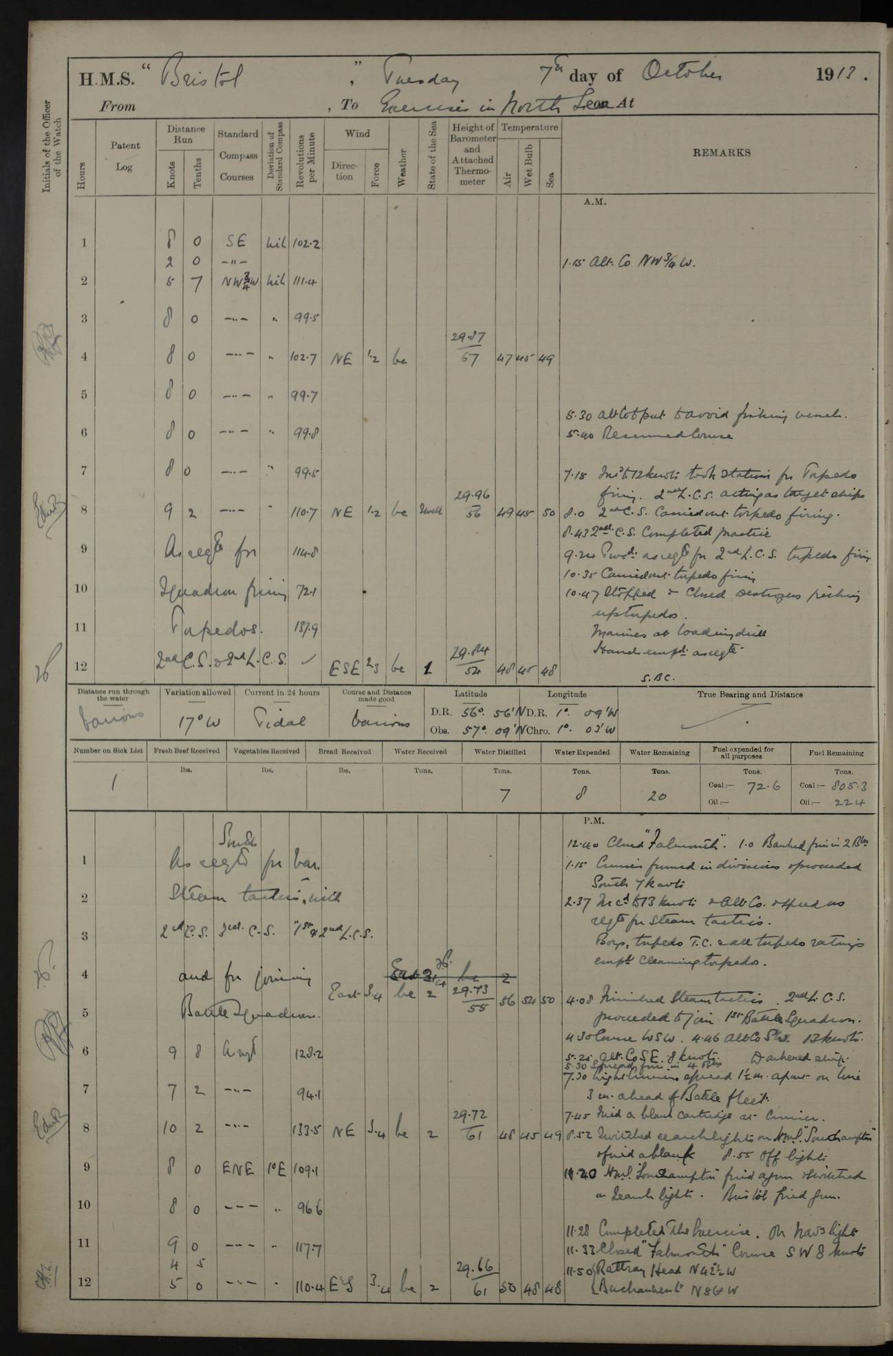 (Maps prepared using Journey Plotter, developed by Maikel. The Plots can only be approximate. They are made by joining-up positions on successive days, and sometimes positions are not given. There will therefore be occasions when the ship appears to have travelled overland) LOG BOOK – JULY 1ST 1913 TO JUNE 21ST 1914 4ef4f40ce53e0a0c91001323: (https://s3.amazonaws.com:443/oldweather/ADM53-36118/0001_0.jpg) 4ef4f40ce53e0a0c91001324: (https://s3.amazonaws.com:443/oldweather/ADM53-36118/0001_1.jpg) 4ef4f40de53e0a0c91001325: (https://s3.amazonaws.com:443/oldweather/ADM53-36118/0002_0.jpg) 4ef4f40de53e0a0c91001326: (https://s3.amazonaws.com:443/oldweather/ADM53-36118/0002_1.jpg) 4ef4f40de53e0a0c91001327: (https://s3.amazonaws.com:443/oldweather/ADM53-36118/0003_0.jpg) 4ef4f40de53e0a0c91001328: (https://s3.amazonaws.com:443/oldweather/ADM53-36118/0003_1.jpg) 4ef4f40de53e0a0c91001329: (https://s3.amazonaws.com:443/oldweather/ADM53-36118/0004_0.jpg) 4ef4f40de53e0a0c9100132a: (https://s3.amazonaws.com:443/oldweather/ADM53-36118/0004_1.jpg) LOG OF H.M.S. BRISTOL Commanded by Captain Basil Hew Fanshawe FOR THE PERIOD Commencing 1st of July 1913 Ending 21st of June 1914 Followed by her technical detail 4ef4f40de53e0a0c9100132b: (https://s3.amazonaws.com:443/oldweather/ADM53-36118/0005_0.jpg) Directions 4ef4f40de53e0a0c9100132c: (https://s3.amazonaws.com:443/oldweather/ADM53-36118/0005_1.jpg) Establishment of Ship’s Company: Full Commission: Officers: 18. Seamen: 111. Boys: 13. Marines: 28. Engine-room establishment: 168. Other non-executive ratings: 43. Total: 381 Active Commision: Officers: 14. Seamen: 53. Boys: 0. Marines: 17. Engine-room establishment: 64. Other non-executive ratings: 27. Total 175 Armament: Forecastle: 1 6” B.L. PV* Quarterdeck: 1 6” B.L. PV* Starboard waist: 5 4” B.L. PIV* Port waist: 5 4” B.L. PIV* 4 3 pounder for Saluting purpose, 2 in each battery Torpedo Two 18” submerged tubes Boats: 1 30 feet Steam Cutter 1 34 feet Cutter 2 30 feet Cutters 1 30 feet Gig 3 27 feet Whalers 2 18 feet Skiffs