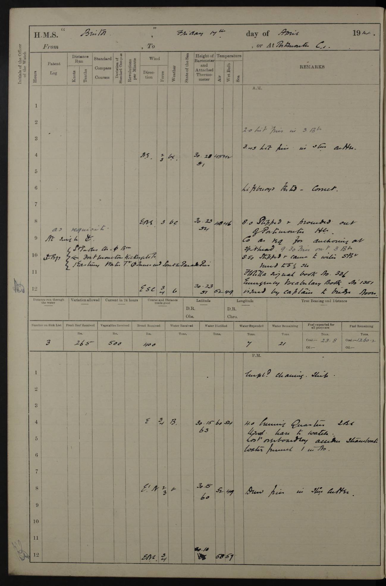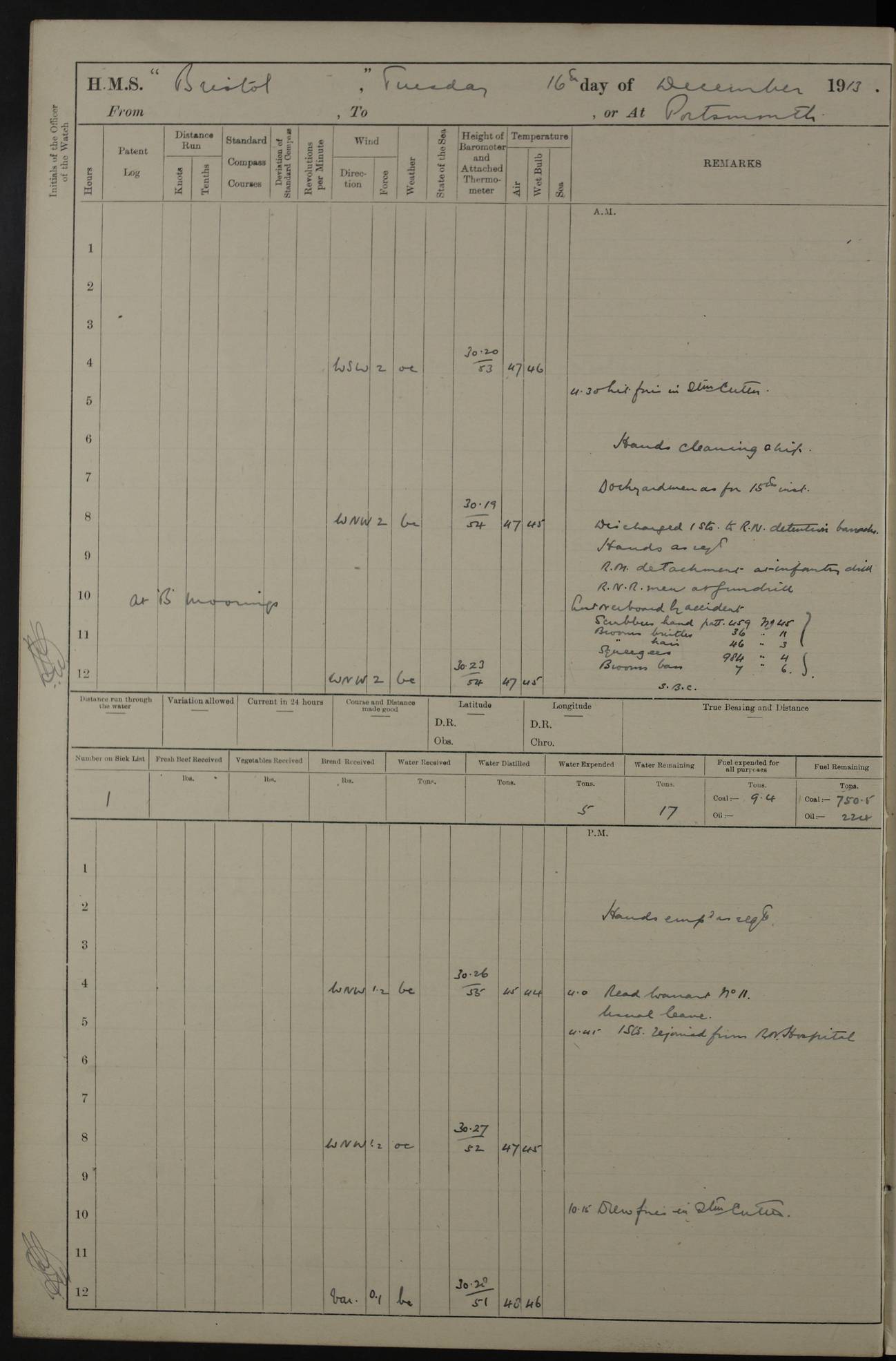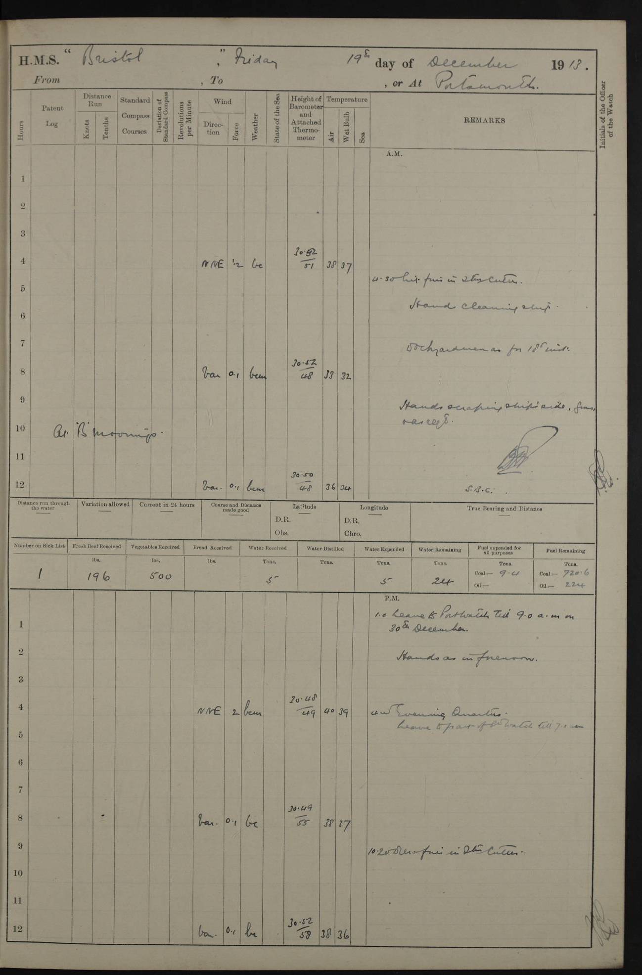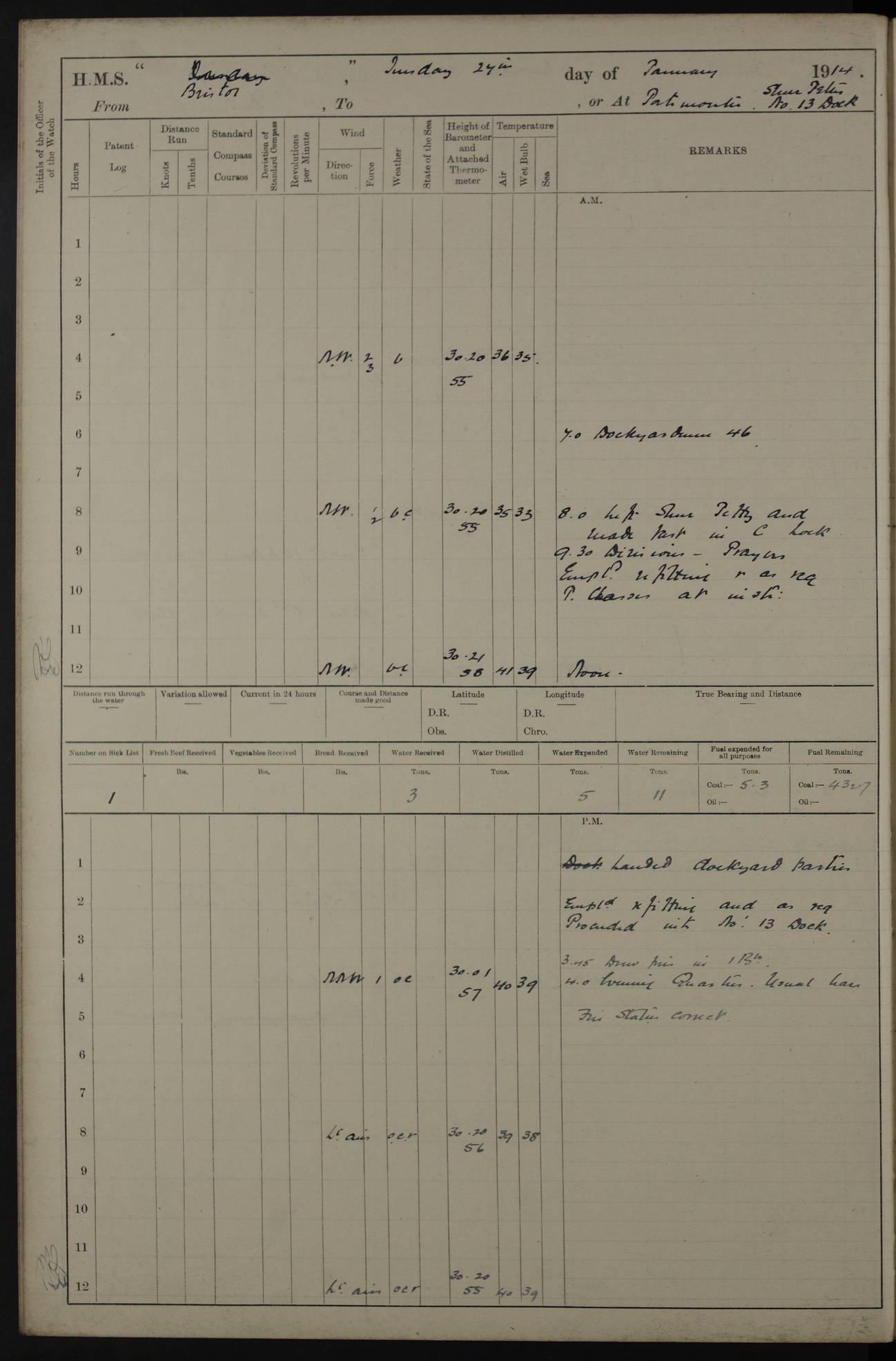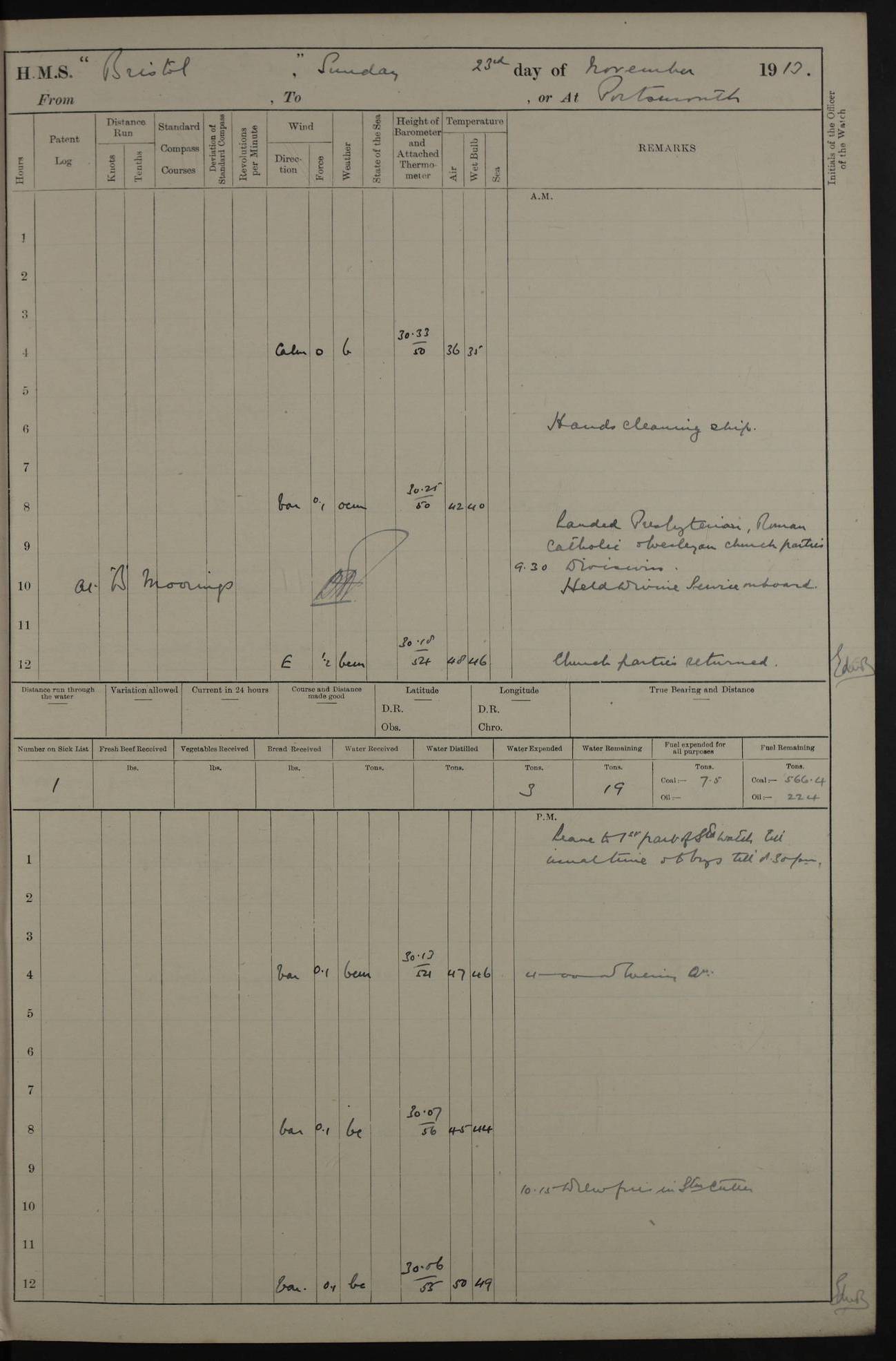 (Maps prepared using Journey Plotter, developed by Maikel. The Plots can only be approximate. They are made by joining-up positions on successive days, and sometimes positions are not given. There will therefore be occasions when the ship appears to have travelled overland) LOG BOOK – JULY 1ST 1913 TO JUNE 21ST 1914 4ef4f40ce53e0a0c91001323: (https://s3.amazonaws.com:443/oldweather/ADM53-36118/0001_0.jpg) 4ef4f40ce53e0a0c91001324: (https://s3.amazonaws.com:443/oldweather/ADM53-36118/0001_1.jpg) 4ef4f40de53e0a0c91001325: (https://s3.amazonaws.com:443/oldweather/ADM53-36118/0002_0.jpg) 4ef4f40de53e0a0c91001326: (https://s3.amazonaws.com:443/oldweather/ADM53-36118/0002_1.jpg) 4ef4f40de53e0a0c91001327: (https://s3.amazonaws.com:443/oldweather/ADM53-36118/0003_0.jpg) 4ef4f40de53e0a0c91001328: (https://s3.amazonaws.com:443/oldweather/ADM53-36118/0003_1.jpg) 4ef4f40de53e0a0c91001329: (https://s3.amazonaws.com:443/oldweather/ADM53-36118/0004_0.jpg) 4ef4f40de53e0a0c9100132a: (https://s3.amazonaws.com:443/oldweather/ADM53-36118/0004_1.jpg) LOG OF H.M.S. BRISTOL Commanded by Captain Basil Hew Fanshawe FOR THE PERIOD Commencing 1st of July 1913 Ending 21st of June 1914 Followed by her technical detail 4ef4f40de53e0a0c9100132b: (https://s3.amazonaws.com:443/oldweather/ADM53-36118/0005_0.jpg) Directions 4ef4f40de53e0a0c9100132c: (https://s3.amazonaws.com:443/oldweather/ADM53-36118/0005_1.jpg) Establishment of Ship’s Company: Full Commission: Officers: 18. Seamen: 111. Boys: 13. Marines: 28. Engine-room establishment: 168. Other non-executive ratings: 43. Total: 381 Active Commision: Officers: 14. Seamen: 53. Boys: 0. Marines: 17. Engine-room establishment: 64. Other non-executive ratings: 27. Total 175 Armament: Forecastle: 1 6” B.L. PV* Quarterdeck: 1 6” B.L. PV* Starboard waist: 5 4” B.L. PIV* Port waist: 5 4” B.L. PIV* 4 3 pounder for Saluting purpose, 2 in each battery Torpedo Two 18” submerged tubes Boats: 1 30 feet Steam Cutter 1 34 feet Cutter 2 30 feet Cutters 1 30 feet Gig 3 27 feet Whalers 2 18 feet Skiffs