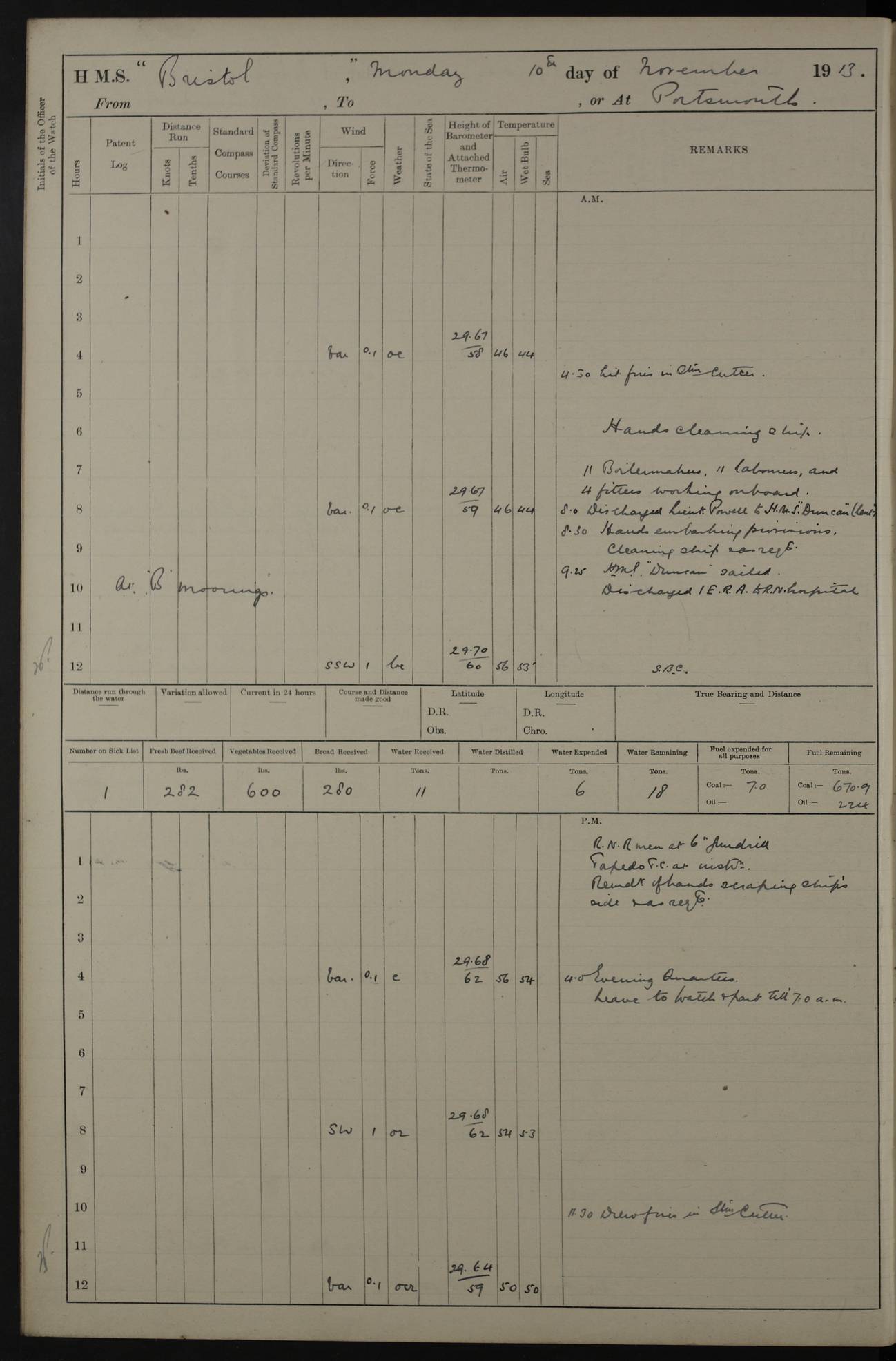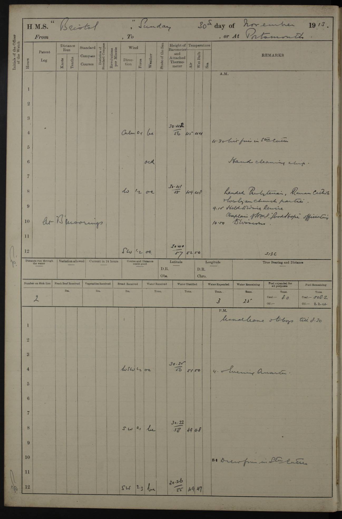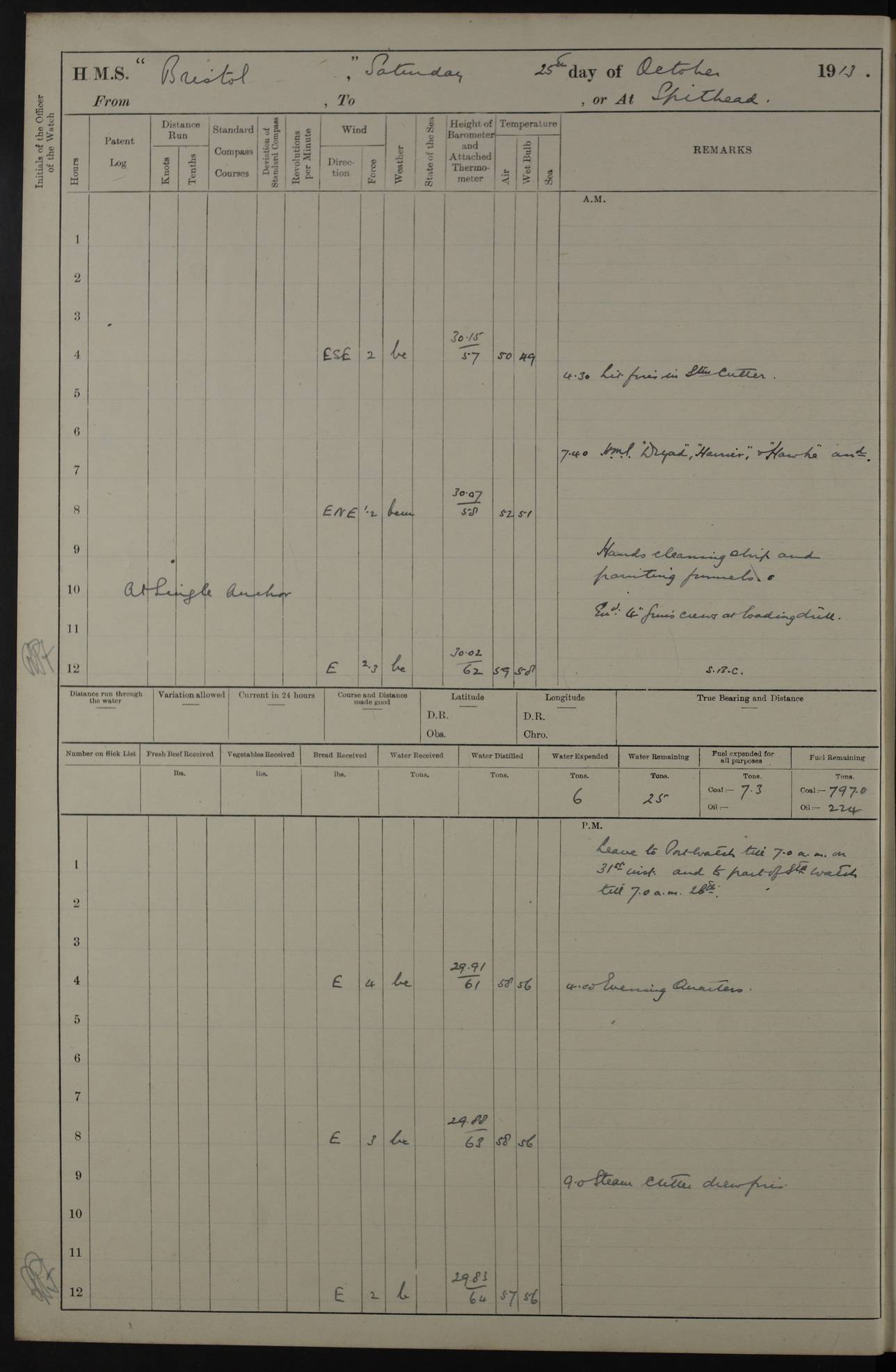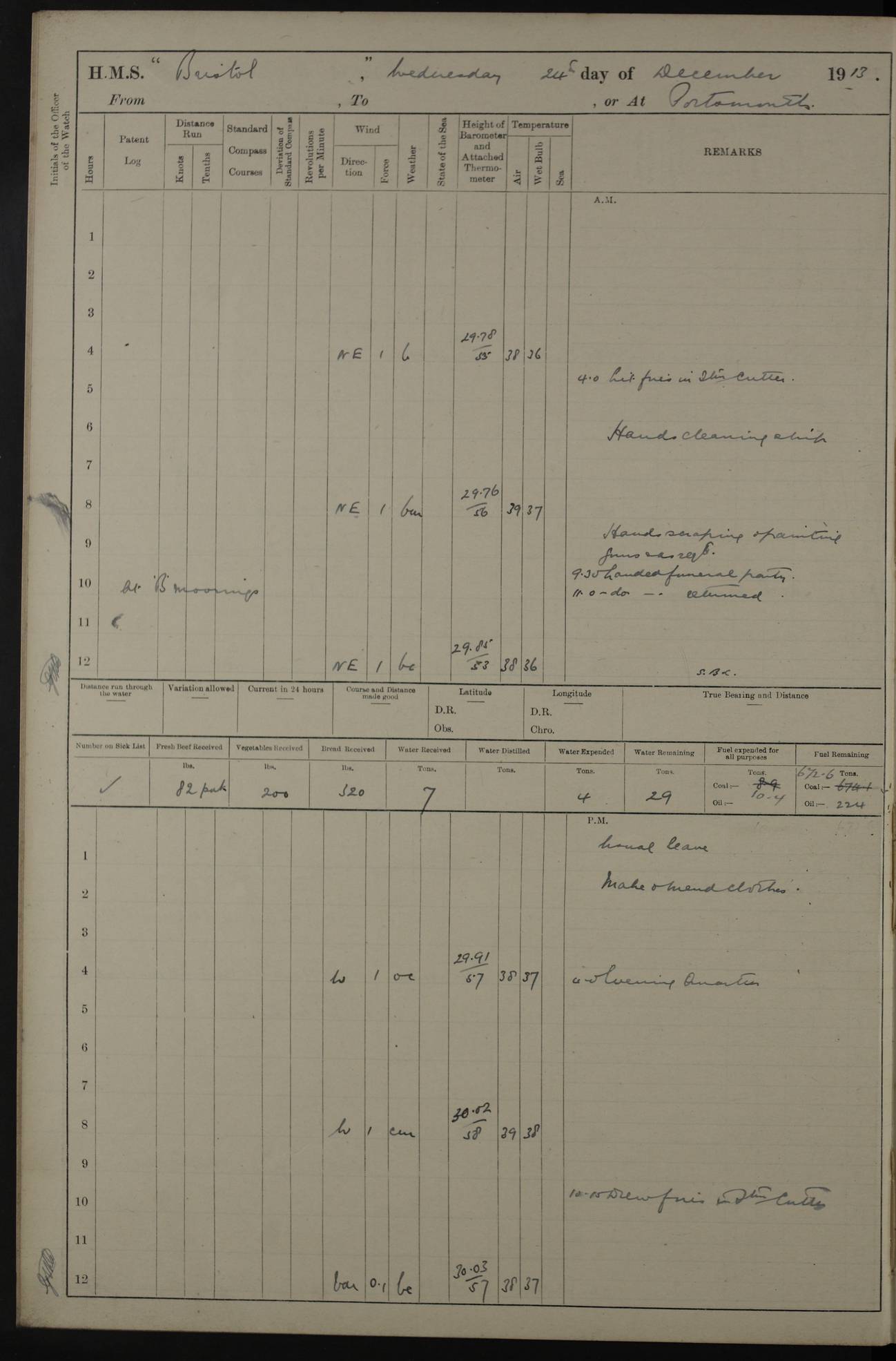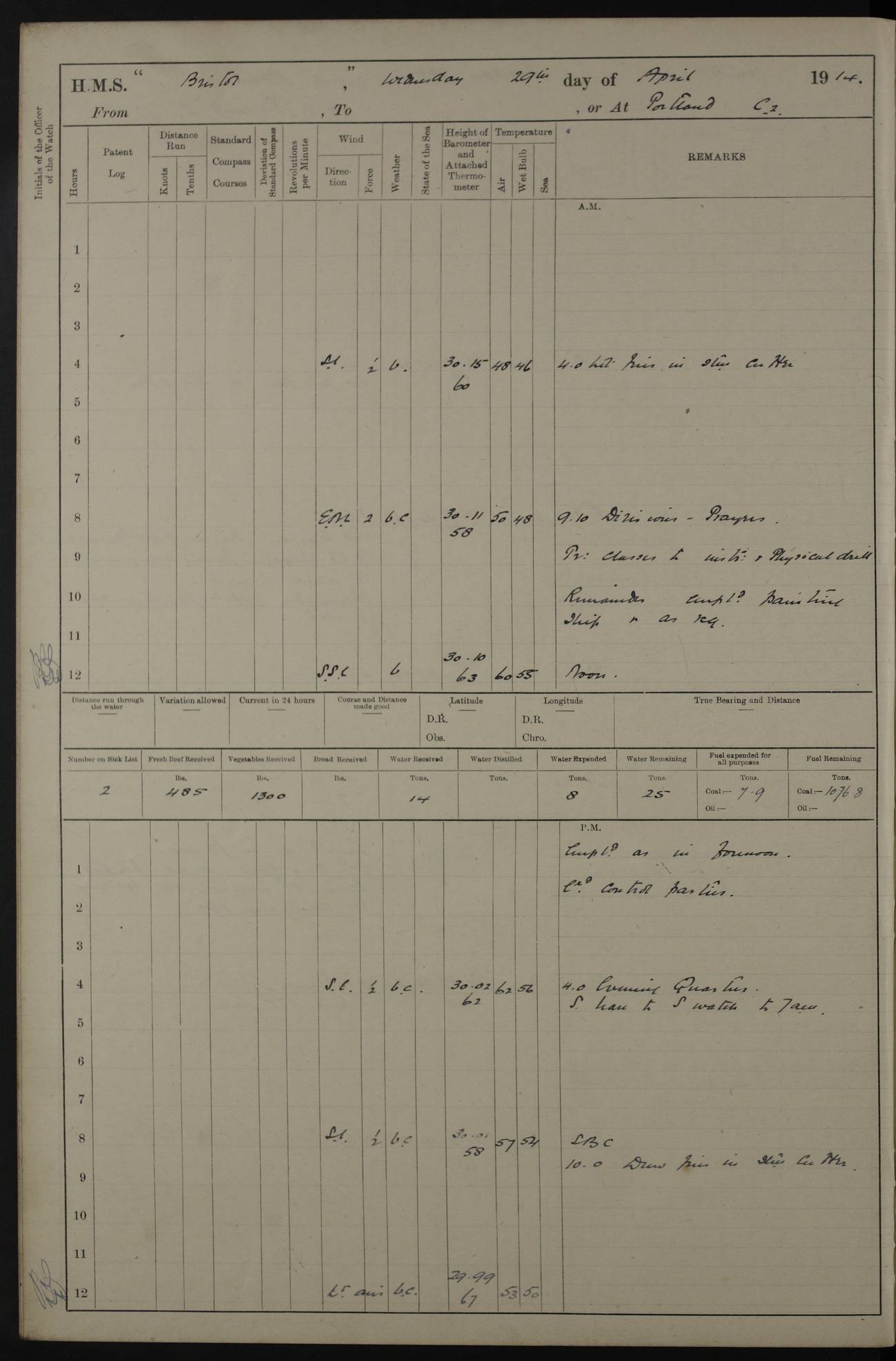 (Maps prepared using Journey Plotter, developed by Maikel. The Plots can only be approximate. They are made by joining-up positions on successive days, and sometimes positions are not given. There will therefore be occasions when the ship appears to have travelled overland) LOG BOOK – JULY 1ST 1913 TO JUNE 21ST 1914 4ef4f40ce53e0a0c91001323: (https://s3.amazonaws.com:443/oldweather/ADM53-36118/0001_0.jpg) 4ef4f40ce53e0a0c91001324: (https://s3.amazonaws.com:443/oldweather/ADM53-36118/0001_1.jpg) 4ef4f40de53e0a0c91001325: (https://s3.amazonaws.com:443/oldweather/ADM53-36118/0002_0.jpg) 4ef4f40de53e0a0c91001326: (https://s3.amazonaws.com:443/oldweather/ADM53-36118/0002_1.jpg) 4ef4f40de53e0a0c91001327: (https://s3.amazonaws.com:443/oldweather/ADM53-36118/0003_0.jpg) 4ef4f40de53e0a0c91001328: (https://s3.amazonaws.com:443/oldweather/ADM53-36118/0003_1.jpg) 4ef4f40de53e0a0c91001329: (https://s3.amazonaws.com:443/oldweather/ADM53-36118/0004_0.jpg) 4ef4f40de53e0a0c9100132a: (https://s3.amazonaws.com:443/oldweather/ADM53-36118/0004_1.jpg) LOG OF H.M.S. BRISTOL Commanded by Captain Basil Hew Fanshawe FOR THE PERIOD Commencing 1st of July 1913 Ending 21st of June 1914 Followed by her technical detail 4ef4f40de53e0a0c9100132b: (https://s3.amazonaws.com:443/oldweather/ADM53-36118/0005_0.jpg) Directions 4ef4f40de53e0a0c9100132c: (https://s3.amazonaws.com:443/oldweather/ADM53-36118/0005_1.jpg) Establishment of Ship’s Company: Full Commission: Officers: 18. Seamen: 111. Boys: 13. Marines: 28. Engine-room establishment: 168. Other non-executive ratings: 43. Total: 381 Active Commision: Officers: 14. Seamen: 53. Boys: 0. Marines: 17. Engine-room establishment: 64. Other non-executive ratings: 27. Total 175 Armament: Forecastle: 1 6” B.L. PV* Quarterdeck: 1 6” B.L. PV* Starboard waist: 5 4” B.L. PIV* Port waist: 5 4” B.L. PIV* 4 3 pounder for Saluting purpose, 2 in each battery Torpedo Two 18” submerged tubes Boats: 1 30 feet Steam Cutter 1 34 feet Cutter 2 30 feet Cutters 1 30 feet Gig 3 27 feet Whalers 2 18 feet Skiffs
