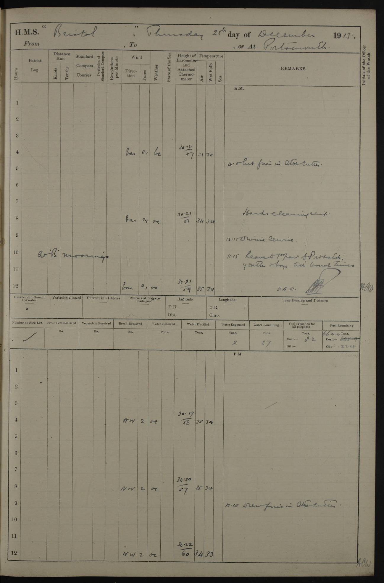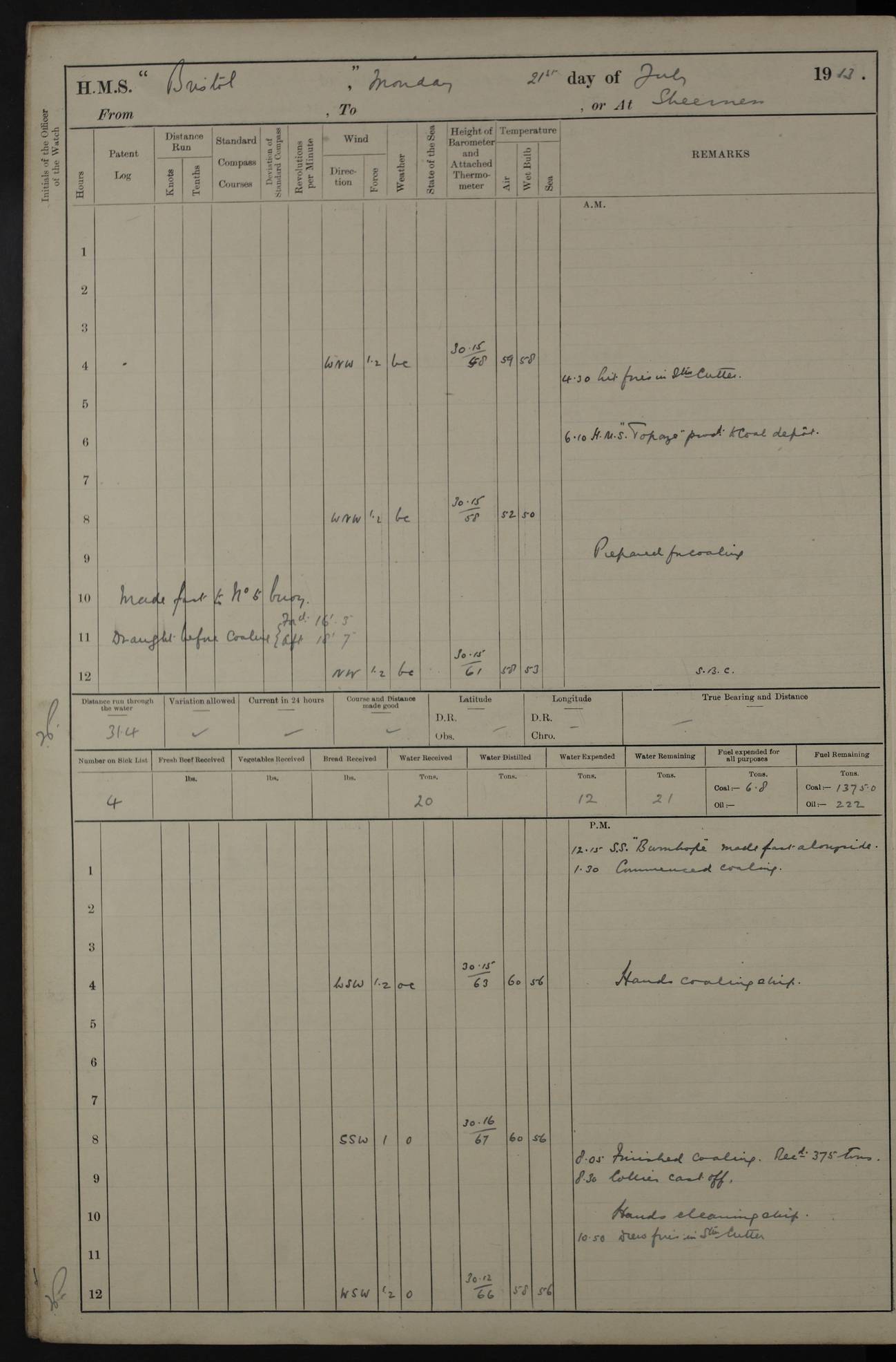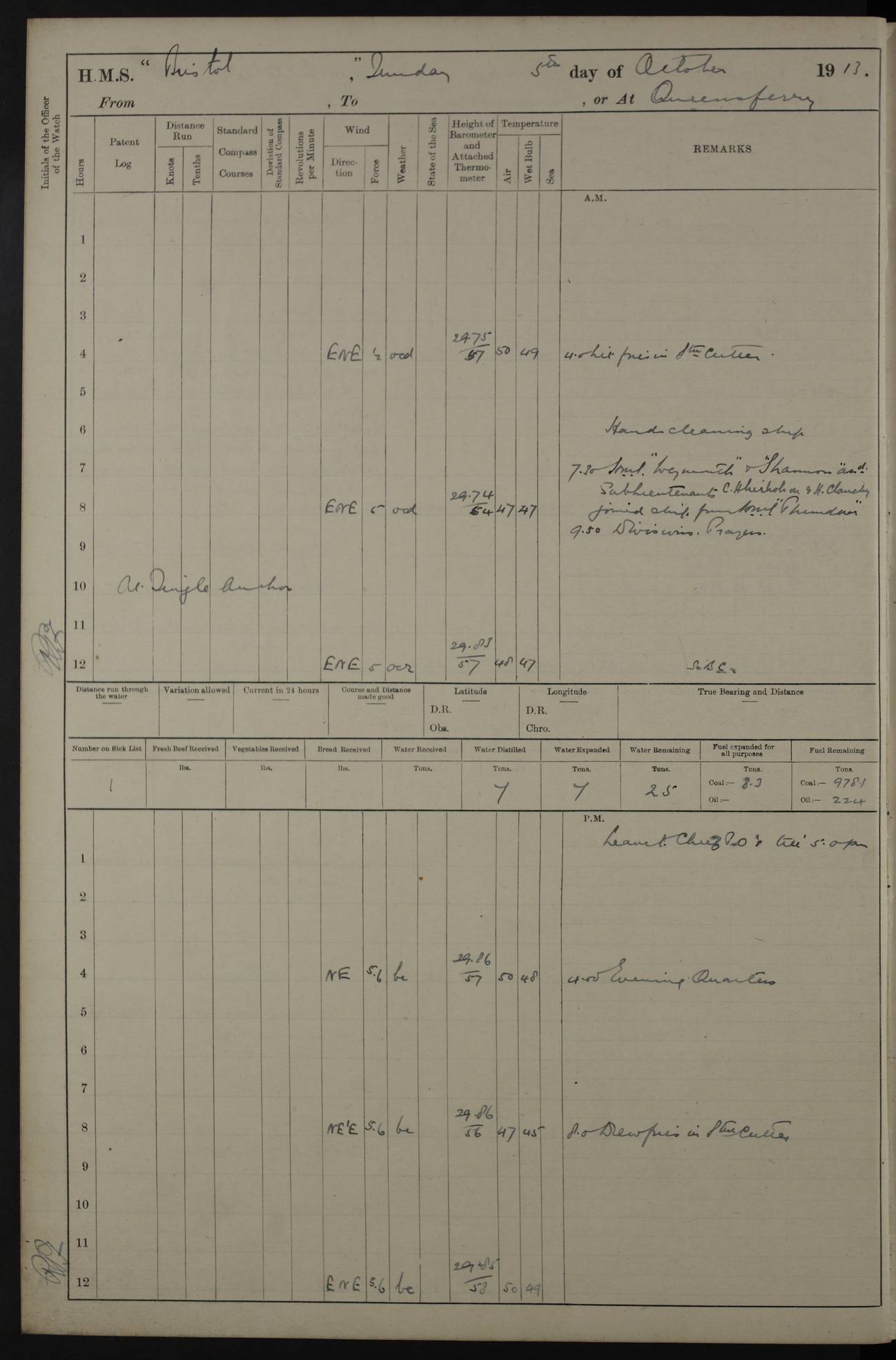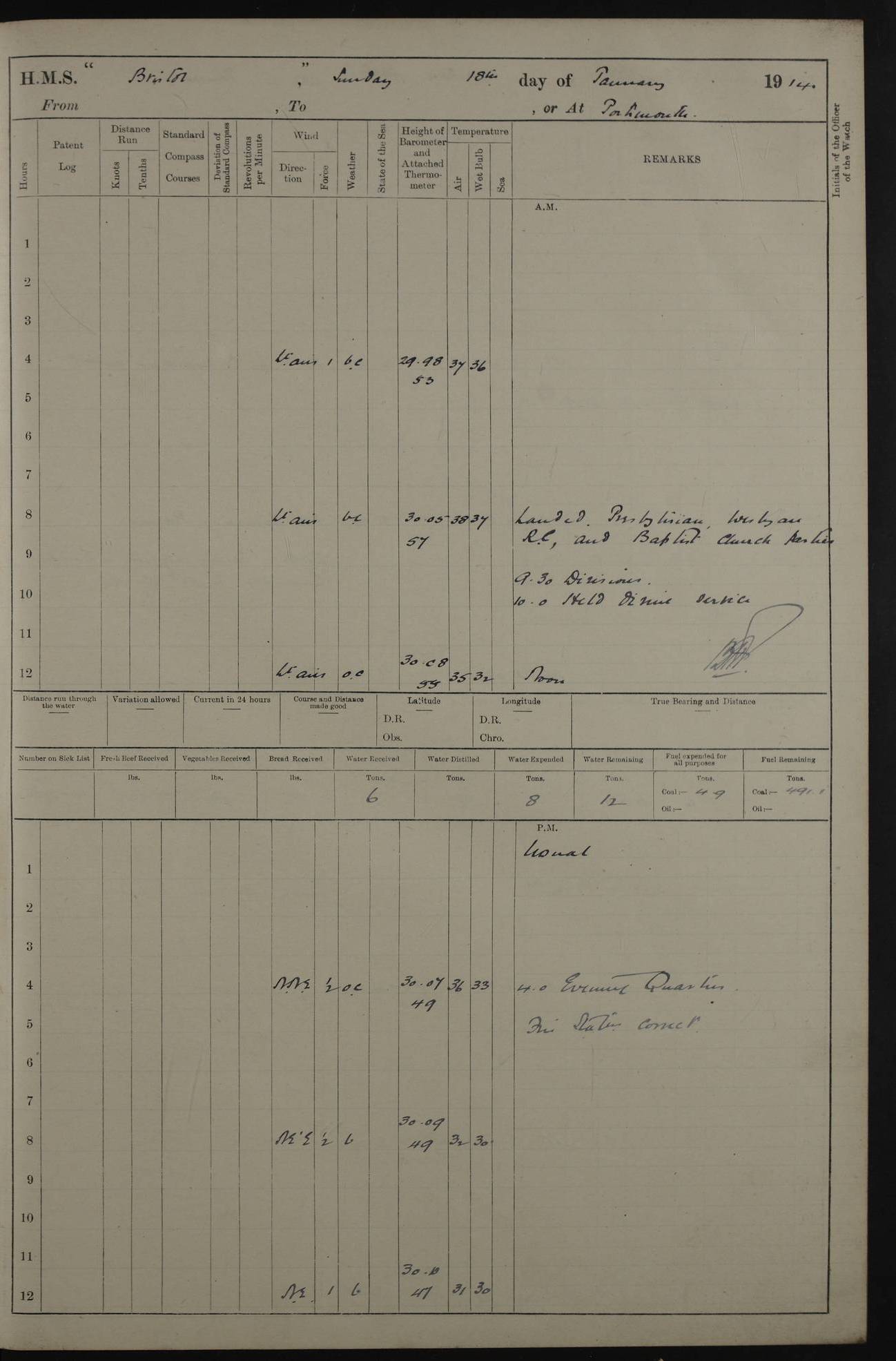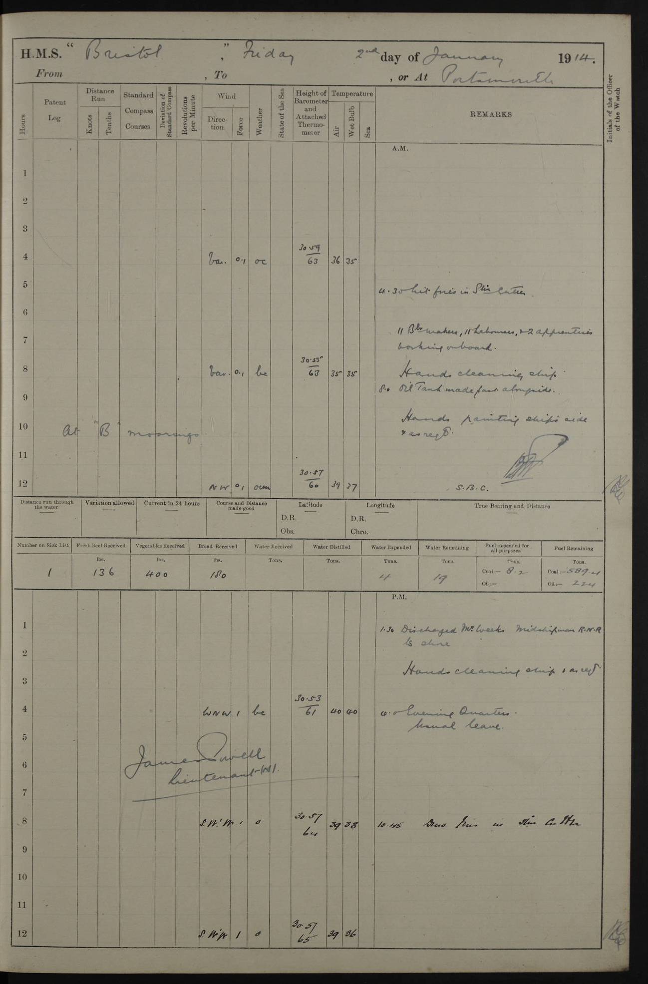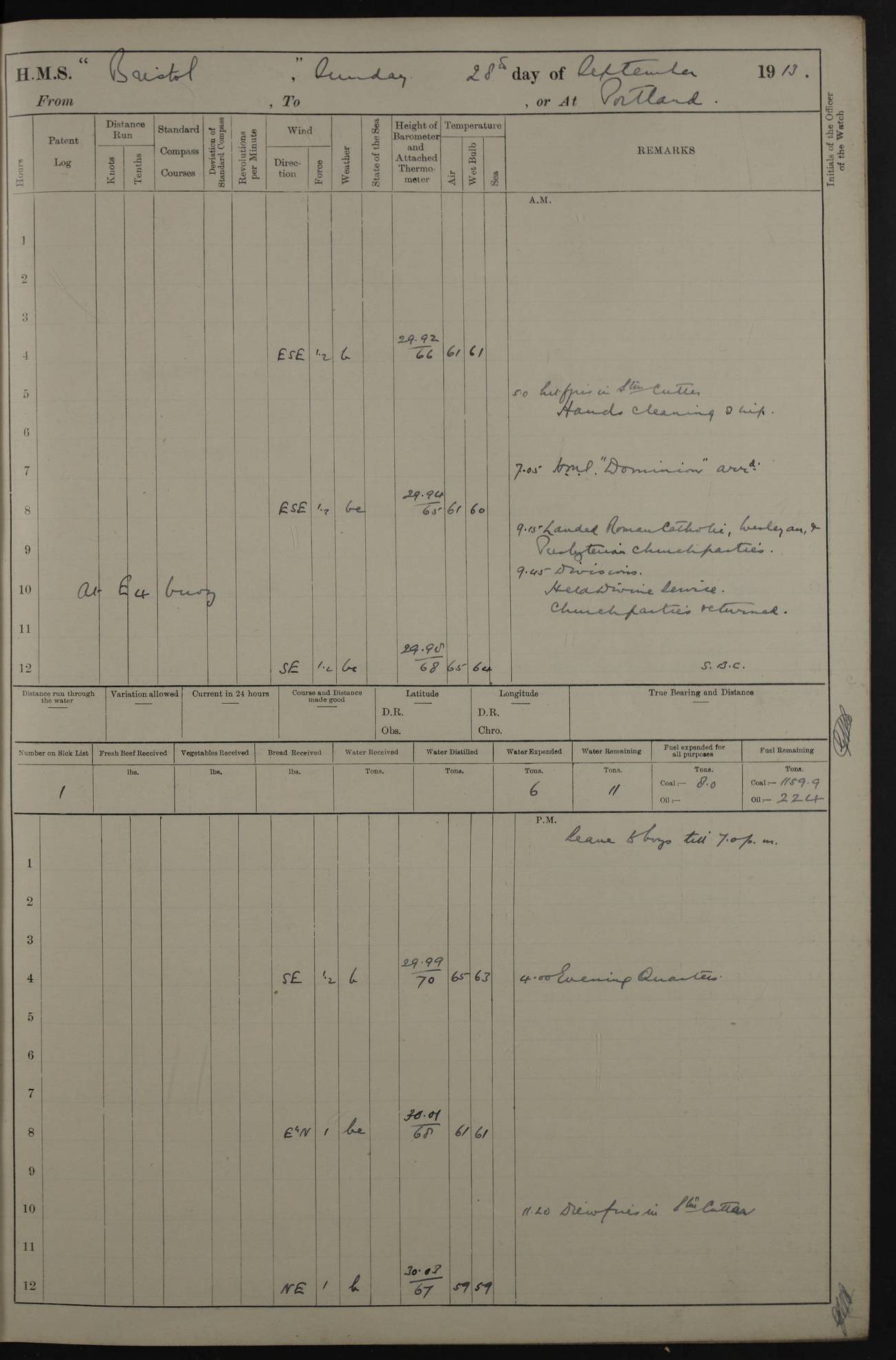 (Maps prepared using Journey Plotter, developed by Maikel. The Plots can only be approximate. They are made by joining-up positions on successive days, and sometimes positions are not given. There will therefore be occasions when the ship appears to have travelled overland) LOG BOOK – JULY 1ST 1913 TO JUNE 21ST 1914 4ef4f40ce53e0a0c91001323: (https://s3.amazonaws.com:443/oldweather/ADM53-36118/0001_0.jpg) 4ef4f40ce53e0a0c91001324: (https://s3.amazonaws.com:443/oldweather/ADM53-36118/0001_1.jpg) 4ef4f40de53e0a0c91001325: (https://s3.amazonaws.com:443/oldweather/ADM53-36118/0002_0.jpg) 4ef4f40de53e0a0c91001326: (https://s3.amazonaws.com:443/oldweather/ADM53-36118/0002_1.jpg) 4ef4f40de53e0a0c91001327: (https://s3.amazonaws.com:443/oldweather/ADM53-36118/0003_0.jpg) 4ef4f40de53e0a0c91001328: (https://s3.amazonaws.com:443/oldweather/ADM53-36118/0003_1.jpg) 4ef4f40de53e0a0c91001329: (https://s3.amazonaws.com:443/oldweather/ADM53-36118/0004_0.jpg) 4ef4f40de53e0a0c9100132a: (https://s3.amazonaws.com:443/oldweather/ADM53-36118/0004_1.jpg) LOG OF H.M.S. BRISTOL Commanded by Captain Basil Hew Fanshawe FOR THE PERIOD Commencing 1st of July 1913 Ending 21st of June 1914 Followed by her technical detail 4ef4f40de53e0a0c9100132b: (https://s3.amazonaws.com:443/oldweather/ADM53-36118/0005_0.jpg) Directions 4ef4f40de53e0a0c9100132c: (https://s3.amazonaws.com:443/oldweather/ADM53-36118/0005_1.jpg) Establishment of Ship’s Company: Full Commission: Officers: 18. Seamen: 111. Boys: 13. Marines: 28. Engine-room establishment: 168. Other non-executive ratings: 43. Total: 381 Active Commision: Officers: 14. Seamen: 53. Boys: 0. Marines: 17. Engine-room establishment: 64. Other non-executive ratings: 27. Total 175 Armament: Forecastle: 1 6” B.L. PV* Quarterdeck: 1 6” B.L. PV* Starboard waist: 5 4” B.L. PIV* Port waist: 5 4” B.L. PIV* 4 3 pounder for Saluting purpose, 2 in each battery Torpedo Two 18” submerged tubes Boats: 1 30 feet Steam Cutter 1 34 feet Cutter 2 30 feet Cutters 1 30 feet Gig 3 27 feet Whalers 2 18 feet Skiffs