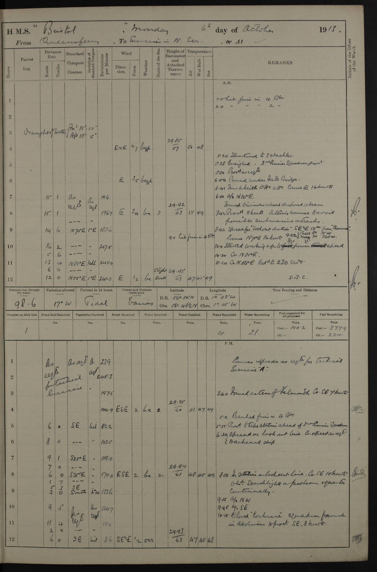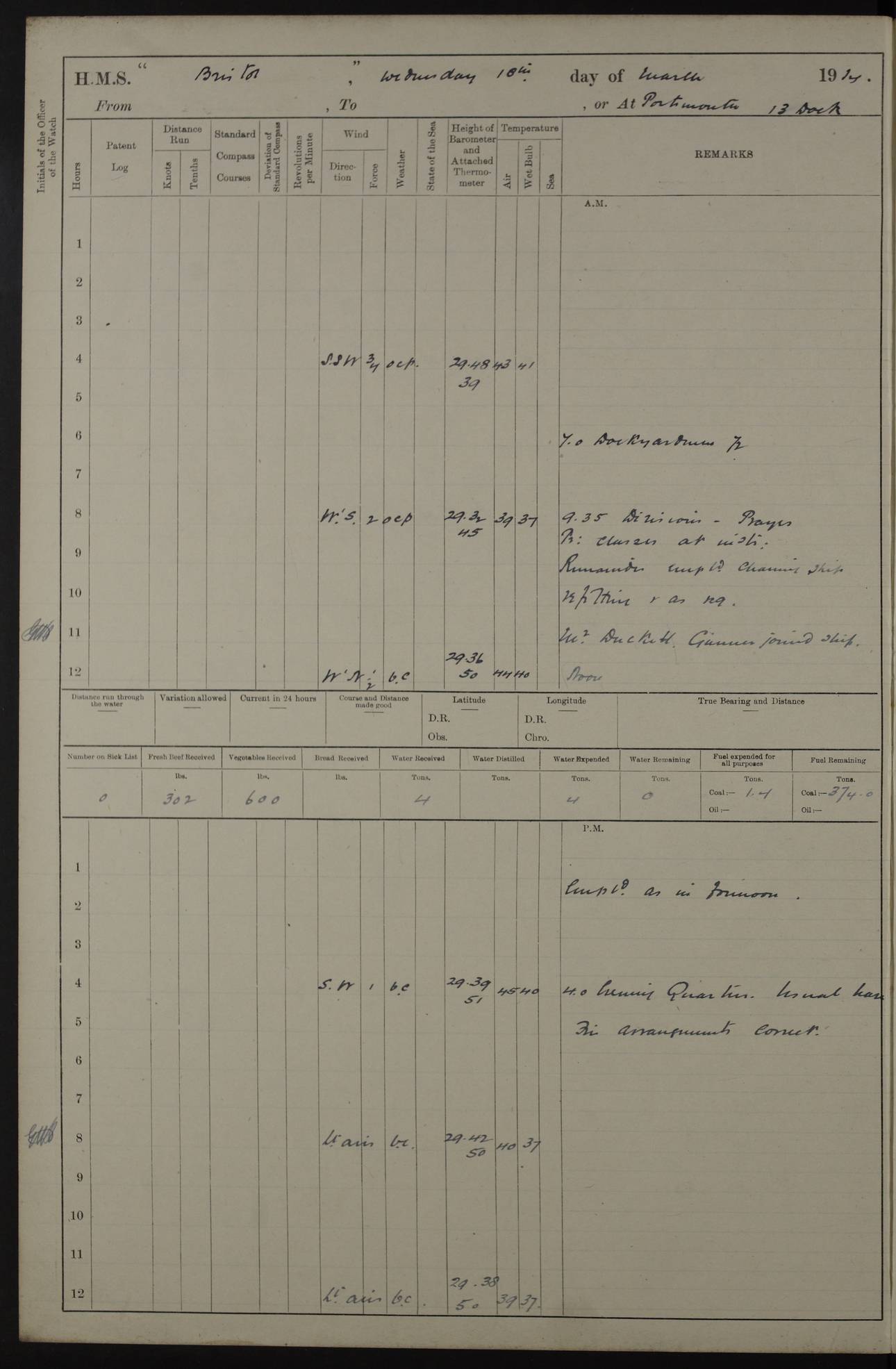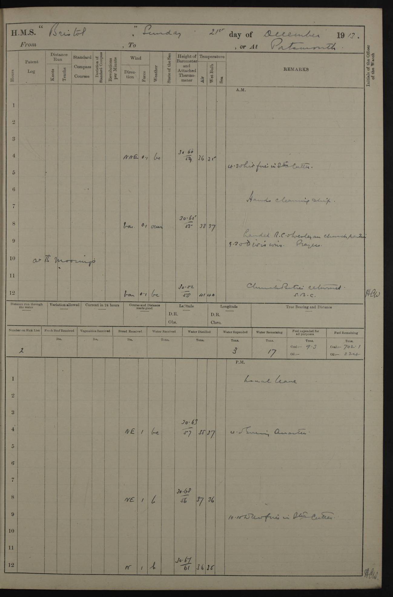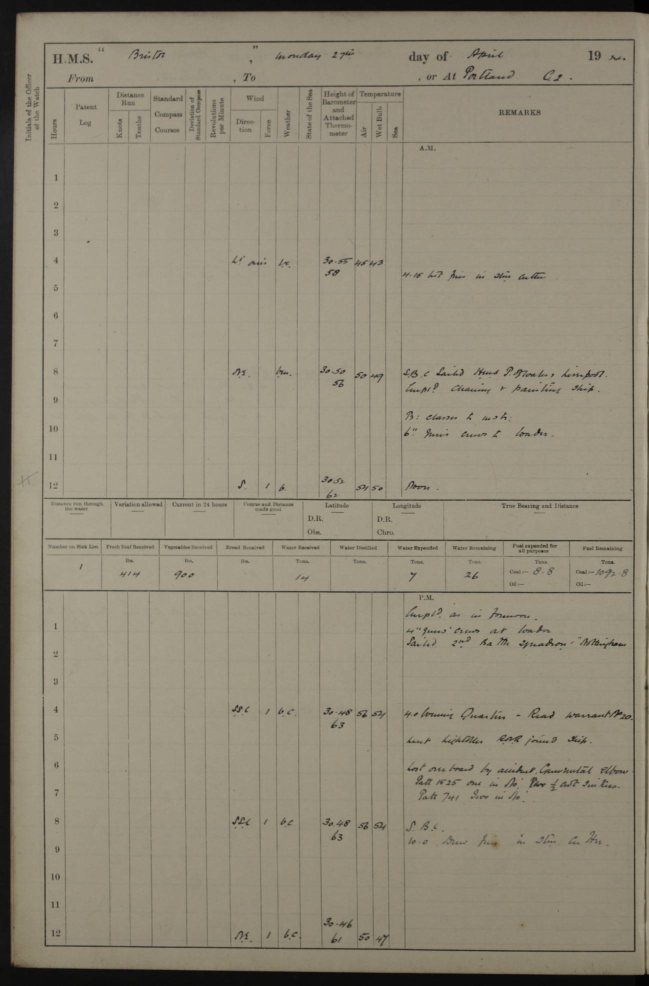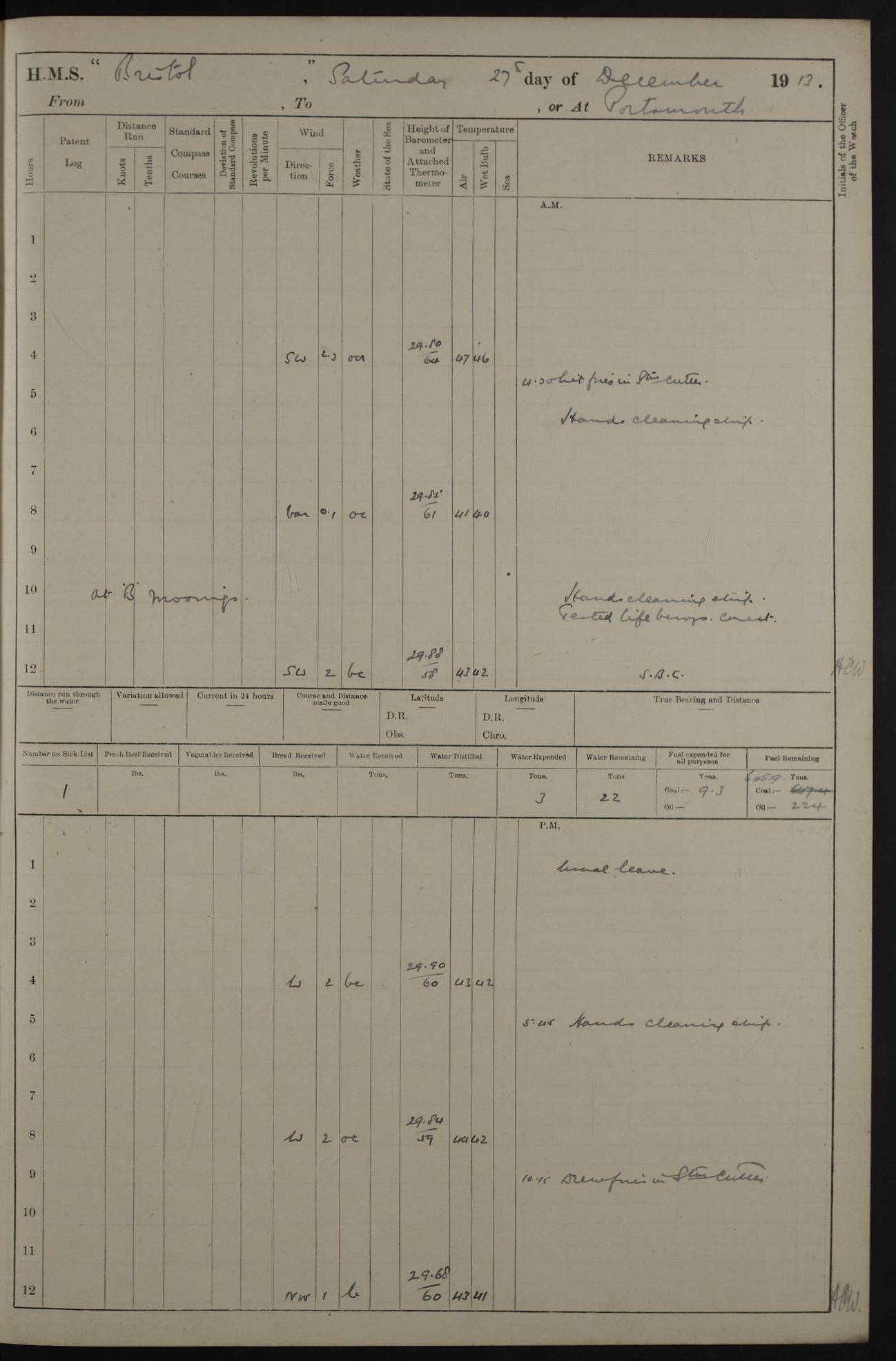 (Maps prepared using Journey Plotter, developed by Maikel. The Plots can only be approximate. They are made by joining-up positions on successive days, and sometimes positions are not given. There will therefore be occasions when the ship appears to have travelled overland) LOG BOOK – JULY 1ST 1913 TO JUNE 21ST 1914 4ef4f40ce53e0a0c91001323: (https://s3.amazonaws.com:443/oldweather/ADM53-36118/0001_0.jpg) 4ef4f40ce53e0a0c91001324: (https://s3.amazonaws.com:443/oldweather/ADM53-36118/0001_1.jpg) 4ef4f40de53e0a0c91001325: (https://s3.amazonaws.com:443/oldweather/ADM53-36118/0002_0.jpg) 4ef4f40de53e0a0c91001326: (https://s3.amazonaws.com:443/oldweather/ADM53-36118/0002_1.jpg) 4ef4f40de53e0a0c91001327: (https://s3.amazonaws.com:443/oldweather/ADM53-36118/0003_0.jpg) 4ef4f40de53e0a0c91001328: (https://s3.amazonaws.com:443/oldweather/ADM53-36118/0003_1.jpg) 4ef4f40de53e0a0c91001329: (https://s3.amazonaws.com:443/oldweather/ADM53-36118/0004_0.jpg) 4ef4f40de53e0a0c9100132a: (https://s3.amazonaws.com:443/oldweather/ADM53-36118/0004_1.jpg) LOG OF H.M.S. BRISTOL Commanded by Captain Basil Hew Fanshawe FOR THE PERIOD Commencing 1st of July 1913 Ending 21st of June 1914 Followed by her technical detail 4ef4f40de53e0a0c9100132b: (https://s3.amazonaws.com:443/oldweather/ADM53-36118/0005_0.jpg) Directions 4ef4f40de53e0a0c9100132c: (https://s3.amazonaws.com:443/oldweather/ADM53-36118/0005_1.jpg) Establishment of Ship’s Company: Full Commission: Officers: 18. Seamen: 111. Boys: 13. Marines: 28. Engine-room establishment: 168. Other non-executive ratings: 43. Total: 381 Active Commision: Officers: 14. Seamen: 53. Boys: 0. Marines: 17. Engine-room establishment: 64. Other non-executive ratings: 27. Total 175 Armament: Forecastle: 1 6” B.L. PV* Quarterdeck: 1 6” B.L. PV* Starboard waist: 5 4” B.L. PIV* Port waist: 5 4” B.L. PIV* 4 3 pounder for Saluting purpose, 2 in each battery Torpedo Two 18” submerged tubes Boats: 1 30 feet Steam Cutter 1 34 feet Cutter 2 30 feet Cutters 1 30 feet Gig 3 27 feet Whalers 2 18 feet Skiffs