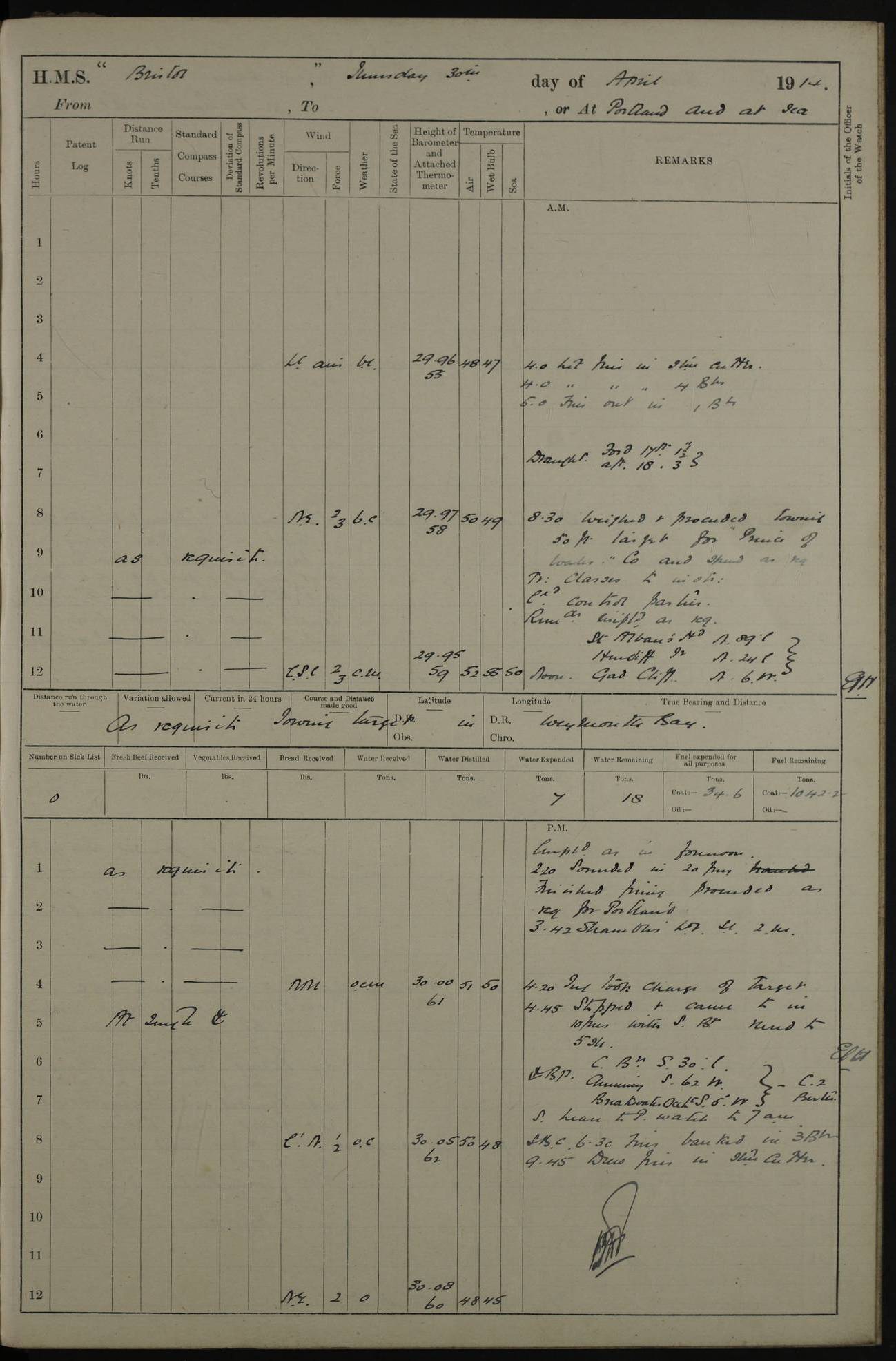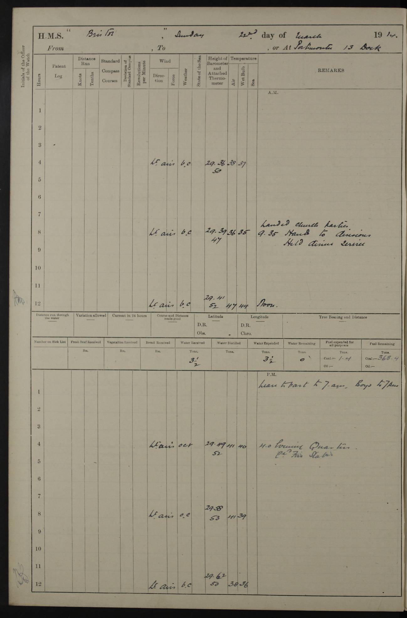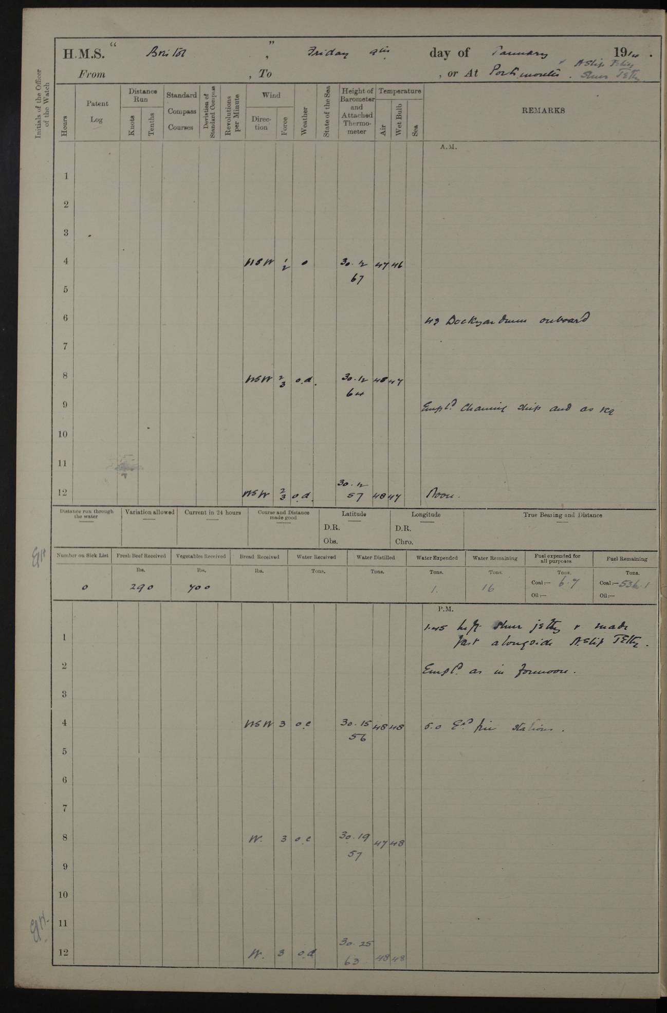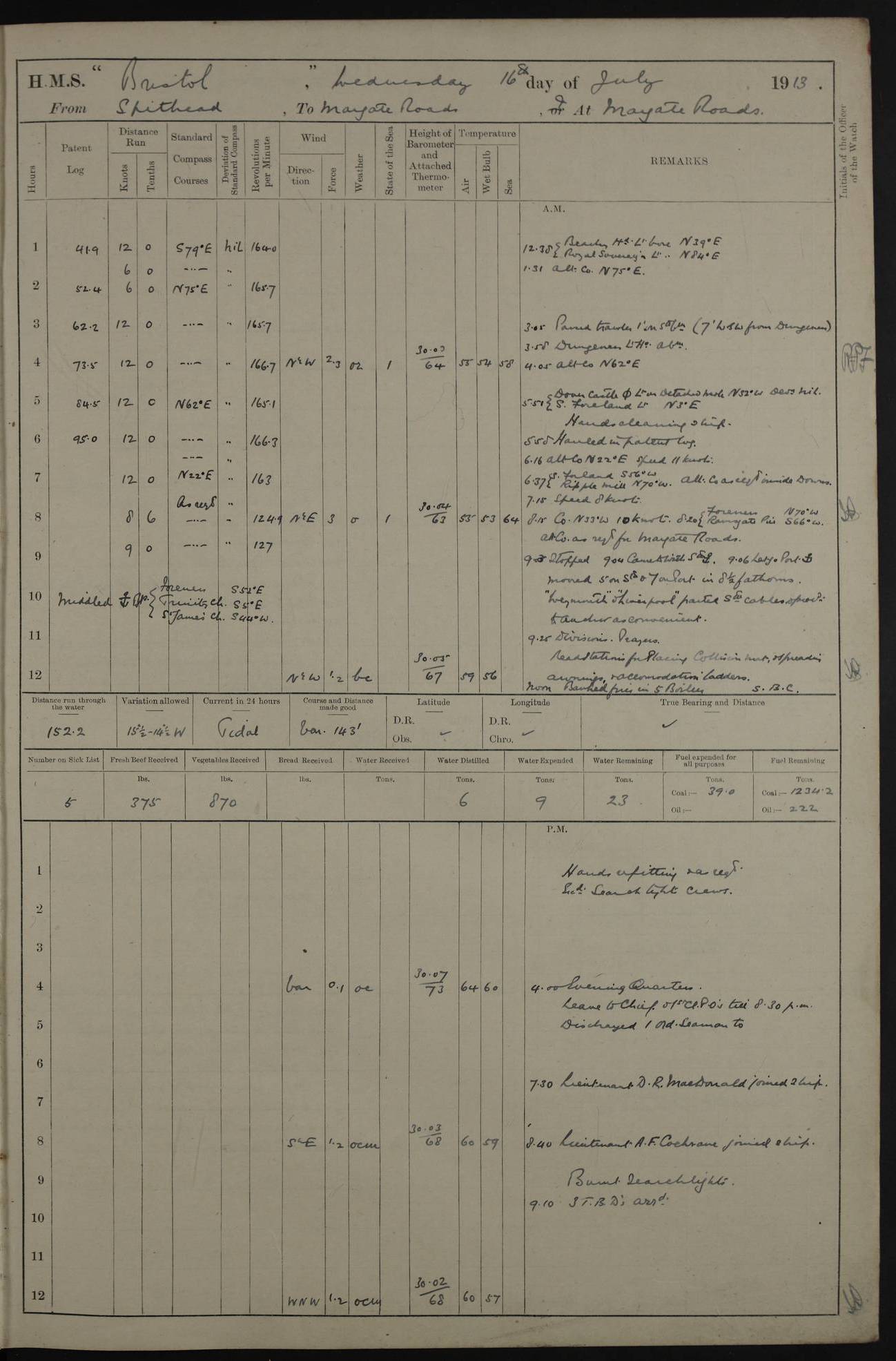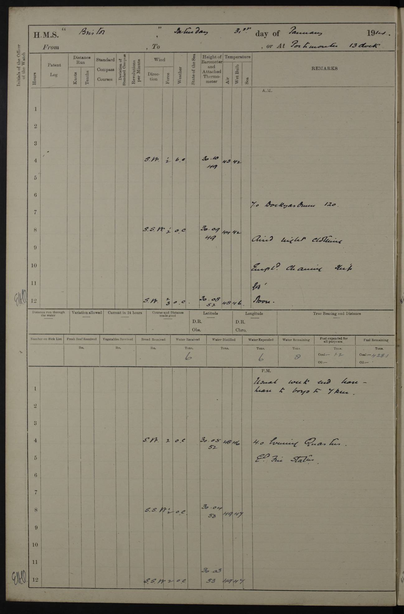 (Maps prepared using Journey Plotter, developed by Maikel. The Plots can only be approximate. They are made by joining-up positions on successive days, and sometimes positions are not given. There will therefore be occasions when the ship appears to have travelled overland) LOG BOOK – JULY 1ST 1913 TO JUNE 21ST 1914 4ef4f40ce53e0a0c91001323: (https://s3.amazonaws.com:443/oldweather/ADM53-36118/0001_0.jpg) 4ef4f40ce53e0a0c91001324: (https://s3.amazonaws.com:443/oldweather/ADM53-36118/0001_1.jpg) 4ef4f40de53e0a0c91001325: (https://s3.amazonaws.com:443/oldweather/ADM53-36118/0002_0.jpg) 4ef4f40de53e0a0c91001326: (https://s3.amazonaws.com:443/oldweather/ADM53-36118/0002_1.jpg) 4ef4f40de53e0a0c91001327: (https://s3.amazonaws.com:443/oldweather/ADM53-36118/0003_0.jpg) 4ef4f40de53e0a0c91001328: (https://s3.amazonaws.com:443/oldweather/ADM53-36118/0003_1.jpg) 4ef4f40de53e0a0c91001329: (https://s3.amazonaws.com:443/oldweather/ADM53-36118/0004_0.jpg) 4ef4f40de53e0a0c9100132a: (https://s3.amazonaws.com:443/oldweather/ADM53-36118/0004_1.jpg) LOG OF H.M.S. BRISTOL Commanded by Captain Basil Hew Fanshawe FOR THE PERIOD Commencing 1st of July 1913 Ending 21st of June 1914 Followed by her technical detail 4ef4f40de53e0a0c9100132b: (https://s3.amazonaws.com:443/oldweather/ADM53-36118/0005_0.jpg) Directions 4ef4f40de53e0a0c9100132c: (https://s3.amazonaws.com:443/oldweather/ADM53-36118/0005_1.jpg) Establishment of Ship’s Company: Full Commission: Officers: 18. Seamen: 111. Boys: 13. Marines: 28. Engine-room establishment: 168. Other non-executive ratings: 43. Total: 381 Active Commision: Officers: 14. Seamen: 53. Boys: 0. Marines: 17. Engine-room establishment: 64. Other non-executive ratings: 27. Total 175 Armament: Forecastle: 1 6” B.L. PV* Quarterdeck: 1 6” B.L. PV* Starboard waist: 5 4” B.L. PIV* Port waist: 5 4” B.L. PIV* 4 3 pounder for Saluting purpose, 2 in each battery Torpedo Two 18” submerged tubes Boats: 1 30 feet Steam Cutter 1 34 feet Cutter 2 30 feet Cutters 1 30 feet Gig 3 27 feet Whalers 2 18 feet Skiffs