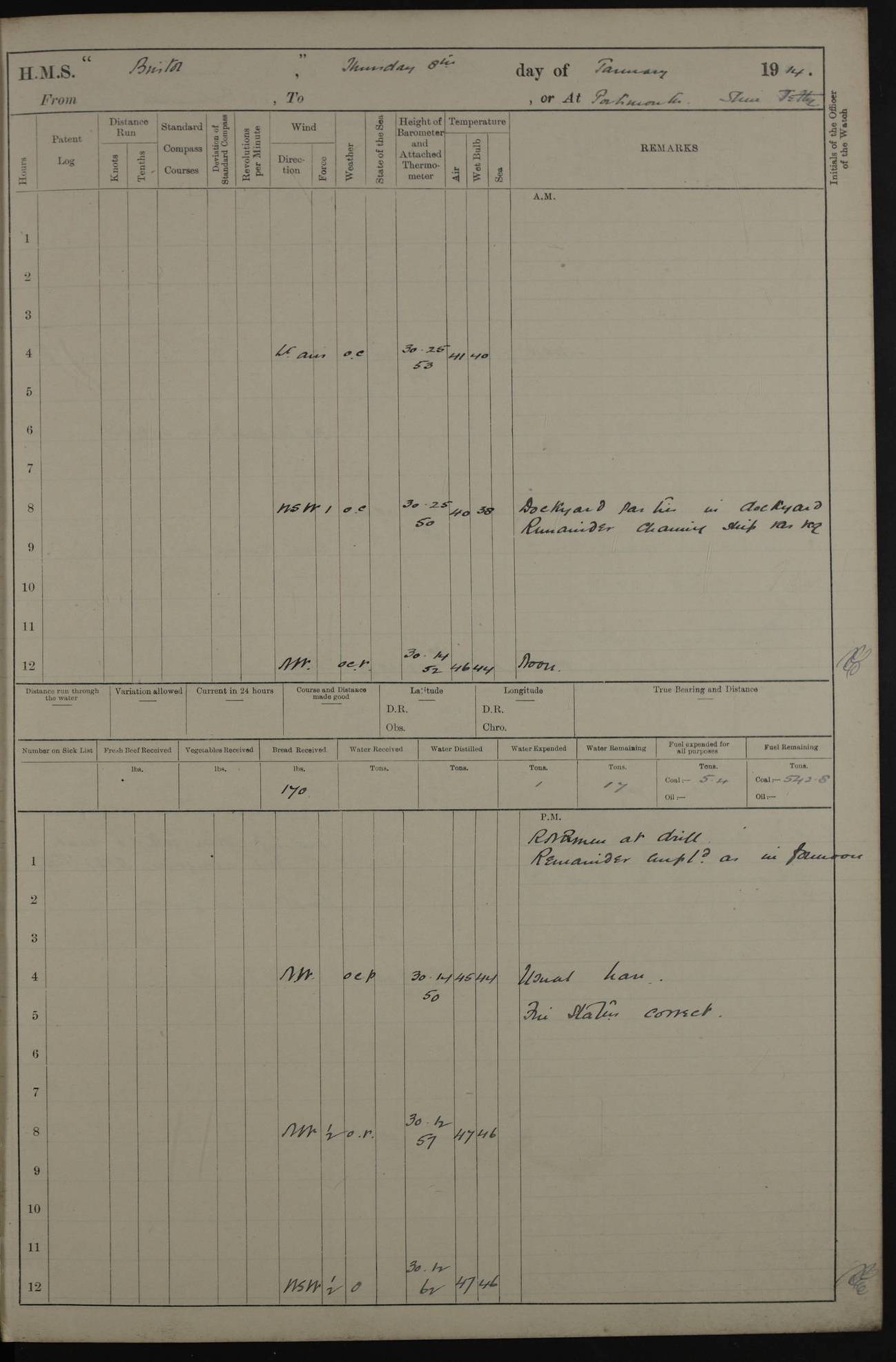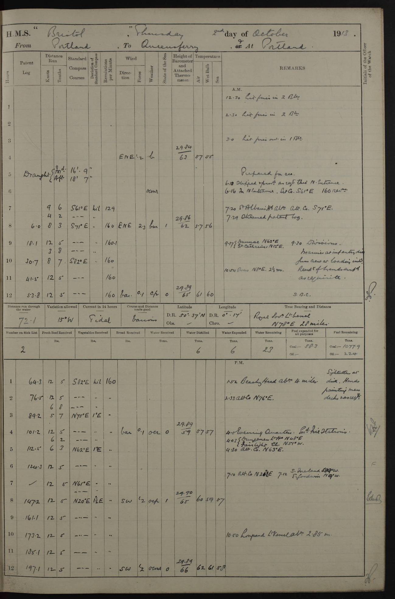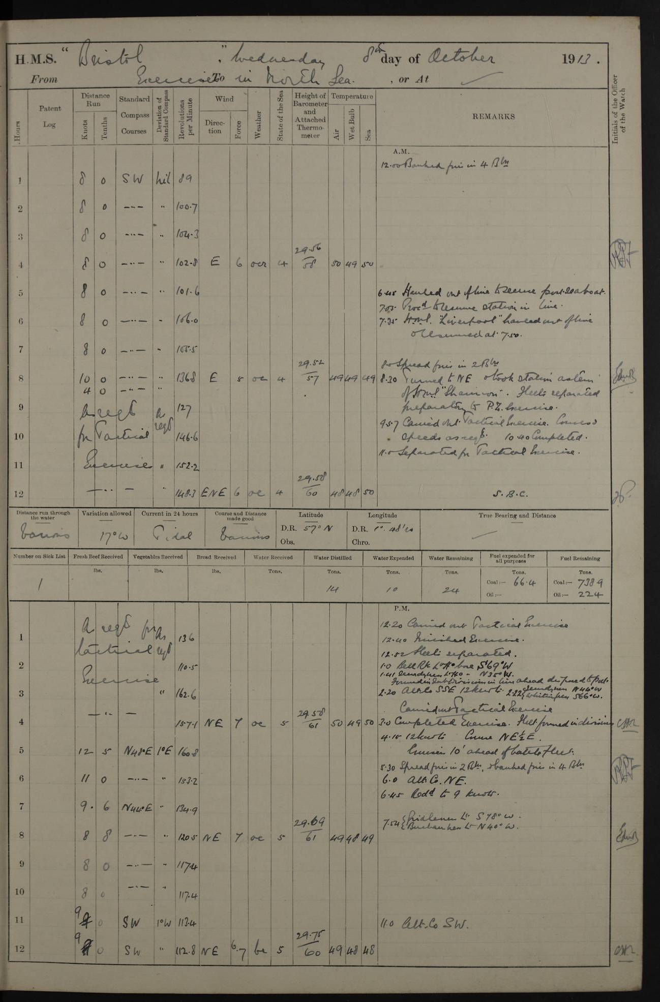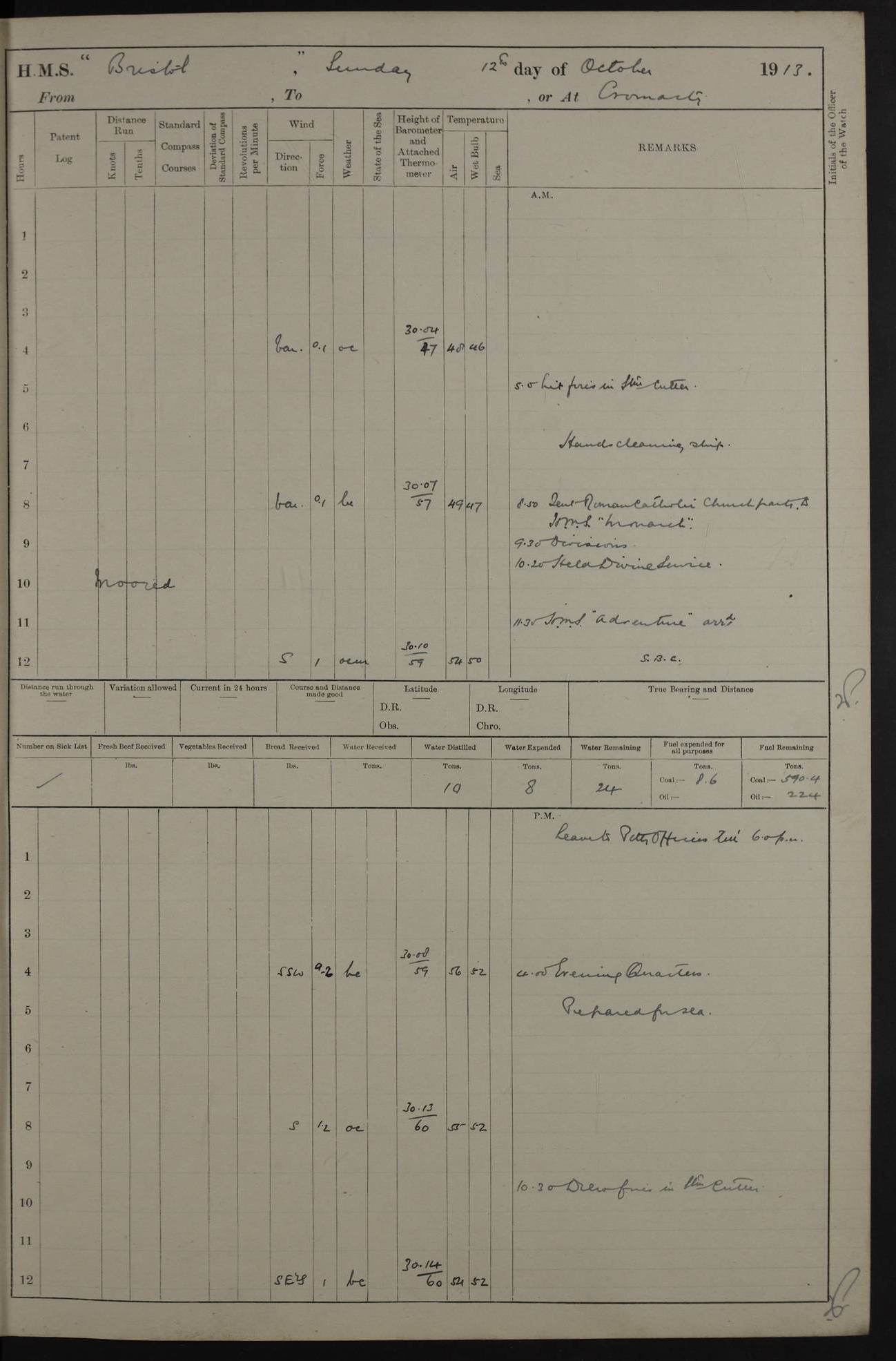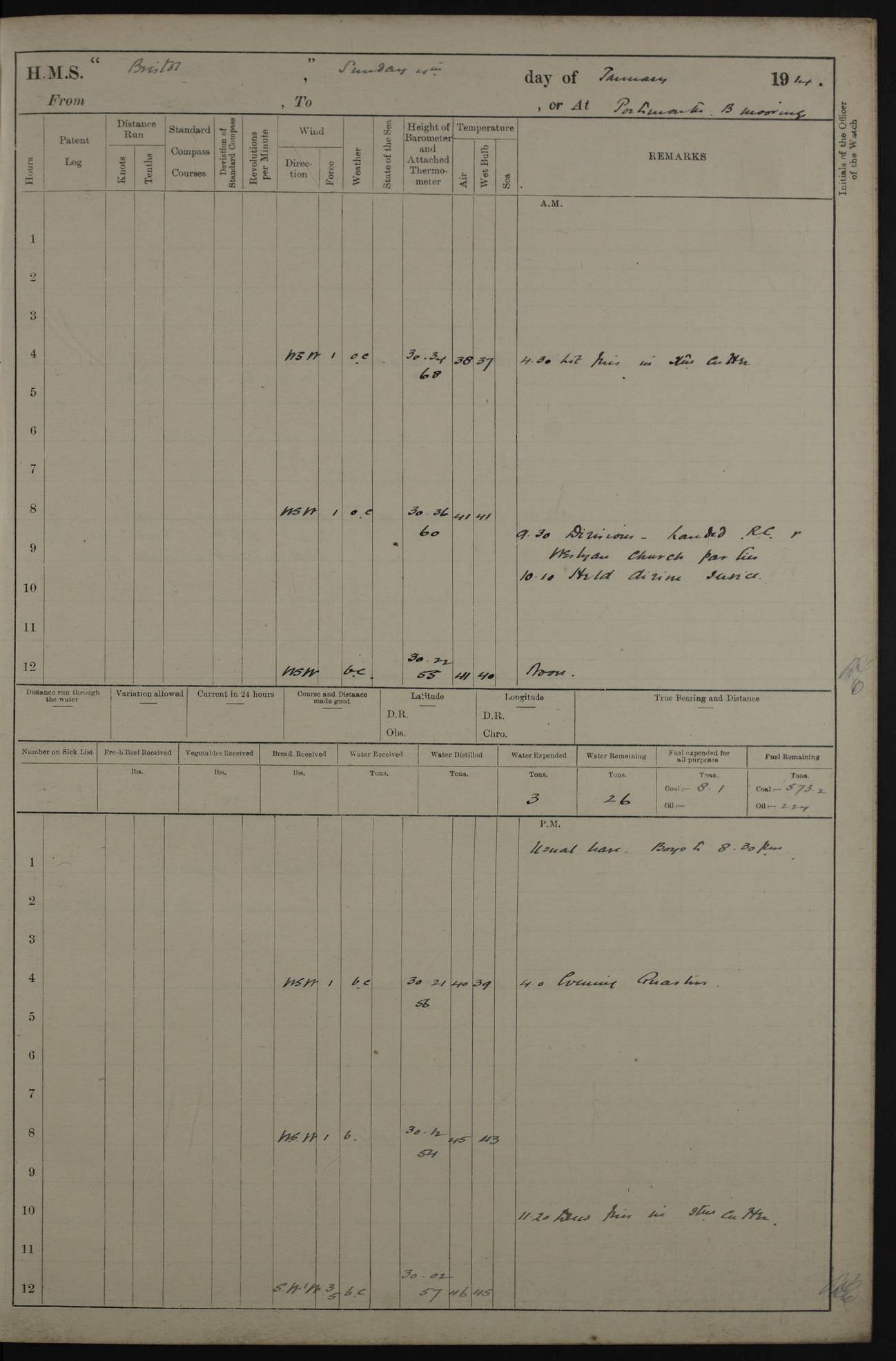 (Maps prepared using Journey Plotter, developed by Maikel. The Plots can only be approximate. They are made by joining-up positions on successive days, and sometimes positions are not given. There will therefore be occasions when the ship appears to have travelled overland) LOG BOOK – JULY 1ST 1913 TO JUNE 21ST 1914 4ef4f40ce53e0a0c91001323: (https://s3.amazonaws.com:443/oldweather/ADM53-36118/0001_0.jpg) 4ef4f40ce53e0a0c91001324: (https://s3.amazonaws.com:443/oldweather/ADM53-36118/0001_1.jpg) 4ef4f40de53e0a0c91001325: (https://s3.amazonaws.com:443/oldweather/ADM53-36118/0002_0.jpg) 4ef4f40de53e0a0c91001326: (https://s3.amazonaws.com:443/oldweather/ADM53-36118/0002_1.jpg) 4ef4f40de53e0a0c91001327: (https://s3.amazonaws.com:443/oldweather/ADM53-36118/0003_0.jpg) 4ef4f40de53e0a0c91001328: (https://s3.amazonaws.com:443/oldweather/ADM53-36118/0003_1.jpg) 4ef4f40de53e0a0c91001329: (https://s3.amazonaws.com:443/oldweather/ADM53-36118/0004_0.jpg) 4ef4f40de53e0a0c9100132a: (https://s3.amazonaws.com:443/oldweather/ADM53-36118/0004_1.jpg) LOG OF H.M.S. BRISTOL Commanded by Captain Basil Hew Fanshawe FOR THE PERIOD Commencing 1st of July 1913 Ending 21st of June 1914 Followed by her technical detail 4ef4f40de53e0a0c9100132b: (https://s3.amazonaws.com:443/oldweather/ADM53-36118/0005_0.jpg) Directions 4ef4f40de53e0a0c9100132c: (https://s3.amazonaws.com:443/oldweather/ADM53-36118/0005_1.jpg) Establishment of Ship’s Company: Full Commission: Officers: 18. Seamen: 111. Boys: 13. Marines: 28. Engine-room establishment: 168. Other non-executive ratings: 43. Total: 381 Active Commision: Officers: 14. Seamen: 53. Boys: 0. Marines: 17. Engine-room establishment: 64. Other non-executive ratings: 27. Total 175 Armament: Forecastle: 1 6” B.L. PV* Quarterdeck: 1 6” B.L. PV* Starboard waist: 5 4” B.L. PIV* Port waist: 5 4” B.L. PIV* 4 3 pounder for Saluting purpose, 2 in each battery Torpedo Two 18” submerged tubes Boats: 1 30 feet Steam Cutter 1 34 feet Cutter 2 30 feet Cutters 1 30 feet Gig 3 27 feet Whalers 2 18 feet Skiffs