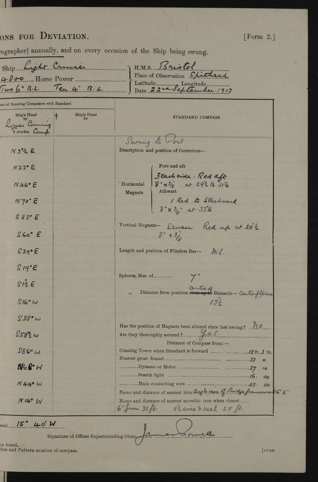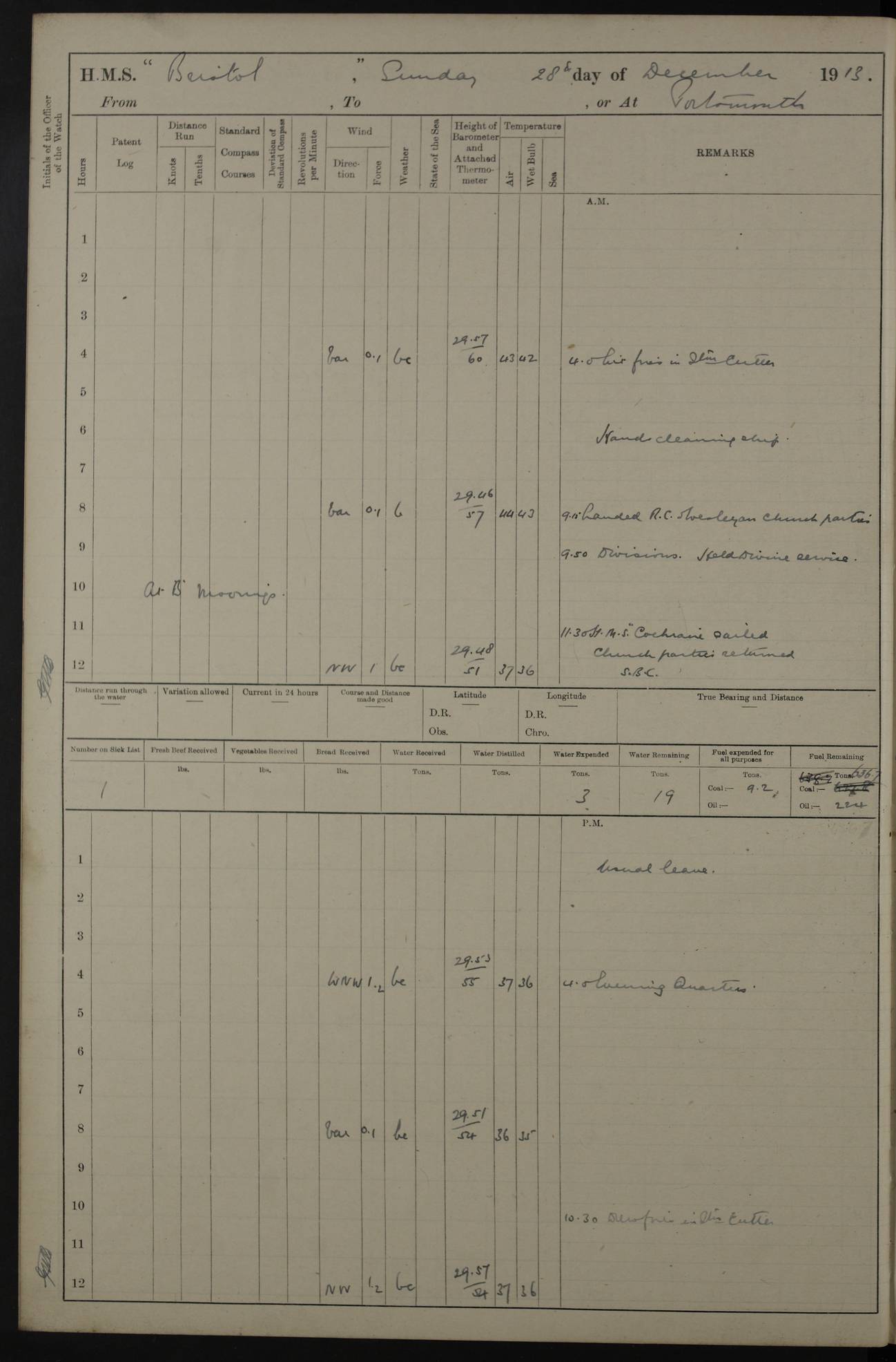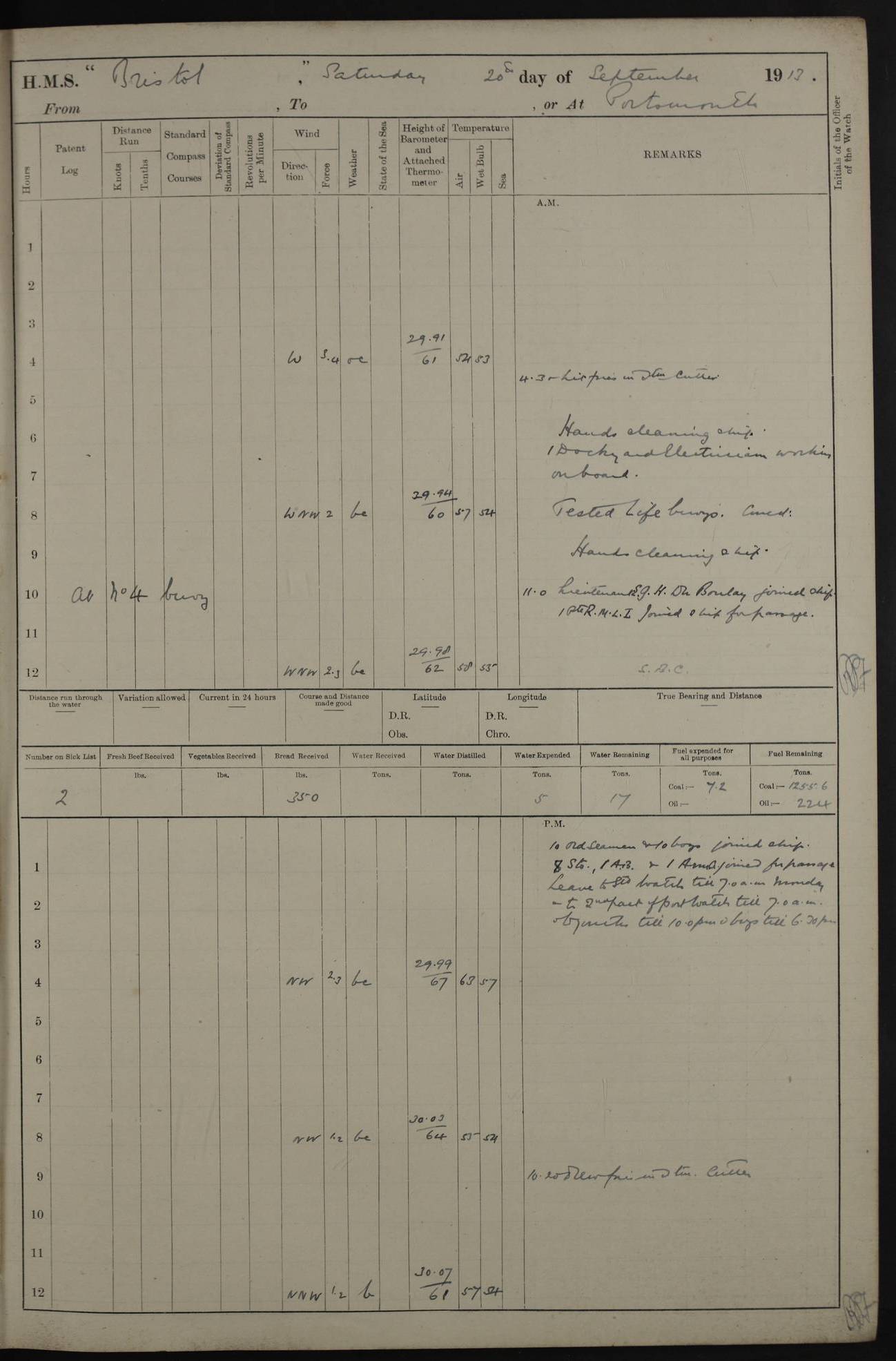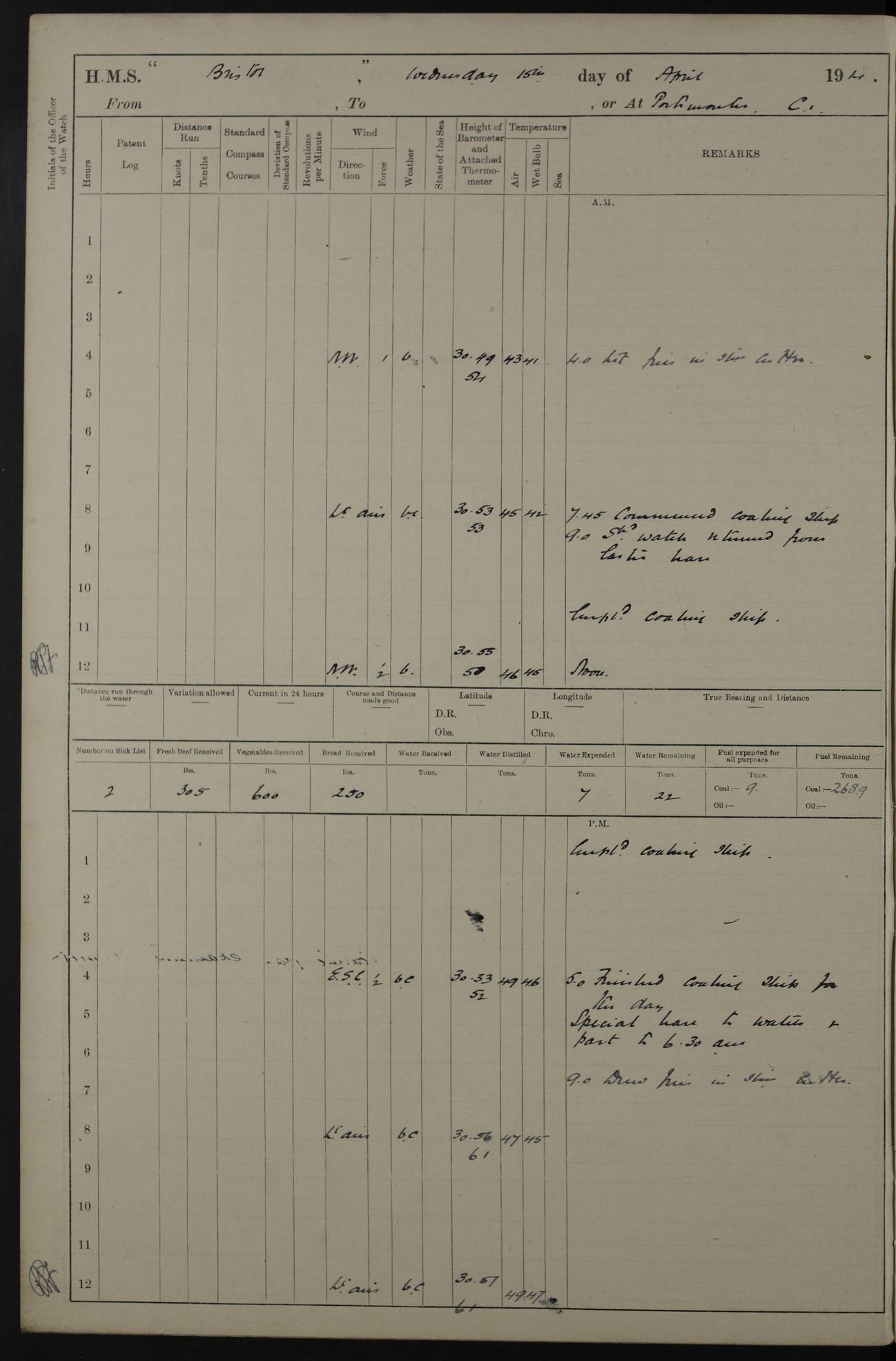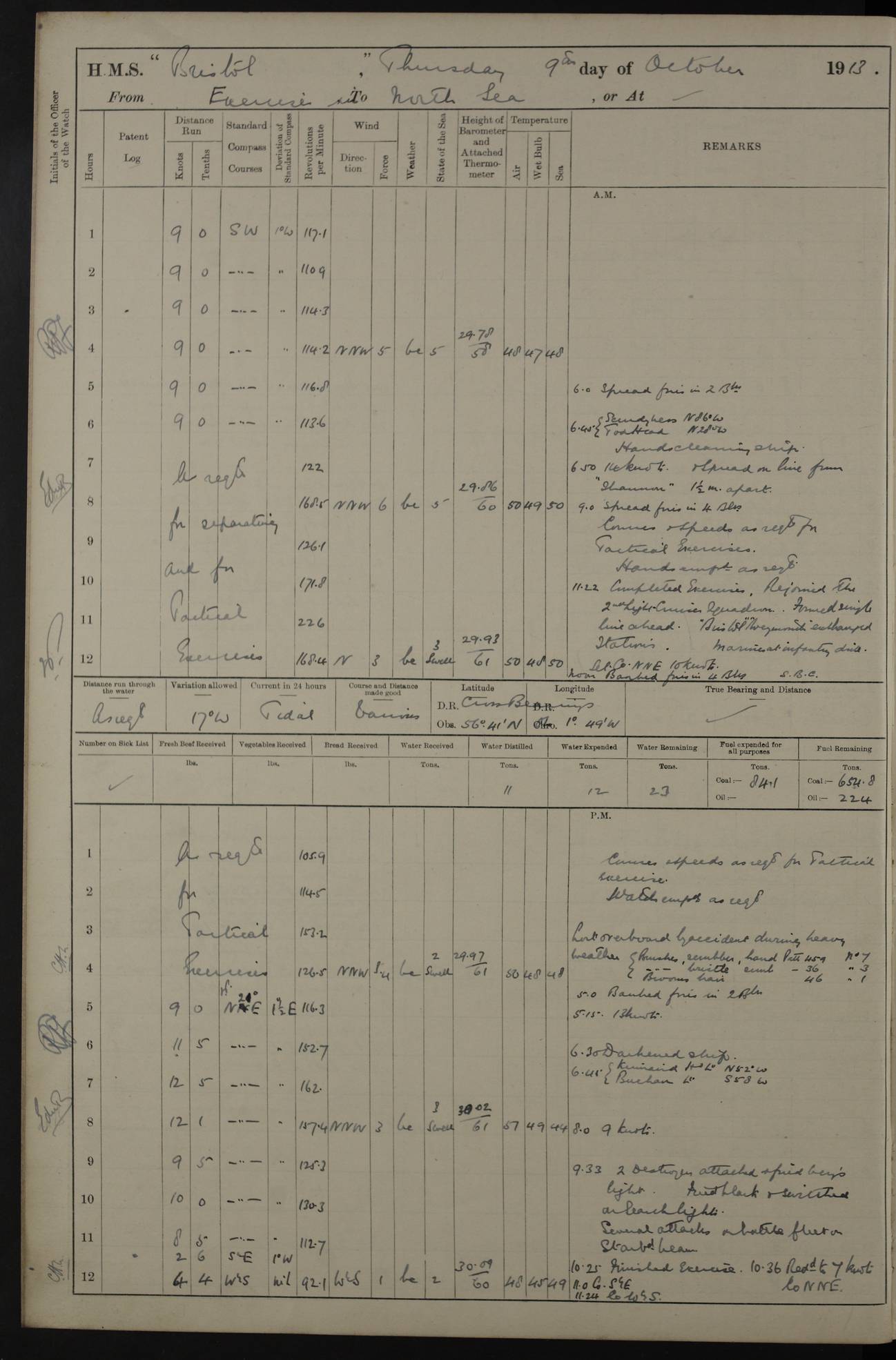 (Maps prepared using Journey Plotter, developed by Maikel. The Plots can only be approximate. They are made by joining-up positions on successive days, and sometimes positions are not given. There will therefore be occasions when the ship appears to have travelled overland) LOG BOOK – JULY 1ST 1913 TO JUNE 21ST 1914 4ef4f40ce53e0a0c91001323: (https://s3.amazonaws.com:443/oldweather/ADM53-36118/0001_0.jpg) 4ef4f40ce53e0a0c91001324: (https://s3.amazonaws.com:443/oldweather/ADM53-36118/0001_1.jpg) 4ef4f40de53e0a0c91001325: (https://s3.amazonaws.com:443/oldweather/ADM53-36118/0002_0.jpg) 4ef4f40de53e0a0c91001326: (https://s3.amazonaws.com:443/oldweather/ADM53-36118/0002_1.jpg) 4ef4f40de53e0a0c91001327: (https://s3.amazonaws.com:443/oldweather/ADM53-36118/0003_0.jpg) 4ef4f40de53e0a0c91001328: (https://s3.amazonaws.com:443/oldweather/ADM53-36118/0003_1.jpg) 4ef4f40de53e0a0c91001329: (https://s3.amazonaws.com:443/oldweather/ADM53-36118/0004_0.jpg) 4ef4f40de53e0a0c9100132a: (https://s3.amazonaws.com:443/oldweather/ADM53-36118/0004_1.jpg) LOG OF H.M.S. BRISTOL Commanded by Captain Basil Hew Fanshawe FOR THE PERIOD Commencing 1st of July 1913 Ending 21st of June 1914 Followed by her technical detail 4ef4f40de53e0a0c9100132b: (https://s3.amazonaws.com:443/oldweather/ADM53-36118/0005_0.jpg) Directions 4ef4f40de53e0a0c9100132c: (https://s3.amazonaws.com:443/oldweather/ADM53-36118/0005_1.jpg) Establishment of Ship’s Company: Full Commission: Officers: 18. Seamen: 111. Boys: 13. Marines: 28. Engine-room establishment: 168. Other non-executive ratings: 43. Total: 381 Active Commision: Officers: 14. Seamen: 53. Boys: 0. Marines: 17. Engine-room establishment: 64. Other non-executive ratings: 27. Total 175 Armament: Forecastle: 1 6” B.L. PV* Quarterdeck: 1 6” B.L. PV* Starboard waist: 5 4” B.L. PIV* Port waist: 5 4” B.L. PIV* 4 3 pounder for Saluting purpose, 2 in each battery Torpedo Two 18” submerged tubes Boats: 1 30 feet Steam Cutter 1 34 feet Cutter 2 30 feet Cutters 1 30 feet Gig 3 27 feet Whalers 2 18 feet Skiffs