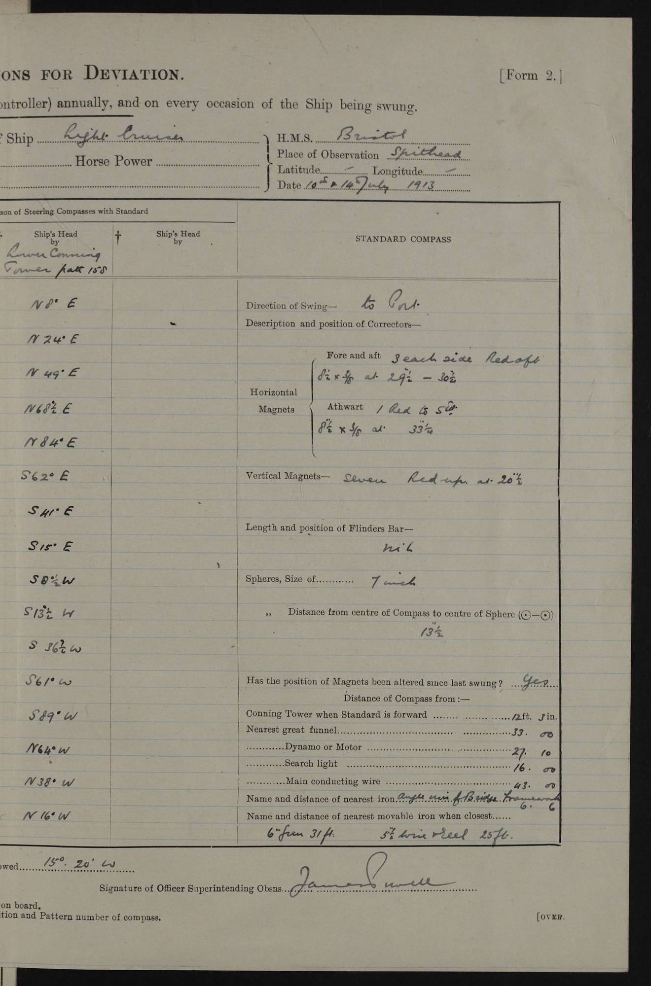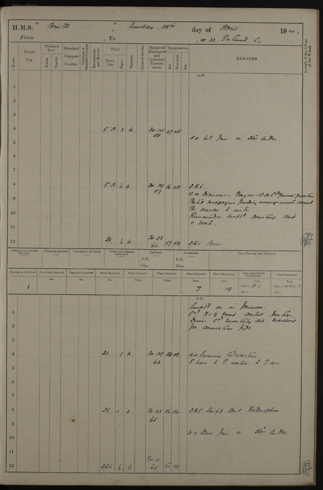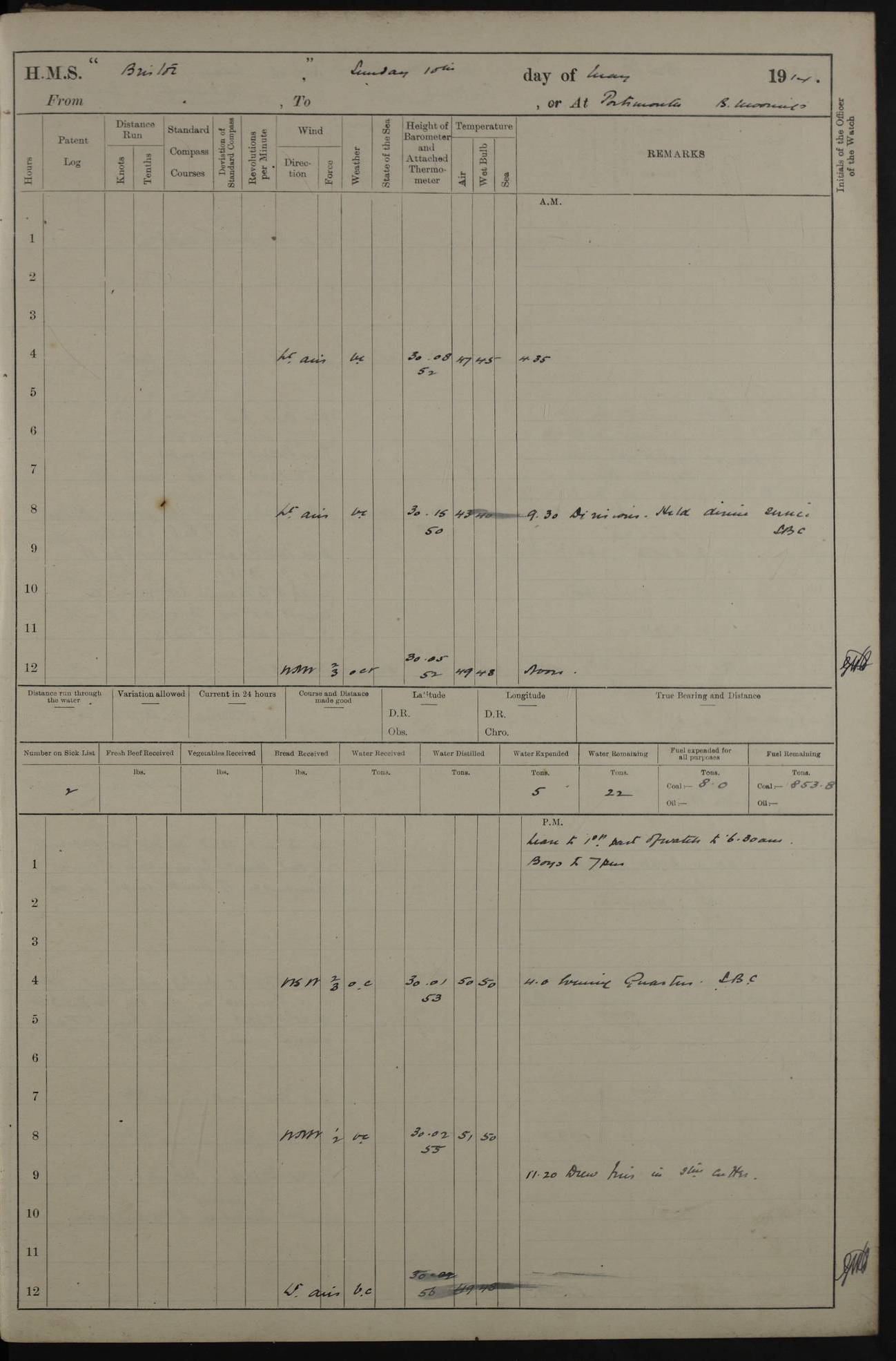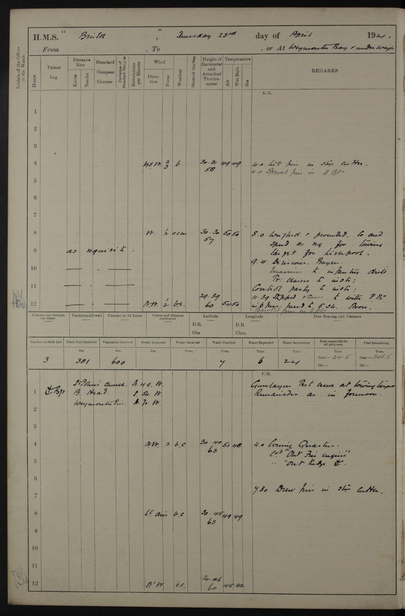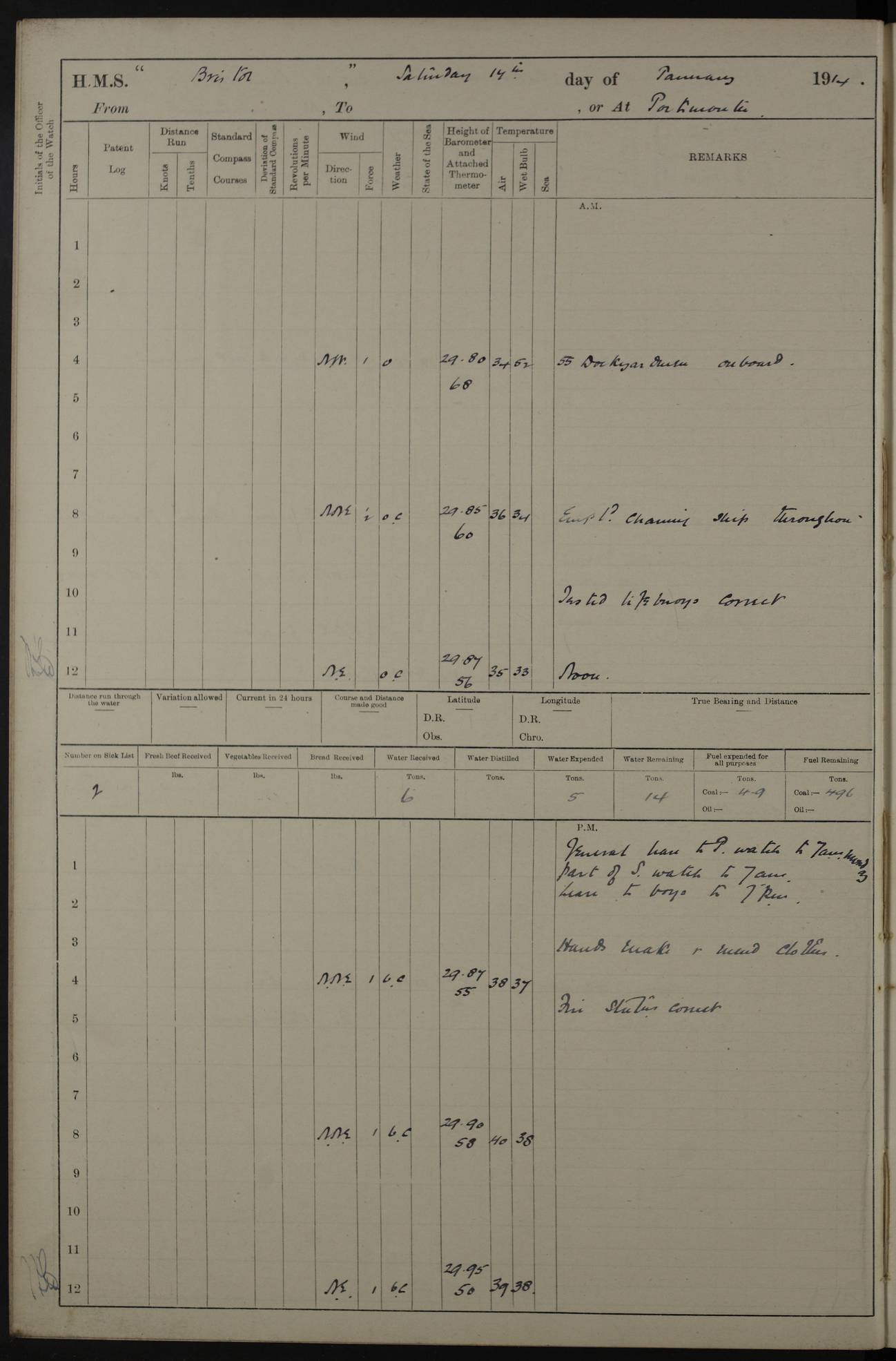 (Maps prepared using Journey Plotter, developed by Maikel. The Plots can only be approximate. They are made by joining-up positions on successive days, and sometimes positions are not given. There will therefore be occasions when the ship appears to have travelled overland) LOG BOOK – JULY 1ST 1913 TO JUNE 21ST 1914 4ef4f40ce53e0a0c91001323: (https://s3.amazonaws.com:443/oldweather/ADM53-36118/0001_0.jpg) 4ef4f40ce53e0a0c91001324: (https://s3.amazonaws.com:443/oldweather/ADM53-36118/0001_1.jpg) 4ef4f40de53e0a0c91001325: (https://s3.amazonaws.com:443/oldweather/ADM53-36118/0002_0.jpg) 4ef4f40de53e0a0c91001326: (https://s3.amazonaws.com:443/oldweather/ADM53-36118/0002_1.jpg) 4ef4f40de53e0a0c91001327: (https://s3.amazonaws.com:443/oldweather/ADM53-36118/0003_0.jpg) 4ef4f40de53e0a0c91001328: (https://s3.amazonaws.com:443/oldweather/ADM53-36118/0003_1.jpg) 4ef4f40de53e0a0c91001329: (https://s3.amazonaws.com:443/oldweather/ADM53-36118/0004_0.jpg) 4ef4f40de53e0a0c9100132a: (https://s3.amazonaws.com:443/oldweather/ADM53-36118/0004_1.jpg) LOG OF H.M.S. BRISTOL Commanded by Captain Basil Hew Fanshawe FOR THE PERIOD Commencing 1st of July 1913 Ending 21st of June 1914 Followed by her technical detail 4ef4f40de53e0a0c9100132b: (https://s3.amazonaws.com:443/oldweather/ADM53-36118/0005_0.jpg) Directions 4ef4f40de53e0a0c9100132c: (https://s3.amazonaws.com:443/oldweather/ADM53-36118/0005_1.jpg) Establishment of Ship’s Company: Full Commission: Officers: 18. Seamen: 111. Boys: 13. Marines: 28. Engine-room establishment: 168. Other non-executive ratings: 43. Total: 381 Active Commision: Officers: 14. Seamen: 53. Boys: 0. Marines: 17. Engine-room establishment: 64. Other non-executive ratings: 27. Total 175 Armament: Forecastle: 1 6” B.L. PV* Quarterdeck: 1 6” B.L. PV* Starboard waist: 5 4” B.L. PIV* Port waist: 5 4” B.L. PIV* 4 3 pounder for Saluting purpose, 2 in each battery Torpedo Two 18” submerged tubes Boats: 1 30 feet Steam Cutter 1 34 feet Cutter 2 30 feet Cutters 1 30 feet Gig 3 27 feet Whalers 2 18 feet Skiffs