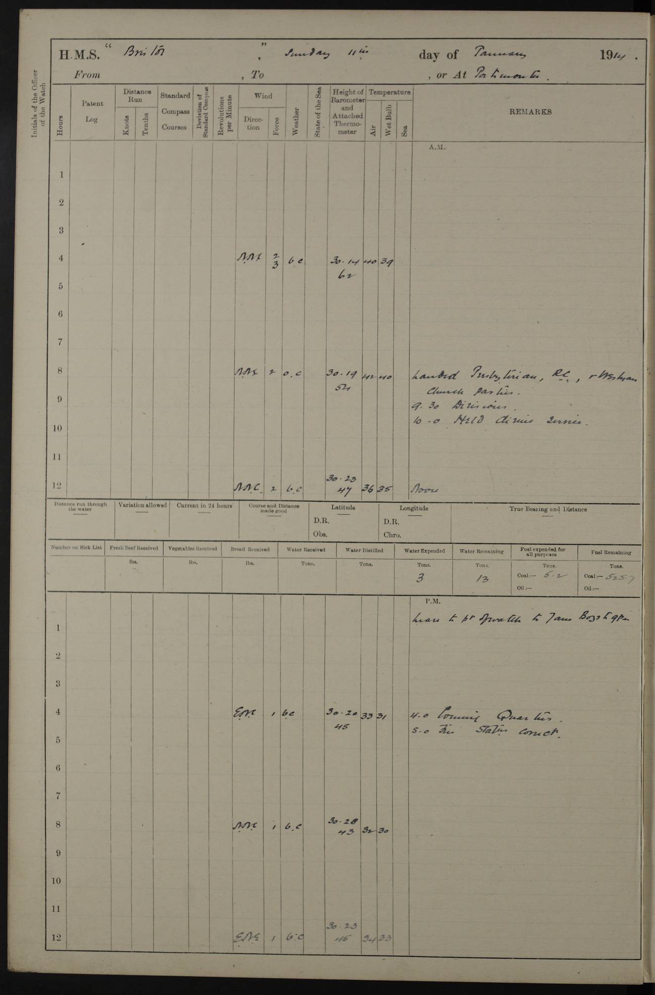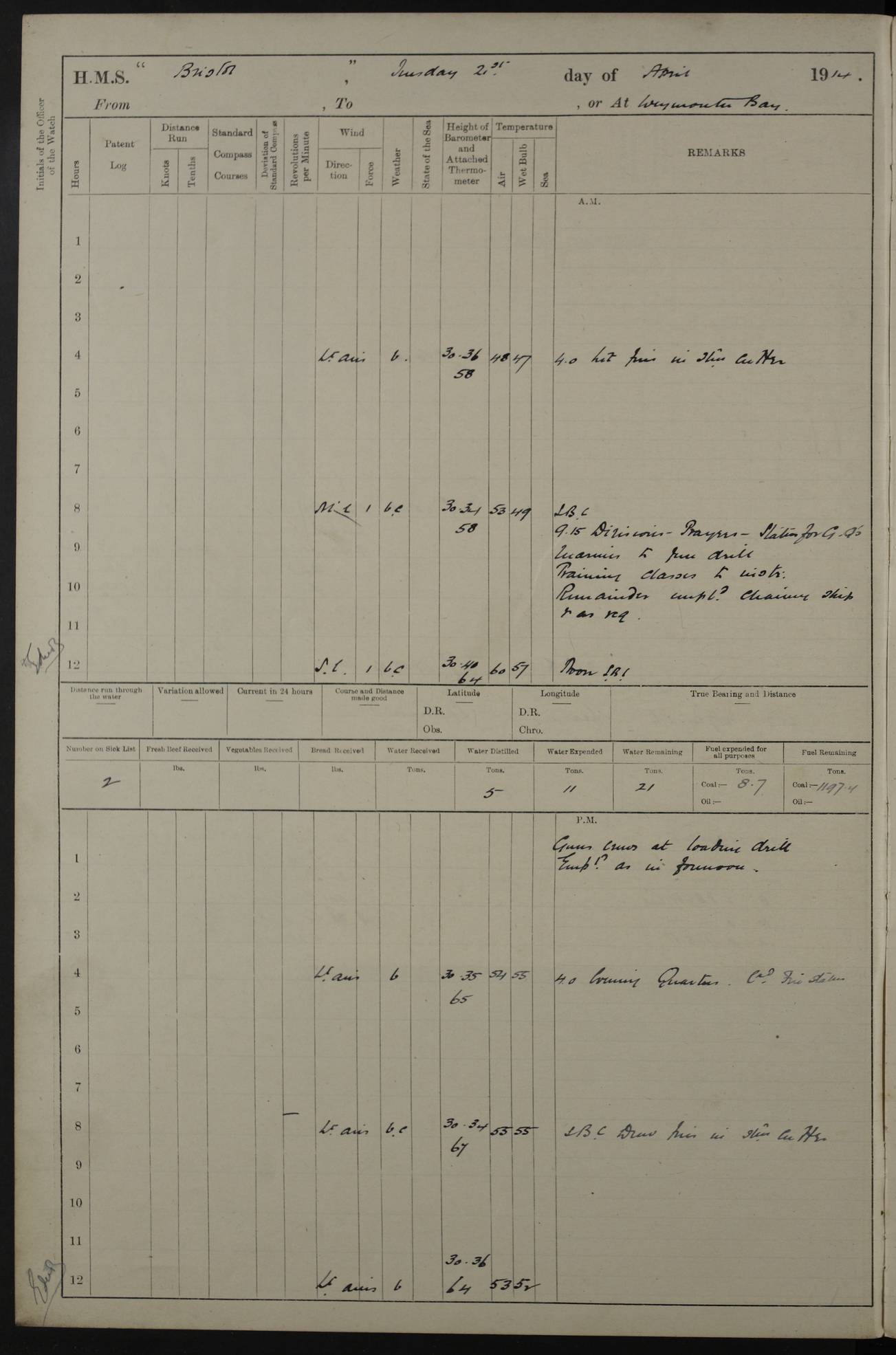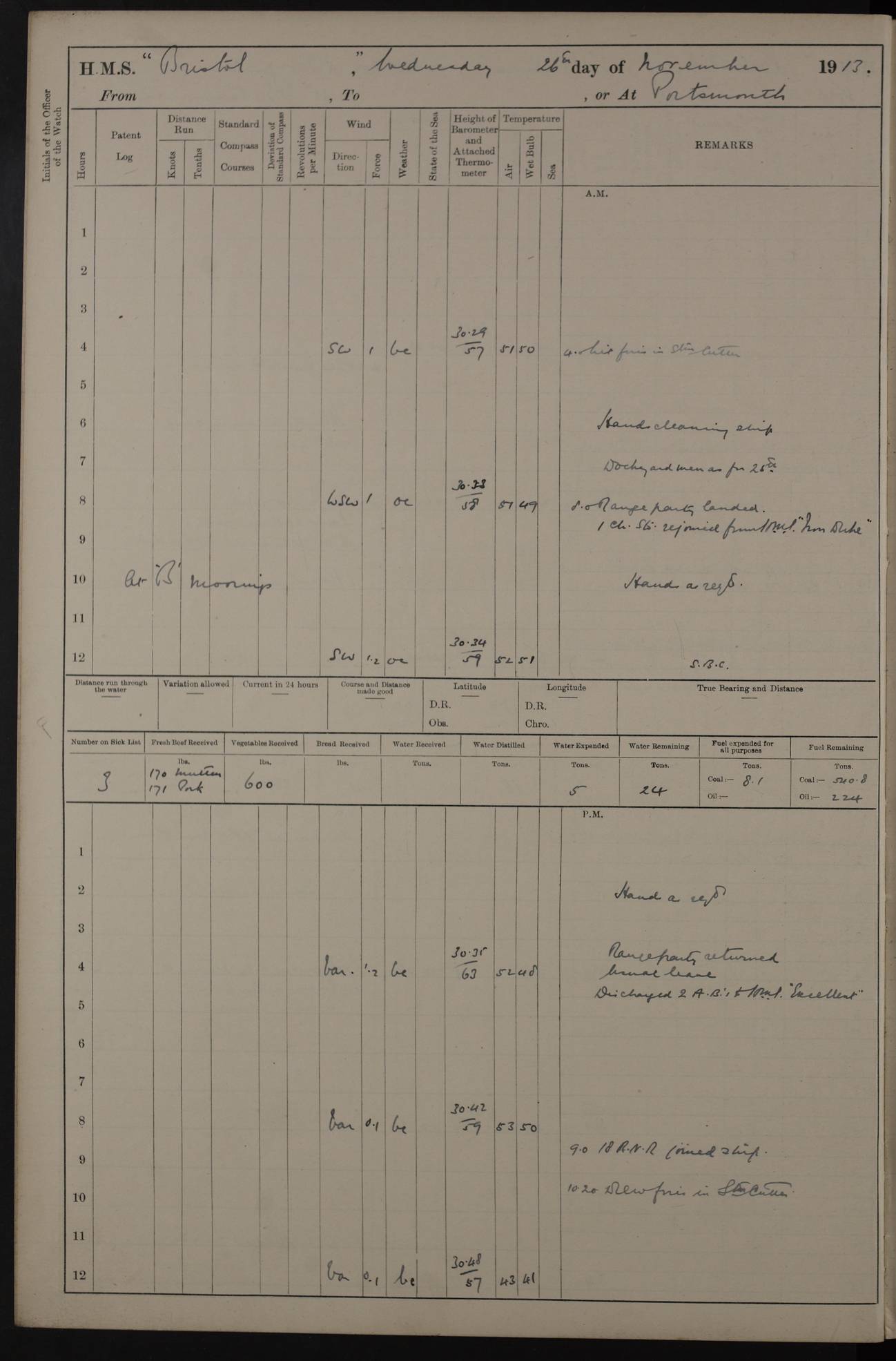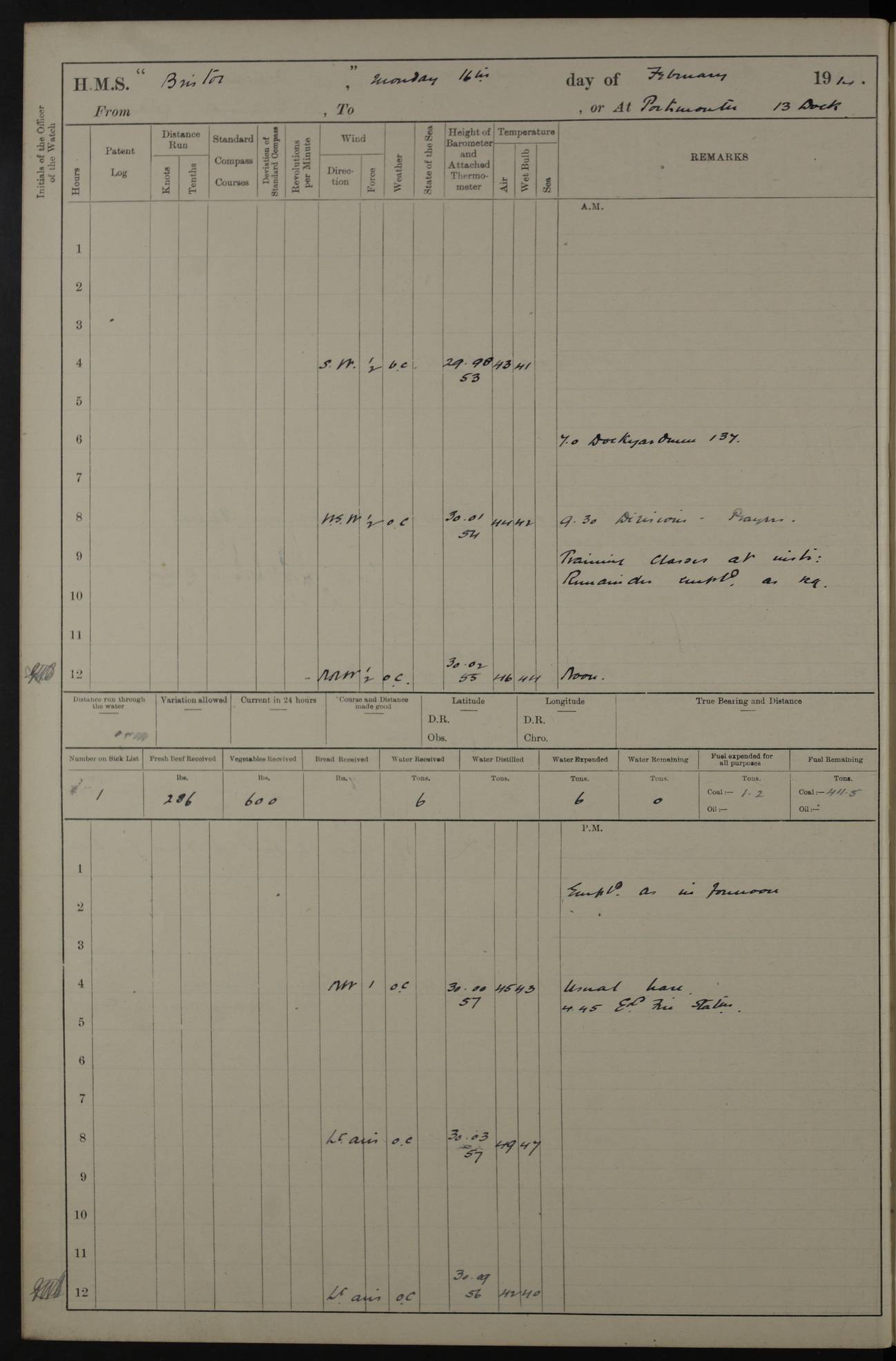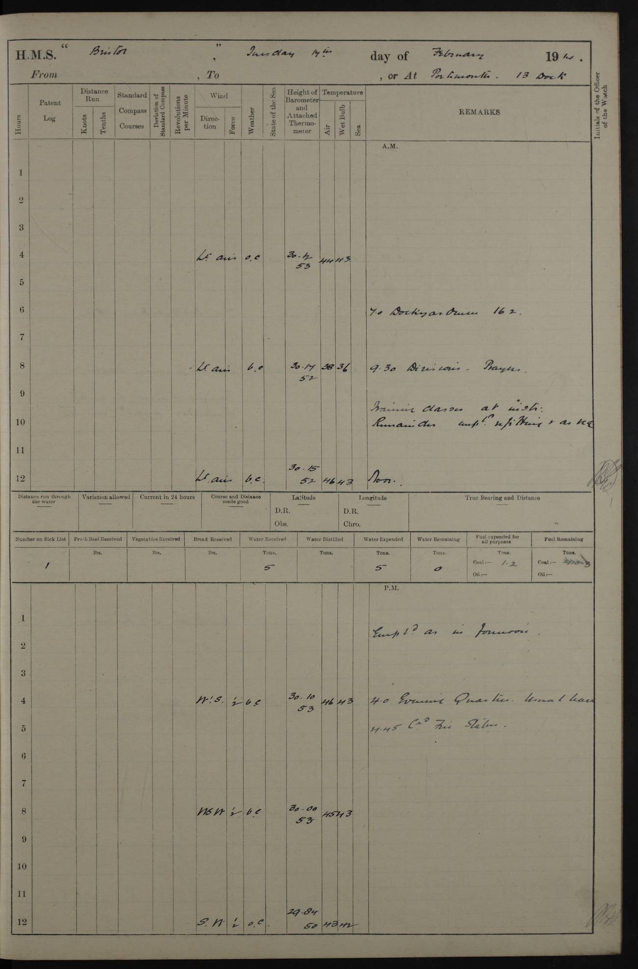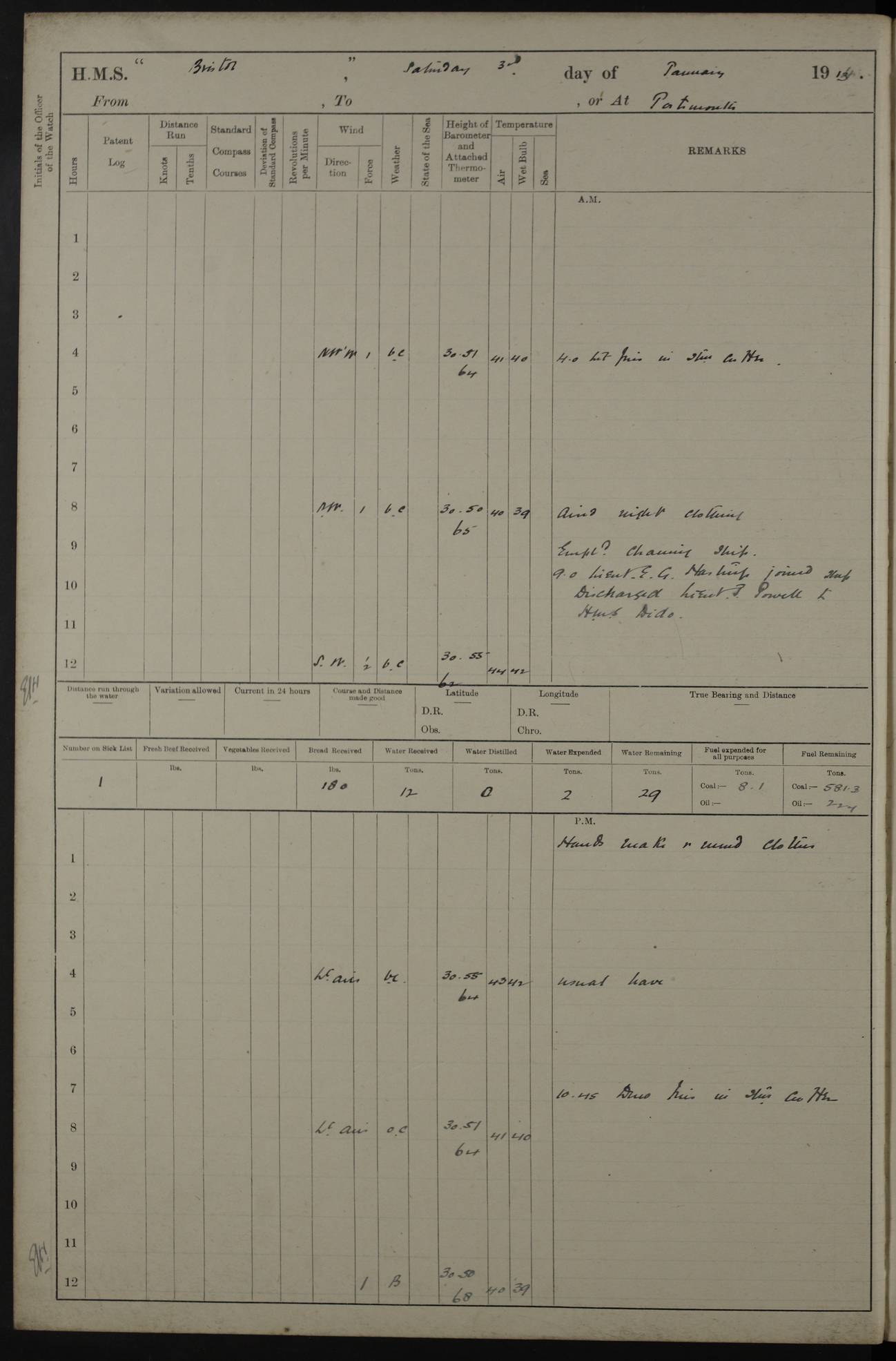 (Maps prepared using Journey Plotter, developed by Maikel. The Plots can only be approximate. They are made by joining-up positions on successive days, and sometimes positions are not given. There will therefore be occasions when the ship appears to have travelled overland) LOG BOOK – JULY 1ST 1913 TO JUNE 21ST 1914 4ef4f40ce53e0a0c91001323: (https://s3.amazonaws.com:443/oldweather/ADM53-36118/0001_0.jpg) 4ef4f40ce53e0a0c91001324: (https://s3.amazonaws.com:443/oldweather/ADM53-36118/0001_1.jpg) 4ef4f40de53e0a0c91001325: (https://s3.amazonaws.com:443/oldweather/ADM53-36118/0002_0.jpg) 4ef4f40de53e0a0c91001326: (https://s3.amazonaws.com:443/oldweather/ADM53-36118/0002_1.jpg) 4ef4f40de53e0a0c91001327: (https://s3.amazonaws.com:443/oldweather/ADM53-36118/0003_0.jpg) 4ef4f40de53e0a0c91001328: (https://s3.amazonaws.com:443/oldweather/ADM53-36118/0003_1.jpg) 4ef4f40de53e0a0c91001329: (https://s3.amazonaws.com:443/oldweather/ADM53-36118/0004_0.jpg) 4ef4f40de53e0a0c9100132a: (https://s3.amazonaws.com:443/oldweather/ADM53-36118/0004_1.jpg) LOG OF H.M.S. BRISTOL Commanded by Captain Basil Hew Fanshawe FOR THE PERIOD Commencing 1st of July 1913 Ending 21st of June 1914 Followed by her technical detail 4ef4f40de53e0a0c9100132b: (https://s3.amazonaws.com:443/oldweather/ADM53-36118/0005_0.jpg) Directions 4ef4f40de53e0a0c9100132c: (https://s3.amazonaws.com:443/oldweather/ADM53-36118/0005_1.jpg) Establishment of Ship’s Company: Full Commission: Officers: 18. Seamen: 111. Boys: 13. Marines: 28. Engine-room establishment: 168. Other non-executive ratings: 43. Total: 381 Active Commision: Officers: 14. Seamen: 53. Boys: 0. Marines: 17. Engine-room establishment: 64. Other non-executive ratings: 27. Total 175 Armament: Forecastle: 1 6” B.L. PV* Quarterdeck: 1 6” B.L. PV* Starboard waist: 5 4” B.L. PIV* Port waist: 5 4” B.L. PIV* 4 3 pounder for Saluting purpose, 2 in each battery Torpedo Two 18” submerged tubes Boats: 1 30 feet Steam Cutter 1 34 feet Cutter 2 30 feet Cutters 1 30 feet Gig 3 27 feet Whalers 2 18 feet Skiffs