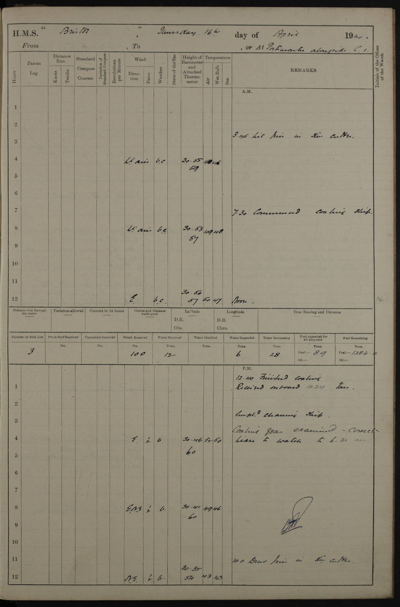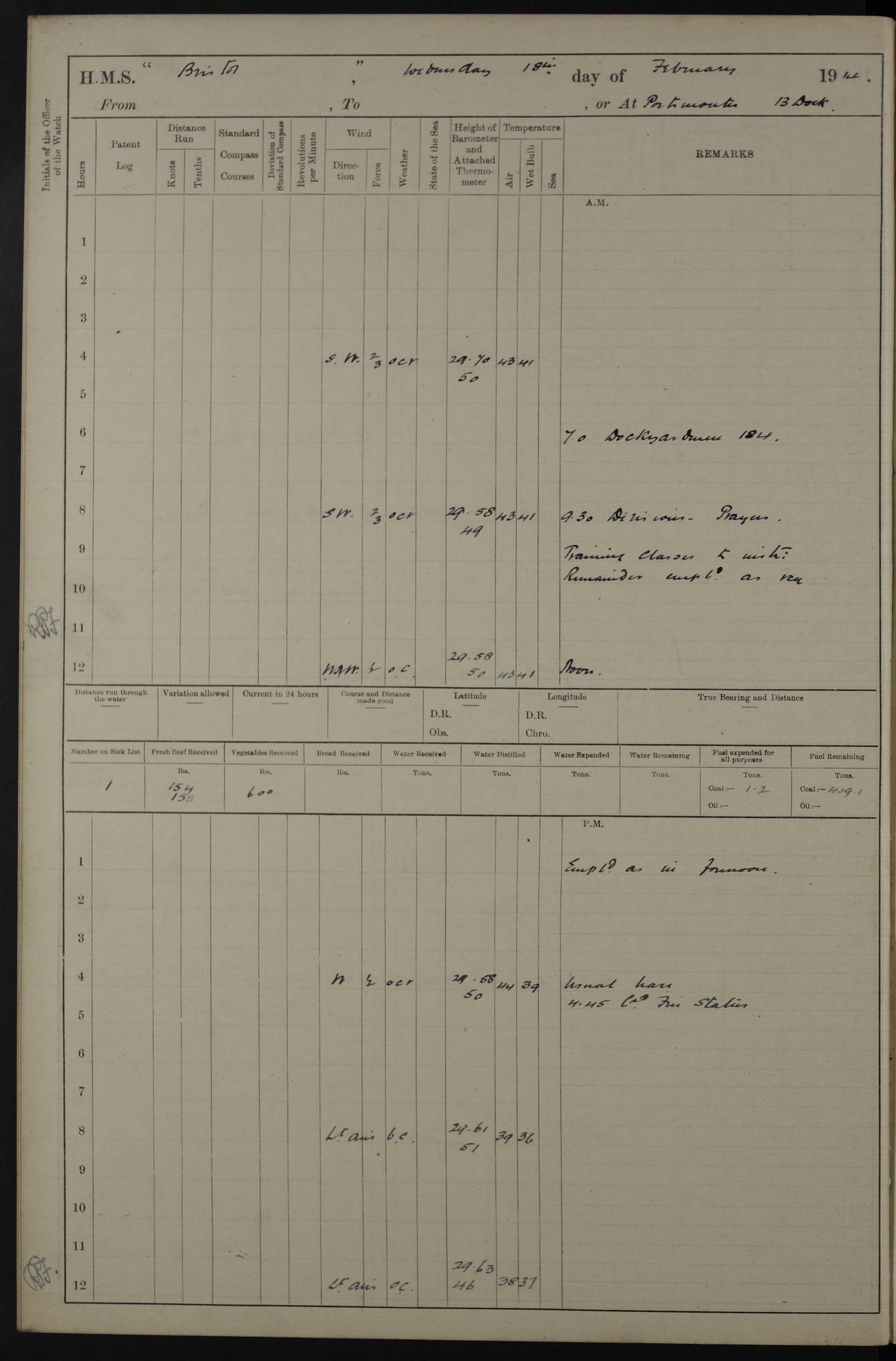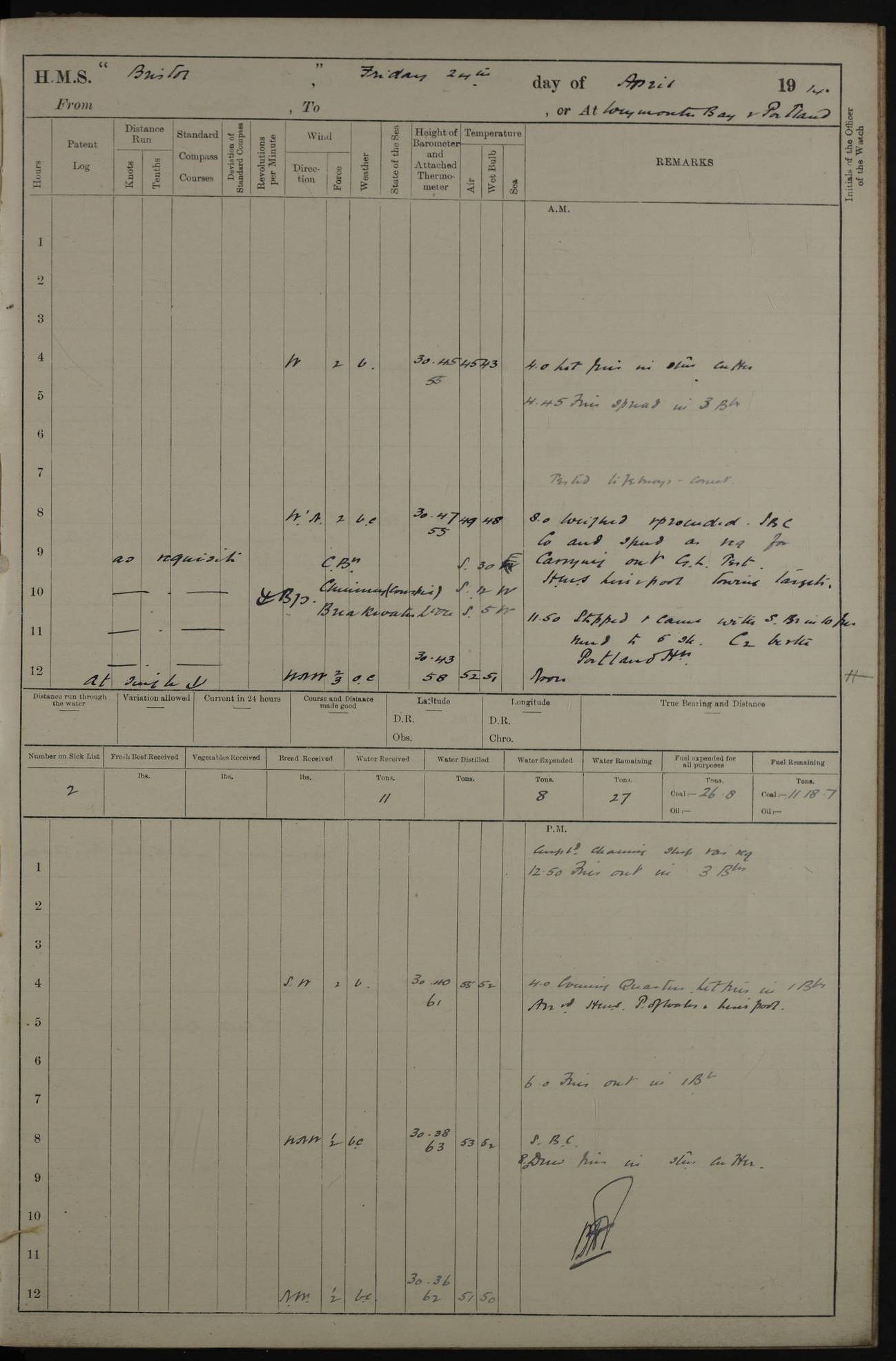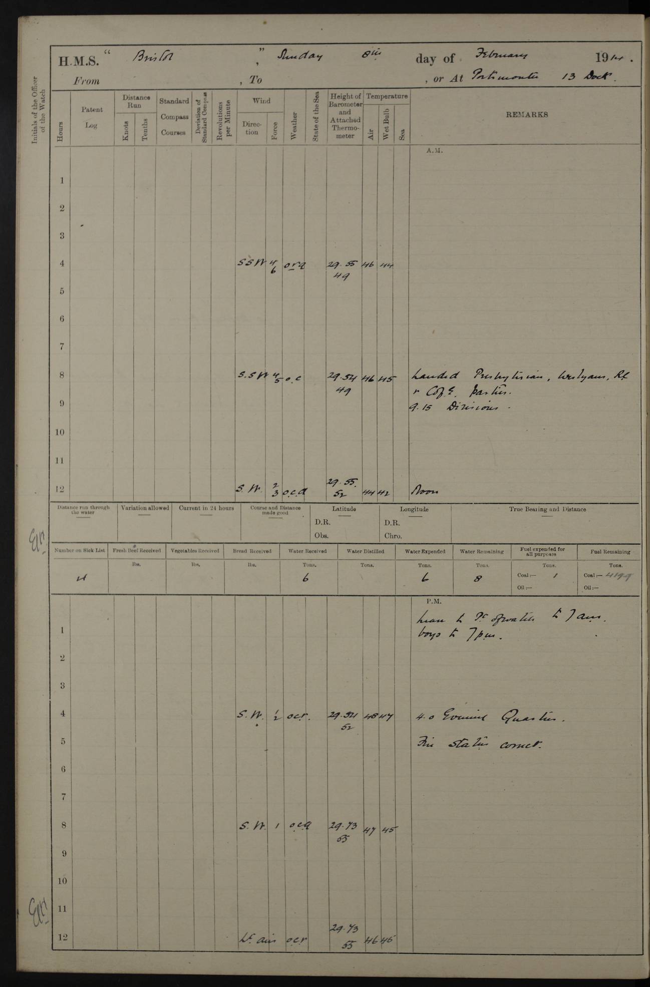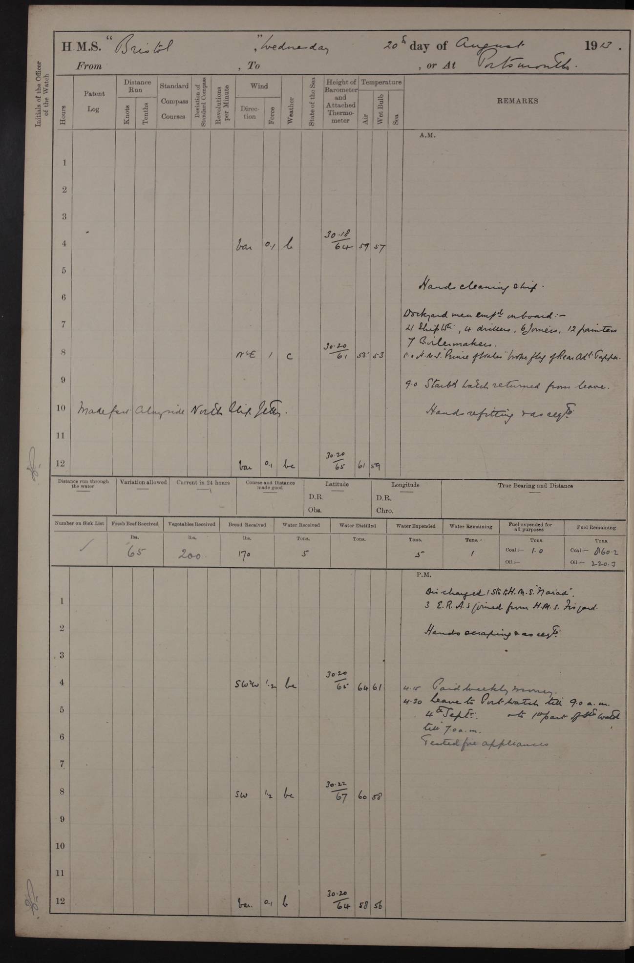 (Maps prepared using Journey Plotter, developed by Maikel. The Plots can only be approximate. They are made by joining-up positions on successive days, and sometimes positions are not given. There will therefore be occasions when the ship appears to have travelled overland) LOG BOOK – JULY 1ST 1913 TO JUNE 21ST 1914 4ef4f40ce53e0a0c91001323: (https://s3.amazonaws.com:443/oldweather/ADM53-36118/0001_0.jpg) 4ef4f40ce53e0a0c91001324: (https://s3.amazonaws.com:443/oldweather/ADM53-36118/0001_1.jpg) 4ef4f40de53e0a0c91001325: (https://s3.amazonaws.com:443/oldweather/ADM53-36118/0002_0.jpg) 4ef4f40de53e0a0c91001326: (https://s3.amazonaws.com:443/oldweather/ADM53-36118/0002_1.jpg) 4ef4f40de53e0a0c91001327: (https://s3.amazonaws.com:443/oldweather/ADM53-36118/0003_0.jpg) 4ef4f40de53e0a0c91001328: (https://s3.amazonaws.com:443/oldweather/ADM53-36118/0003_1.jpg) 4ef4f40de53e0a0c91001329: (https://s3.amazonaws.com:443/oldweather/ADM53-36118/0004_0.jpg) 4ef4f40de53e0a0c9100132a: (https://s3.amazonaws.com:443/oldweather/ADM53-36118/0004_1.jpg) LOG OF H.M.S. BRISTOL Commanded by Captain Basil Hew Fanshawe FOR THE PERIOD Commencing 1st of July 1913 Ending 21st of June 1914 Followed by her technical detail 4ef4f40de53e0a0c9100132b: (https://s3.amazonaws.com:443/oldweather/ADM53-36118/0005_0.jpg) Directions 4ef4f40de53e0a0c9100132c: (https://s3.amazonaws.com:443/oldweather/ADM53-36118/0005_1.jpg) Establishment of Ship’s Company: Full Commission: Officers: 18. Seamen: 111. Boys: 13. Marines: 28. Engine-room establishment: 168. Other non-executive ratings: 43. Total: 381 Active Commision: Officers: 14. Seamen: 53. Boys: 0. Marines: 17. Engine-room establishment: 64. Other non-executive ratings: 27. Total 175 Armament: Forecastle: 1 6” B.L. PV* Quarterdeck: 1 6” B.L. PV* Starboard waist: 5 4” B.L. PIV* Port waist: 5 4” B.L. PIV* 4 3 pounder for Saluting purpose, 2 in each battery Torpedo Two 18” submerged tubes Boats: 1 30 feet Steam Cutter 1 34 feet Cutter 2 30 feet Cutters 1 30 feet Gig 3 27 feet Whalers 2 18 feet Skiffs