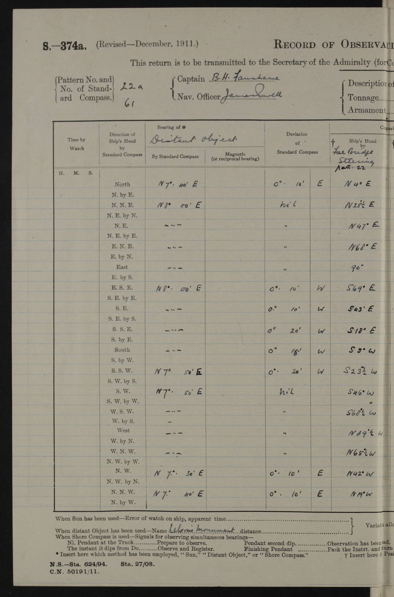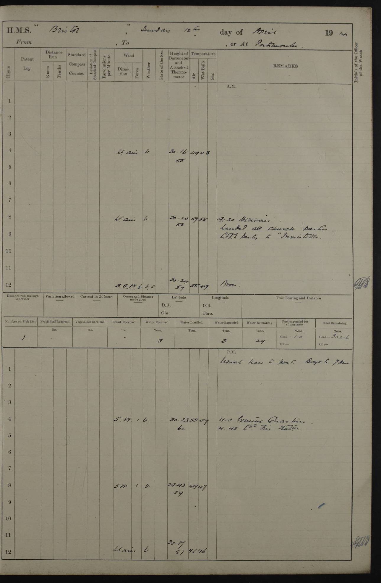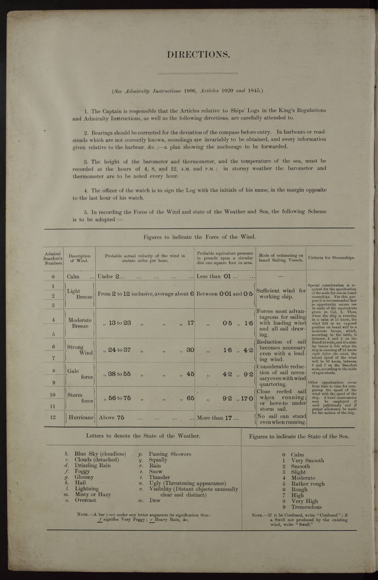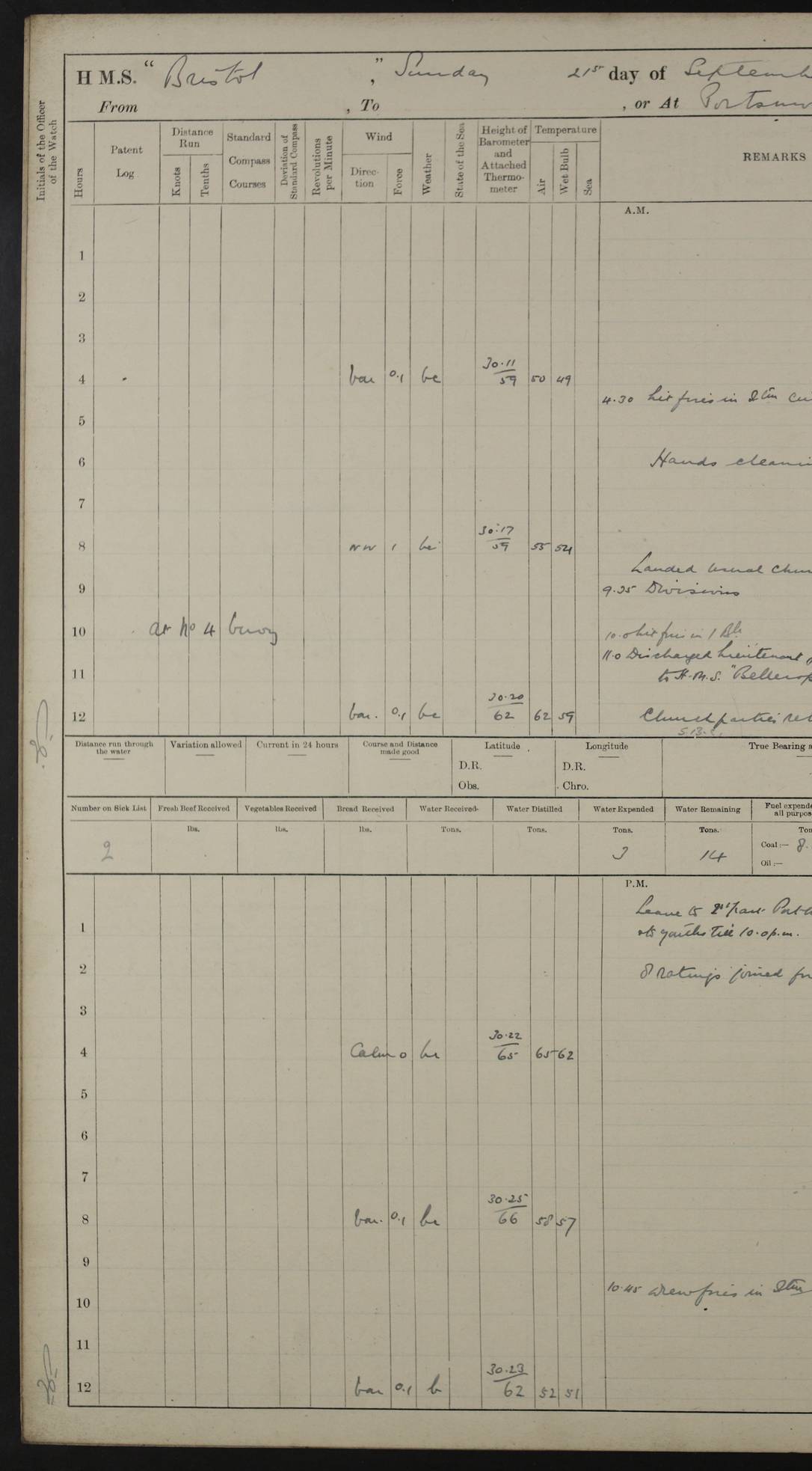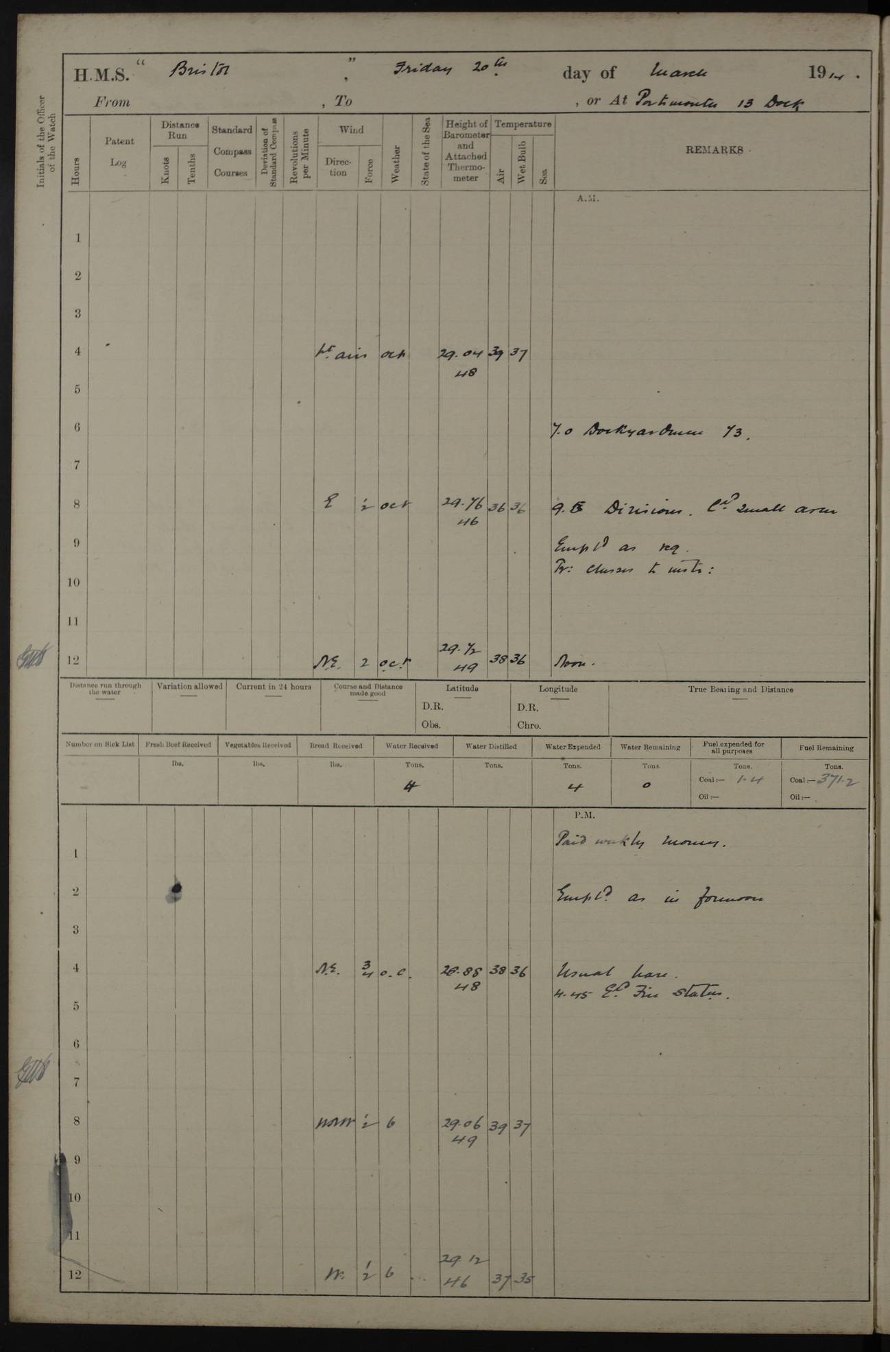 (Maps prepared using Journey Plotter, developed by Maikel. The Plots can only be approximate. They are made by joining-up positions on successive days, and sometimes positions are not given. There will therefore be occasions when the ship appears to have travelled overland) LOG BOOK – JULY 1ST 1913 TO JUNE 21ST 1914 4ef4f40ce53e0a0c91001323: (https://s3.amazonaws.com:443/oldweather/ADM53-36118/0001_0.jpg) 4ef4f40ce53e0a0c91001324: (https://s3.amazonaws.com:443/oldweather/ADM53-36118/0001_1.jpg) 4ef4f40de53e0a0c91001325: (https://s3.amazonaws.com:443/oldweather/ADM53-36118/0002_0.jpg) 4ef4f40de53e0a0c91001326: (https://s3.amazonaws.com:443/oldweather/ADM53-36118/0002_1.jpg) 4ef4f40de53e0a0c91001327: (https://s3.amazonaws.com:443/oldweather/ADM53-36118/0003_0.jpg) 4ef4f40de53e0a0c91001328: (https://s3.amazonaws.com:443/oldweather/ADM53-36118/0003_1.jpg) 4ef4f40de53e0a0c91001329: (https://s3.amazonaws.com:443/oldweather/ADM53-36118/0004_0.jpg) 4ef4f40de53e0a0c9100132a: (https://s3.amazonaws.com:443/oldweather/ADM53-36118/0004_1.jpg) LOG OF H.M.S. BRISTOL Commanded by Captain Basil Hew Fanshawe FOR THE PERIOD Commencing 1st of July 1913 Ending 21st of June 1914 Followed by her technical detail 4ef4f40de53e0a0c9100132b: (https://s3.amazonaws.com:443/oldweather/ADM53-36118/0005_0.jpg) Directions 4ef4f40de53e0a0c9100132c: (https://s3.amazonaws.com:443/oldweather/ADM53-36118/0005_1.jpg) Establishment of Ship’s Company: Full Commission: Officers: 18. Seamen: 111. Boys: 13. Marines: 28. Engine-room establishment: 168. Other non-executive ratings: 43. Total: 381 Active Commision: Officers: 14. Seamen: 53. Boys: 0. Marines: 17. Engine-room establishment: 64. Other non-executive ratings: 27. Total 175 Armament: Forecastle: 1 6” B.L. PV* Quarterdeck: 1 6” B.L. PV* Starboard waist: 5 4” B.L. PIV* Port waist: 5 4” B.L. PIV* 4 3 pounder for Saluting purpose, 2 in each battery Torpedo Two 18” submerged tubes Boats: 1 30 feet Steam Cutter 1 34 feet Cutter 2 30 feet Cutters 1 30 feet Gig 3 27 feet Whalers 2 18 feet Skiffs