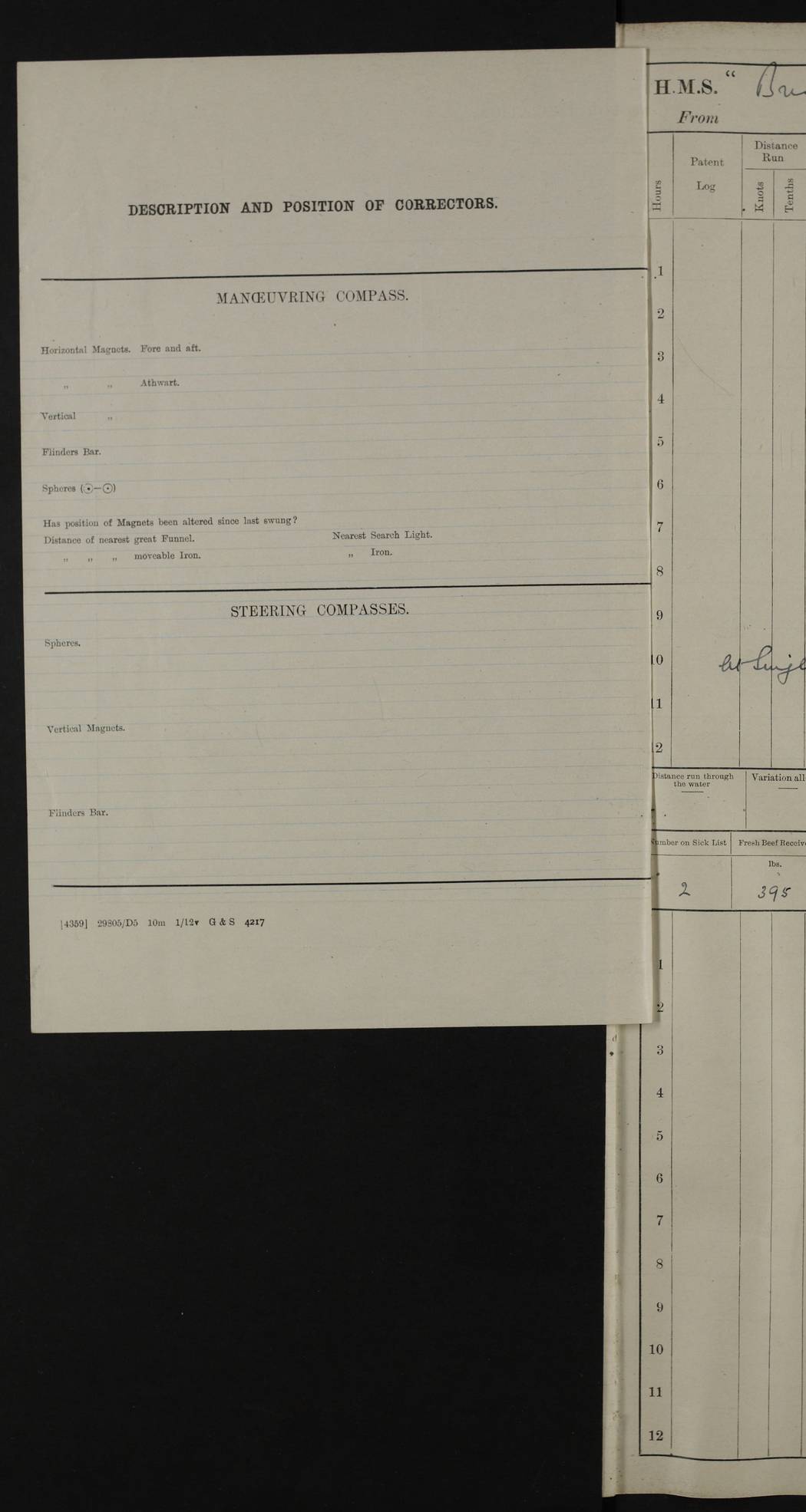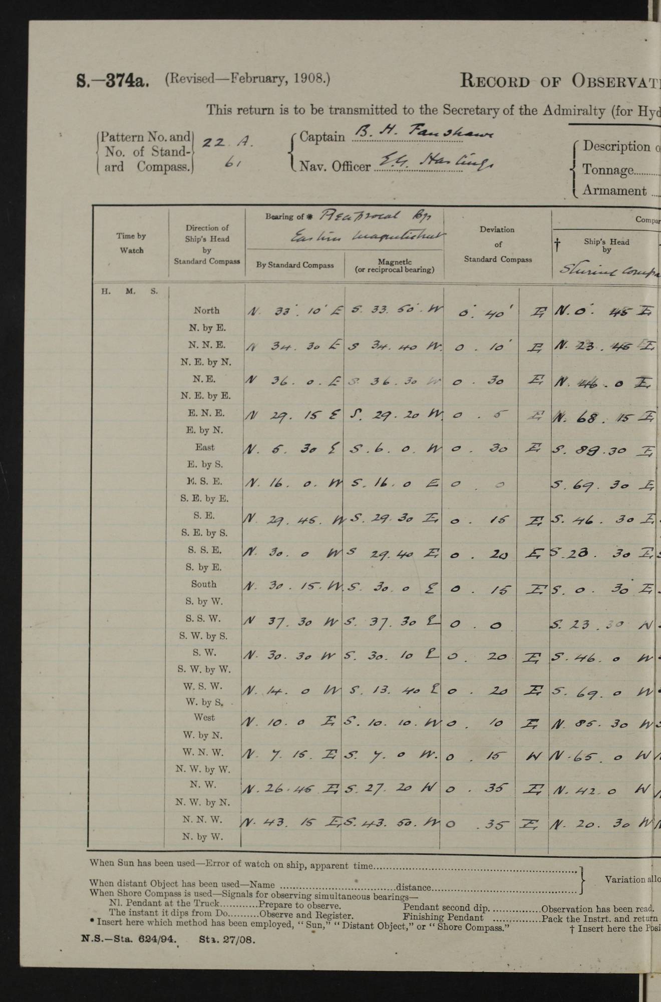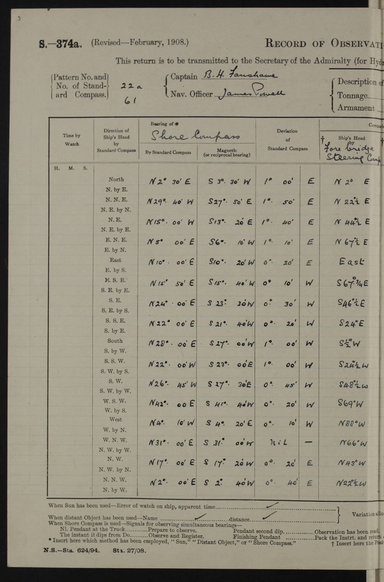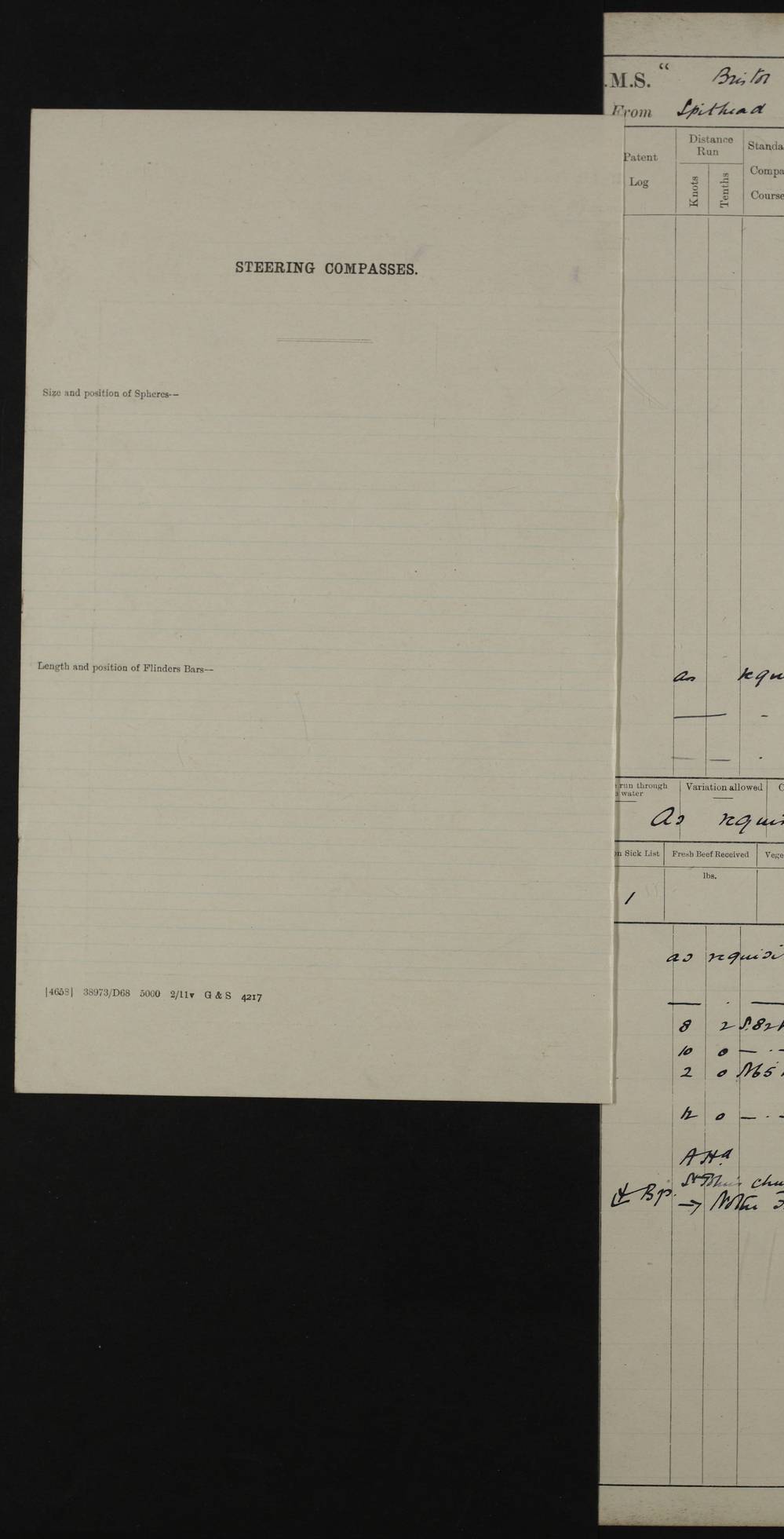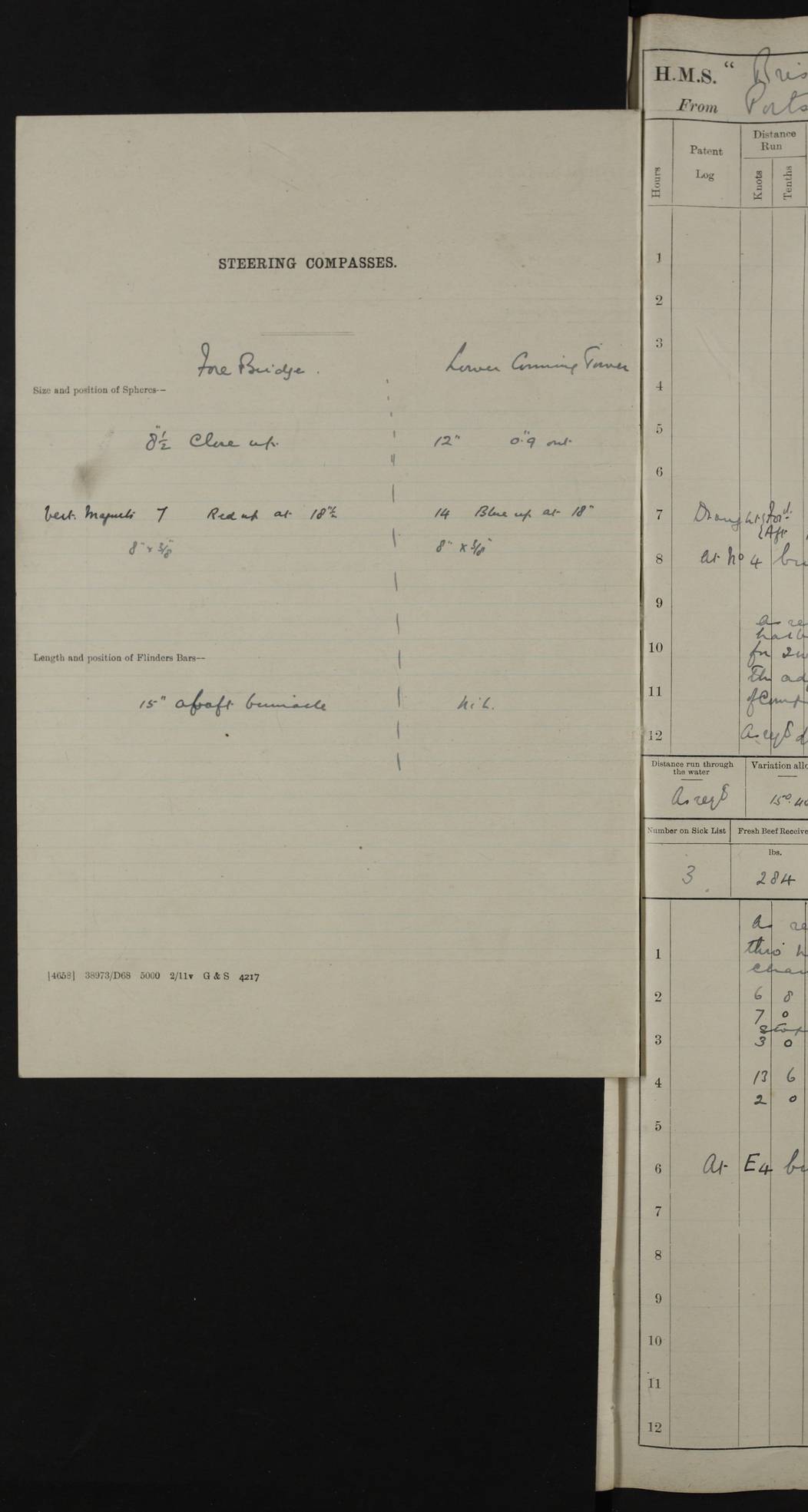 (Maps prepared using Journey Plotter, developed by Maikel. The Plots can only be approximate. They are made by joining-up positions on successive days, and sometimes positions are not given. There will therefore be occasions when the ship appears to have travelled overland) LOG BOOK – JULY 1ST 1913 TO JUNE 21ST 1914 4ef4f40ce53e0a0c91001323: (https://s3.amazonaws.com:443/oldweather/ADM53-36118/0001_0.jpg) 4ef4f40ce53e0a0c91001324: (https://s3.amazonaws.com:443/oldweather/ADM53-36118/0001_1.jpg) 4ef4f40de53e0a0c91001325: (https://s3.amazonaws.com:443/oldweather/ADM53-36118/0002_0.jpg) 4ef4f40de53e0a0c91001326: (https://s3.amazonaws.com:443/oldweather/ADM53-36118/0002_1.jpg) 4ef4f40de53e0a0c91001327: (https://s3.amazonaws.com:443/oldweather/ADM53-36118/0003_0.jpg) 4ef4f40de53e0a0c91001328: (https://s3.amazonaws.com:443/oldweather/ADM53-36118/0003_1.jpg) 4ef4f40de53e0a0c91001329: (https://s3.amazonaws.com:443/oldweather/ADM53-36118/0004_0.jpg) 4ef4f40de53e0a0c9100132a: (https://s3.amazonaws.com:443/oldweather/ADM53-36118/0004_1.jpg) LOG OF H.M.S. BRISTOL Commanded by Captain Basil Hew Fanshawe FOR THE PERIOD Commencing 1st of July 1913 Ending 21st of June 1914 Followed by her technical detail 4ef4f40de53e0a0c9100132b: (https://s3.amazonaws.com:443/oldweather/ADM53-36118/0005_0.jpg) Directions 4ef4f40de53e0a0c9100132c: (https://s3.amazonaws.com:443/oldweather/ADM53-36118/0005_1.jpg) Establishment of Ship’s Company: Full Commission: Officers: 18. Seamen: 111. Boys: 13. Marines: 28. Engine-room establishment: 168. Other non-executive ratings: 43. Total: 381 Active Commision: Officers: 14. Seamen: 53. Boys: 0. Marines: 17. Engine-room establishment: 64. Other non-executive ratings: 27. Total 175 Armament: Forecastle: 1 6” B.L. PV* Quarterdeck: 1 6” B.L. PV* Starboard waist: 5 4” B.L. PIV* Port waist: 5 4” B.L. PIV* 4 3 pounder for Saluting purpose, 2 in each battery Torpedo Two 18” submerged tubes Boats: 1 30 feet Steam Cutter 1 34 feet Cutter 2 30 feet Cutters 1 30 feet Gig 3 27 feet Whalers 2 18 feet Skiffs