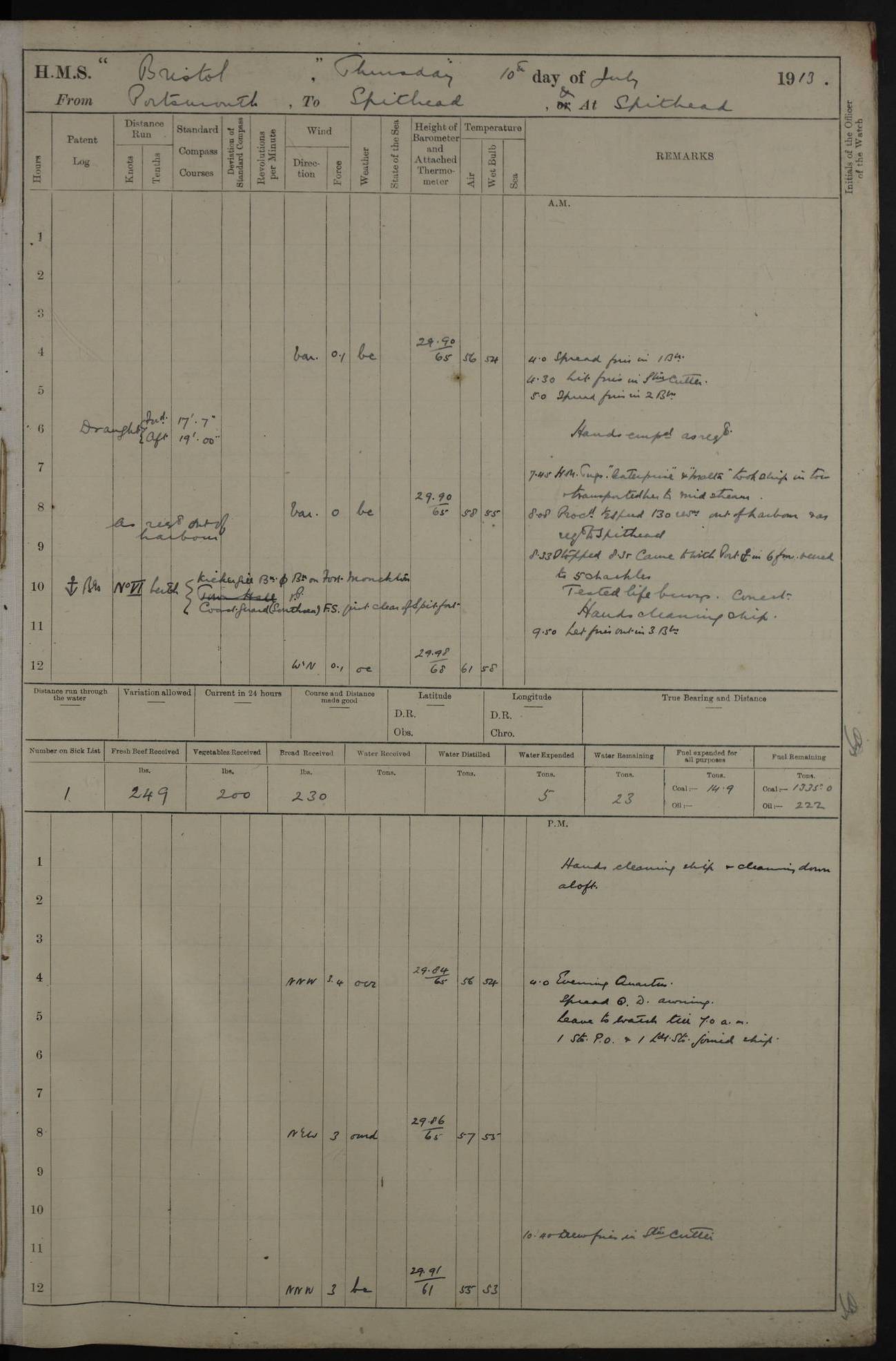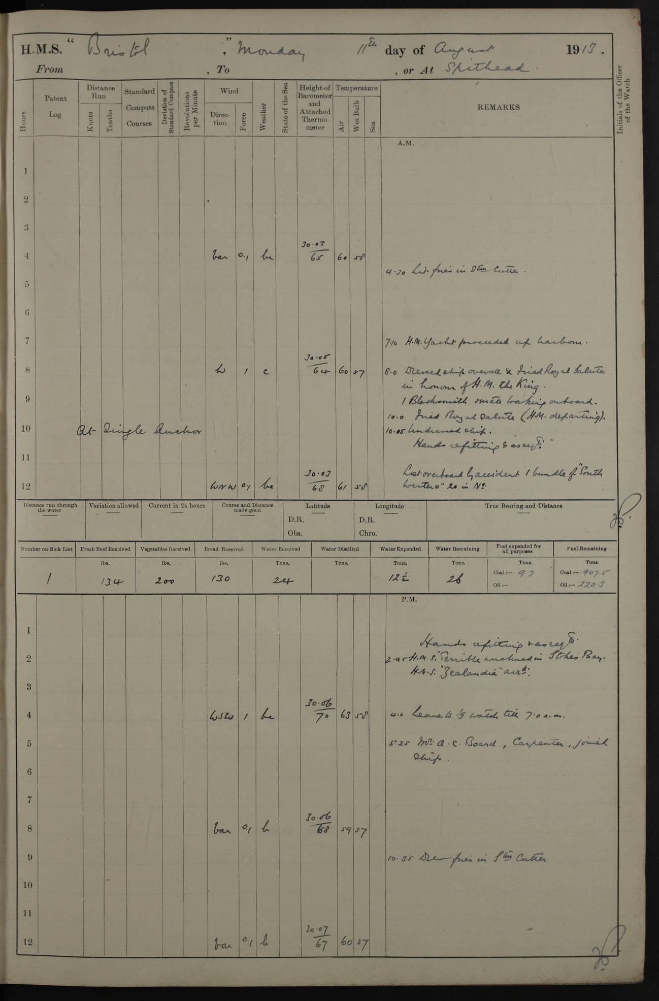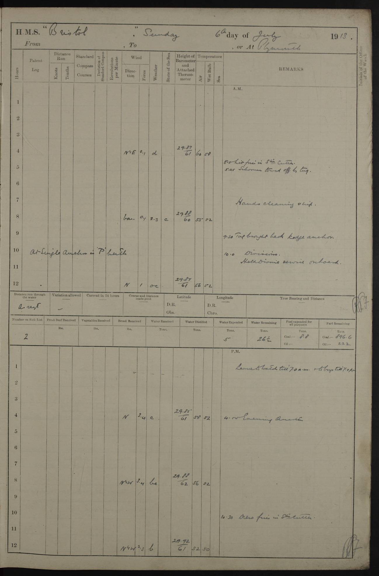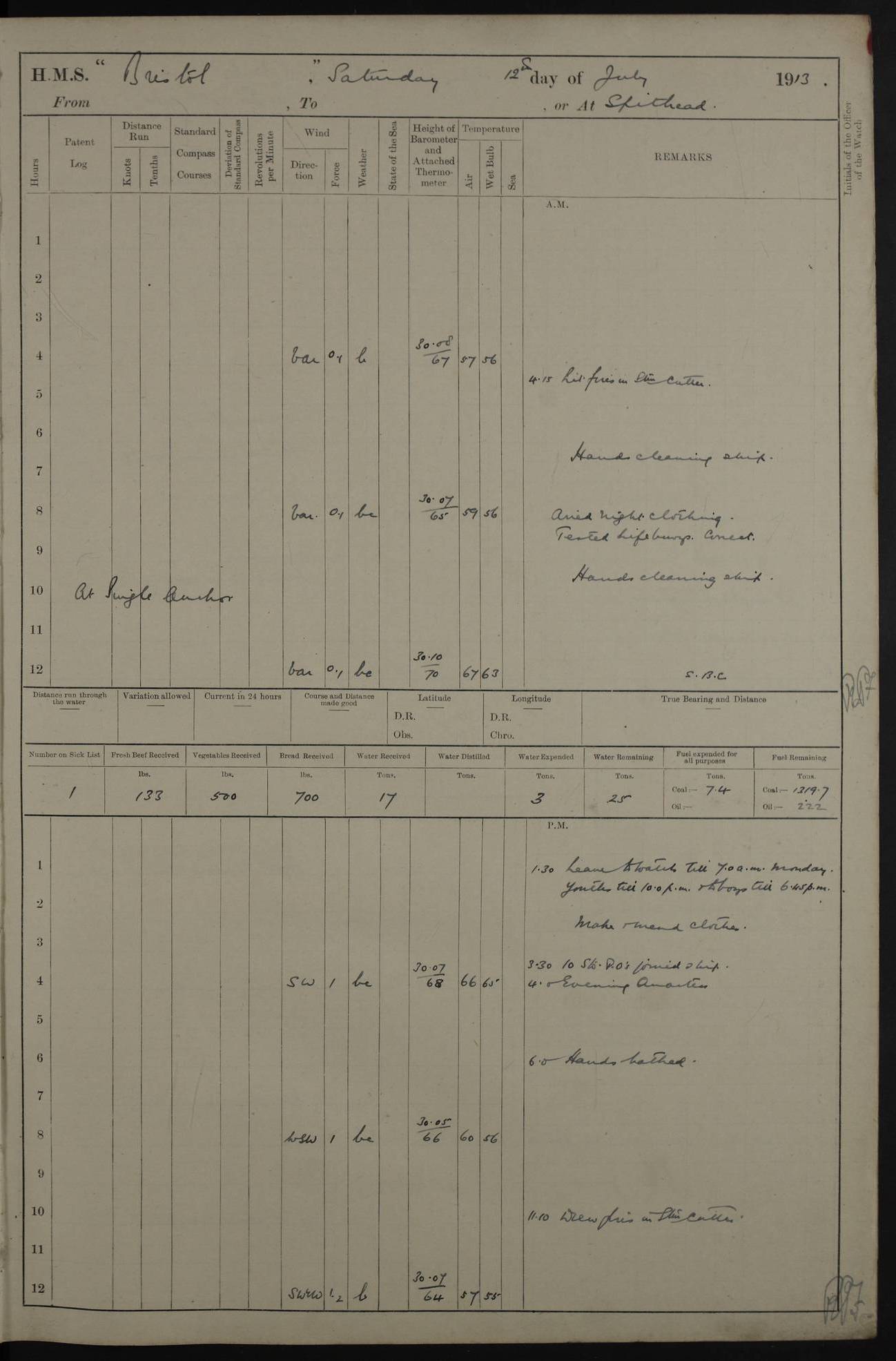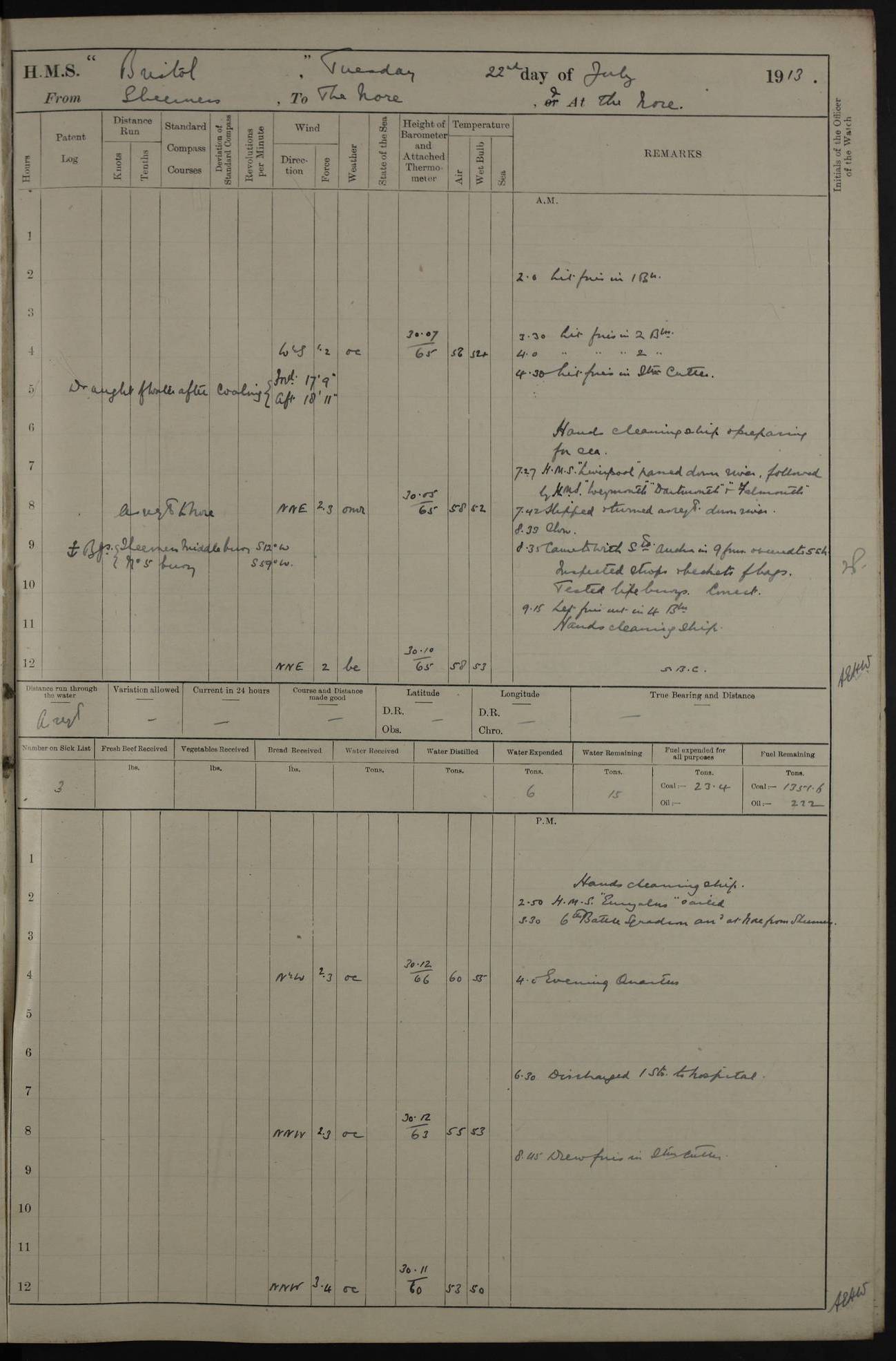 LOGS FOR JULY 1913 4ef4f40ee53e0a0c9100132d: (https://s3.amazonaws.com:443/oldweather/ADM53-36118/0006_0.jpg) 1 July 1913 Devonport Lat 50.38, Long -4.19 1 in sick list. 4.30am: Lit fires in Steam Cutter. Hands cleaning ship. 6.00am: Hands cleaning ship. 8.00am: Discharged ratings to ships in harbour. 9.00am: Recommissioned ship for service in 2nd Light Cruiser Squadron. 9.20am: Divisions. Hands cleaning ship. Dockyard parties drawing stores. 1.00pm: Hands drawing stores. Discharged 2 Privates RMLI to Barracks. 4.00pm: Leave to Watch till 7.00a.m. 9.00pm: 1 Sergeant RMLI joined ship. 10.15pm: Drew fires in Steam Cutter. 4ef4f40ee53e0a0c9100132e: (https://s3.amazonaws.com:443/oldweather/ADM53-36118/0006_1.jpg) 2 July 1913 Devonport Lat 50.38, Long -4.19 1 in sick list. 6.00am: Hands pumping water and as requisite. 9.00am: Dockyard parties drawing stores. Remainder of hands employed as requisite. 4ef4f40ee53e0a0c9100132f: (https://s3.amazonaws.com:443/oldweather/ADM53-36118/0007_0.jpg) 3 July 1913 Devonport Lat 50.38, Long -4.19 1 in sick list. 11.45am: Medical inspection of Ship's Company. 5.15pm: H.M.S. Defence arrived. 8.10pm: 1 Painter 2nd class joined ship. 4ef4f40ee53e0a0c91001330: (https://s3.amazonaws.com:443/oldweather/ADM53-36118/0007_1.jpg) 4 July 1913 Devonport Lat 50.38, Long -4.19 2 in sick list. 8.00am: Cleaned small arms. 12.45pm: Paid weekly money. 1.00pm: Lit fires in 1 Boiler. Hands securing boats for sea and as requisite. 4ef4f40ee53e0a0c91001331: (https://s3.amazonaws.com:443/oldweather/ADM53-36118/0008_0.jpg) 5 July 1913 Devonport to Plymouth Sound Lat 50.39, Long -4.14 2 on sick list. 6.45am: Landed escort. 8.30am: Escort and prisoner returned. 9.00am: Lit fires in 2 Boilers. Hands cleaning ship. Tested life buoys. Correct. 12.55pm: H.M. Tug Aetna towed stern to port. 1.00pm: Slipped and proceeded as requisite to Sound. 1.22pm: Stopped. 1.26pm: Came to with Starboard anchor, veered to 5 shackles in 6 fathoms. 2.15pm: Two ratings joined for passage to Portsmouth. 9.10pm: Sent boats to assist schooner aground on East end of Plymouth Breakwater (Owner W. Tugwell Esquire). Laid out small kedge and 4 1/2" grass. 4ef4f40ee53e0a0c91001332: (https://s3.amazonaws.com:443/oldweather/ADM53-36118/0008_1.jpg) 6 July 1913 Plymouth Lat 50.39, Long -4.14 2 on sick list. 5.45am: Schooner towed off by tug. 9.30am: Tug brought back kedge anchor. 10.00am: Divisions. Held Divine service onboard. 4ef4f40ee53e0a0c91001333: (https://s3.amazonaws.com:443/oldweather/ADM53-36118/0009_0.jpg) 7 July 1913 Plymouth to Spithead Lat 50.26, Long -3.26 1 on sick list. 8.50am: Weighed. 8.58am: Proceeded 170 revolutions. Course as requisite through West Entrance. 9.21am: Set Course SE. Mewstone: abeam. 9.30am: Mewstone: N10W. Revelstoke S87E. 10.21am: Altered course ESE. 10.57am: Altered course N87E. Prawle Point Bolt: N62 1/2W. Start Point: N10W. 3.50pm: Portland Bill: N65W. White Nose: N6W. 6.26pm: Needles Light House: abeam. Altered course as requisite up Needles Channel and to Spithead. 7.40pm: W. Ryde Middle: abeam to Starboard 4 cables. 8.07pm: Stopped. 8.10pm: Came to with Port anchor in 6 fathoms, veered to 5 shackles. Prepared for coaling. 4ef4f40ee53e0a0c91001334: (https://s3.amazonaws.com:443/oldweather/ADM53-36118/0009_1.jpg) 8 July 1913 Spithead to Portsmouth Harbour Lat 50.81, Long -1.11 1 on sick list. 7.39am: Embarked Pilot, weighed and proceeded as requisite 10 knots. 8.00am: Slow both. H.M. Tug "Malta" made fast alongside port side. 8.13am: Stopped. 8.20am: Made fast alongside "C1". 9.21am: Commenced coaling. 10.45am: Discharged 1 Able Seaman to H.M.A.S. "Sydney". 1.30pm: Discharged 1 Stoker to RN Barracks. 1 Leading Seaman and 1 Able Seaman joined from H.M.S. "Excellent". 2.45pm: 20 Ordinary Seamen joined from barracks. 4.20pm: 1 Ordinary Seaman joined from H.M.S. "Vernon". 6.30pm: Stopped coaling. 4ef4f40ee53e0a0c91001335: (https://s3.amazonaws.com:443/oldweather/ADM53-36118/0010_0.jpg) 9 July 1913 Portsmouth Lat 50.81, Long -1.11 Nil on sick list. 7,0am: Hands coaling ship. 2.30pm: Finished coaling. Received 527.0 tons. 3.30pm: 40 Stokers 2nd Class and 1 Ships Steward Assistant joined. 6.00pm: 7 Leading Stokers and 24 Stokers 1st class joined ship. 4ef4f40fe53e0a0c91001336: (https://s3.amazonaws.com:443/oldweather/ADM53-36118/0010_1.jpg) 10 July 1913 Portsmouth to Spithead Lat 50.75, Long -1.13 1 on sick list. 7.45am: H.M. Tugs "Enterprise" & "Malta" took ship in tow and transported her to mid stream. 8.08am: Proceeded 1/2 speed 130 revolutions out of harbour and as requisite to Spithead. 8.33am: Stopped. 8.35am: Came to with Port anchor in 6 fathoms, veered to 5 shackles. 4.00pm: Evening Quarters. Spread Quarter Deck awning. Leave to Watch till 7.00am. 1 Stoker Petty Officer and 1 Leading Stoker joined ship. 4ef4f40fe53e0a0c91001337: (https://s3.amazonaws.com:443/oldweather/ADM53-36118/0011_0.jpg) 11 July 1913 Spithead Lat 50.75, Long -1.13 1 on sick list. 12.45pm: Paid weekly money. 3.00pm: 4 Engine Room Artificers joined ship. 4.15pm: H.M.S. "Minerva " arrived. Leave to Watch till 7.00a.m. 1 Chief Stoker and 2 Leading Stokers joined. 4ef4f40fe53e0a0c91001338: (https://s3.amazonaws.com:443/oldweather/ADM53-36118/0011_1.jpg) 12 July 1913 Spithead Lat 50.75, Long -1.13 1 on sick list. 1.30pm: Leave to Watch till 7.00a.m. Monday. Youths till 10.00pm. and to boys till 6.45 pm. Make and mend clothes. 3.30pm: 10 Stoker Petty Officers joined ship. 6.00pm: Hands bathed. 4ef4f40fe53e0a0c91001339: (https://s3.amazonaws.com:443/oldweather/ADM53-36118/0012_0.jpg) 13 July 1913 Spithead Lat 50.75, Long -1.13 1 on sick list. 7.20am: H.M.S. "Blonde" arrived. 9.40am: Divisions. Held Divine Service. 1.00pm: H.M.S. "Enchantress" sailed. 7.35pm: H.M.S. "Liverpool" arrived. 4ef4f40fe53e0a0c9100133a: (https://s3.amazonaws.com:443/oldweather/ADM53-36118/0012_1.jpg) 4ef4f40fe53e0a0c9100133b: (https://s3.amazonaws.com:443/oldweather/ADM53-36118/0013_0.jpg) 4ef4f40fe53e0a0c9100133c: (https://s3.amazonaws.c